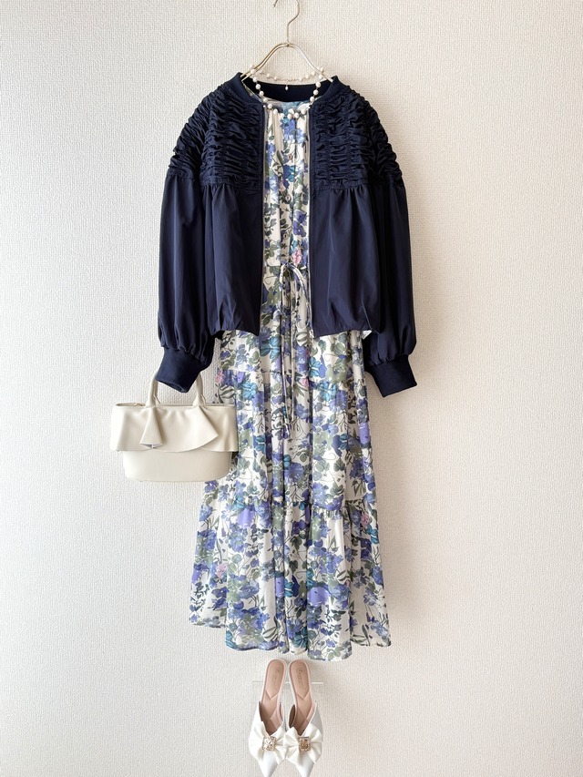 コーディネートセット(2点) <ジップブルゾン> トレンドのギャザーとシャーリングがふんだんに施された存在感抜群のジップブルゾンです。 軽さが魅力で、丸みのあるふんわりとした女性らしいフォルムも特徴です。 程よくゆとりがある快適な着心地と着回し力抜群のネイビーカラーで甘すぎない大人カジュアルコーデに。 バスト 116cm 袖丈 43cm 裄丈 68cm 総丈 51cm 表地 ポリエステル 70% ナイロン 30% 裏地 ポリエステル 100% <ワンピース> 軽さのあるシフォン素材で仕立てたロングワンピースです。 ウエストのリボンでシルエットの調整が可能です。 花柄プリントが女性らしく上品で華やかな印象に。 バスト 104cm 肩幅 35cm 袖丈 59cm 裄丈 65cm 総丈 116cm 表地 ポリエステル 100% 裏地 ポリエステル 100% *バックとシューズは単品販売しております。 アクセサリーは参考画像により販売しておりません。 *単品販売はホーム左上のカテゴリーから見れます *商品は丁寧に検品を行っております。 商品に不備がない場合の返品・交換はお受け出来ません。あらかじめご了承ください。 万が一、不良や破損などの不備があった場合には、商品到着後3日以内にご連絡ください。