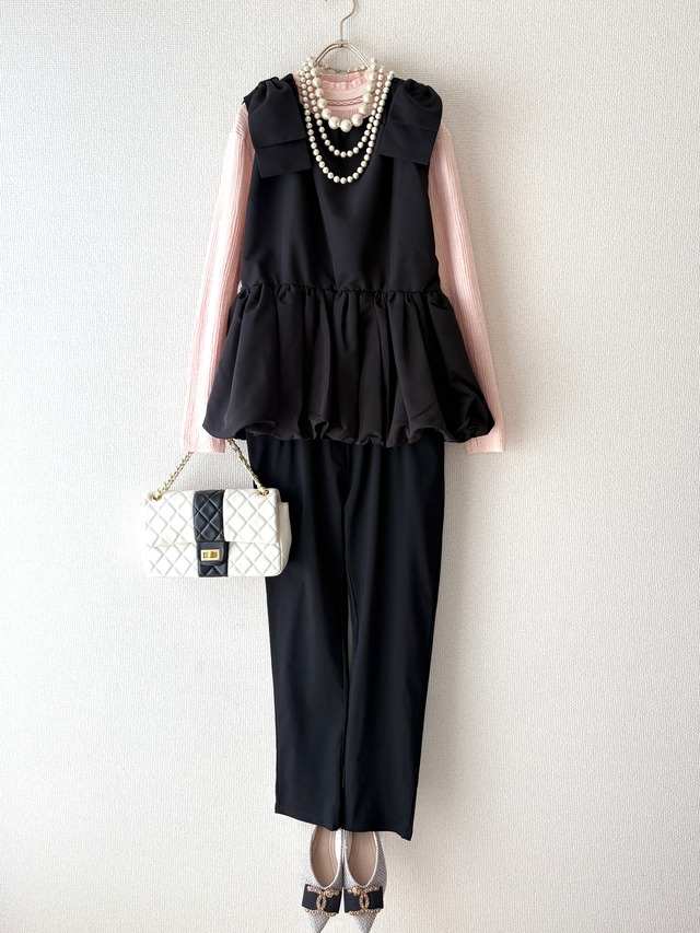 コーディネートセット(3点) <リブインナー> 首元のデザインが可愛く、重ね着するのにぴったりなインナーです。 伸縮性のあるリブニットで着心地も良く、シルエットをすっきりと綺麗に見せてくれます。 バスト 79cm〜94cm 肩幅 45cm 袖丈 57cm 裄丈 70cm 総丈 57cm ポリエステル 65% レーヨン 35% <リボンベスト> 裾のバルーンデザインが可愛らしさ溢れるデザインです。 気になるウエストやヒップ周りを程よくカバーします。 ショルダー部分の大きめなリボンデザインがアクセントになり華やかに演出してくれます。 インナーを合わせて重ね着スタイルも楽しめます。 バスト 79cm〜94cm 肩幅 36cm 総丈 58cm 本体 ポリエステル 100% 裏地 ポリエステル 100% <レギンスパンツ> 楽にはけて美しい。 毎日でもはきたくなるストレスフリーなパンツです。 伸縮性があり、着心地がとても良いです。 ブラックカラーでコーデに合わせやすく、 1枚持っていると重宝するアイテムです。 ウエスト(ゴム)74cm〜92cm ヒップ 104cm 股上 22cm 股下 65cm 総丈 91cm レーヨン 75% ナイロン 20% ポリウレタン 5% *シューズとバックは単品販売しております。 アクセサリーは参考画像により販売しておりません。 *単品販売はホーム左上のカテゴリーから見れます