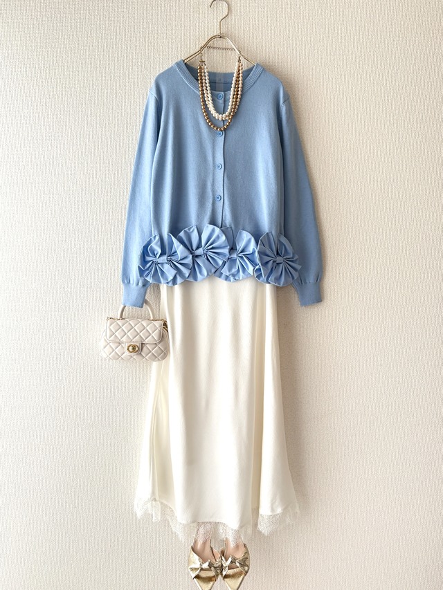 コーディネートセット(2点) <カーディガン> デコルテを美しく見せるVネックラインに沿って、丁寧に施されたレースデザイン。 繊細なレース模様が、顔周りを明るく華やかに彩ります。 深めのVラインが顔周りをすっきりとシャープに見せ、上品な肌見せが大人の抜け感を演出します。 お持ちのインナーと合わせて頂き、重ね着を楽しむ事も出来ます◎ バスト 112cm 肩幅 48cm 袖丈 56cm 裄丈 69cm 総丈 49cm ポリエステル 70% アクリル 20% ウール 10% <花柄レーススカート> ティアードデザインで ふんわり広がるシルエットが 女性らしい柔らかな印象を演出します。 裾のフラワープリントが コーディネートに春らしい華やかさをプラスします。 ウエスト(ゴム)70cm〜98cm ヒップ 118cm 総丈 84cm 表地 綿 85% ポリエステル 15% 刺繍糸 綿 100% 裏地 ポリエステル 100% *バックとシューズは単品販売しております。 アクセサリーは参考画像により販売しておりません。 *単品販売はホーム左上のカテゴリーから見れます