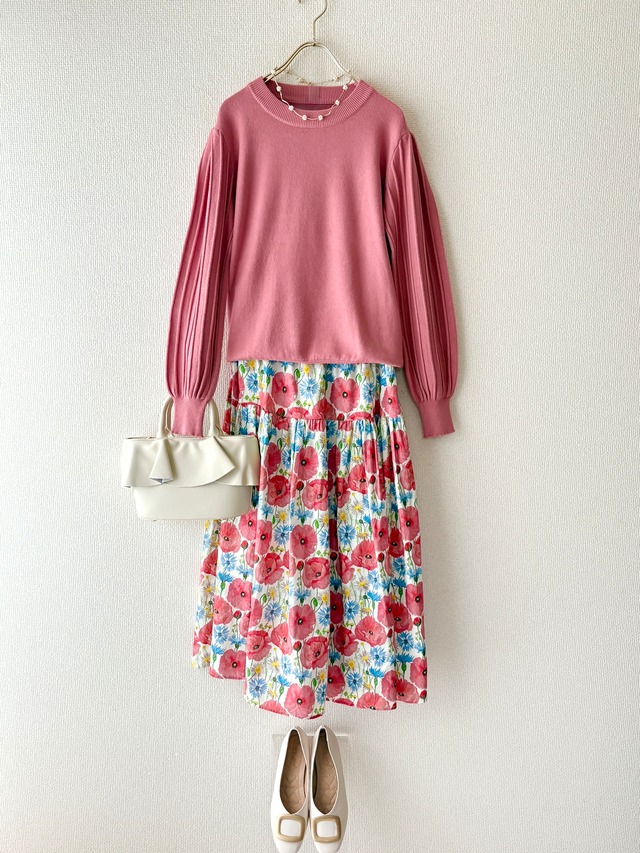 コーディネートセット(2点) <トップス> ふんわり袖のデザインがポイントのニットです。 1枚で着ても可愛く、 袖なしワンピースやベストのインナーとしても着れます。 1枚持っていると便利な万能トップスです。 バスト 106cm 肩幅 45cm 袖丈 58cm 裄丈 69cm 総丈 57cm ビスコース 70% ポリエステル 30% <スカート> 主役級の鮮やかな色と柄で一気にコーデが華やぎます。 程よくハリ感のある、綿素材のフレアスカート。 身体のラインを拾わず綺麗なシルエットが完成します。 ウエストゴムで楽な着心地なのも嬉しいポイントです。 長すぎない膝下丈で幅広いご身長の方におすすめ◎ ウエスト(ゴム)70cm〜90cm ヒップ 128cm 総丈 77cm 綿 100% 裏地 ポリエステル 100% *シューズとバックとアクセサリーは単品販売しております。 *単品販売はホーム左上のカテゴリーから見れます *商品は丁寧に検品を行っております。 商品に不備がない場合の返品・交換はお受け出来ません。あらかじめご了承ください。 万が一、不良や破損などの不備があった場合には、商品到着後3日以内にご連絡ください。