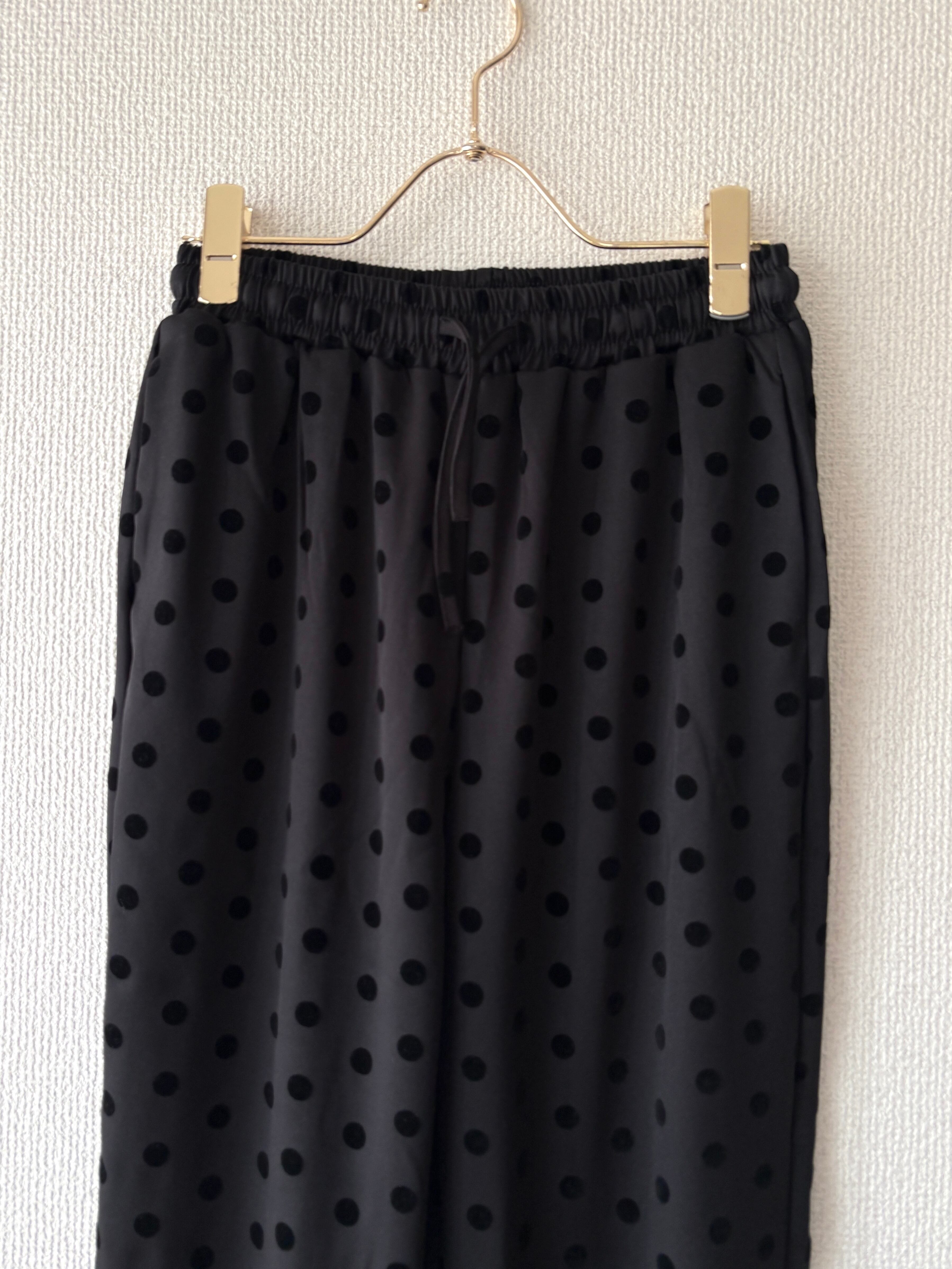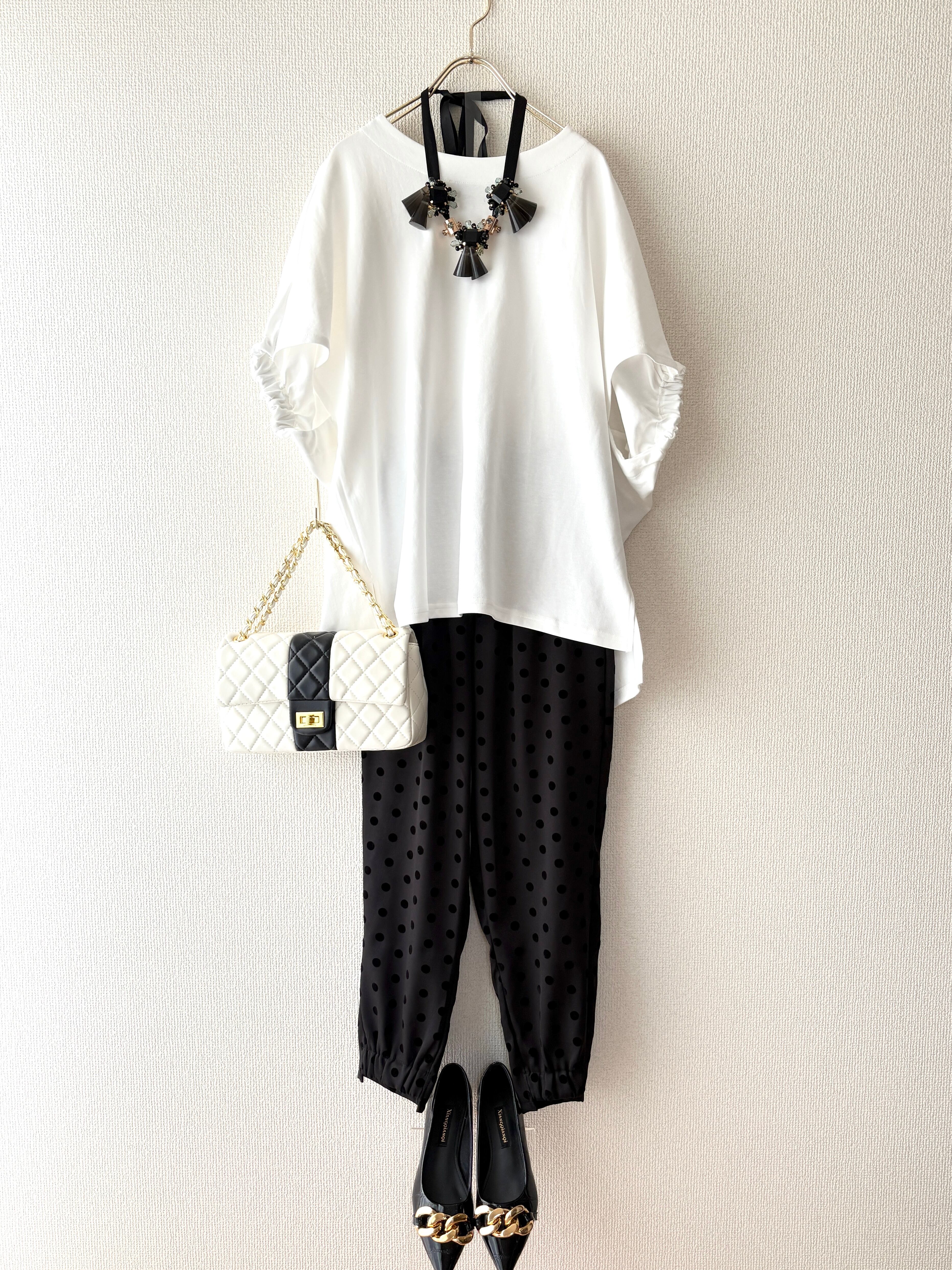 ドット柄が可愛く、カジュアルでも綺麗めなスタイルでもコーディネートが出来ます。