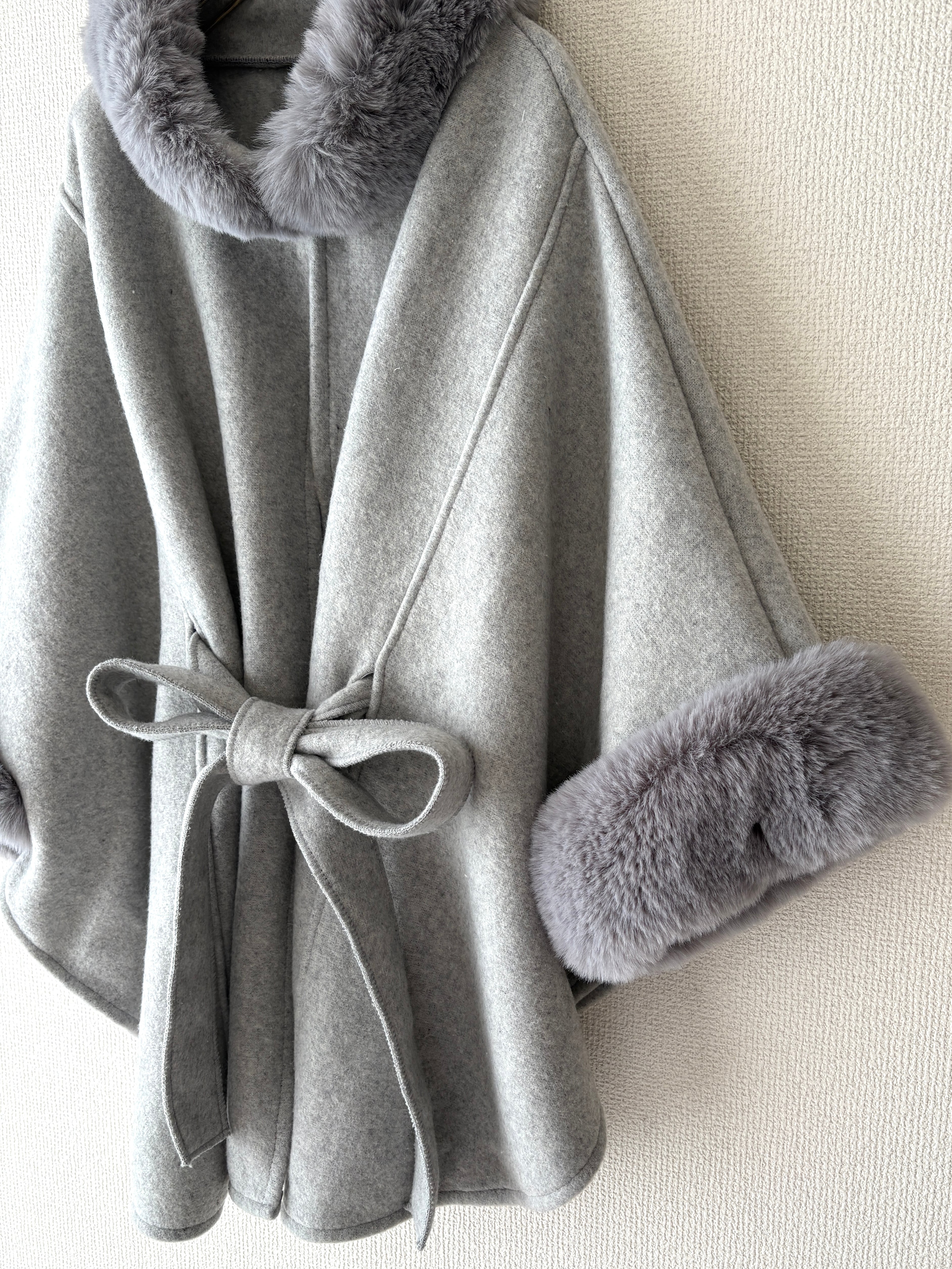 襟&袖にフェイクファーをあしらった冬のポンチョアイテム。1枚で華やかに、あたたかく過ごせます。