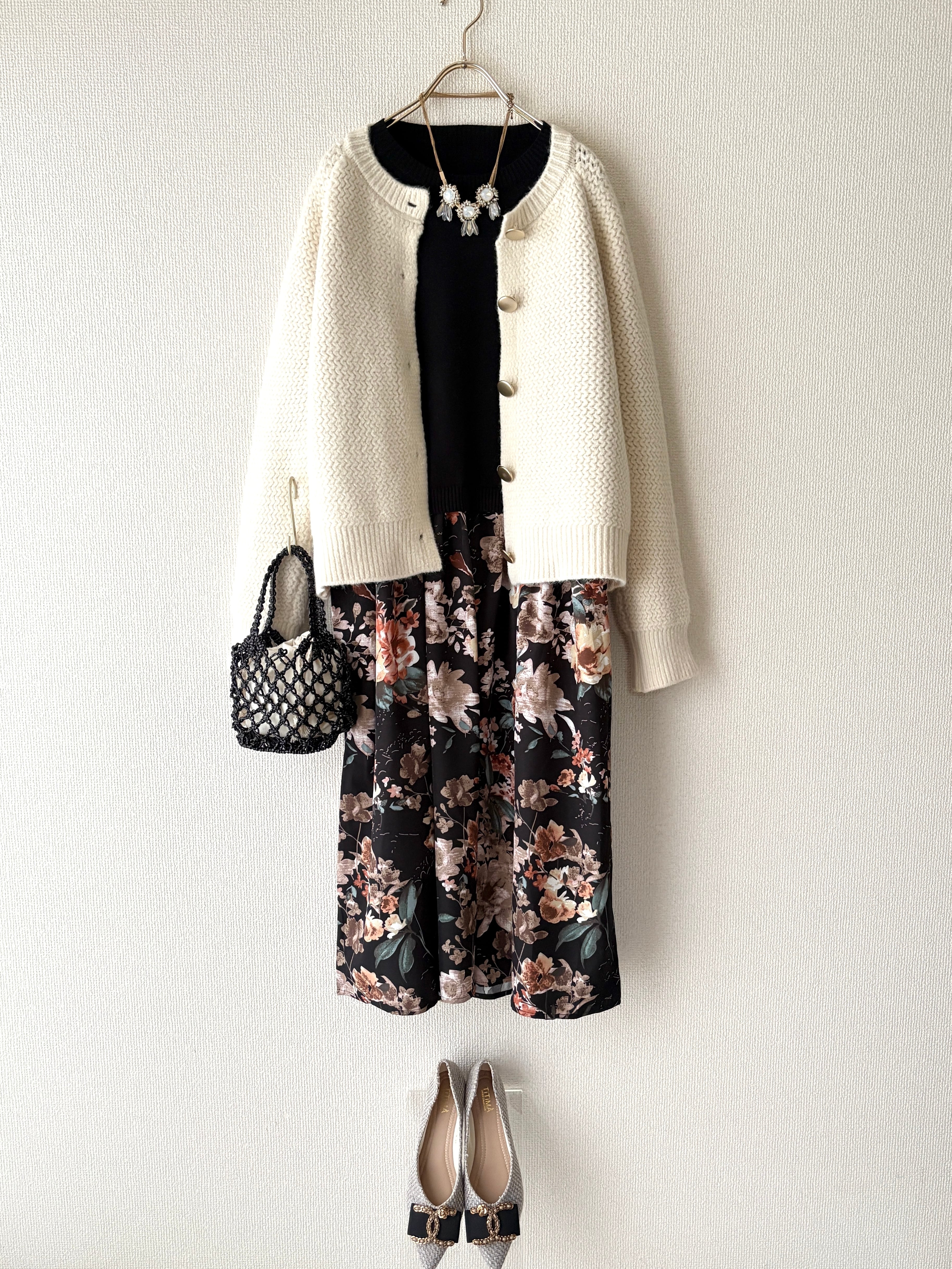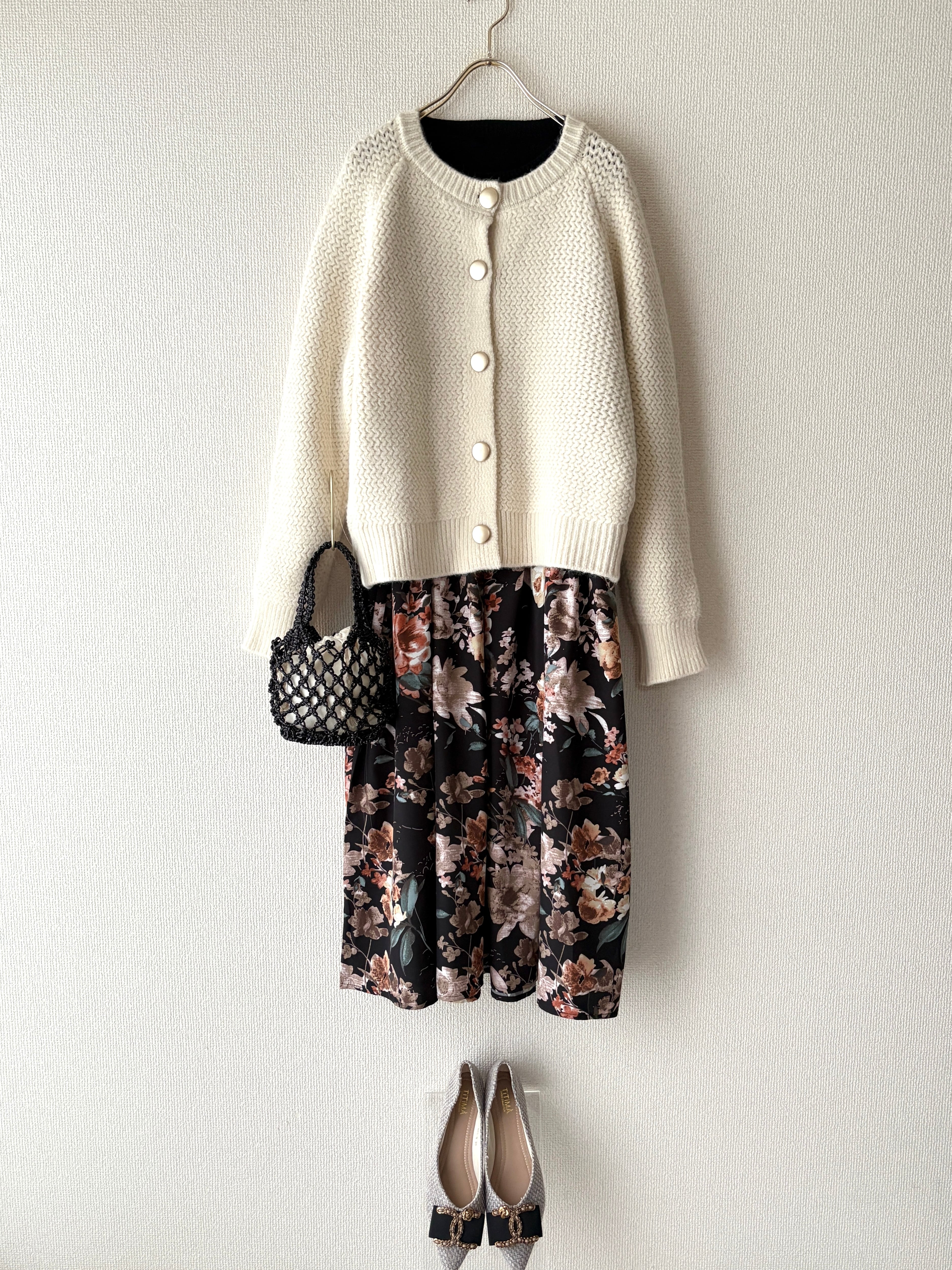 ワンピーススタイルにぴったりのローゲージカーディガン。