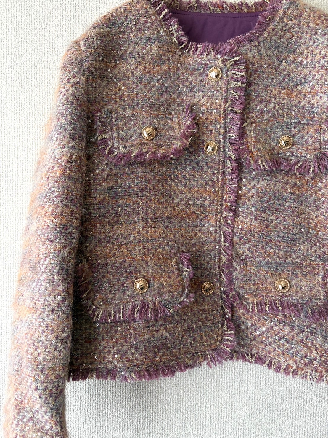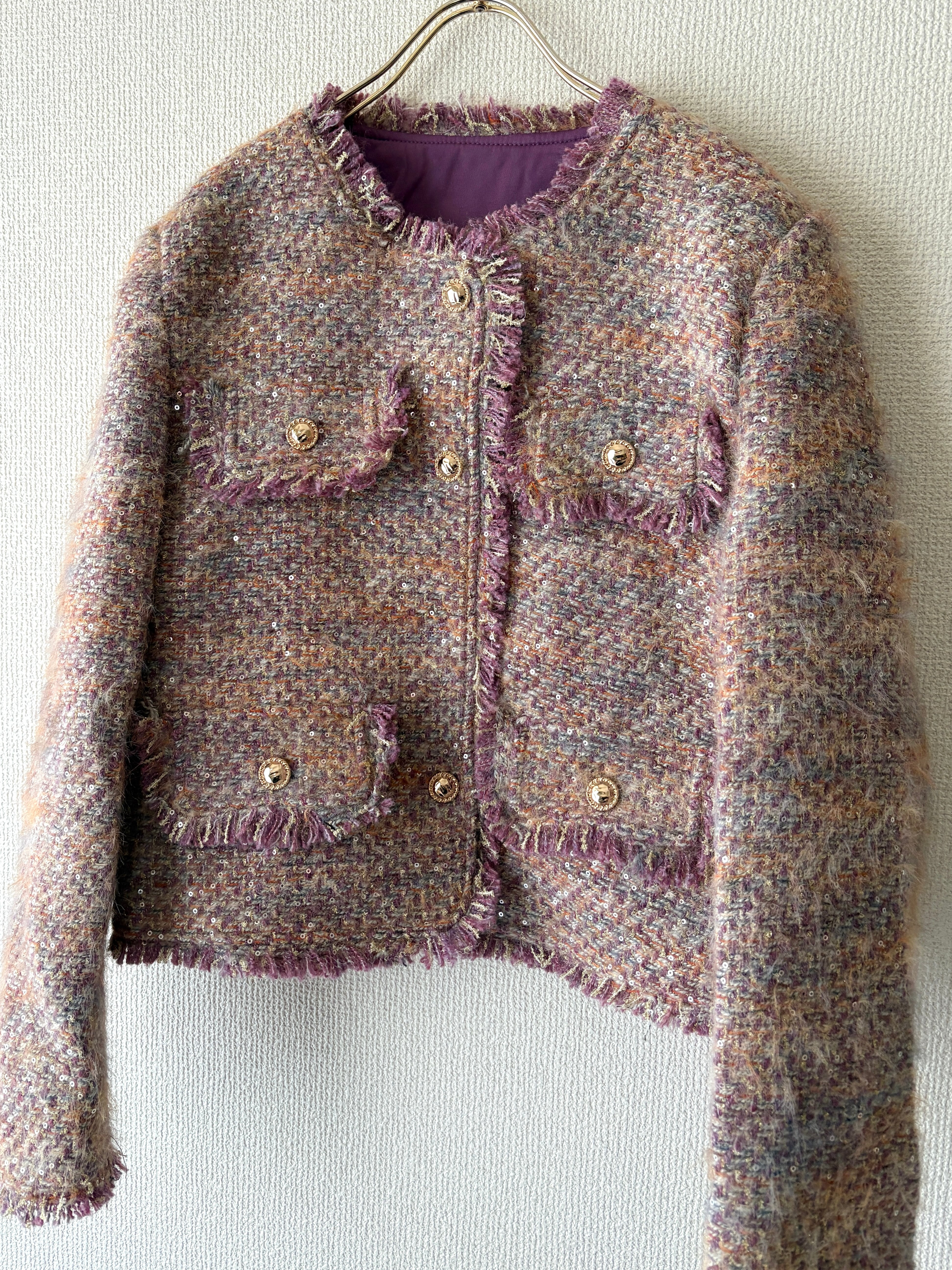 立体感のあるツイード生地にスパンコールのきらめきが上品に映えるジャケットです。