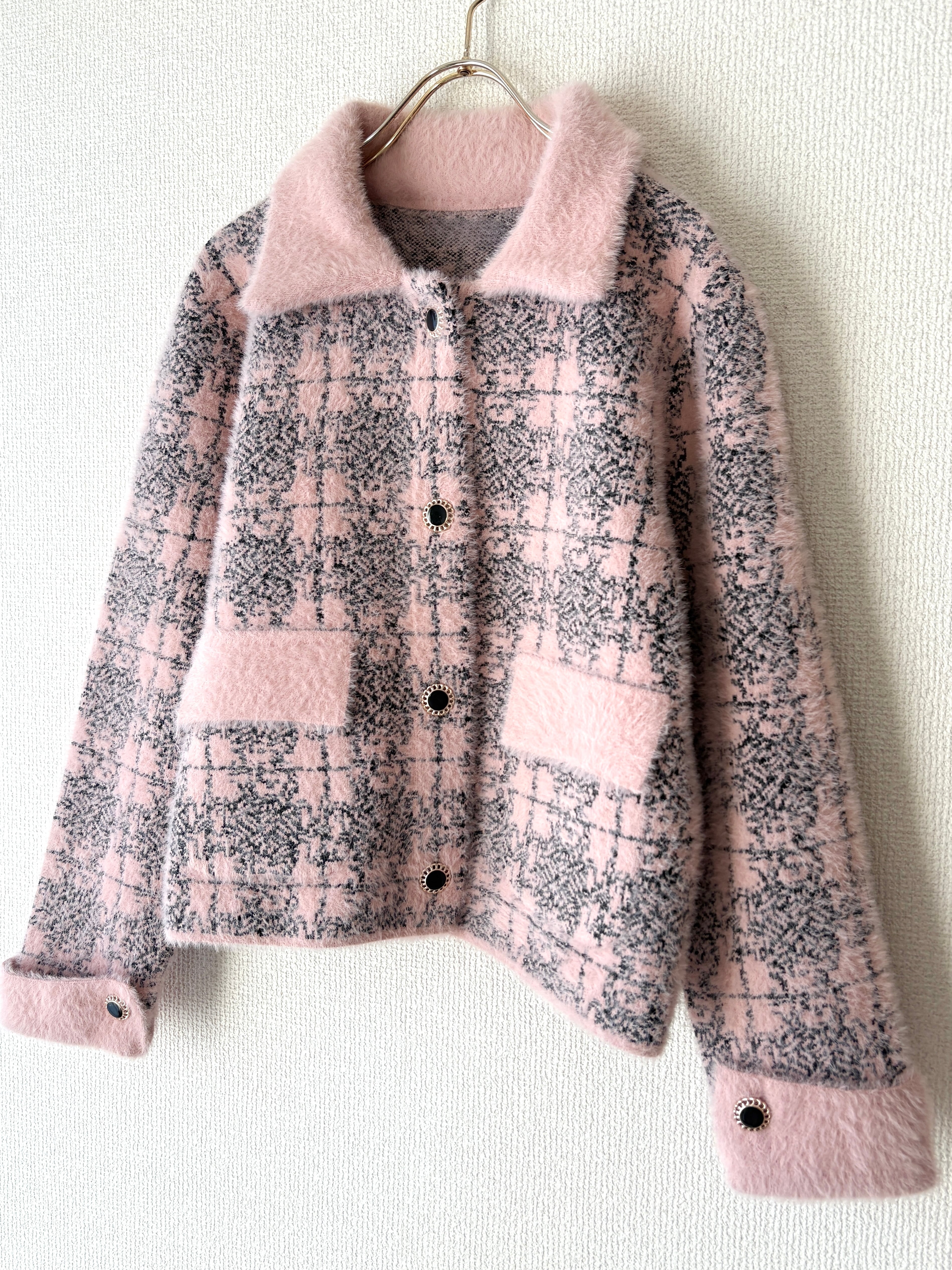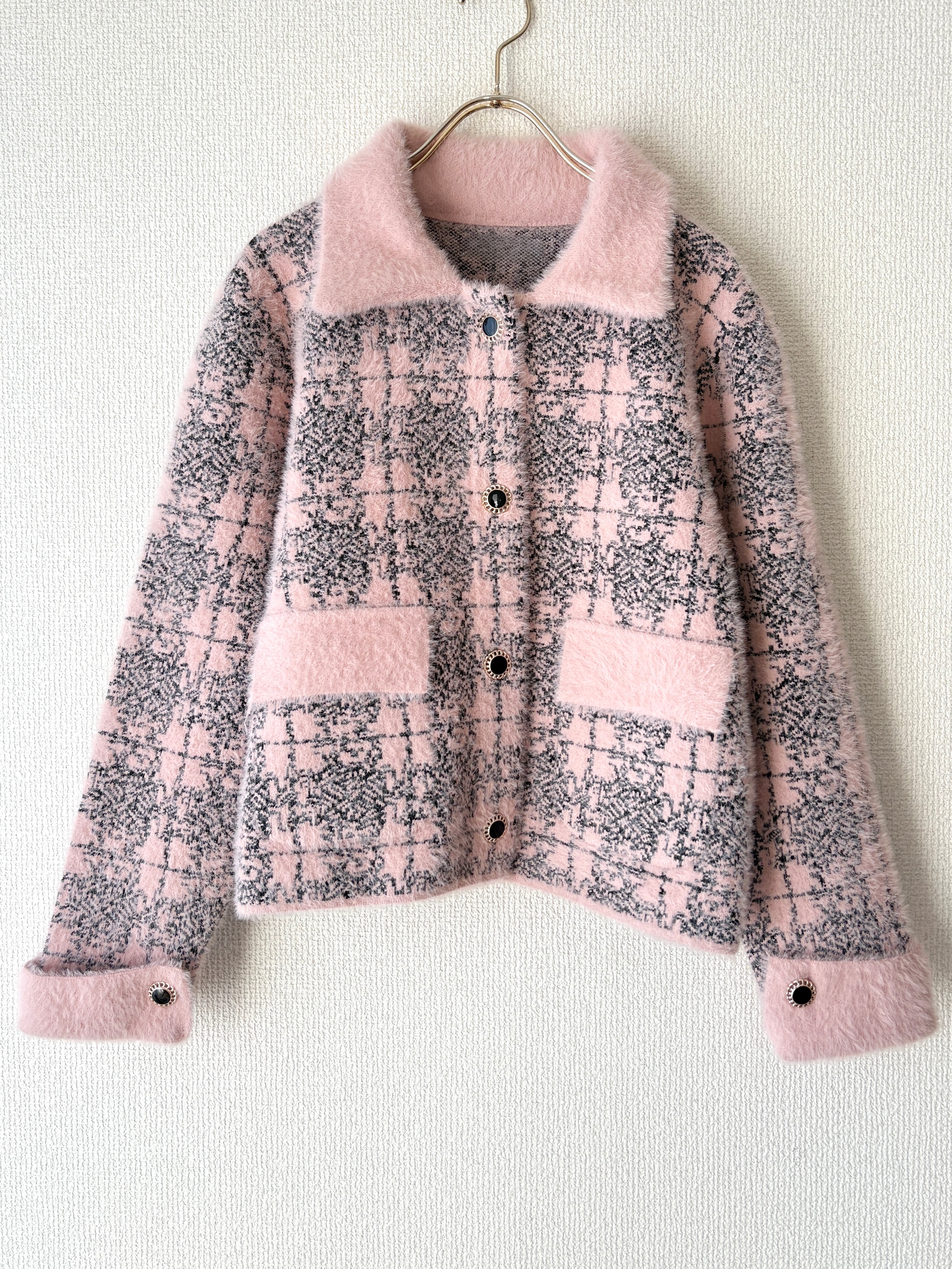 ツイード風の織り柄が大人っぽく、ピンクでも甘すぎない上品な印象になります。