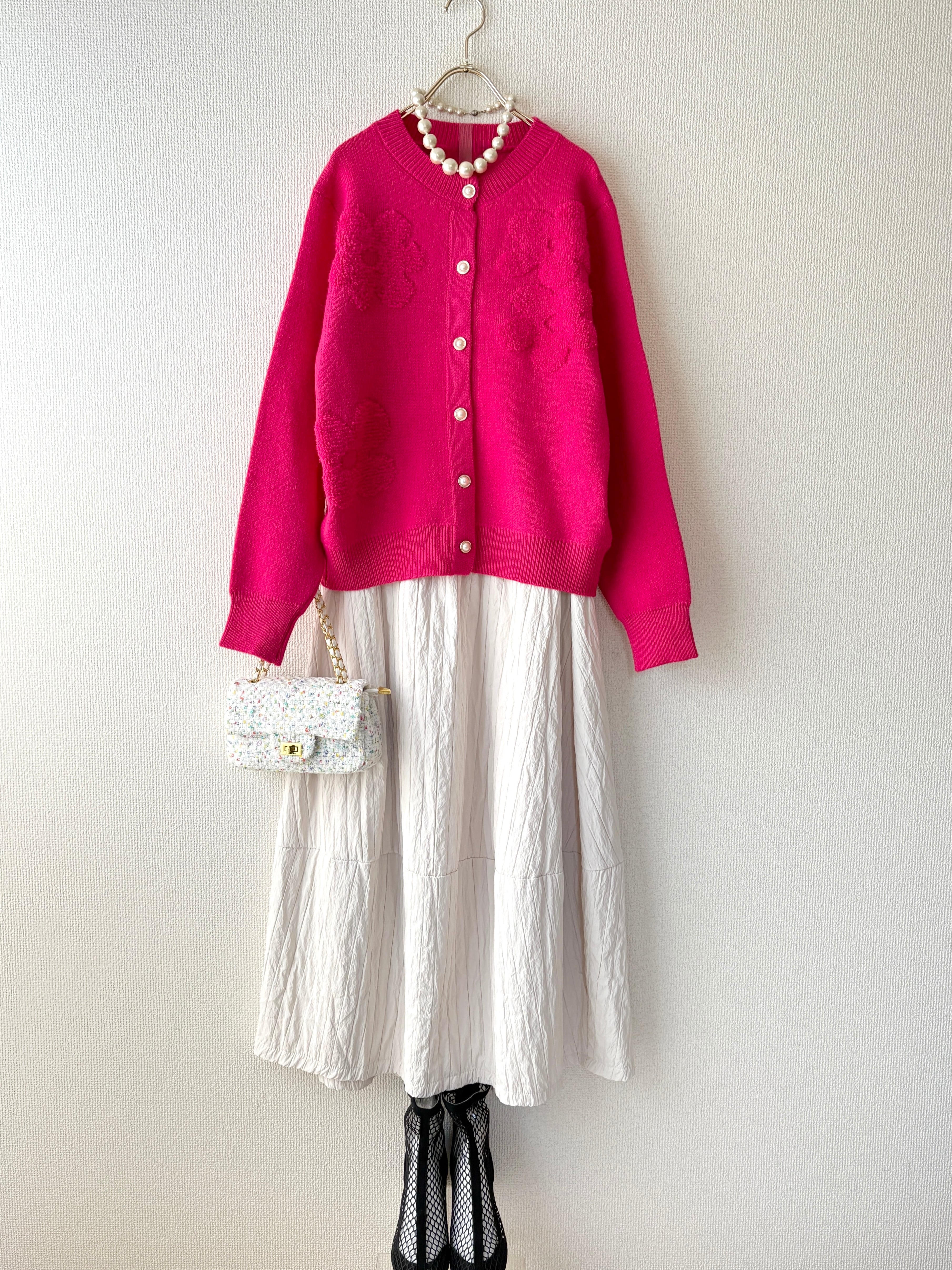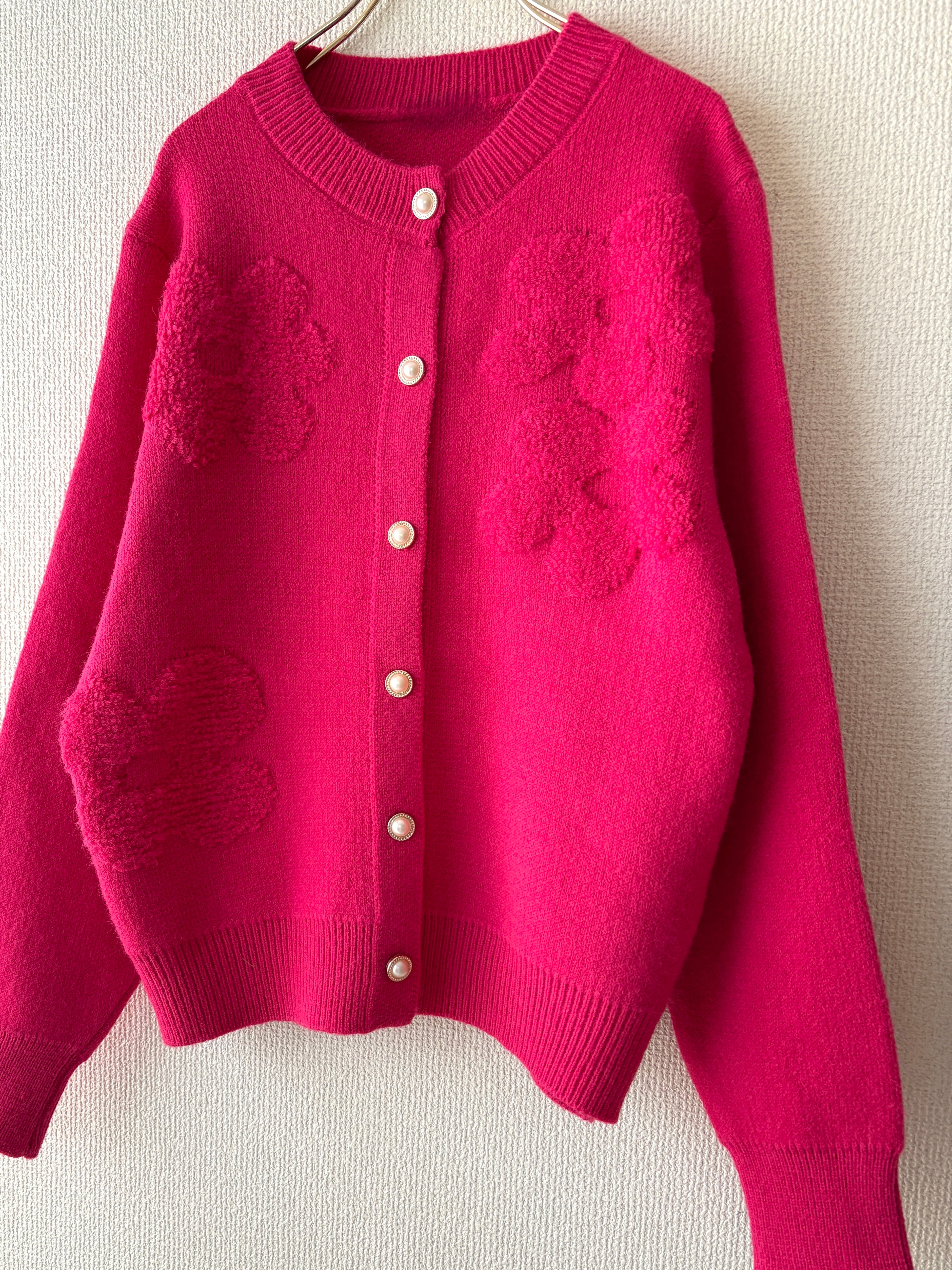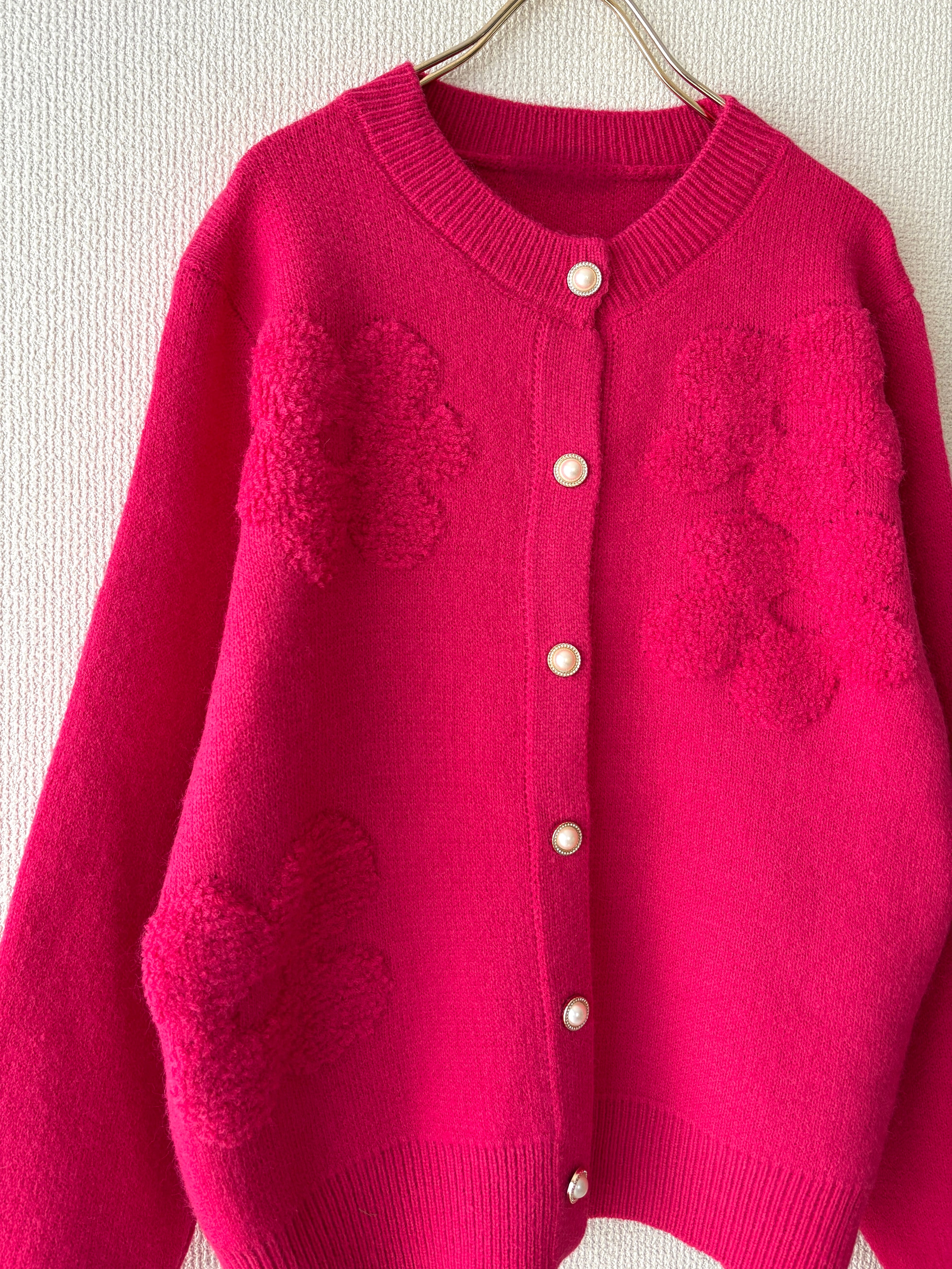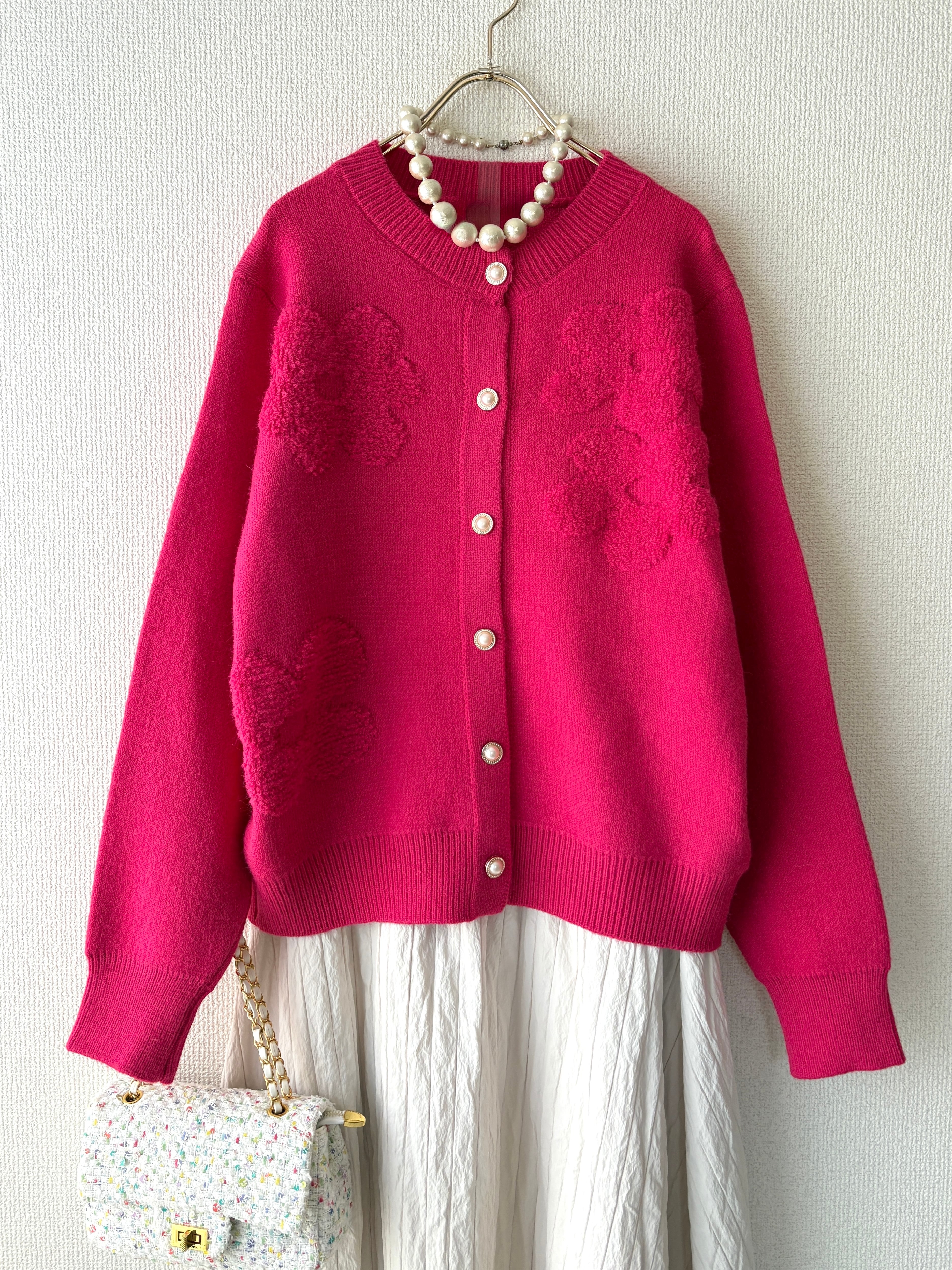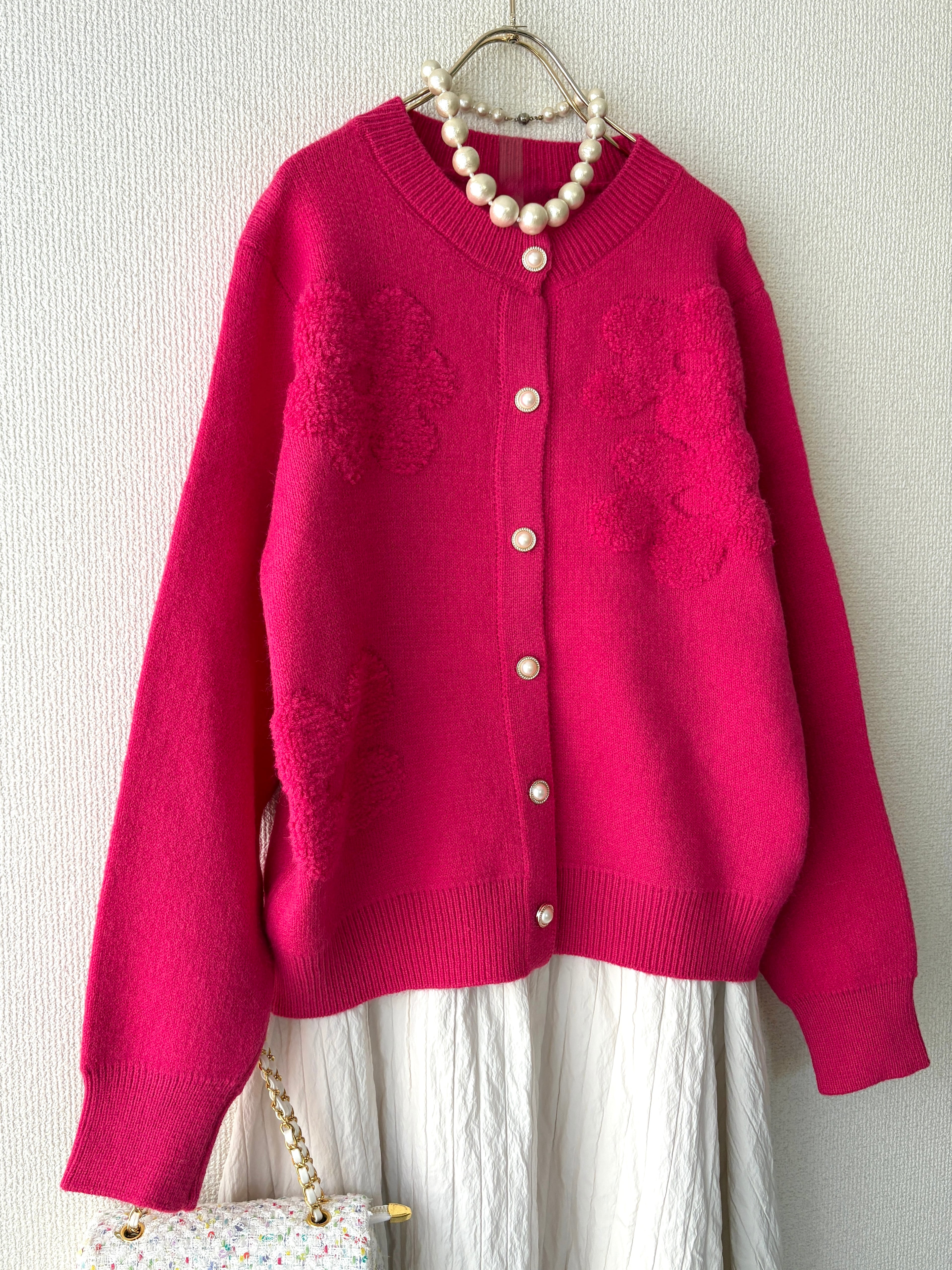 ゆったりとしたサイズ感で着れるカーディガンです。ビビットカラーのピンクでコーディネートのアクセントになり華やかな印象に。