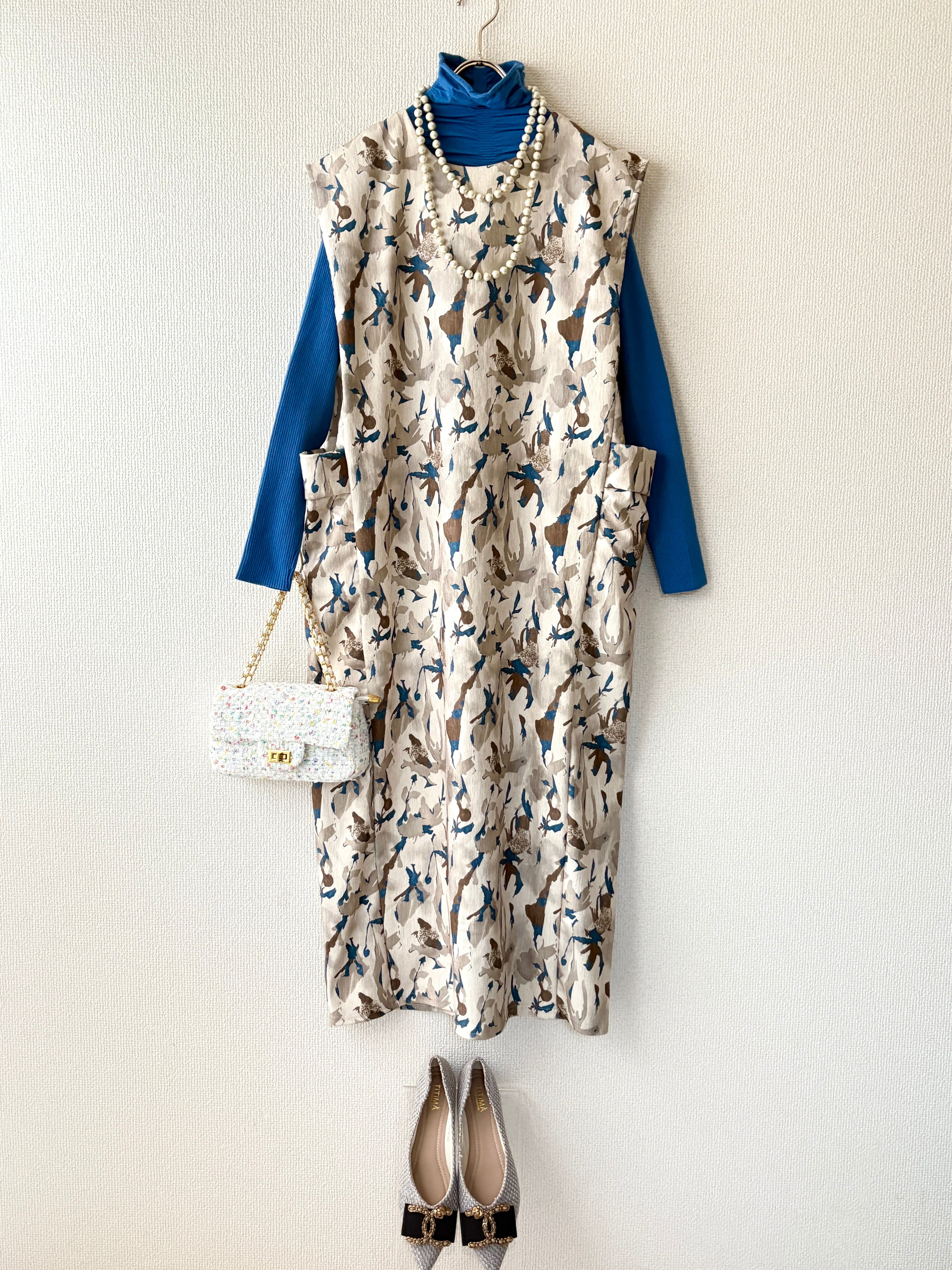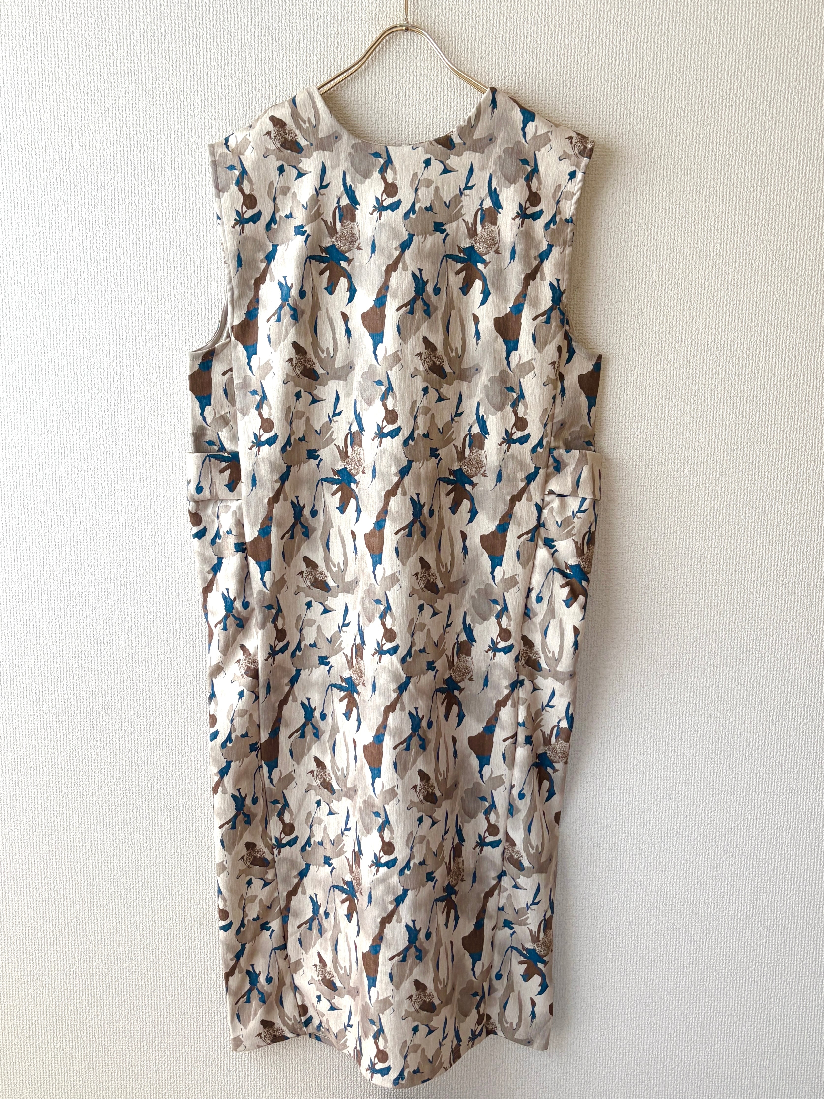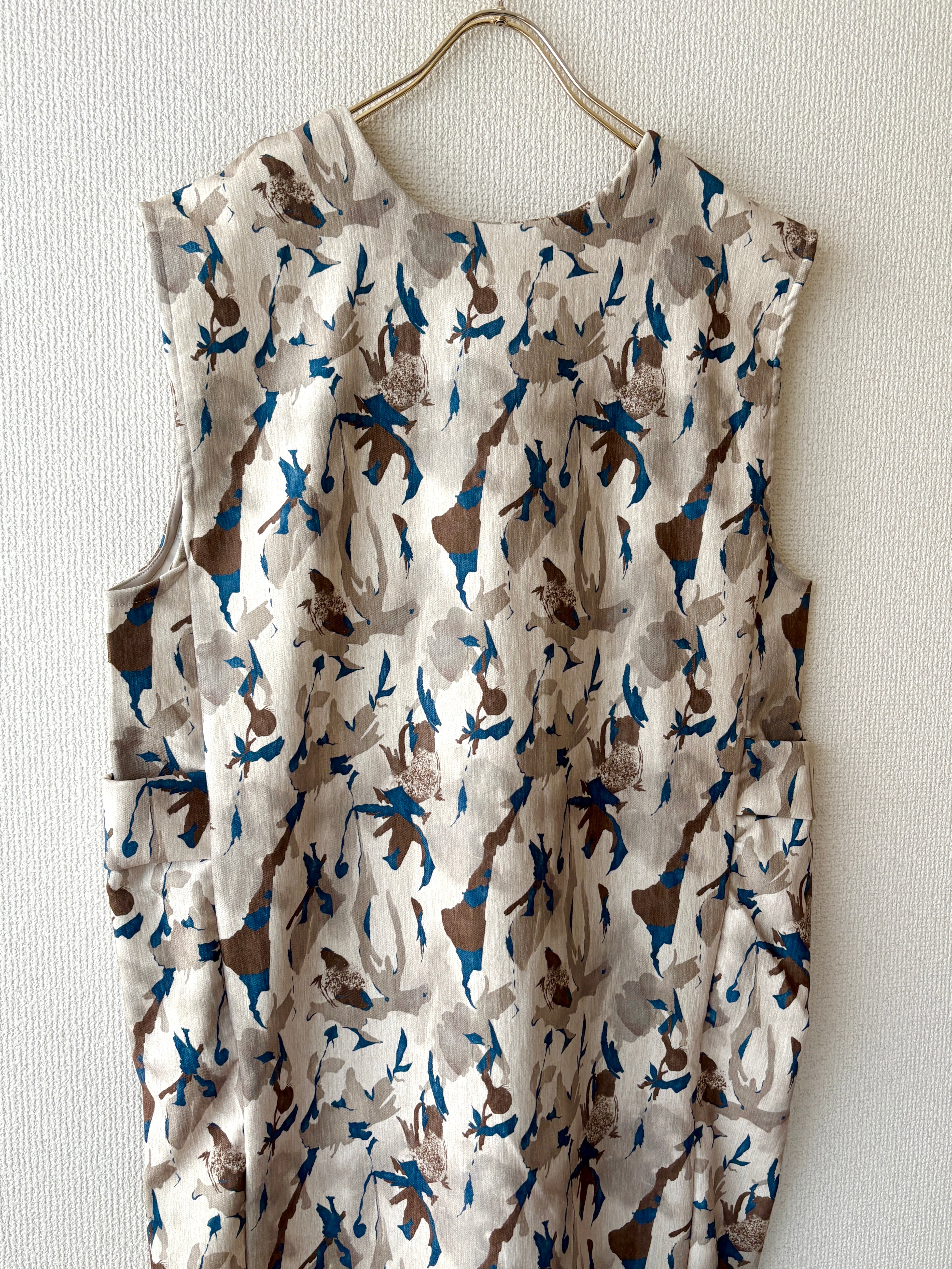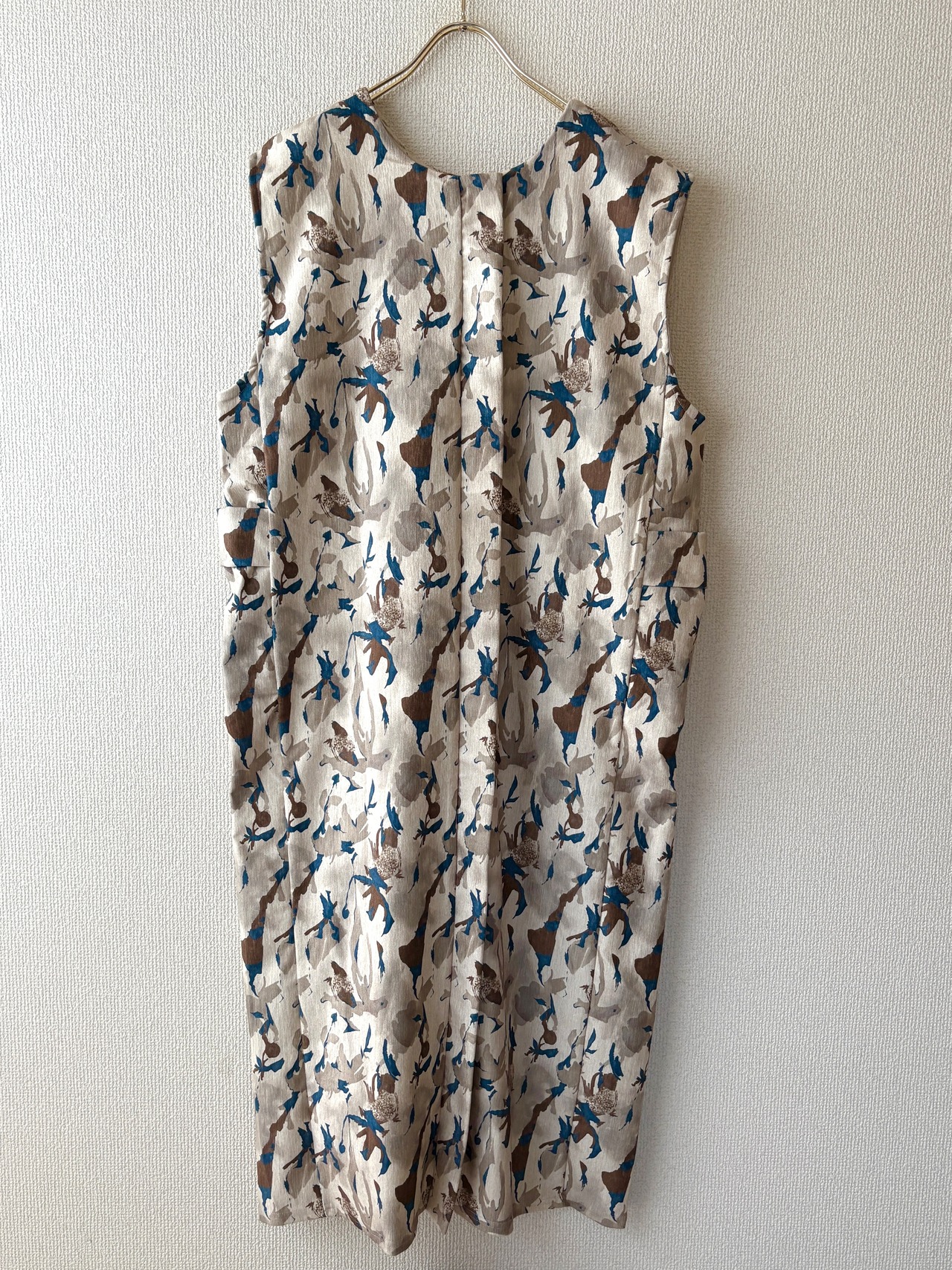抽象的なアート柄が目を惹く、大人のノースリーブワンピースです。