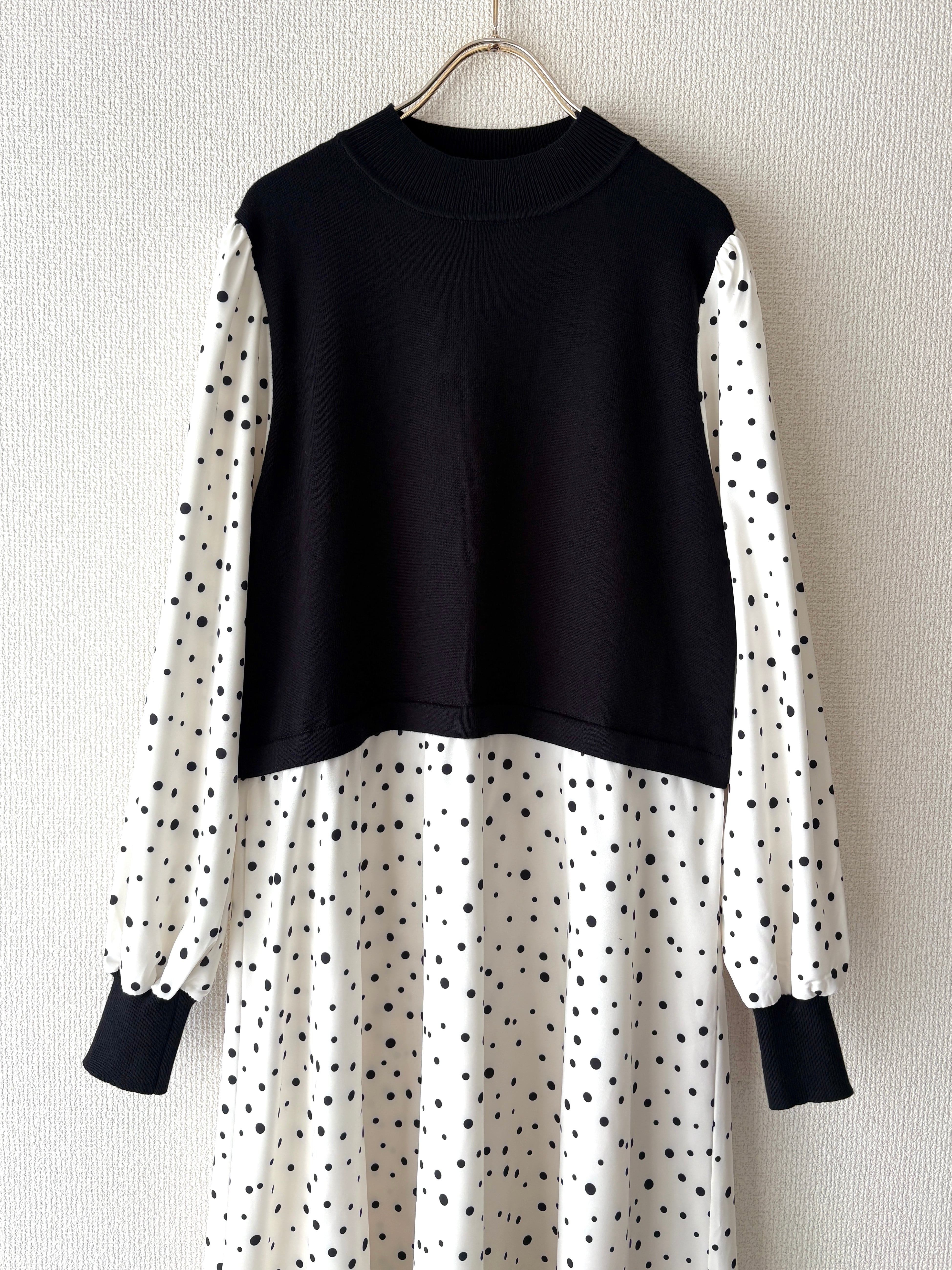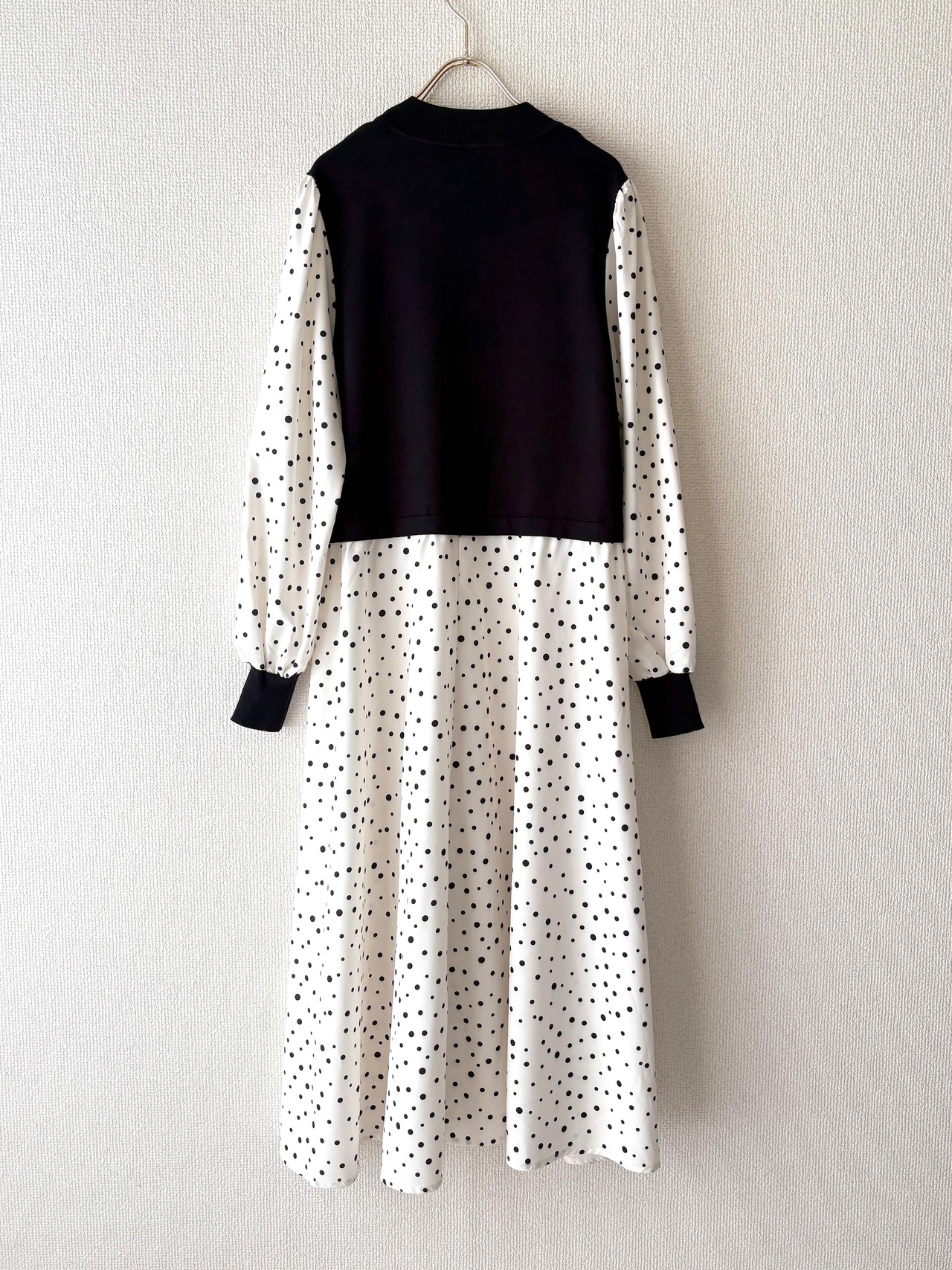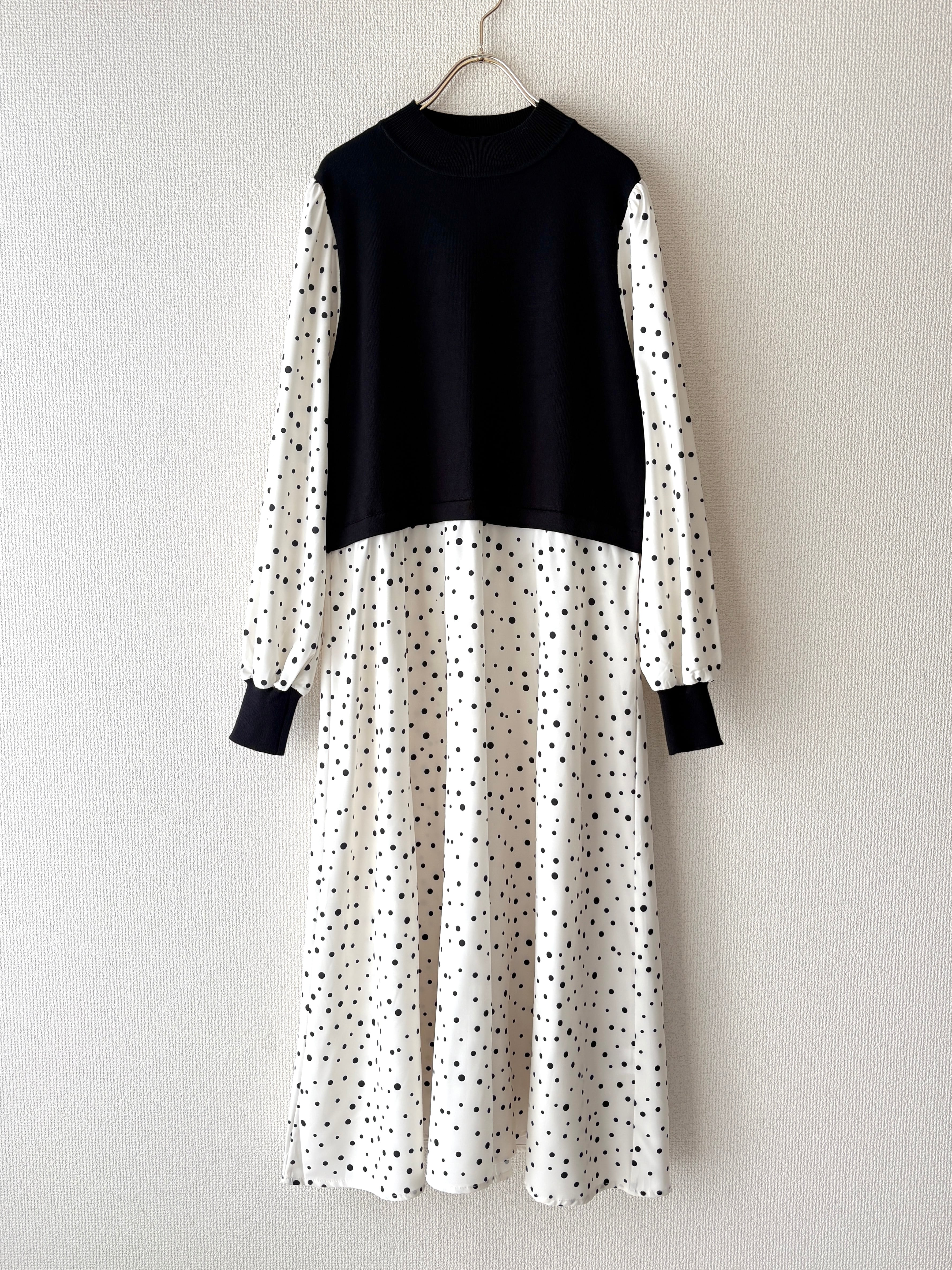 黒ベストを重ね着風のドット柄ワンピースです。ゆったりとした着心地でストレスフリーに着れます。