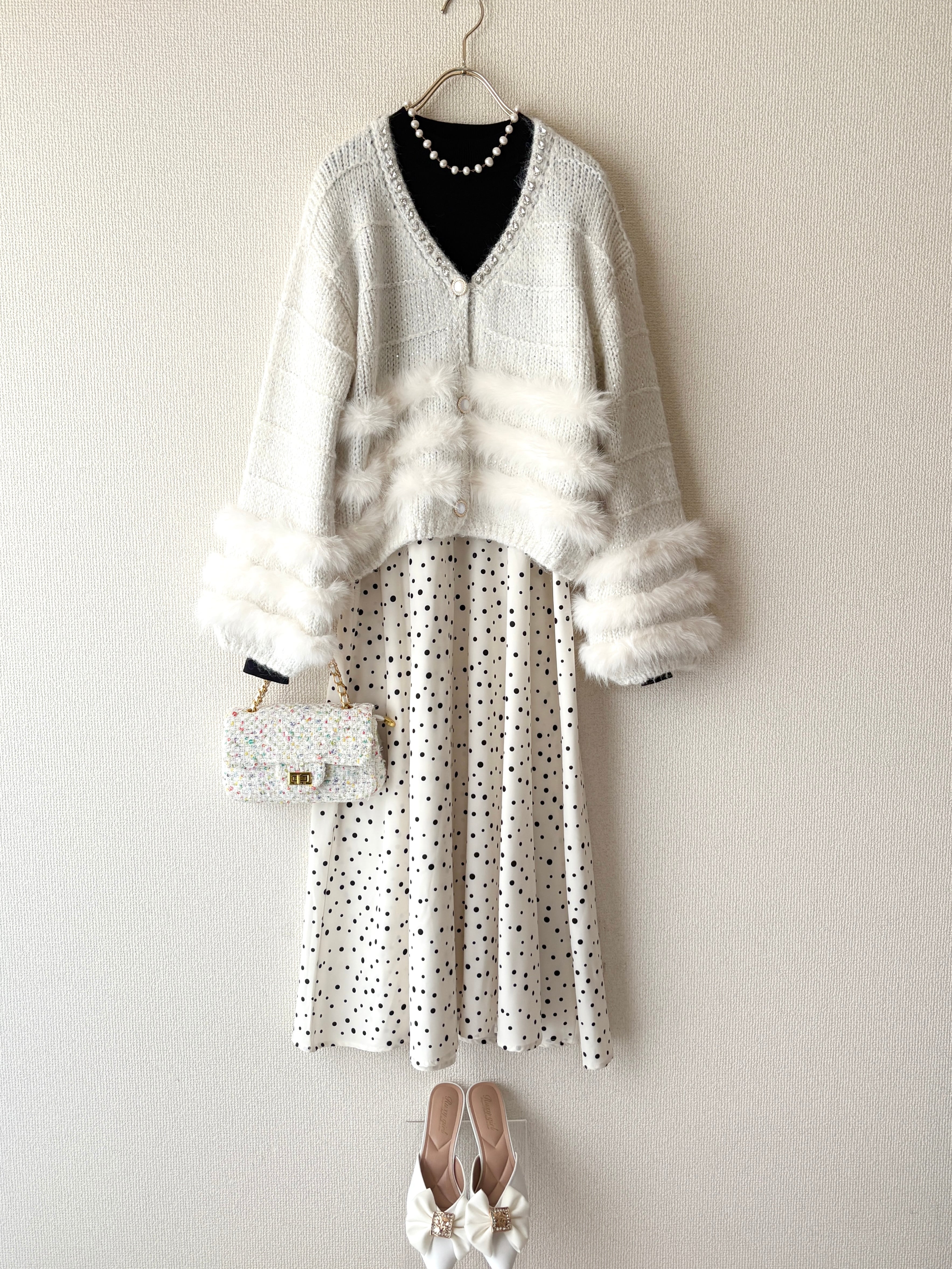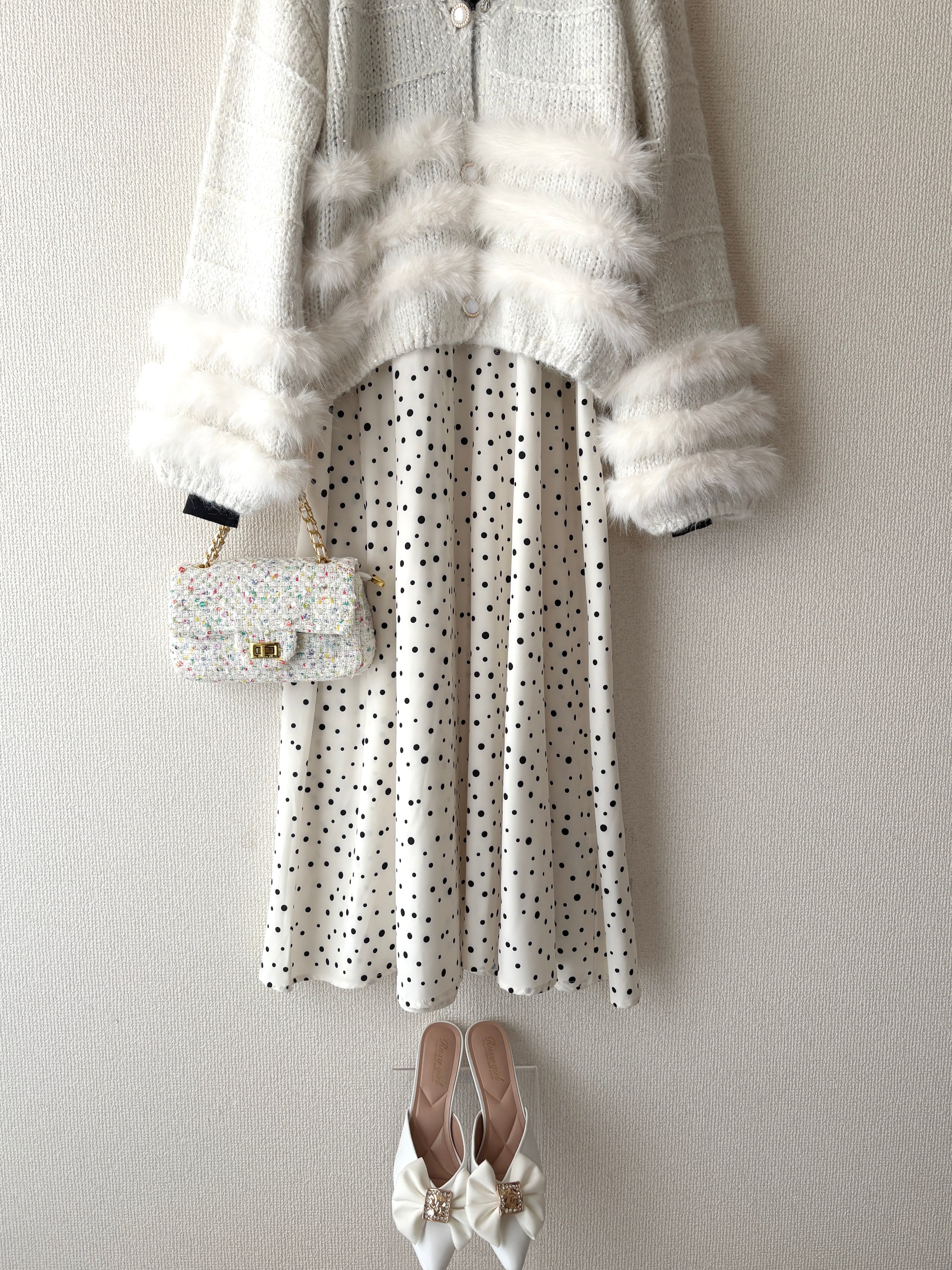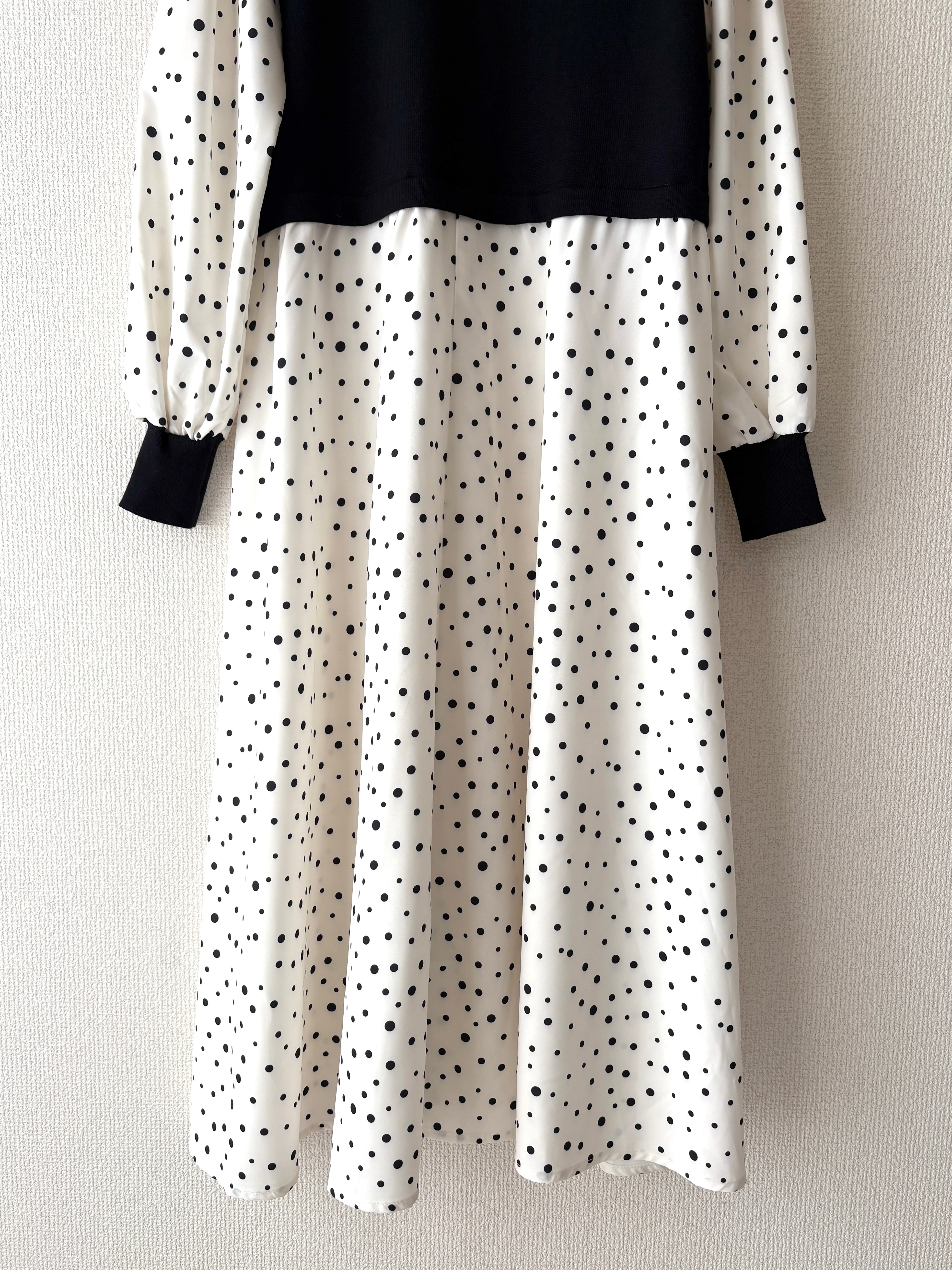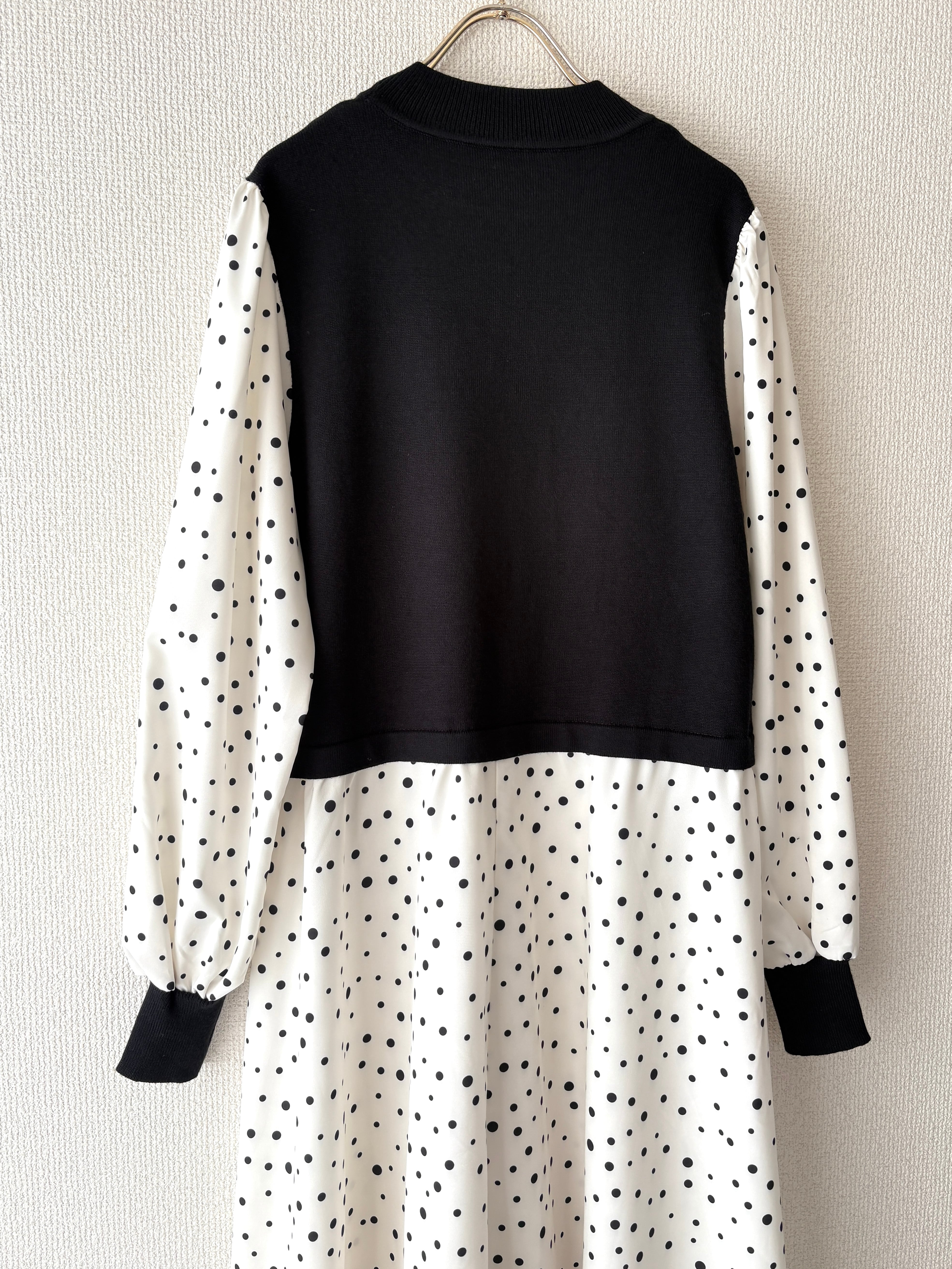 黒ベストを重ね着風のドット柄ワンピースです。ゆったりとした着心地でストレスフリーに着れます。