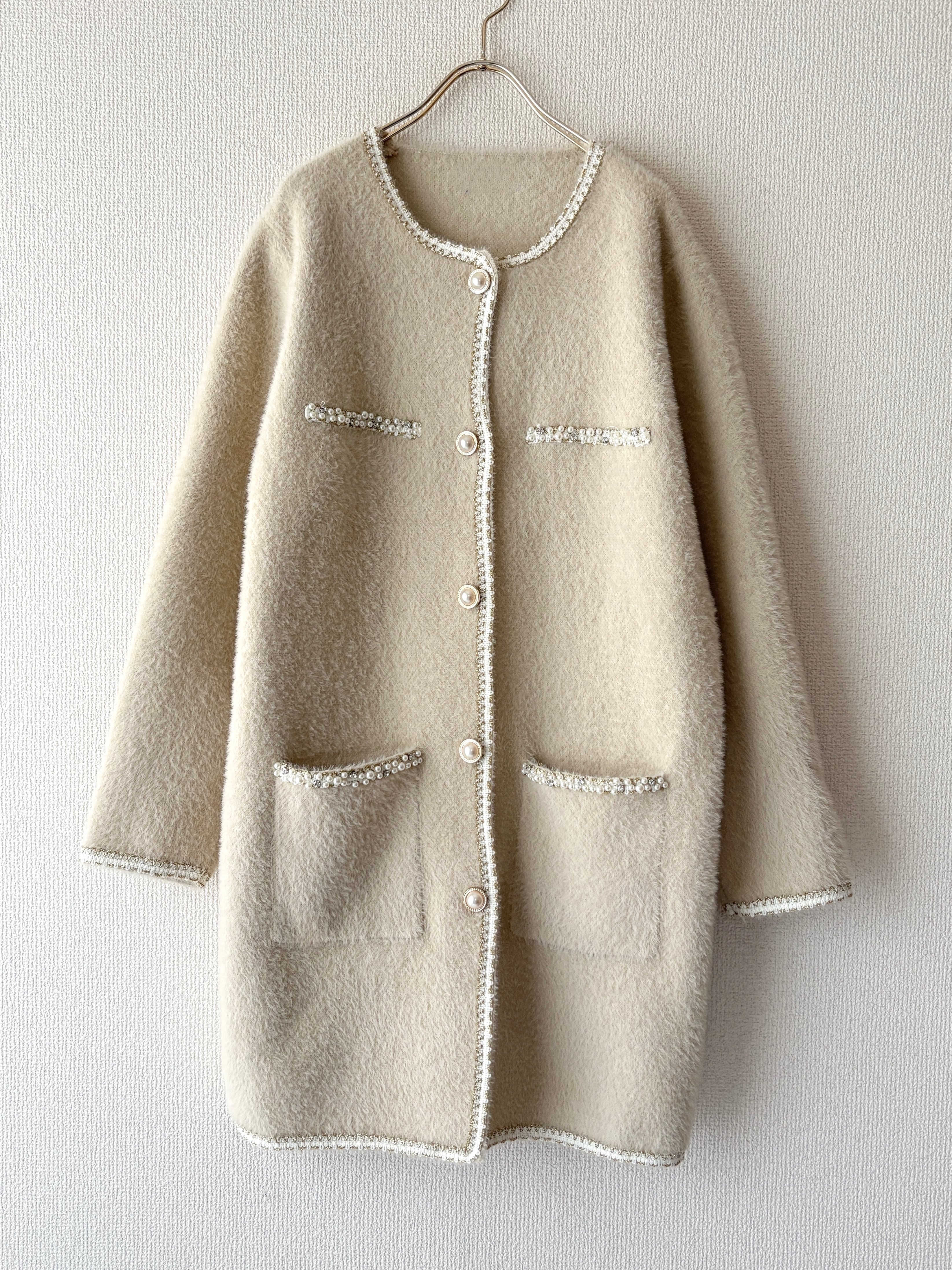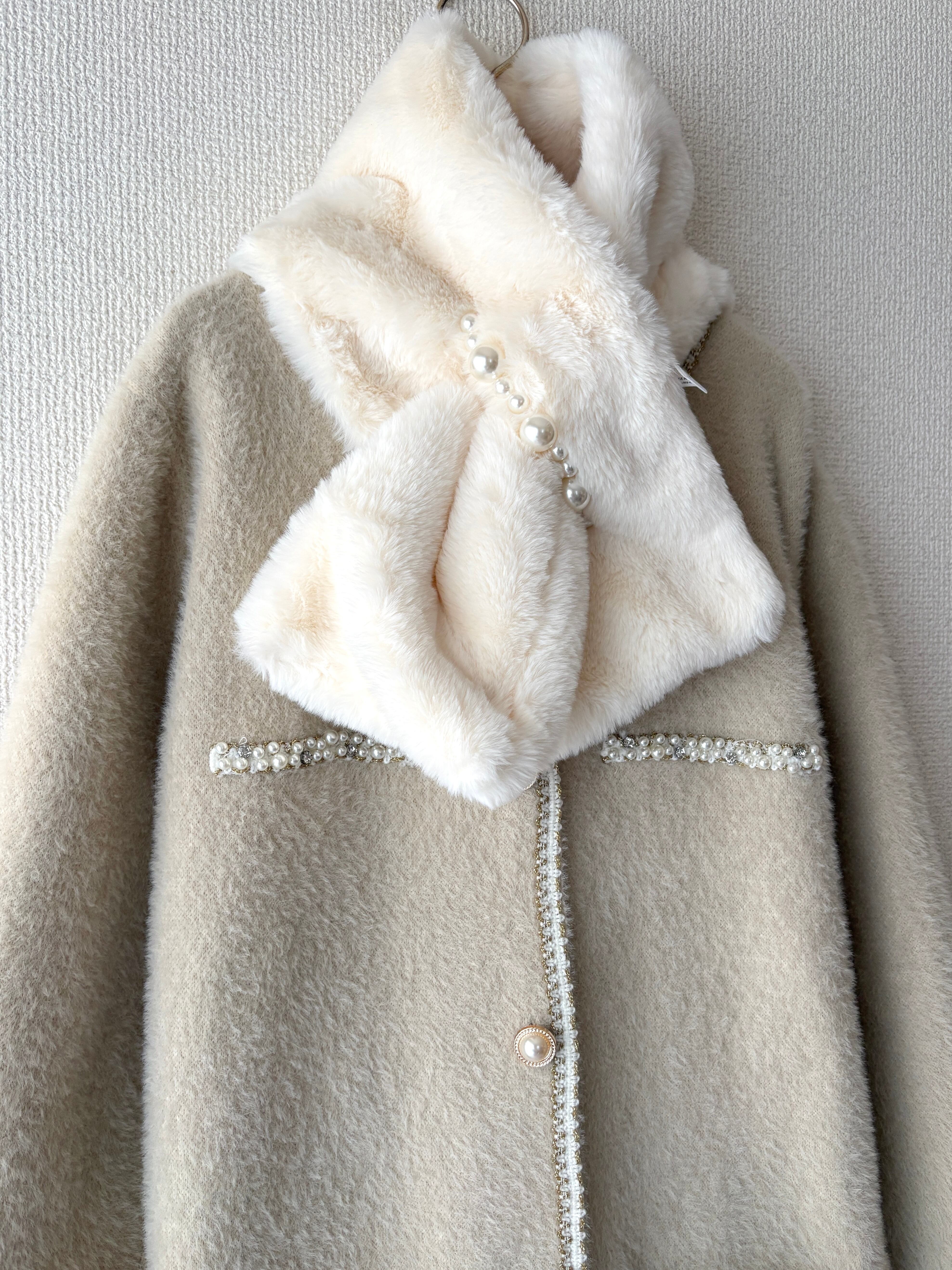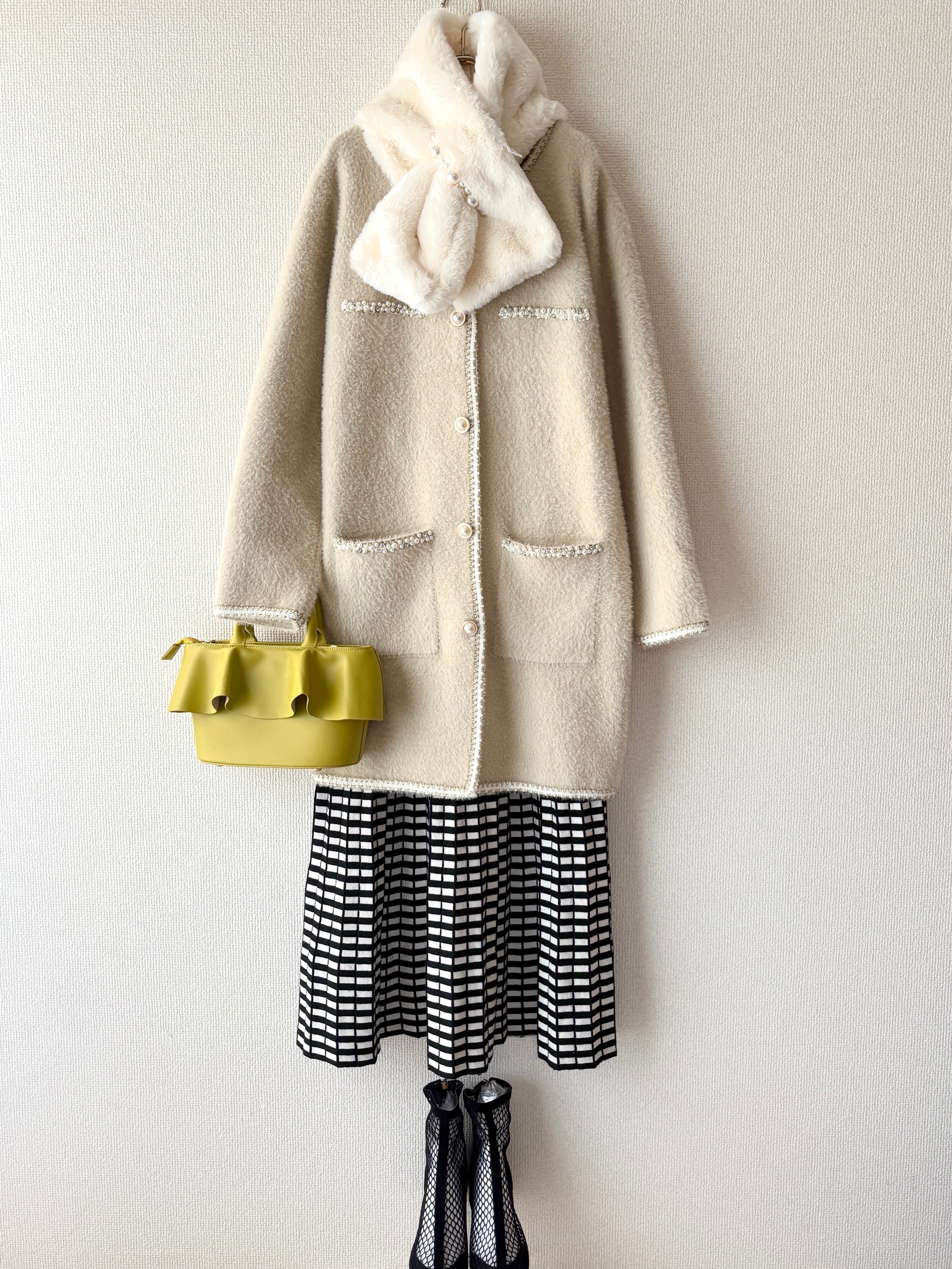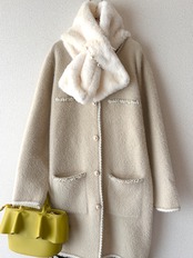 ふわっと柔らかな質感に、パールラインが映える大人の主役アウターです。
