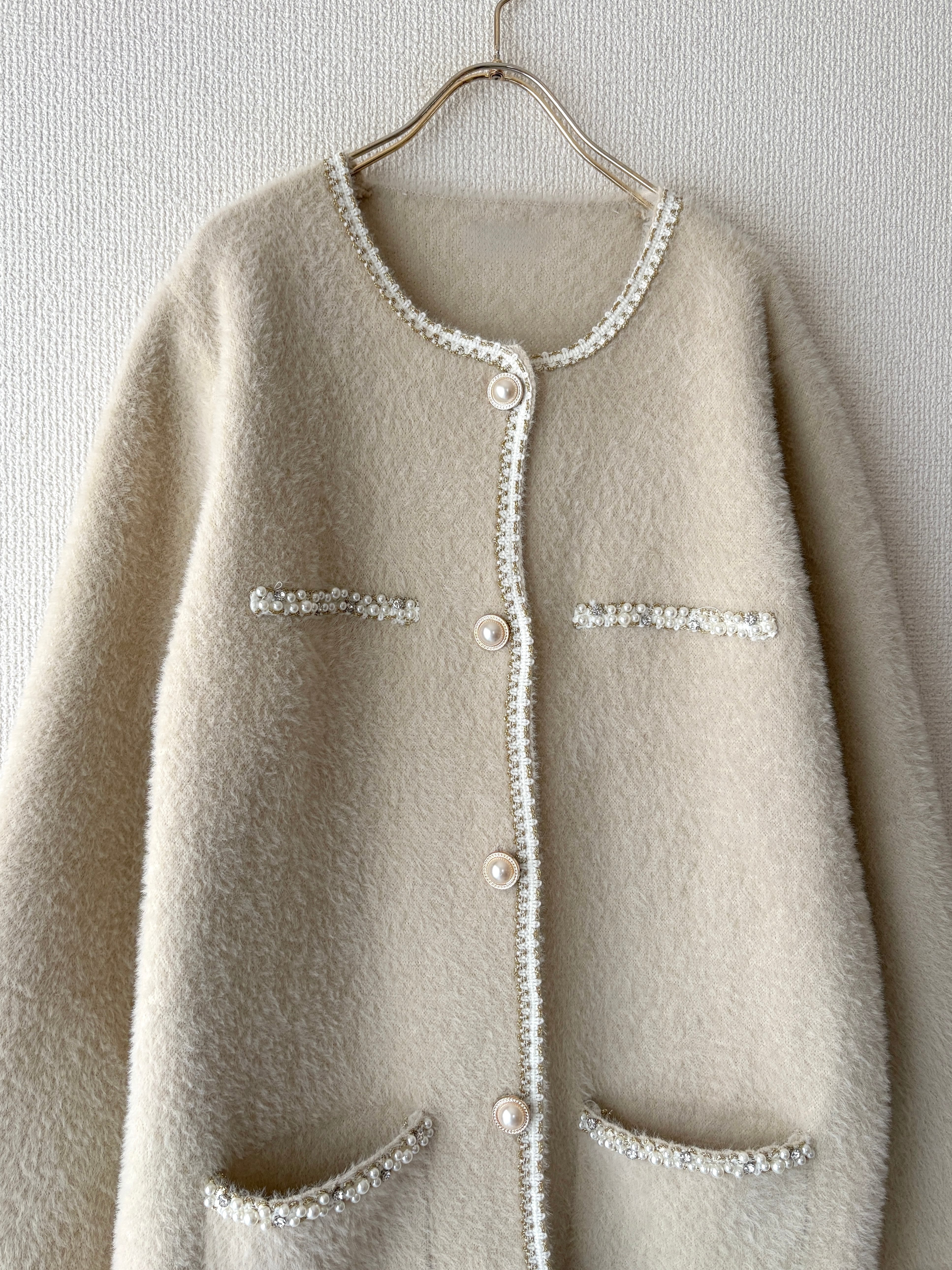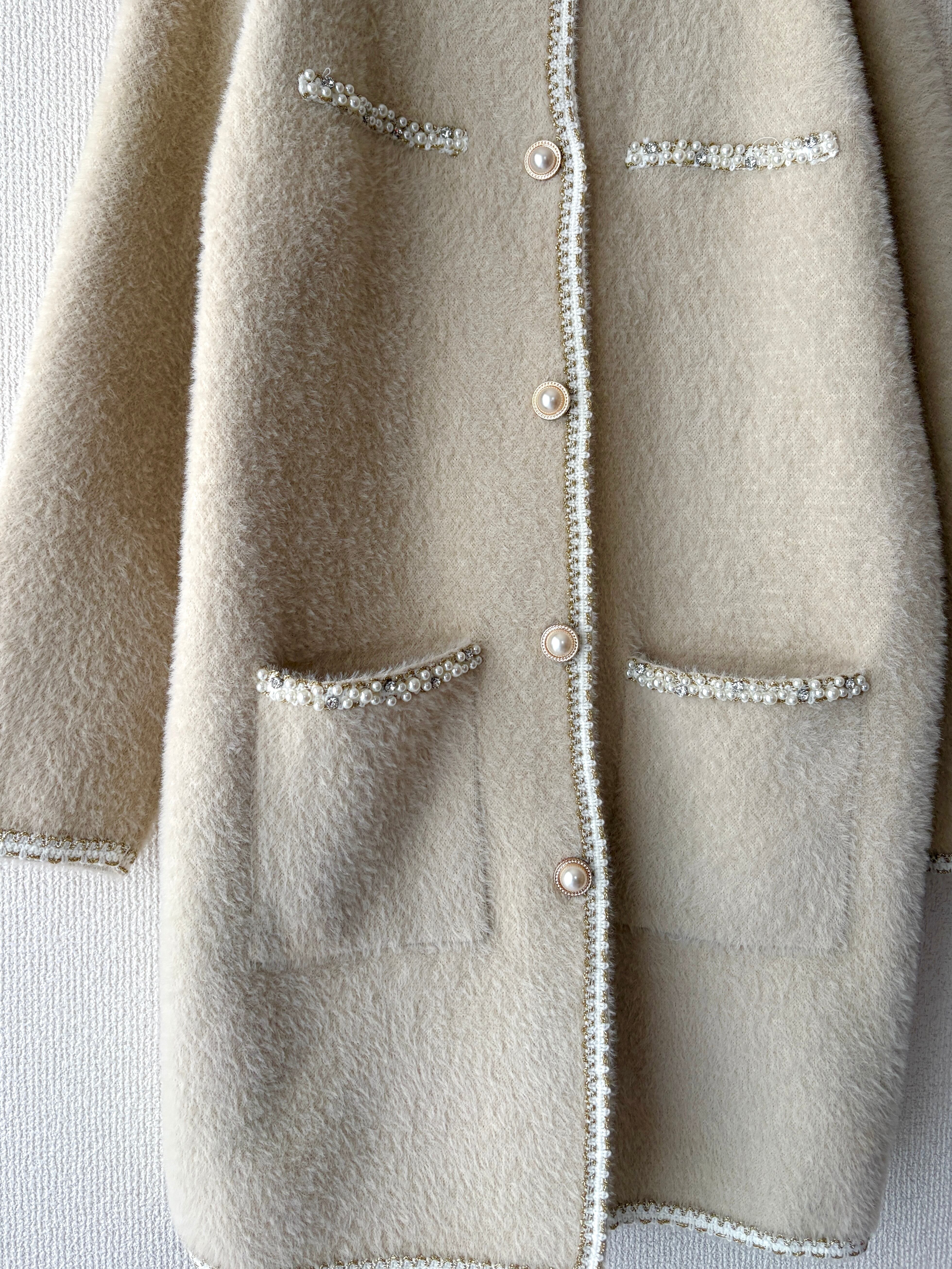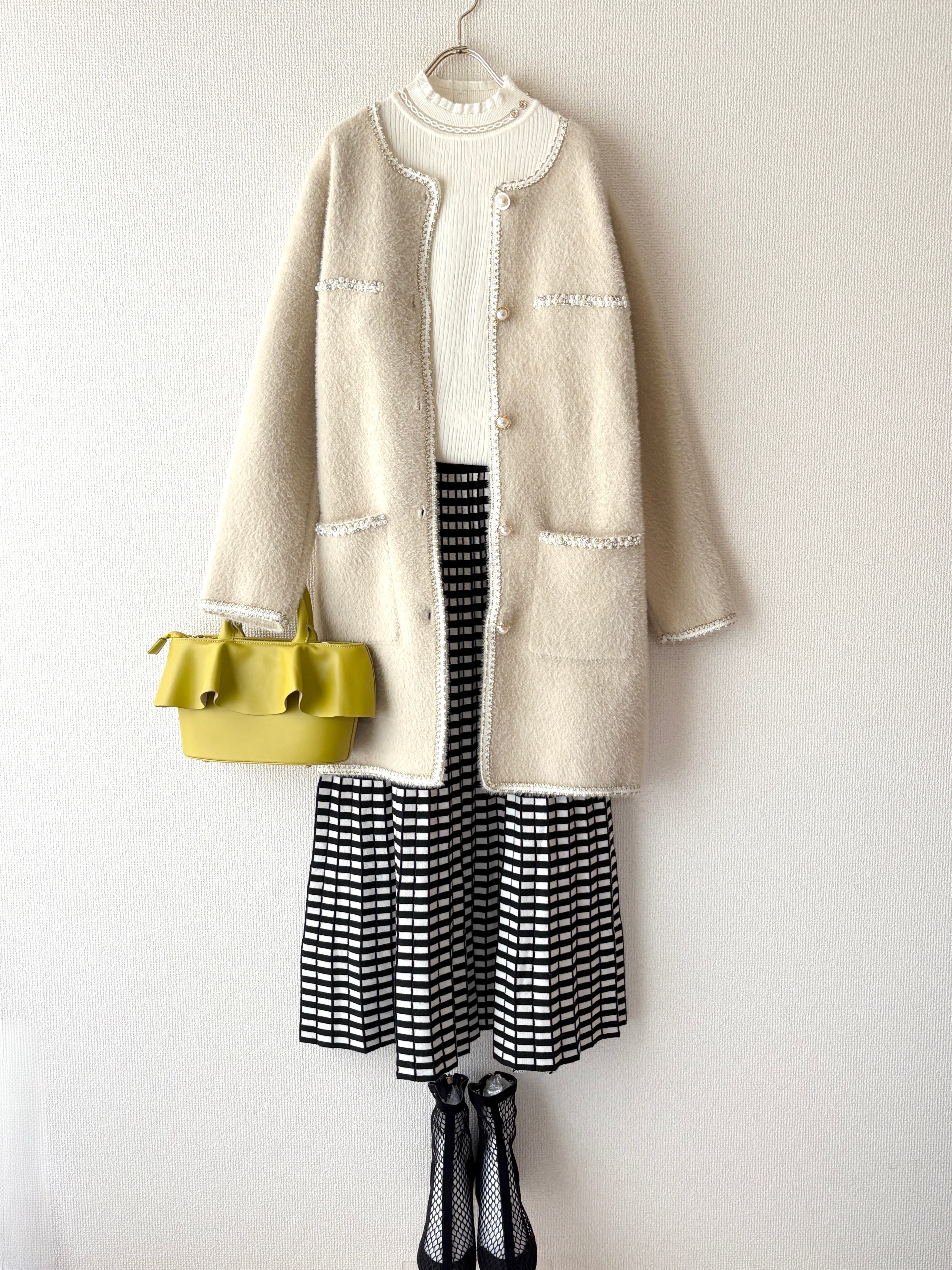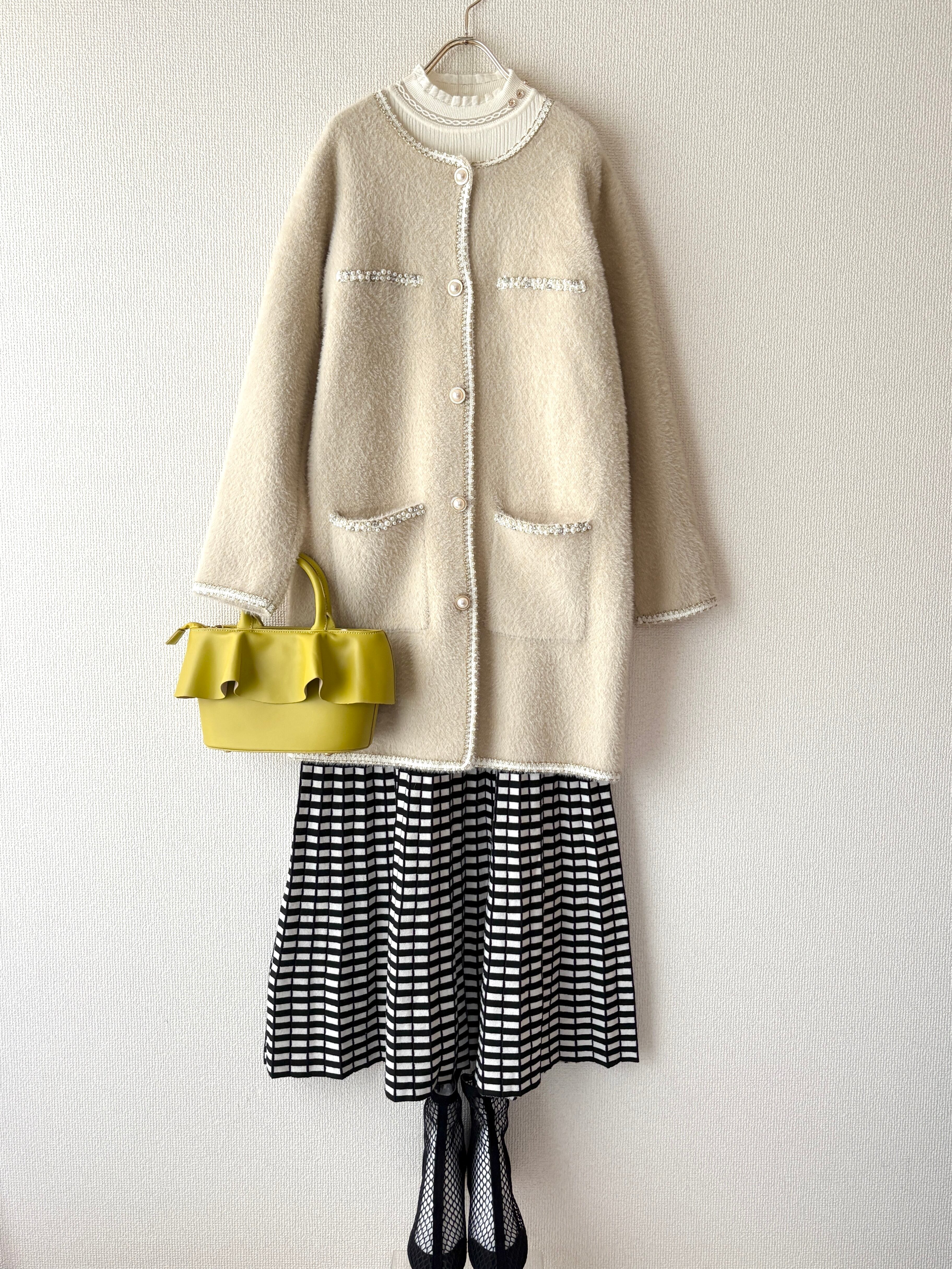 ふわっと柔らかな質感に、パールラインが映える大人の主役アウターです。