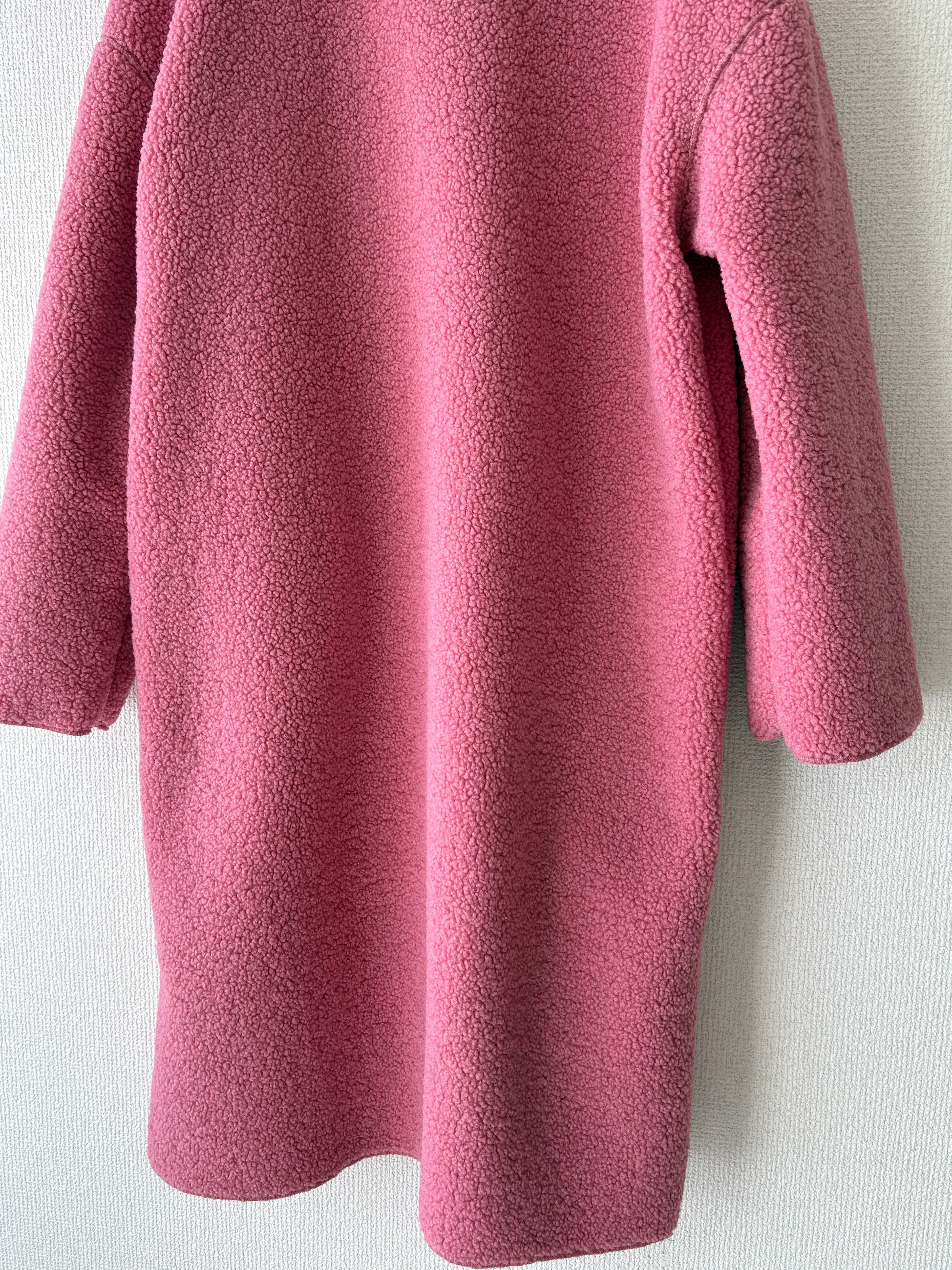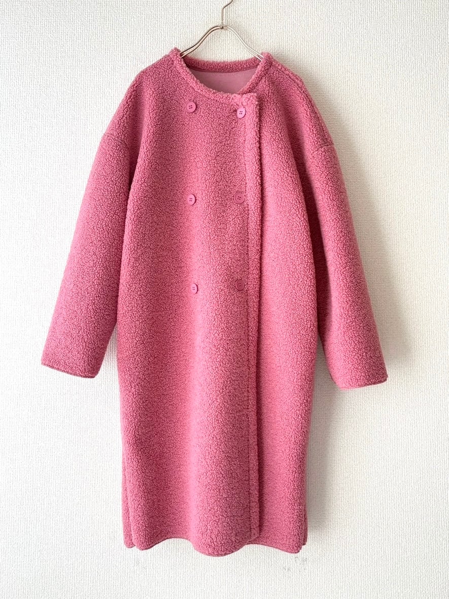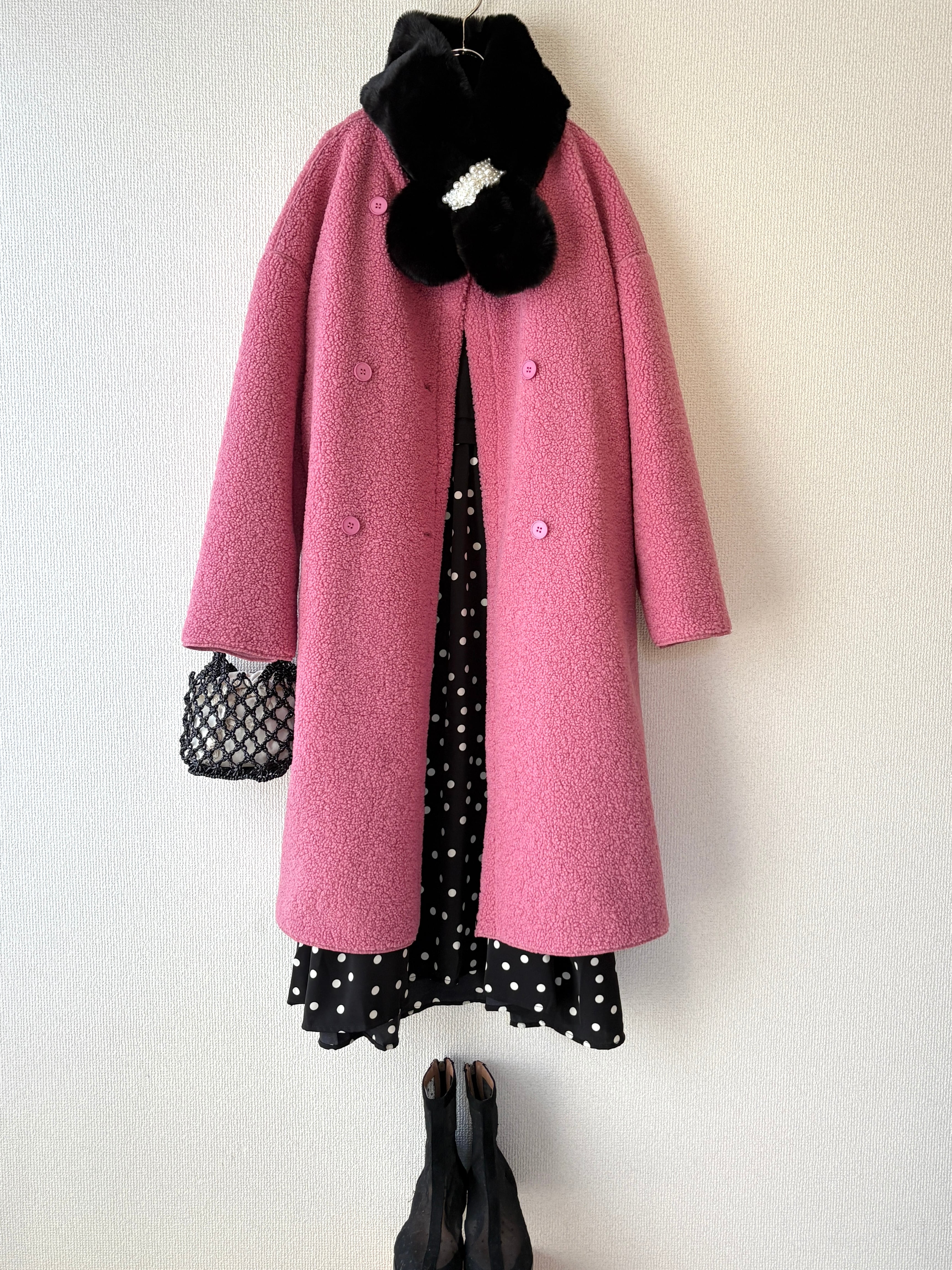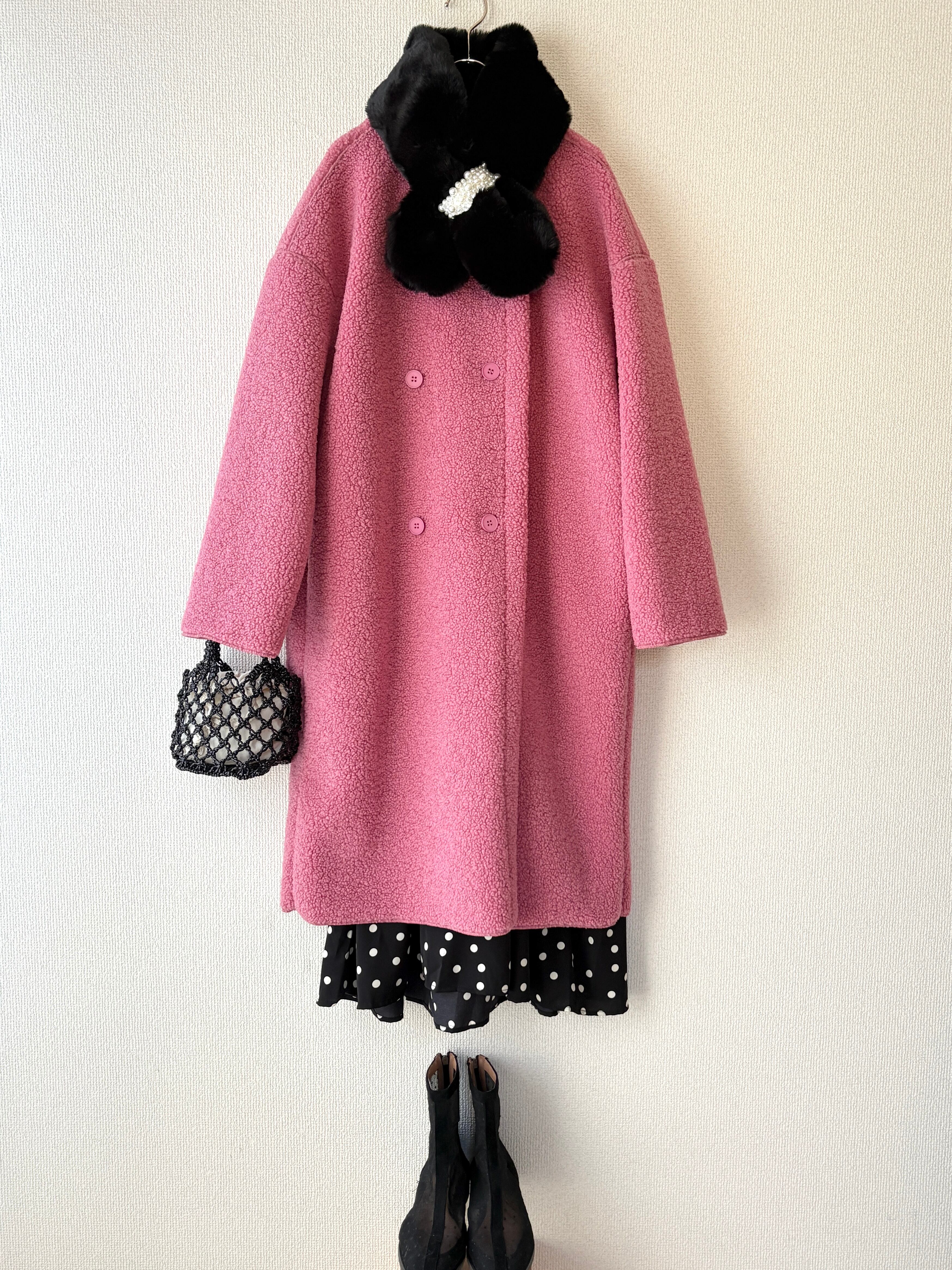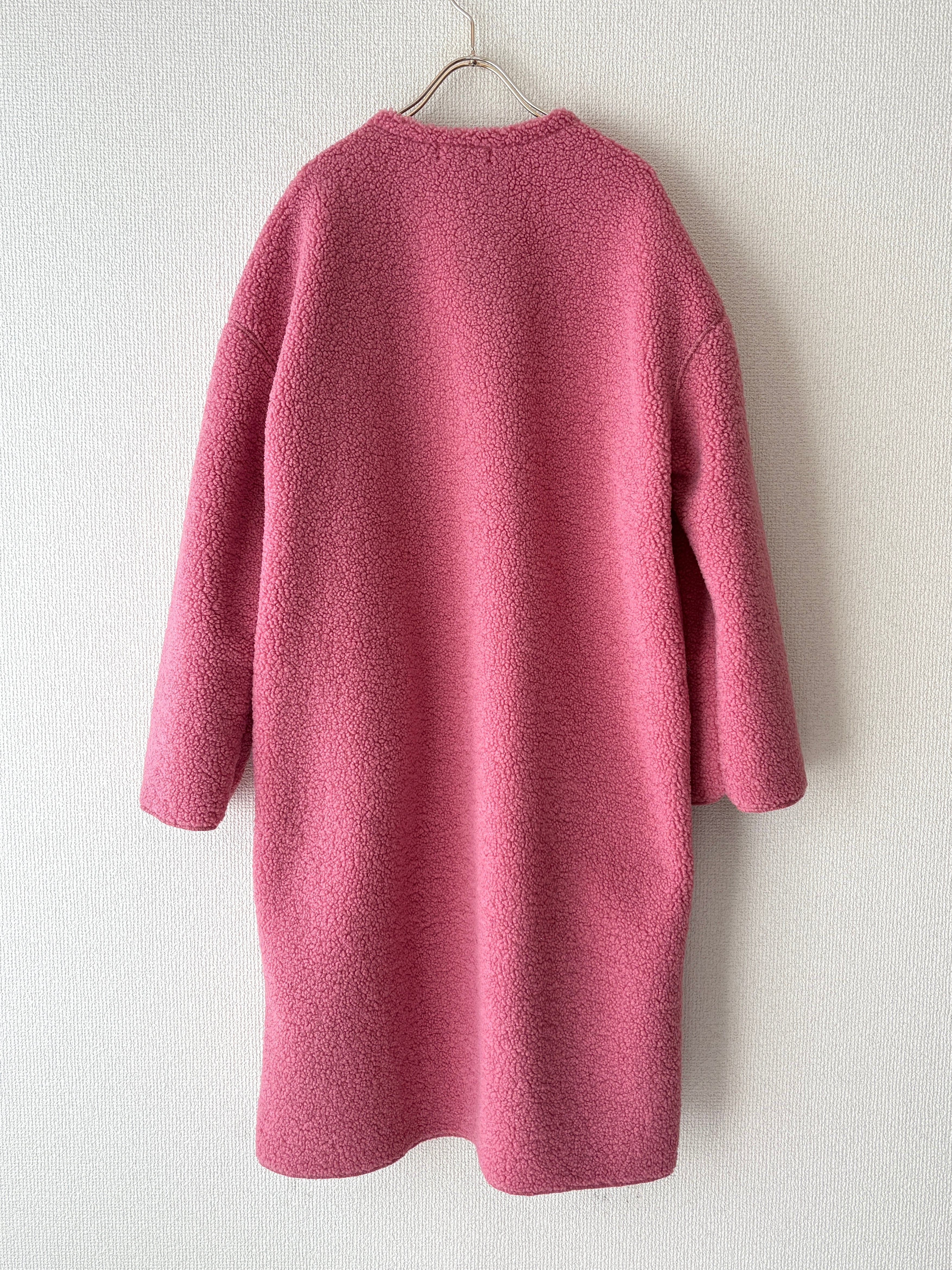 ふんわりボア素材で、見た目も着心地もあたたかいです。ノーカラーですっきり見え、羽織るだけで大人可愛い印象に。