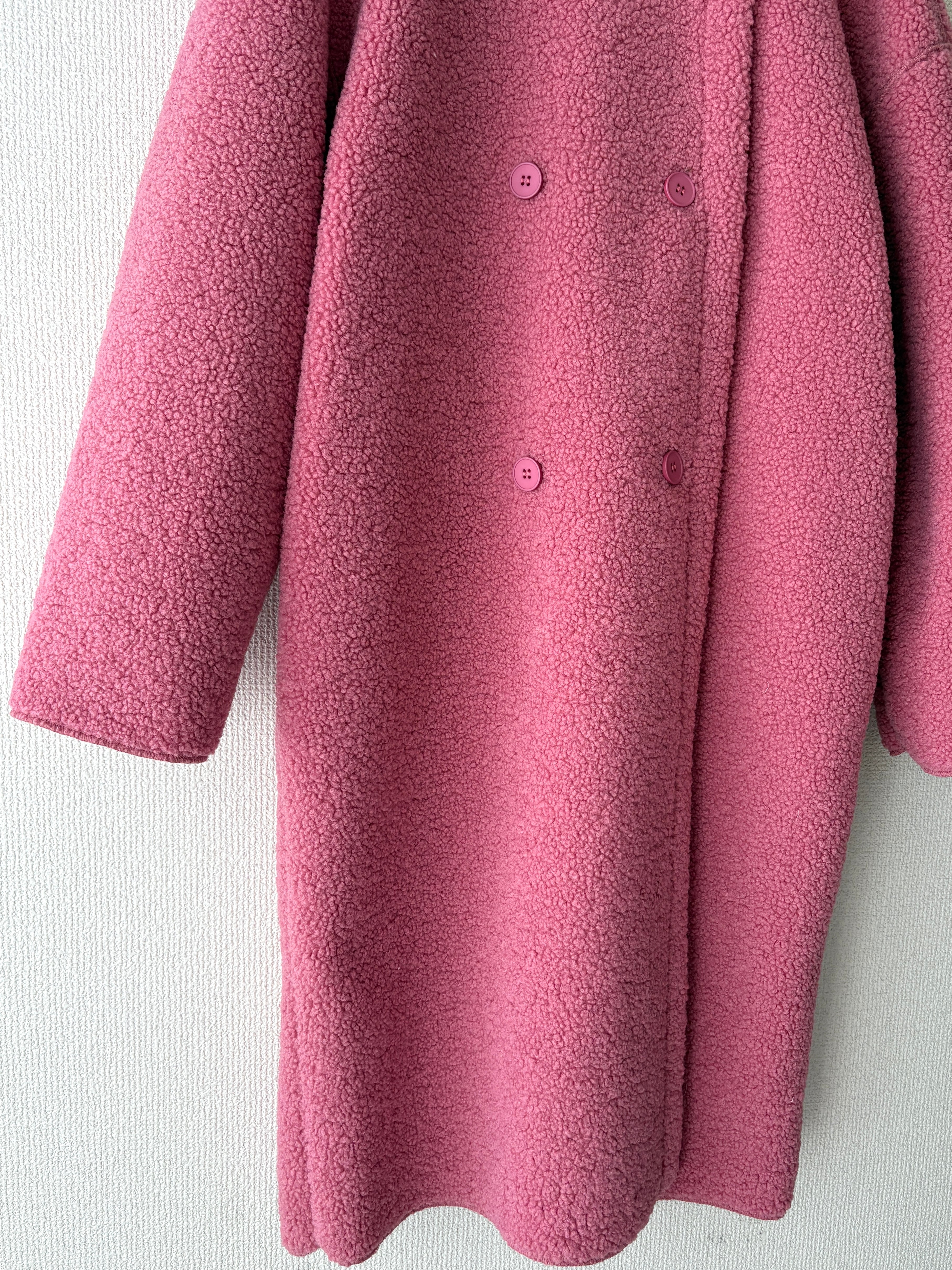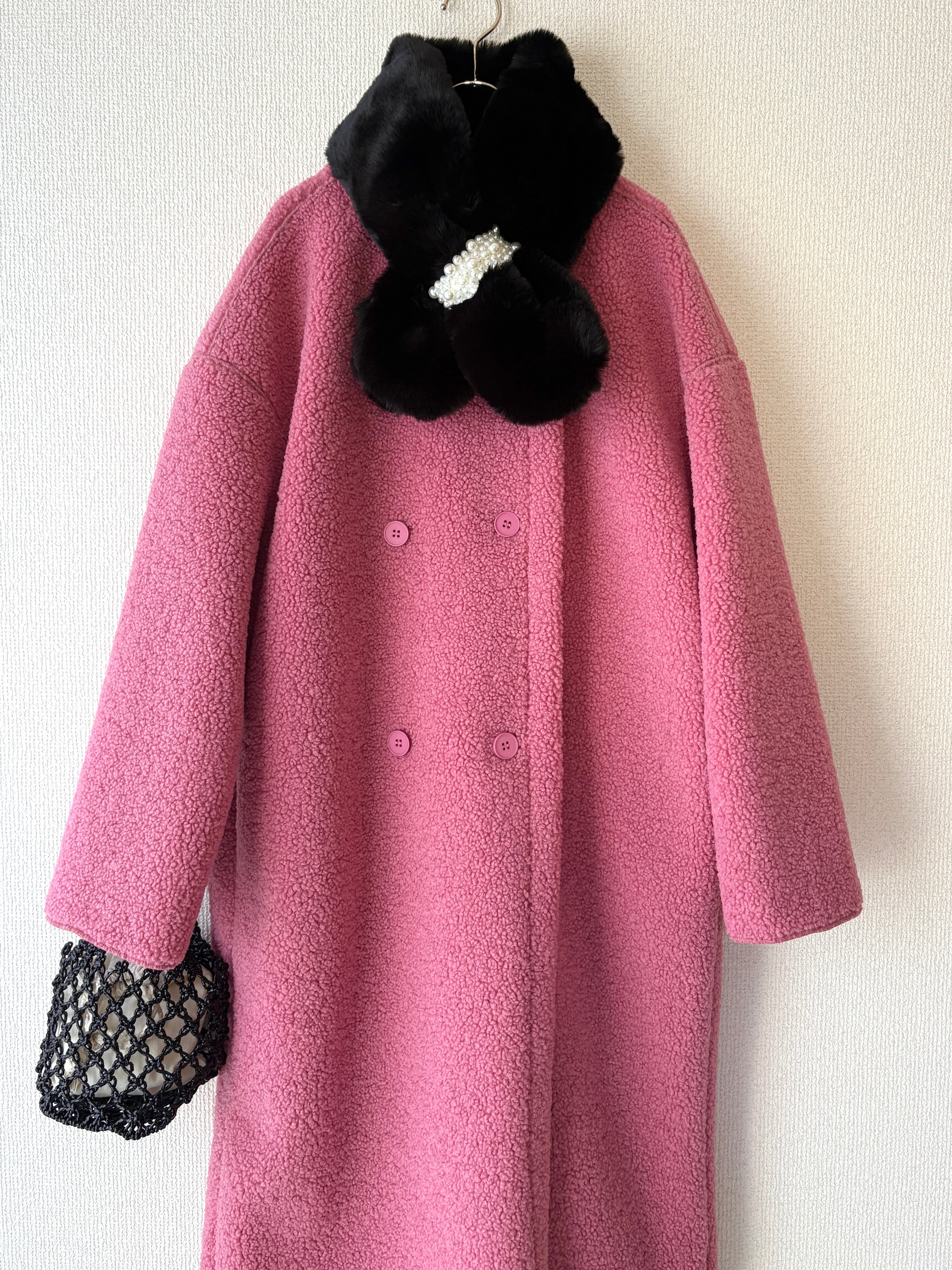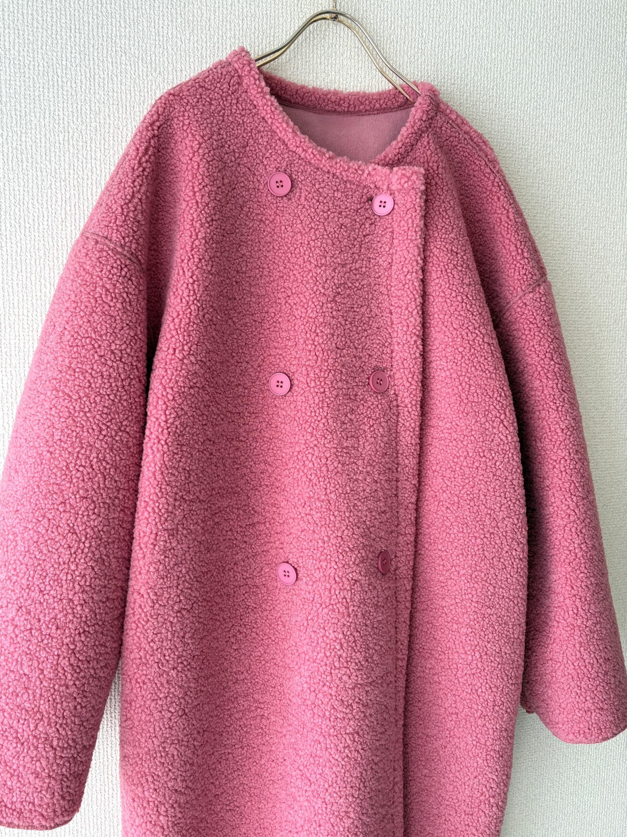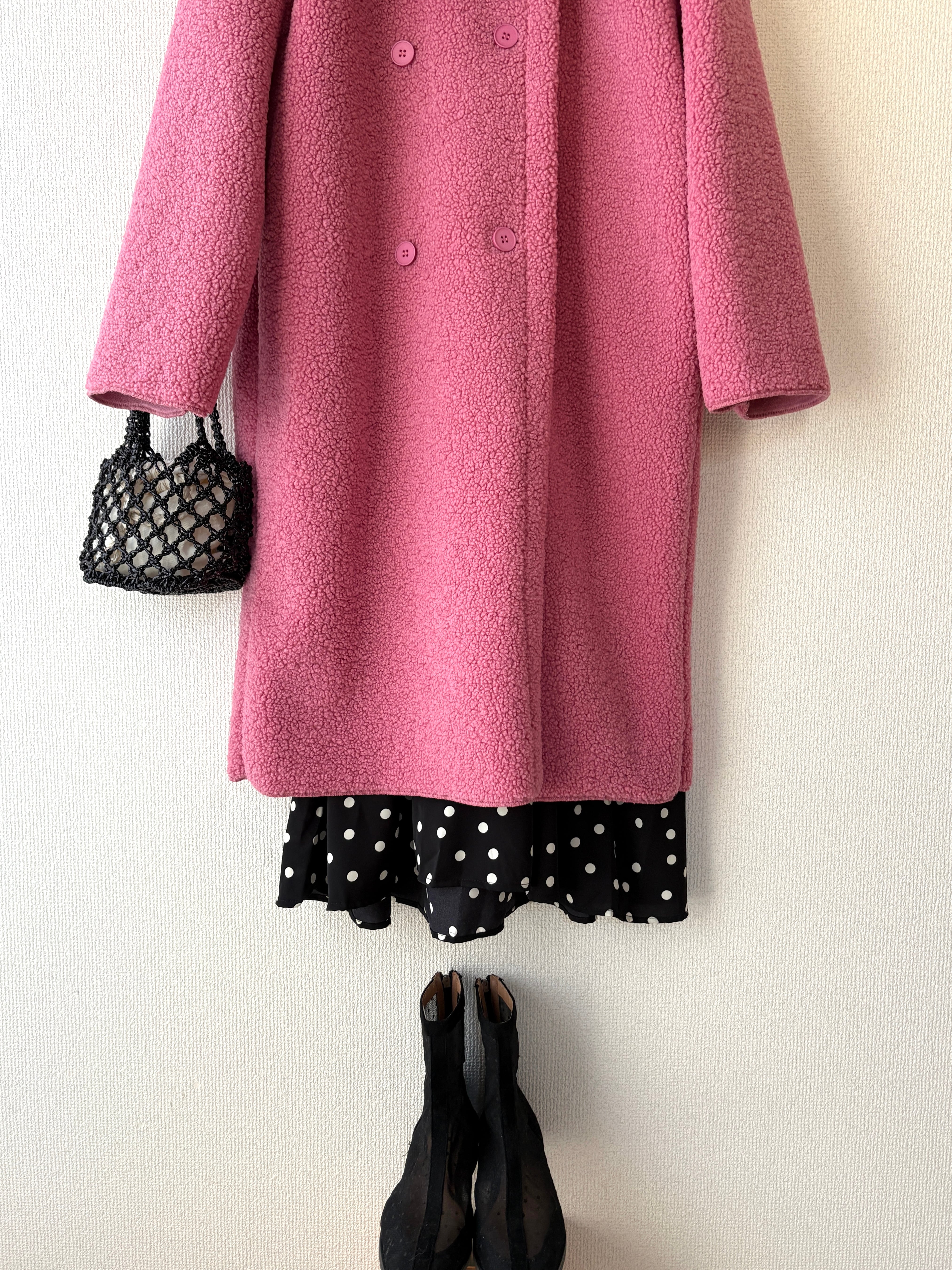 ふんわりボア素材で、見た目も着心地もあたたかいです。ノーカラーですっきり見え、羽織るだけで大人可愛い印象に。