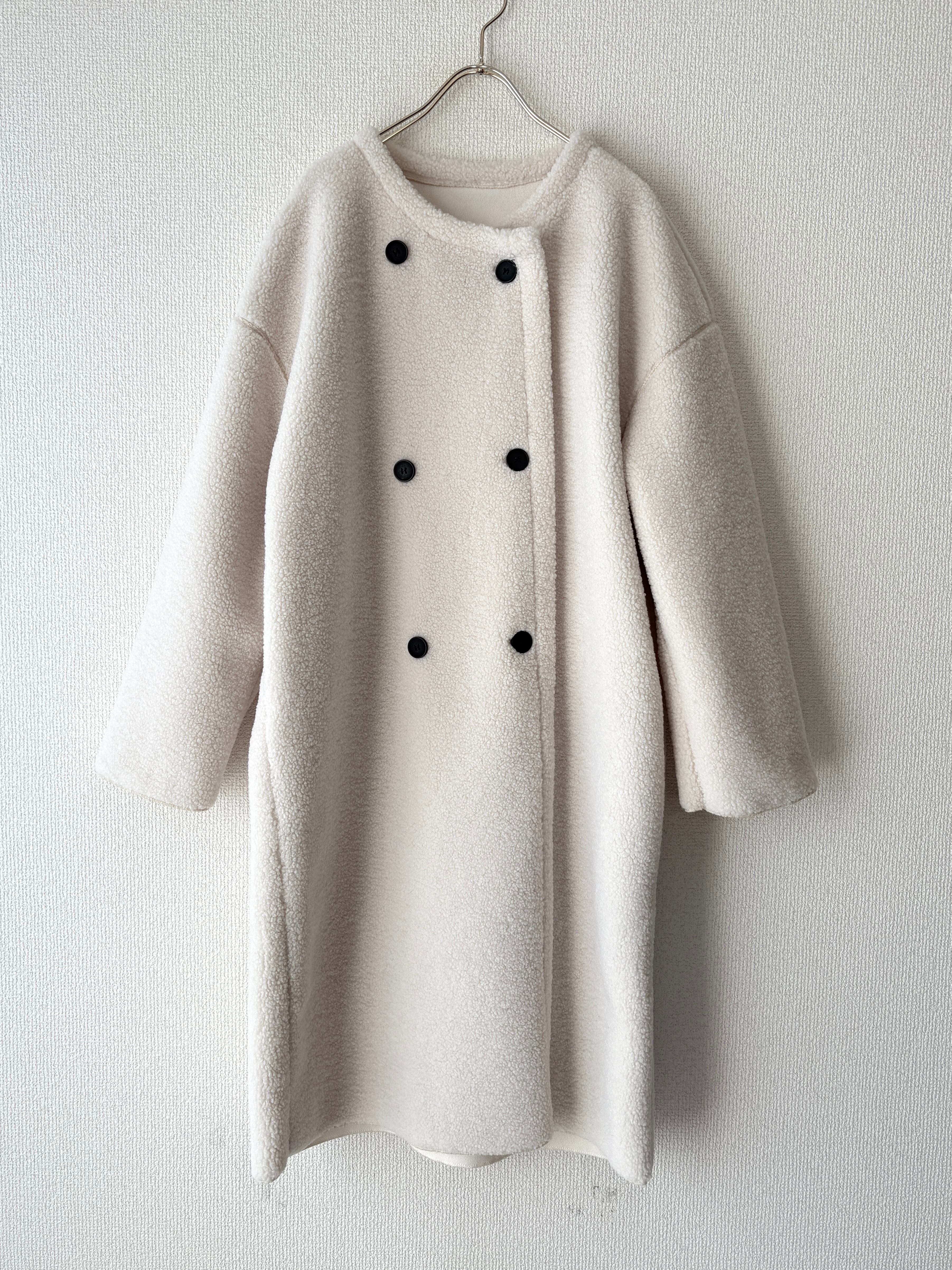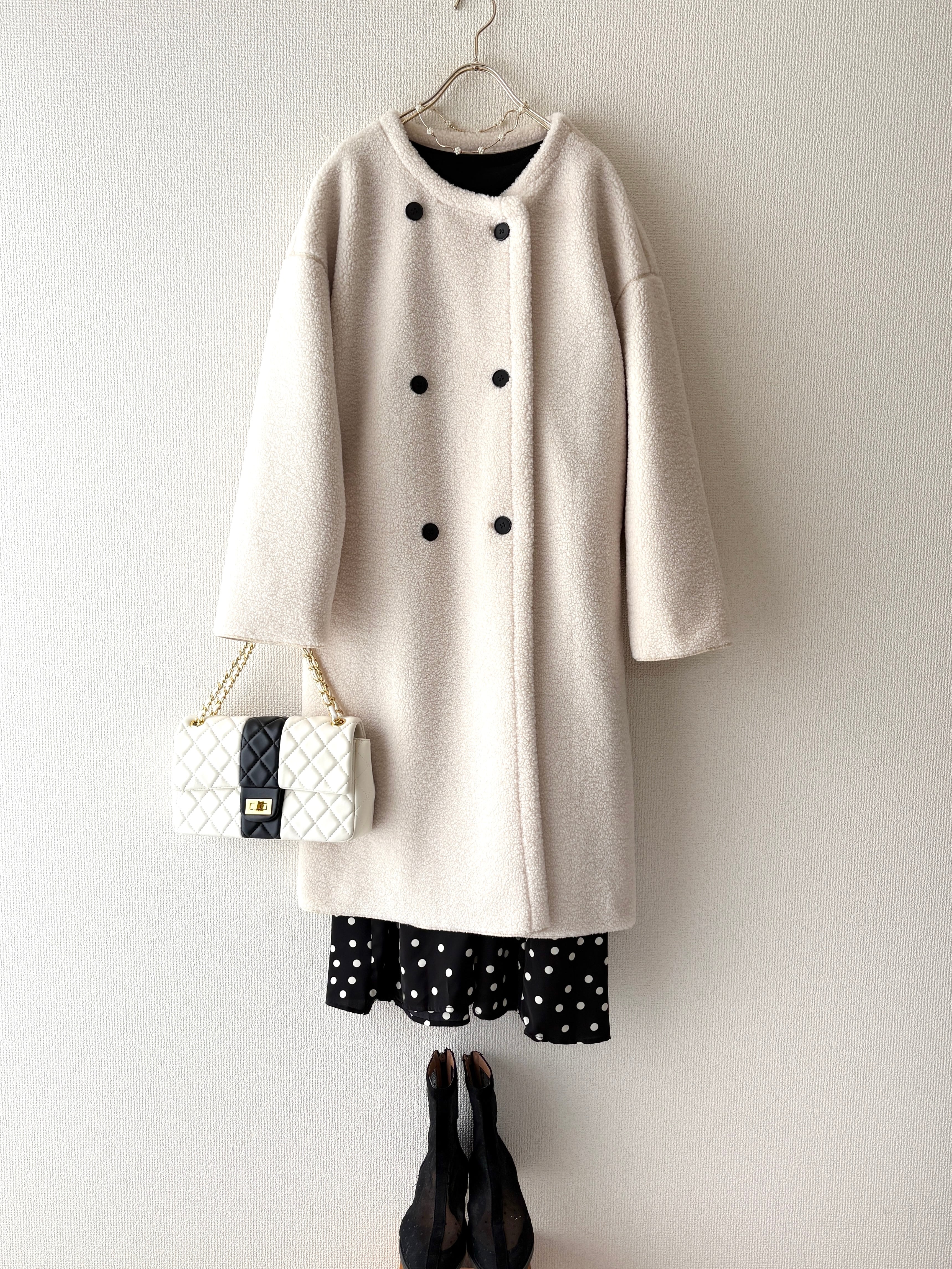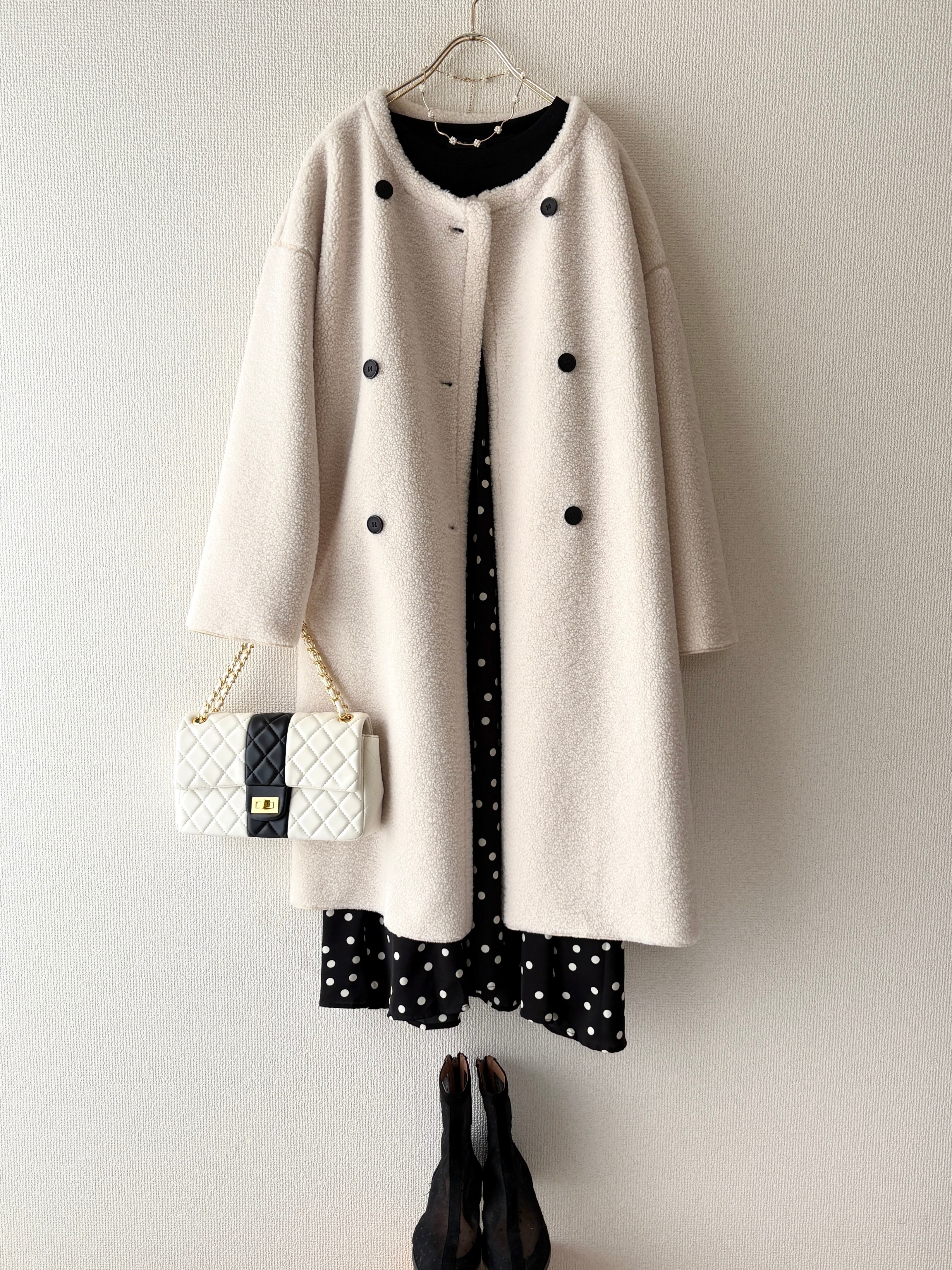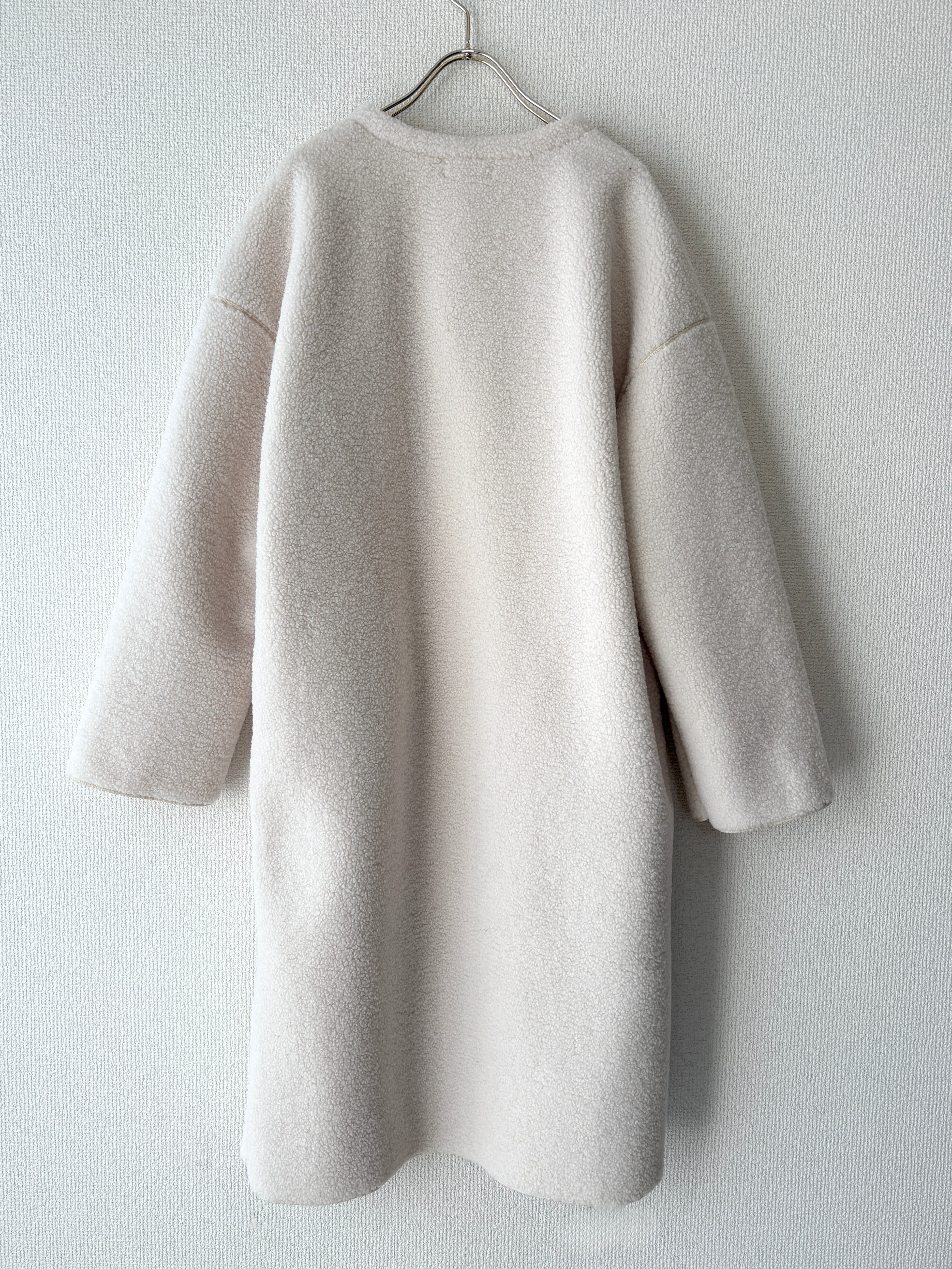 ふんわりボア素材で、見た目も着心地もあたたかいです。ノーカラーですっきり見え、羽織るだけで大人可愛い印象に。
