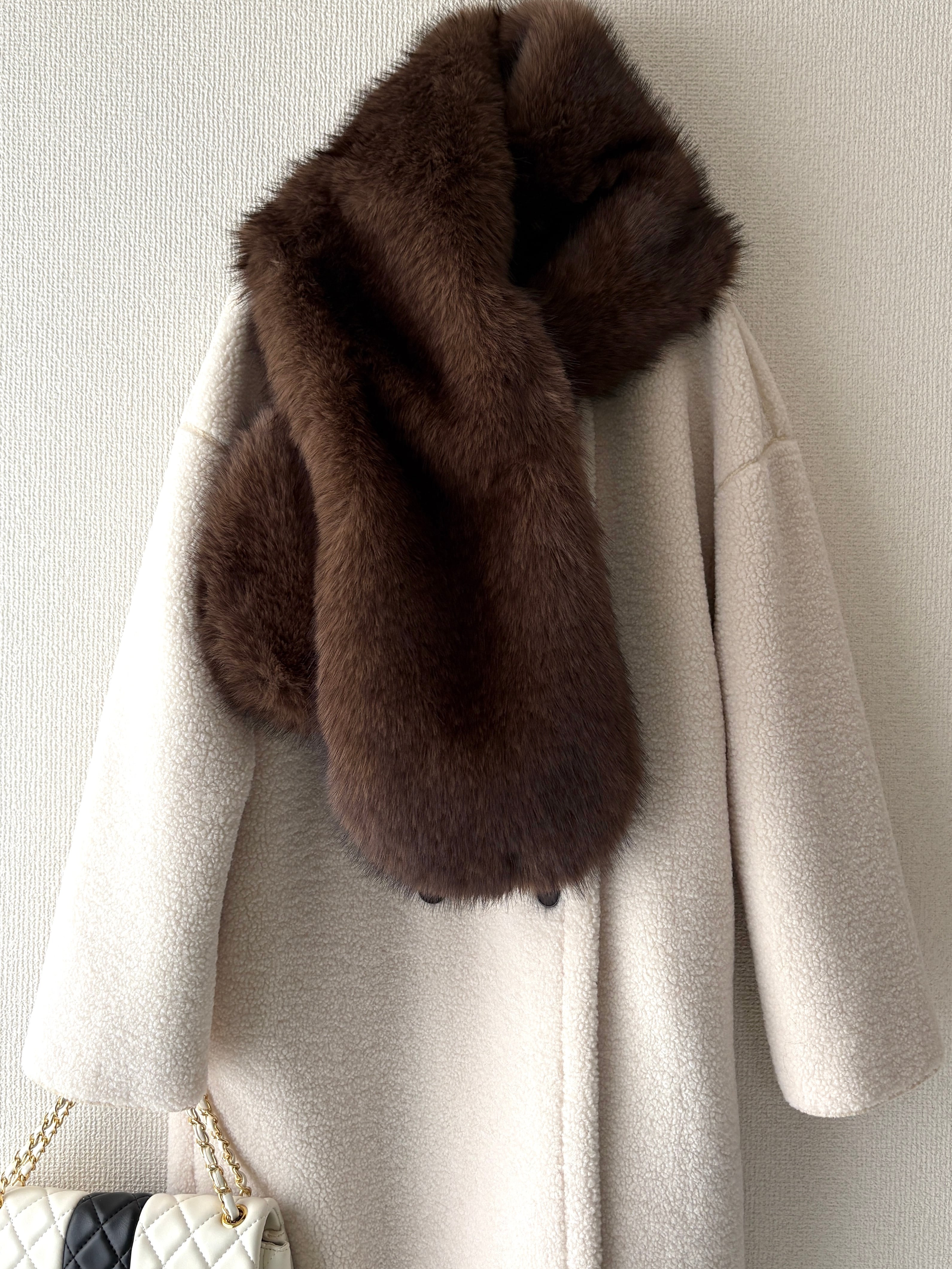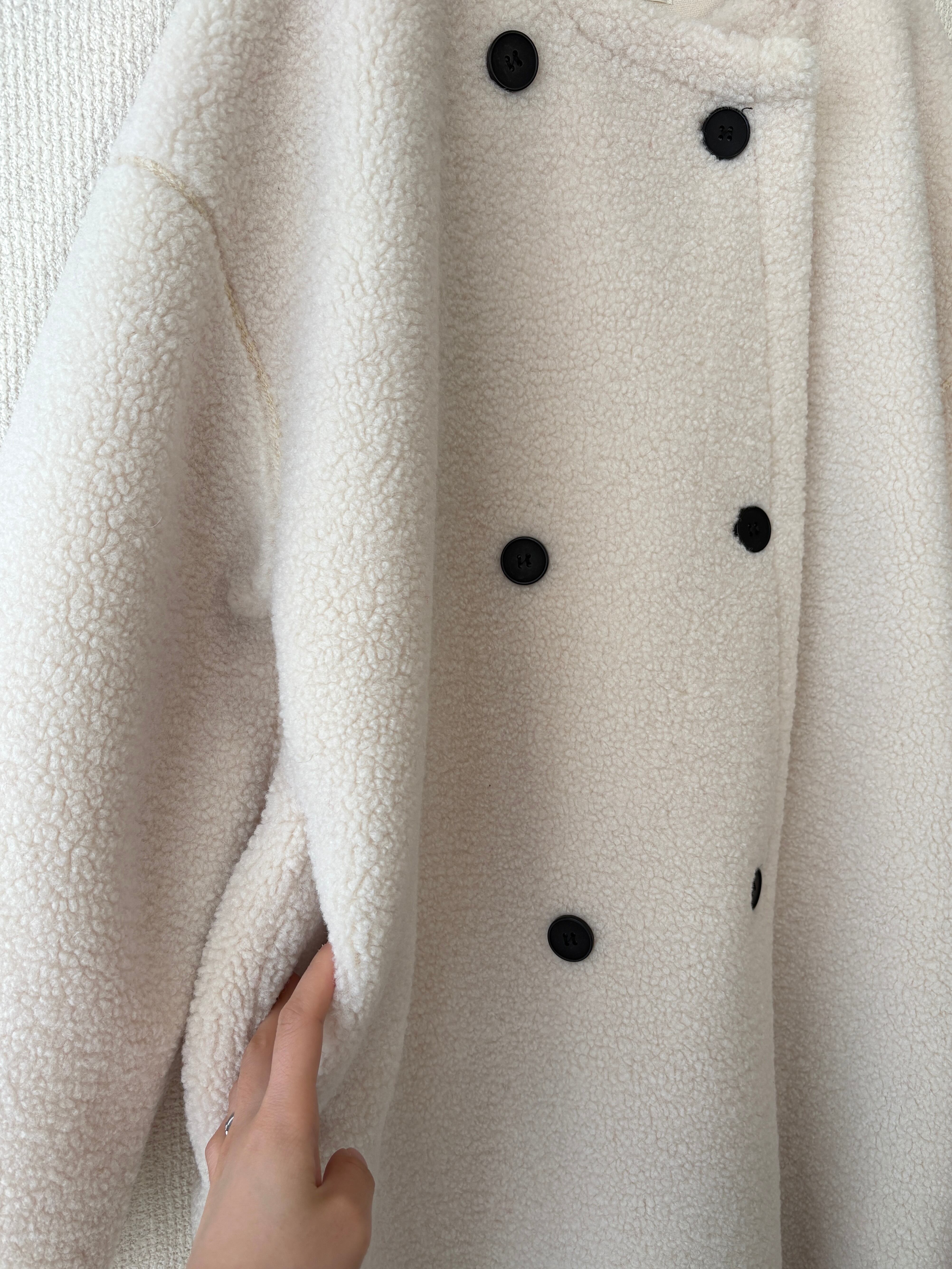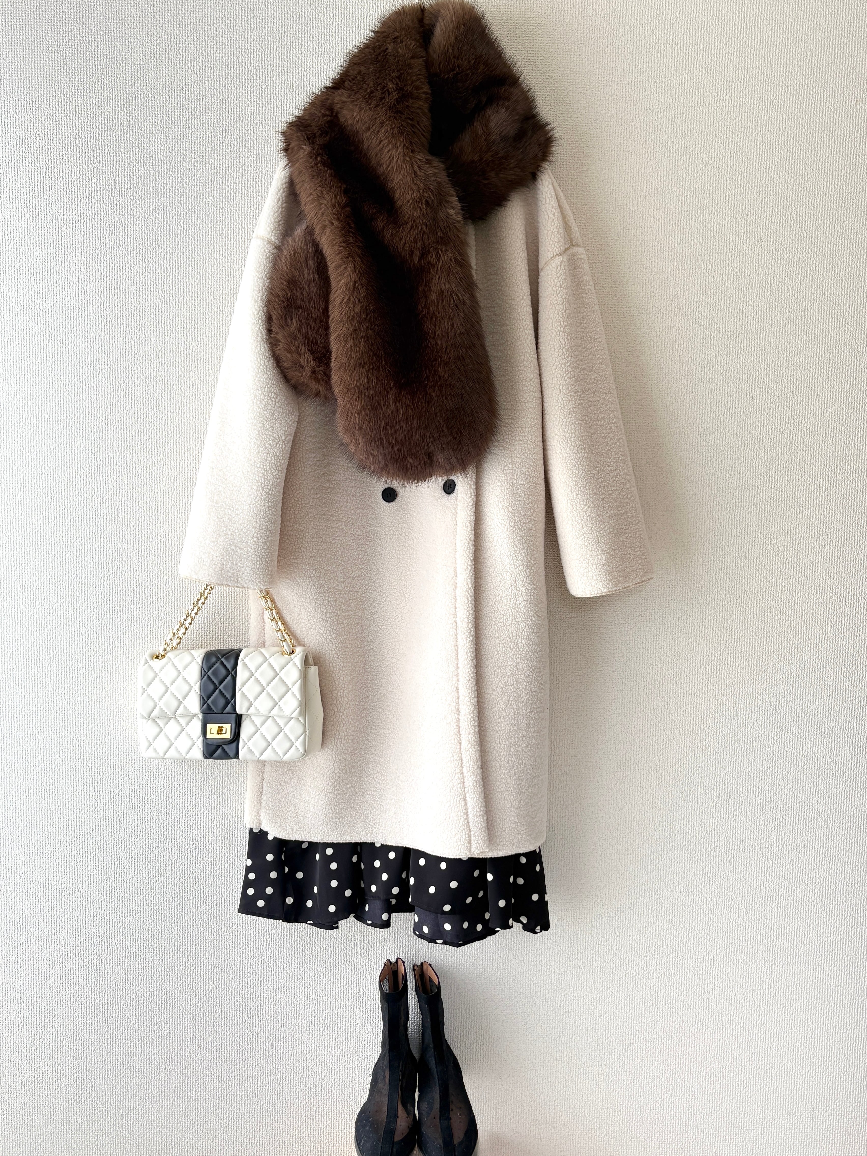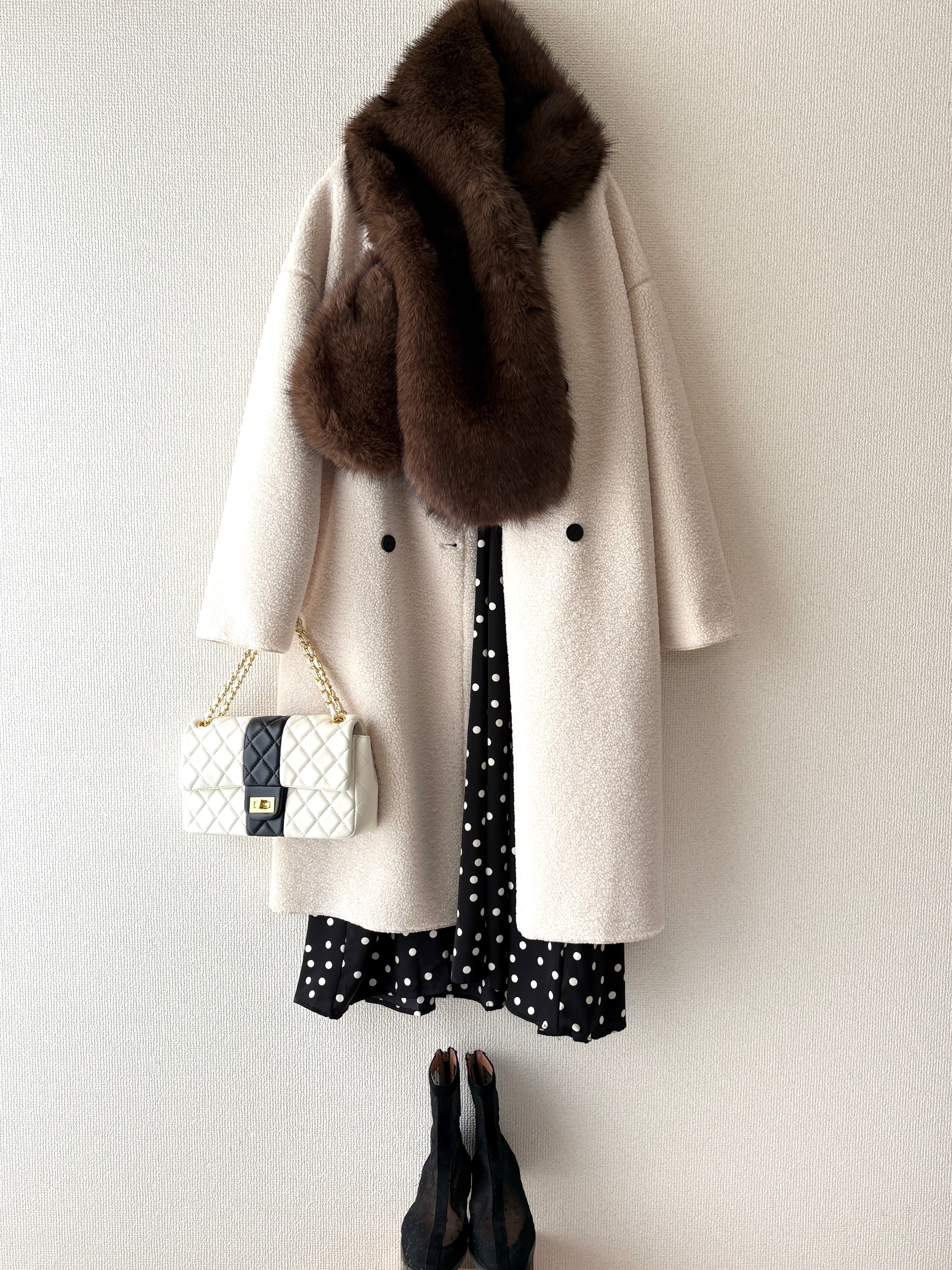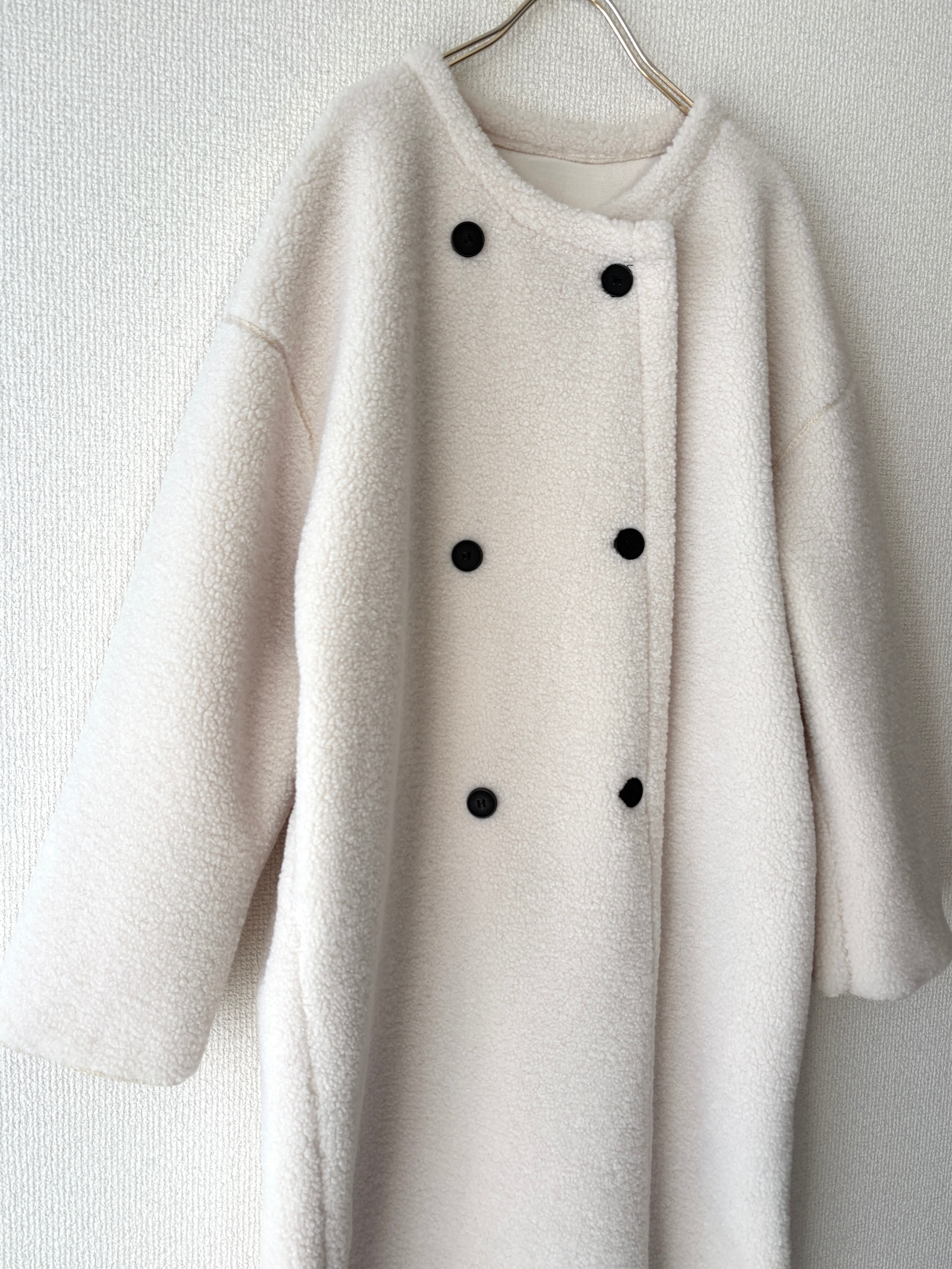 ふんわりボア素材で、見た目も着心地もあたたかいです。ノーカラーですっきり見え、羽織るだけで大人可愛い印象に。