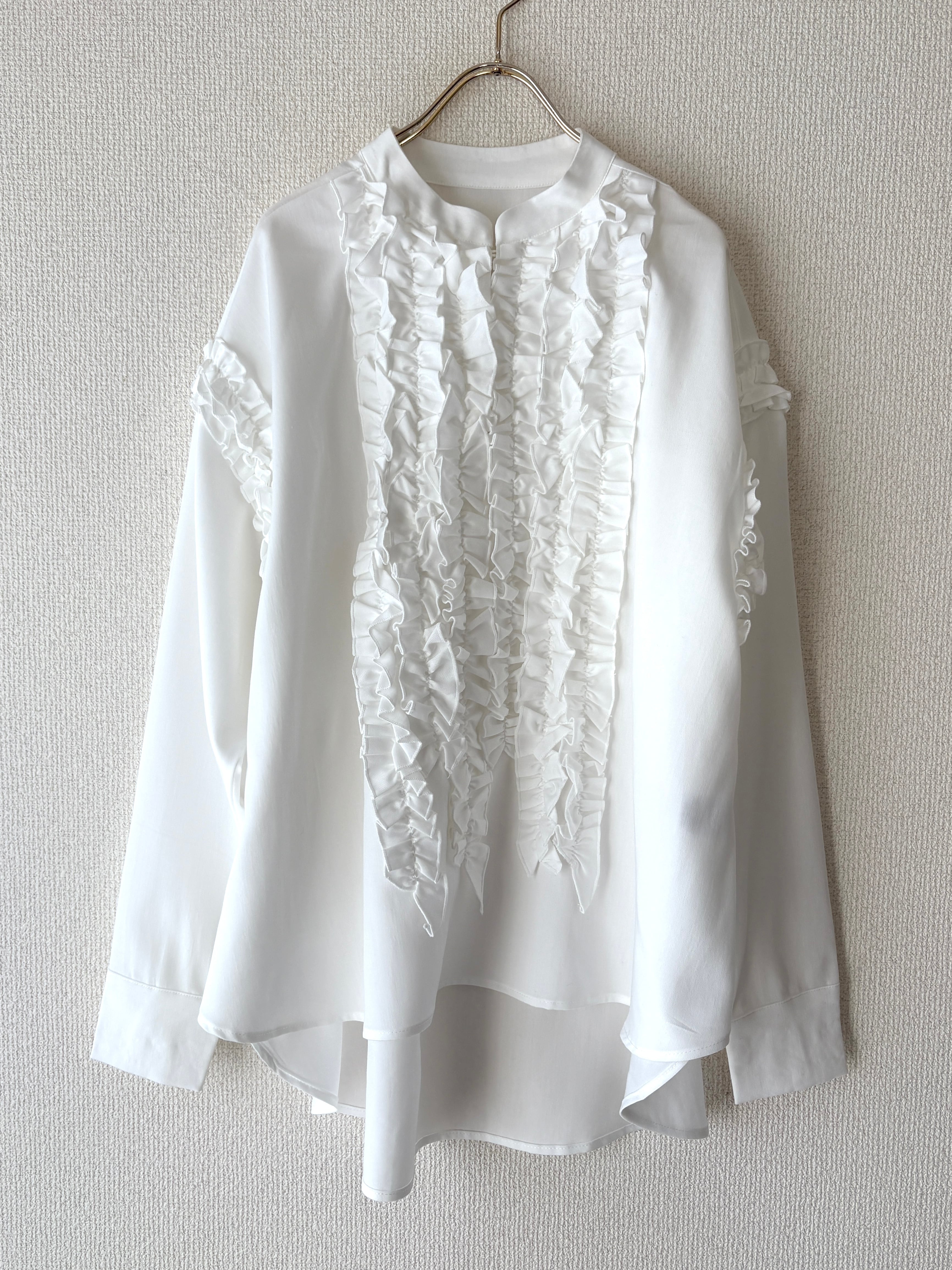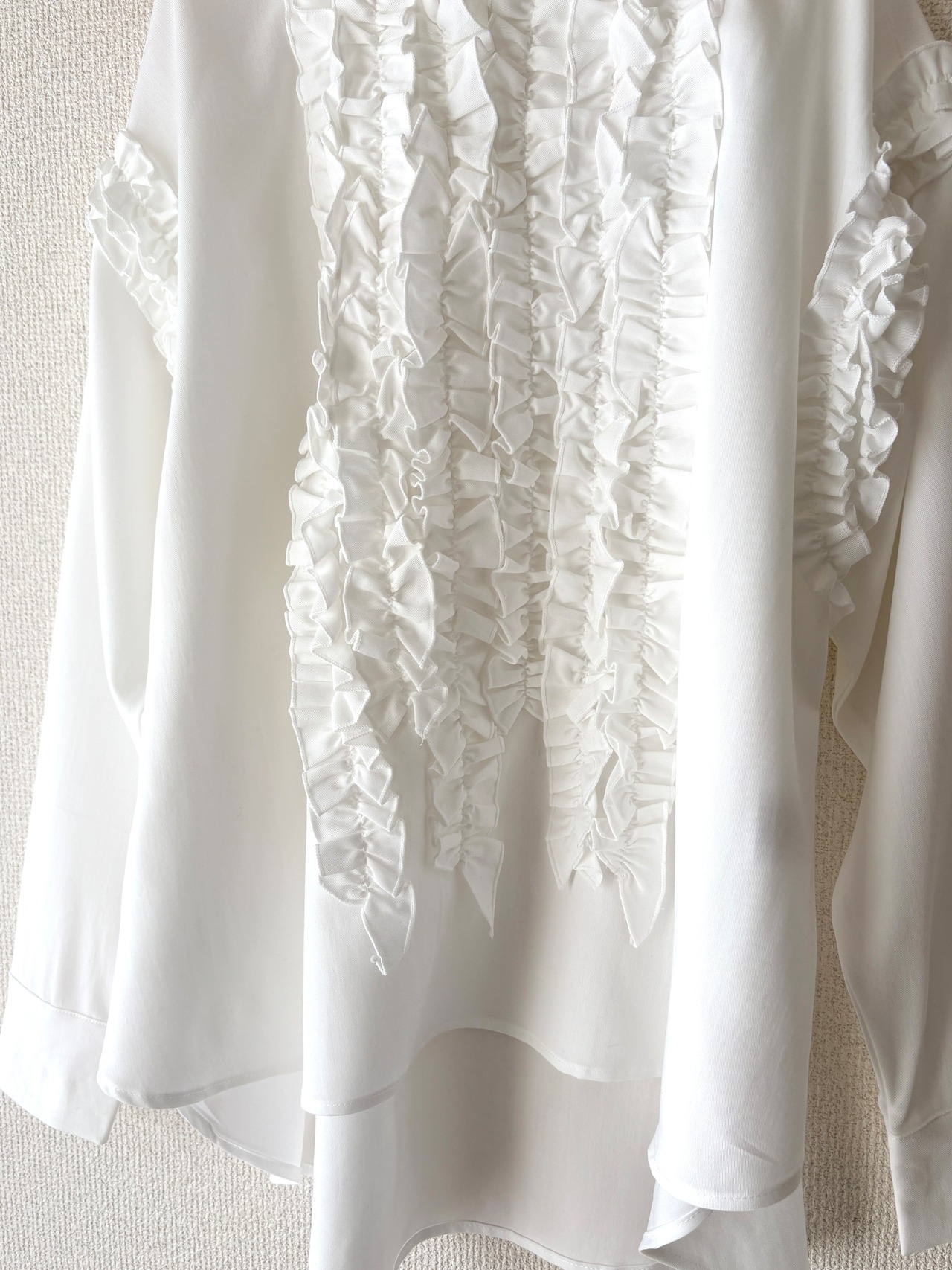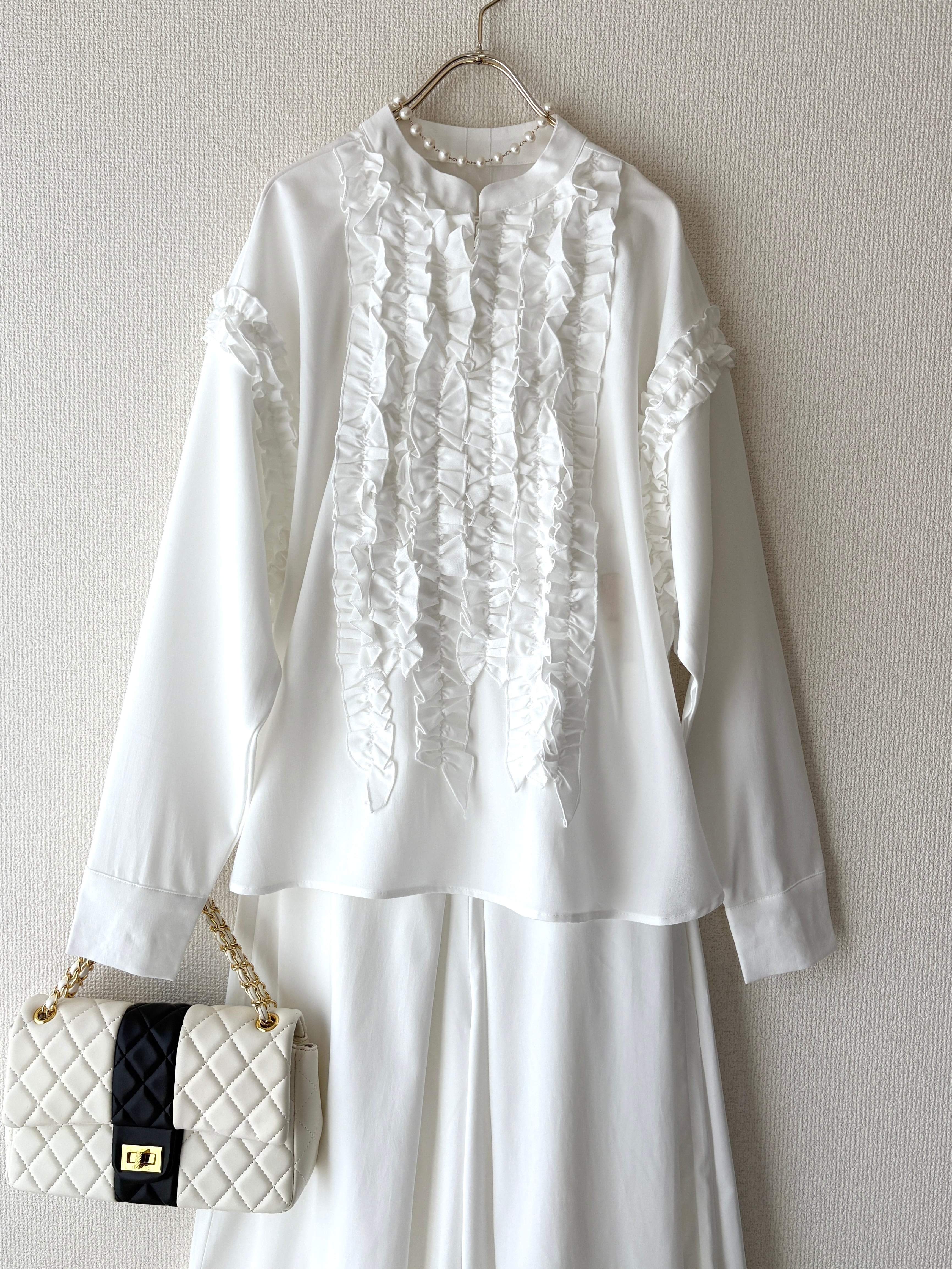胸元と袖周りのデザインが特徴の、フリルブラウスです。
