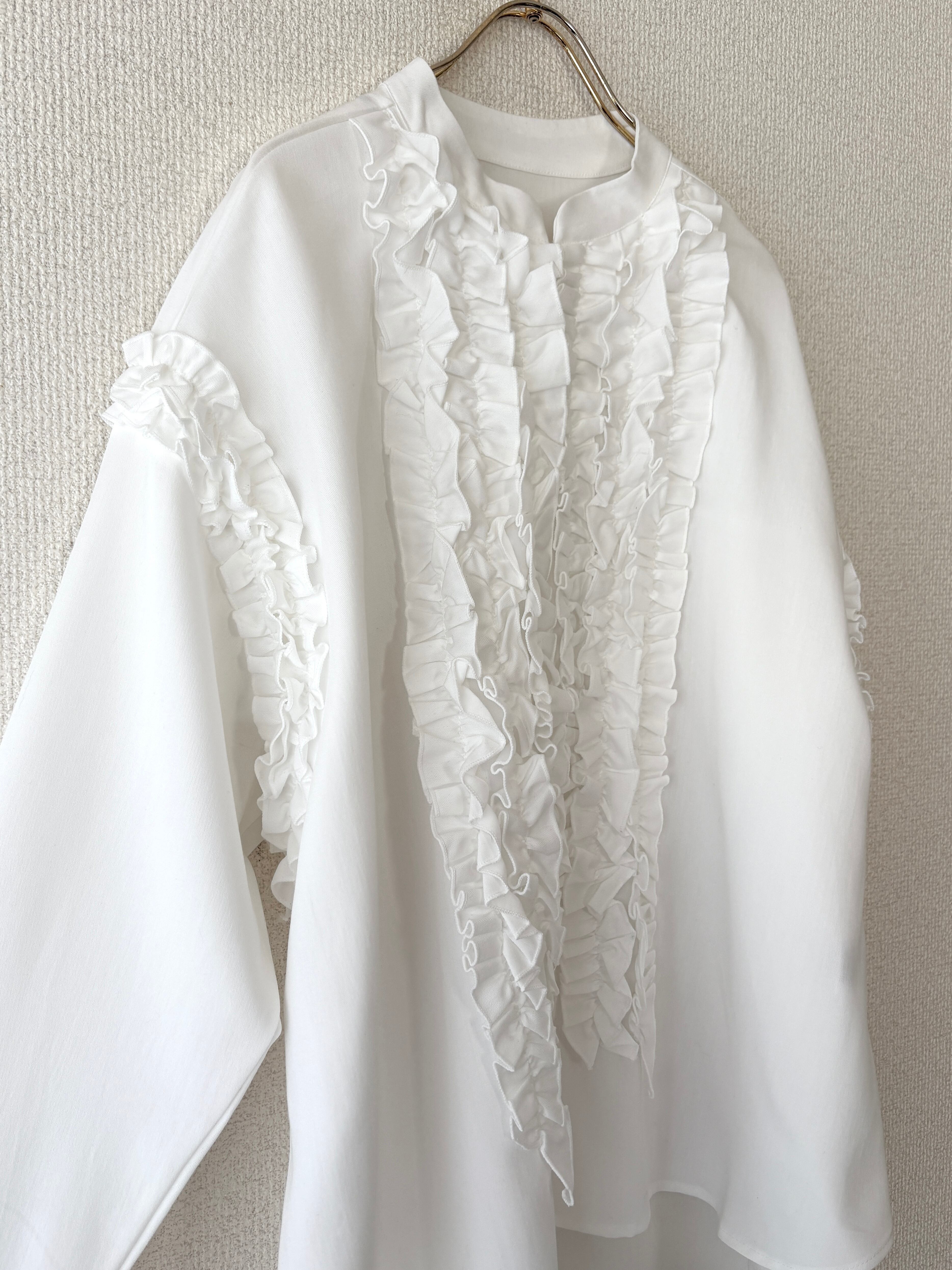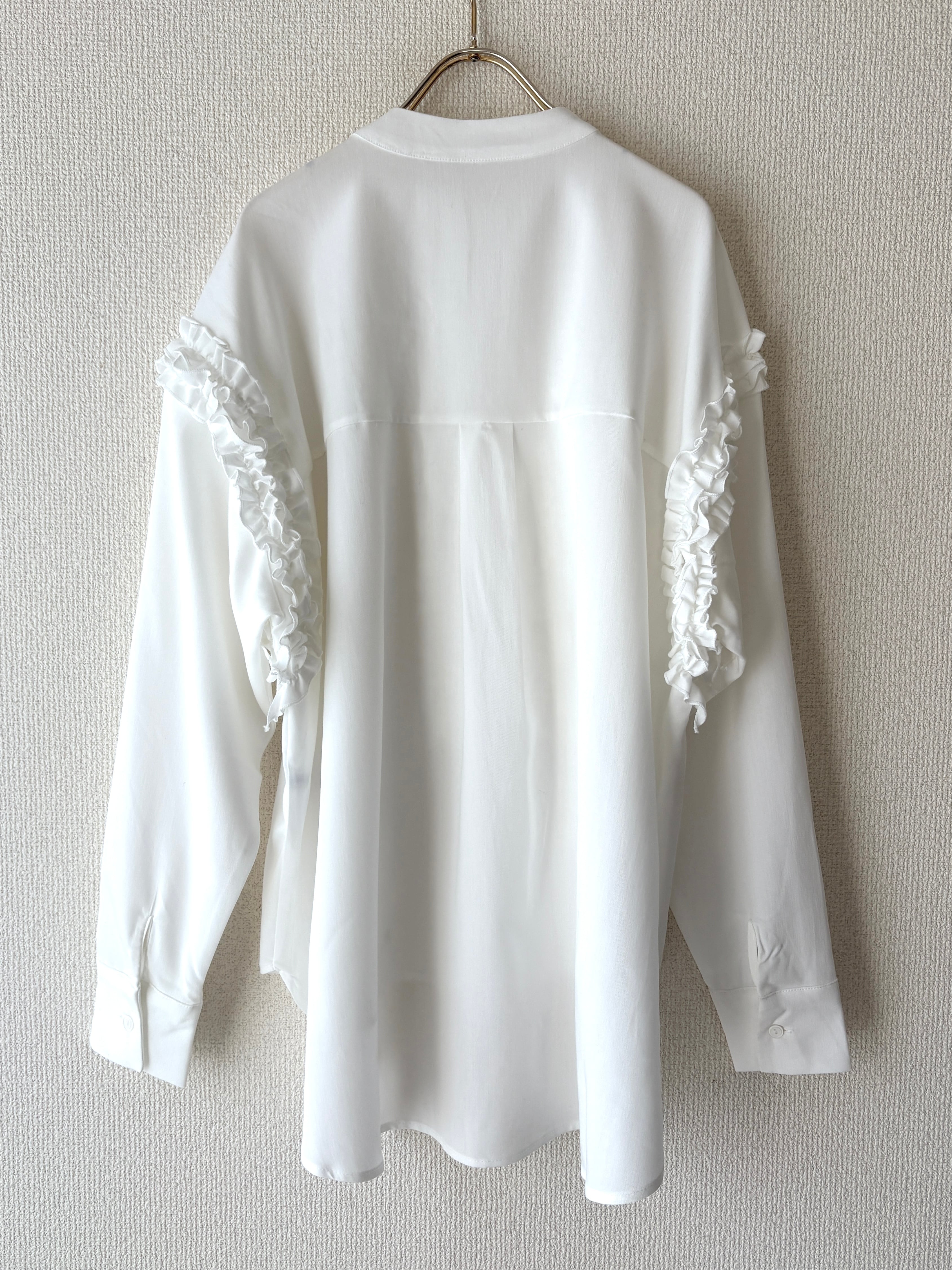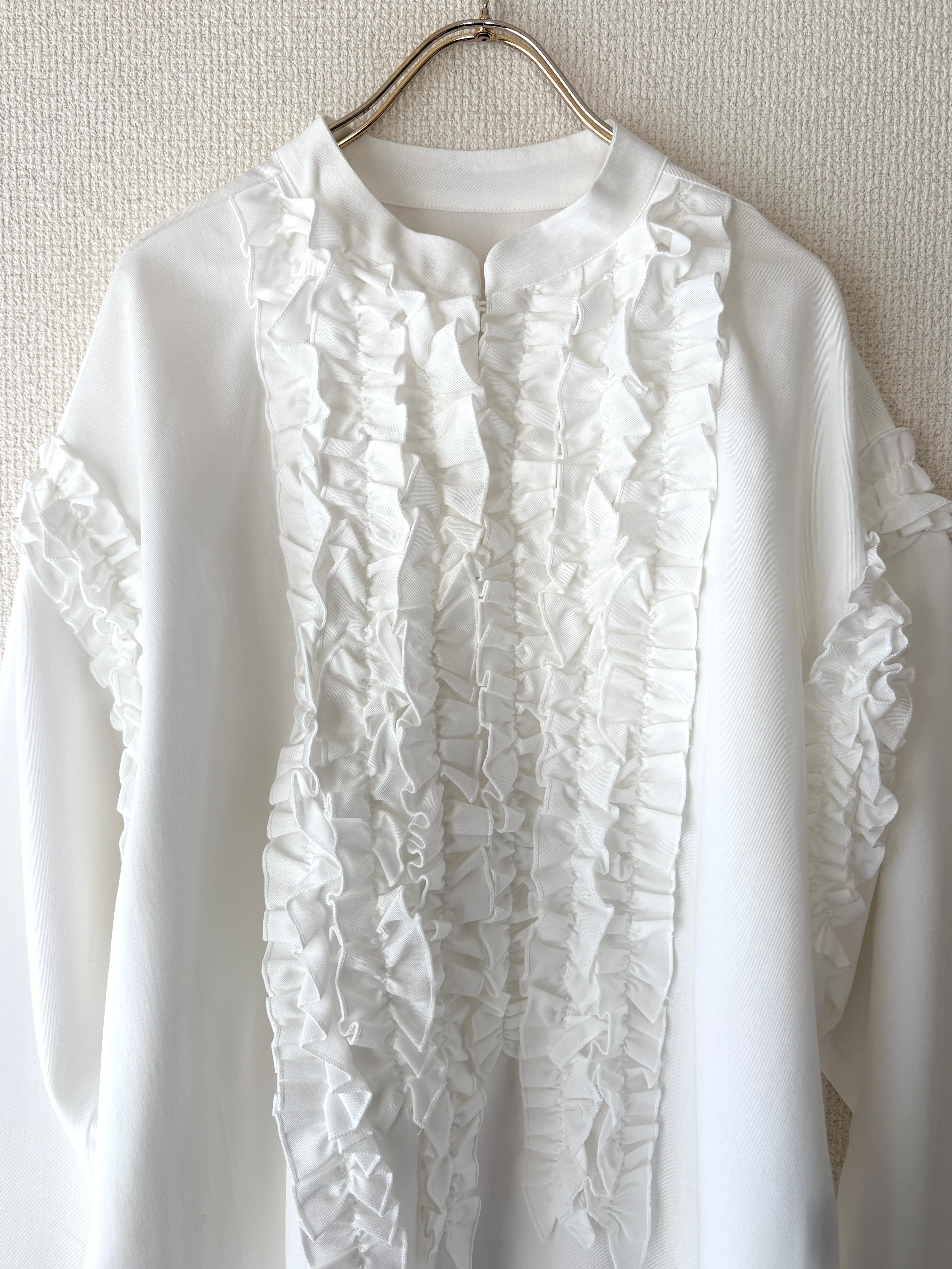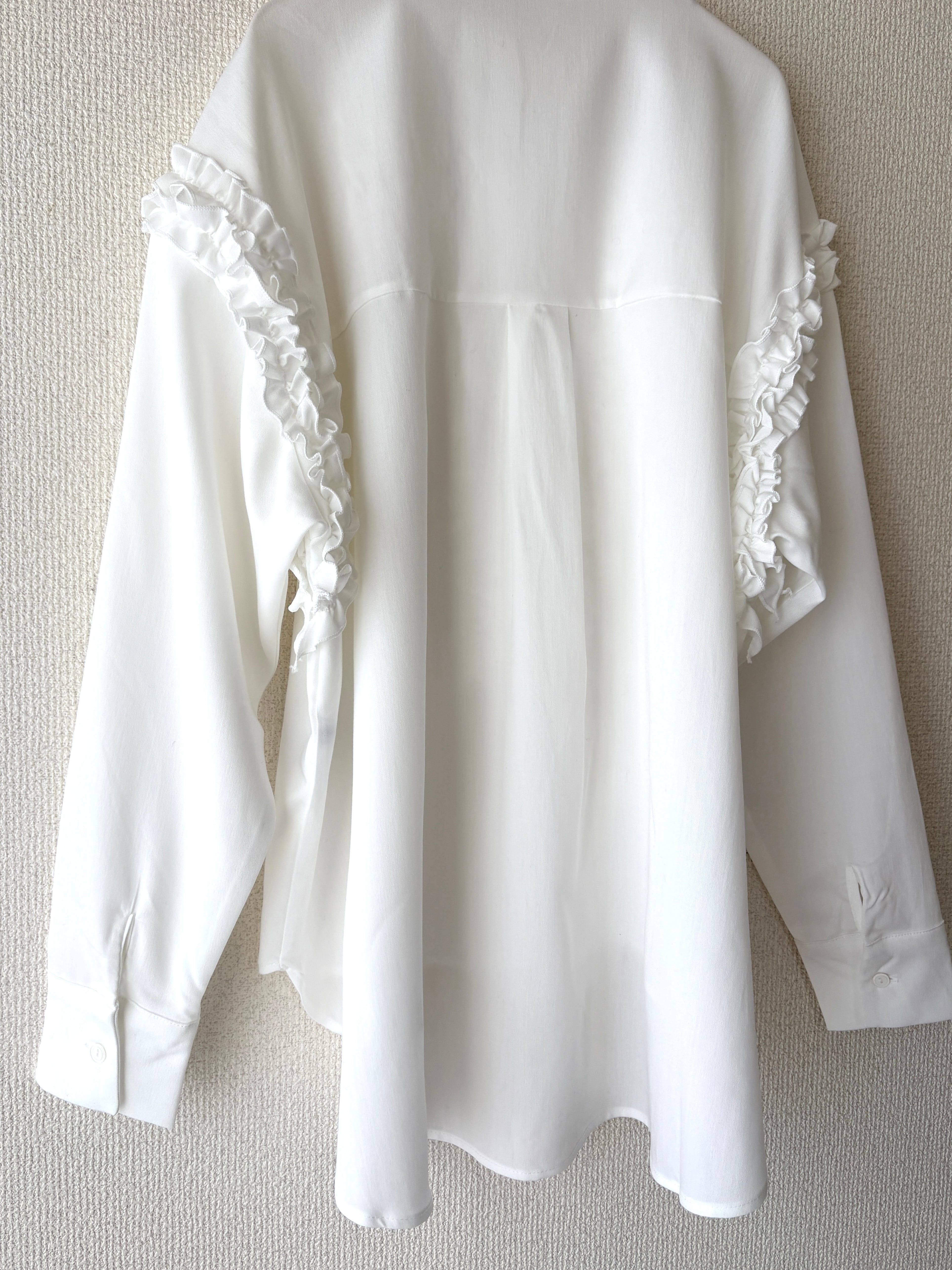 胸元と袖周りのデザインが特徴の、フリルブラウスです。