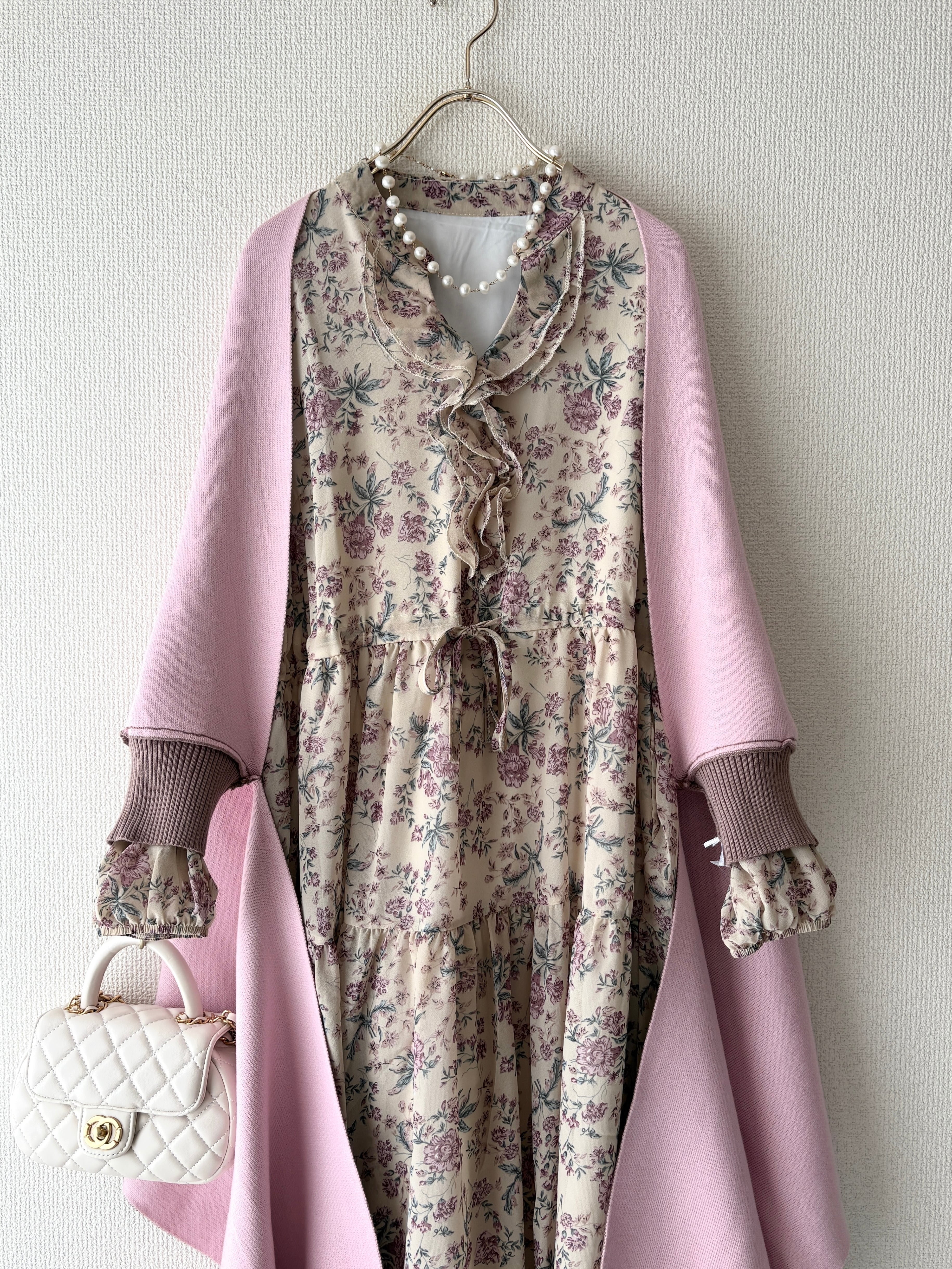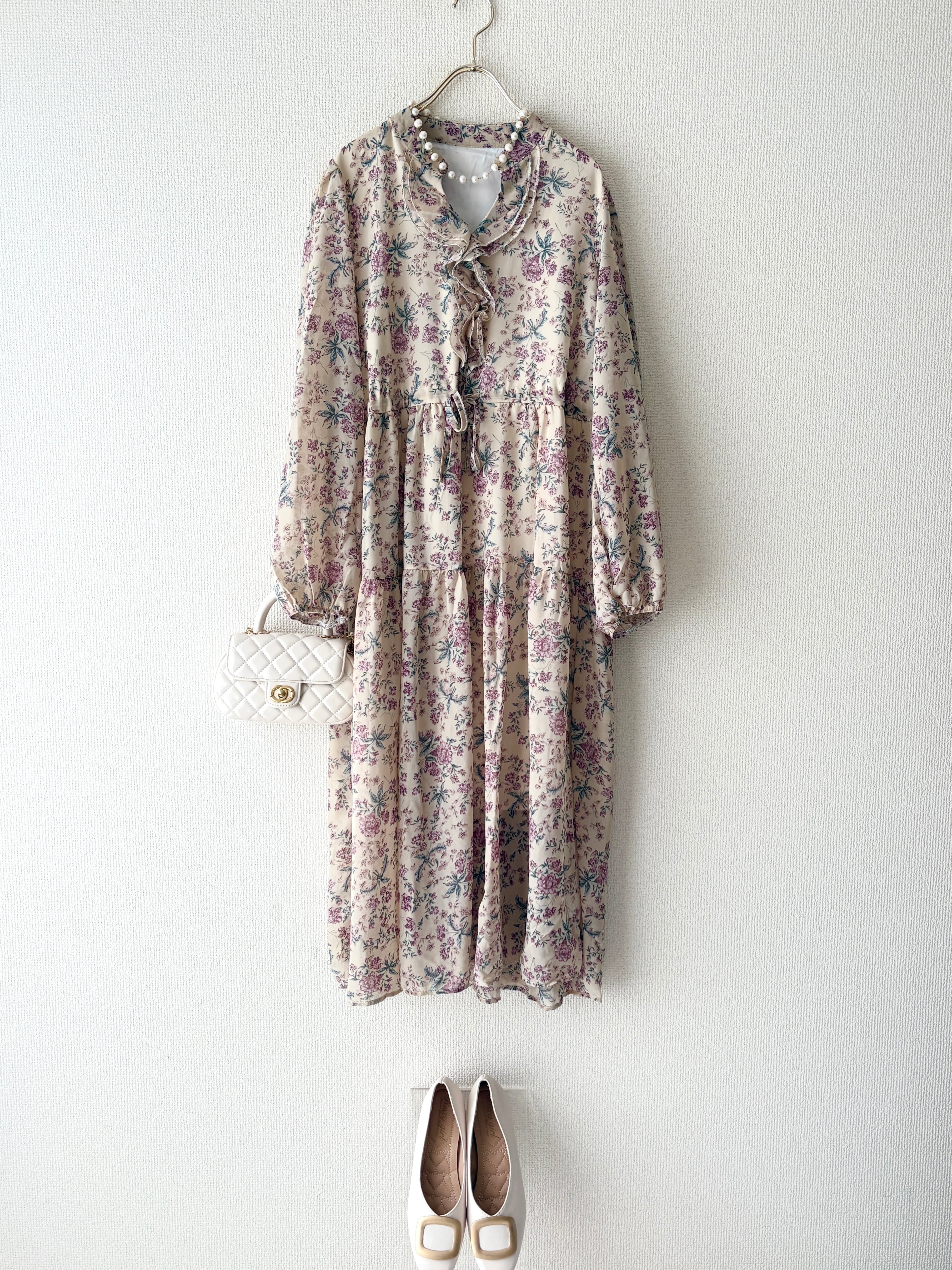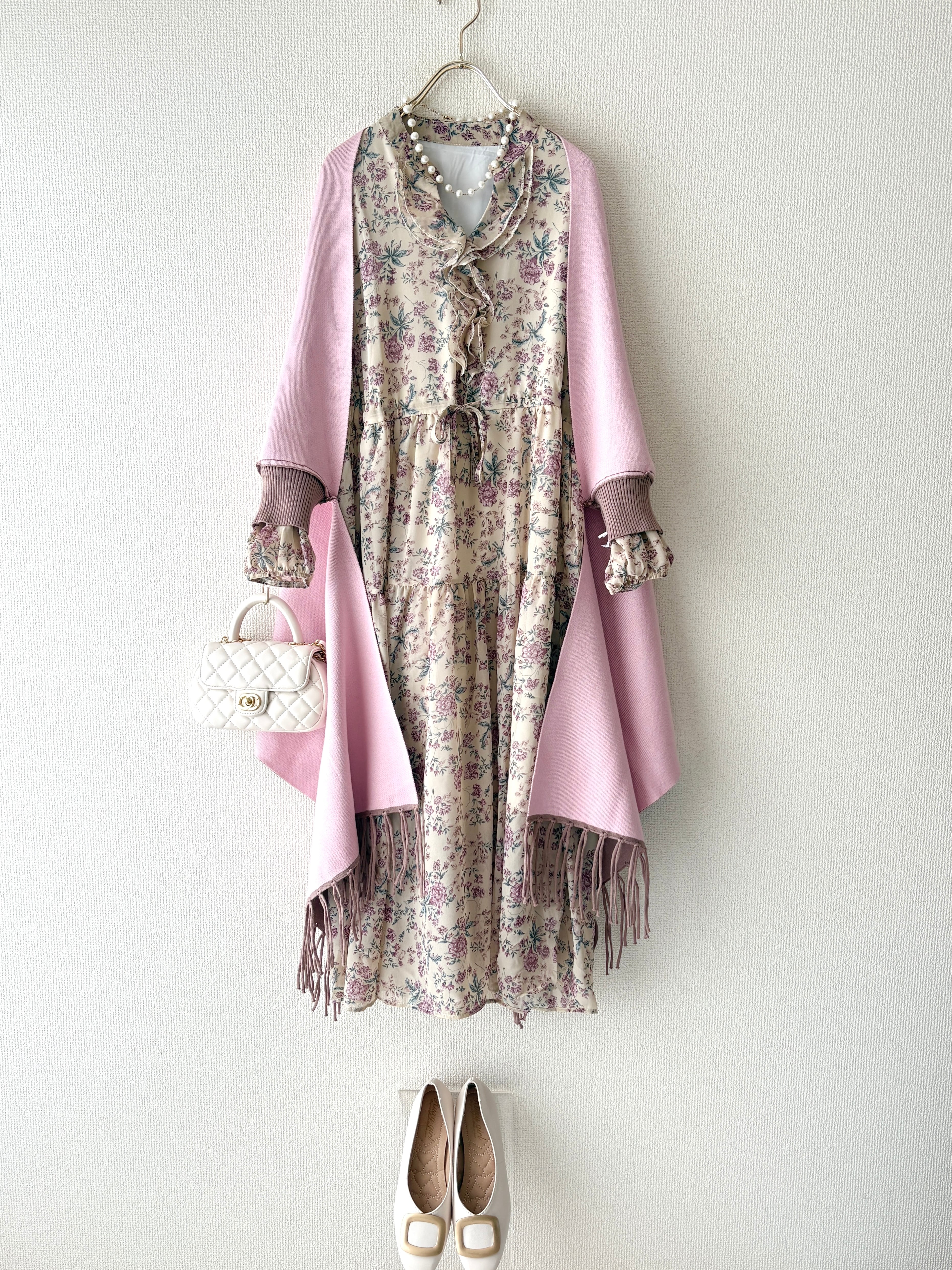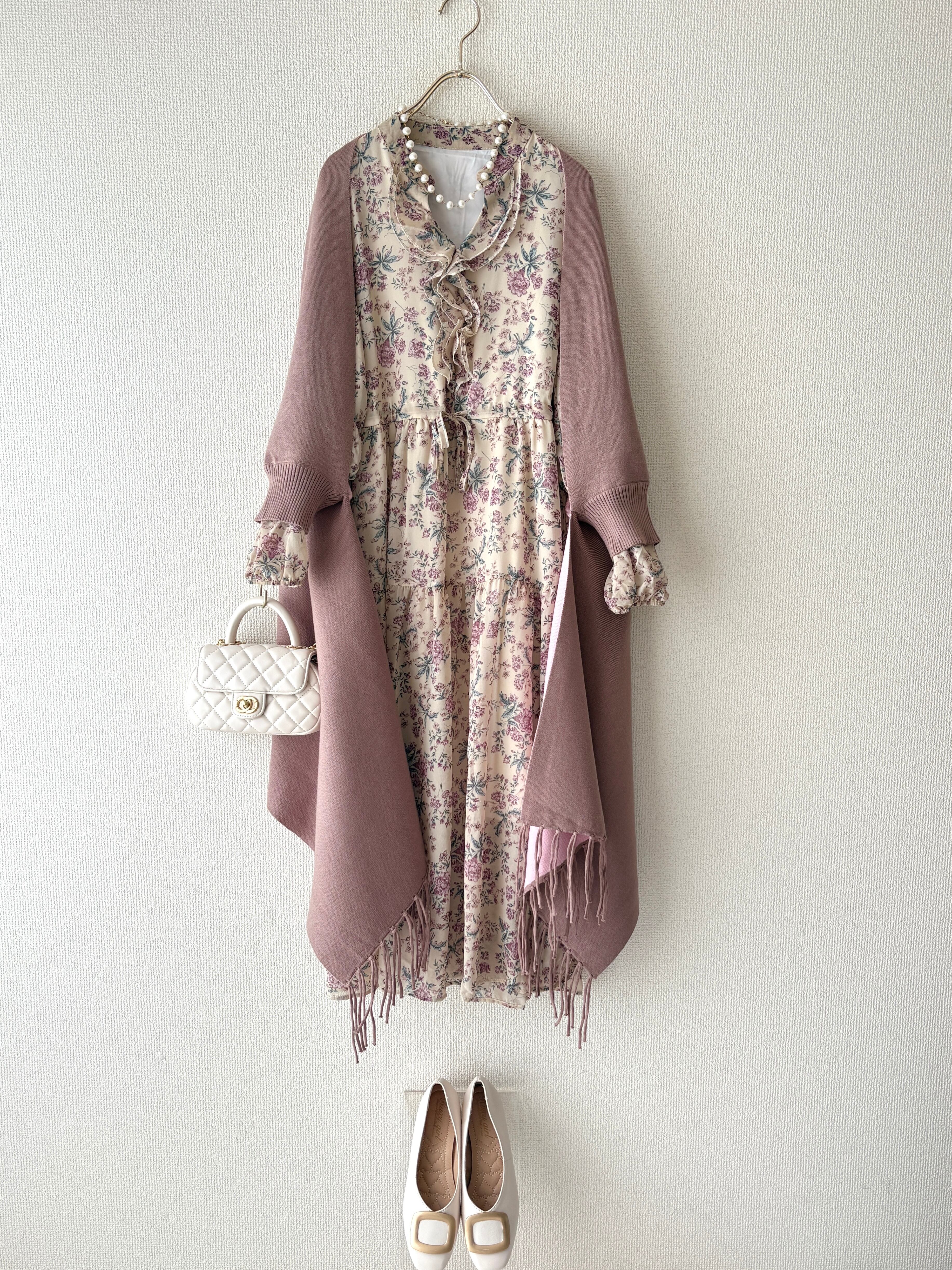 ピンクカラーの小花柄を散りばめた大人のためのフェミニンワンピースです。