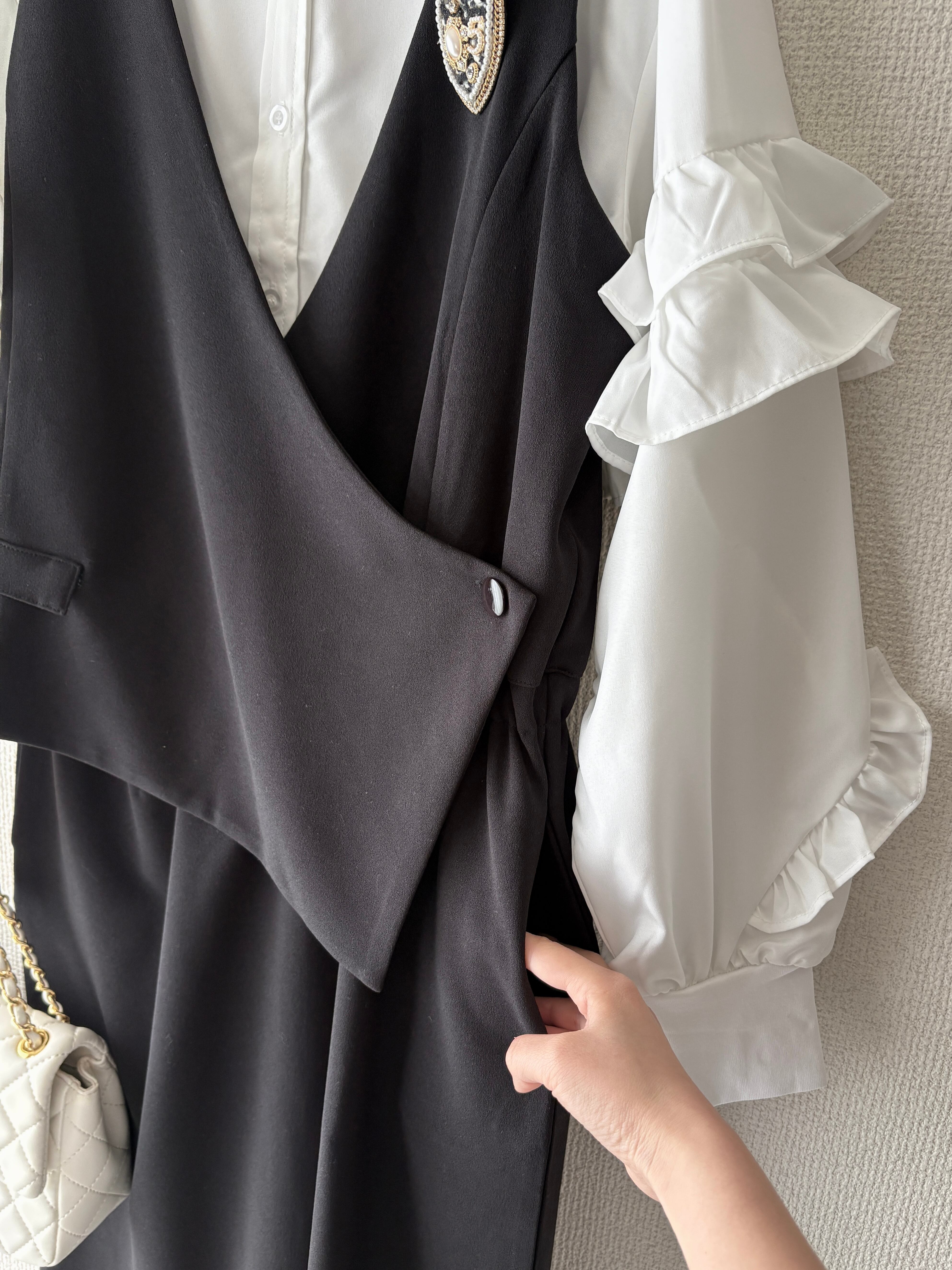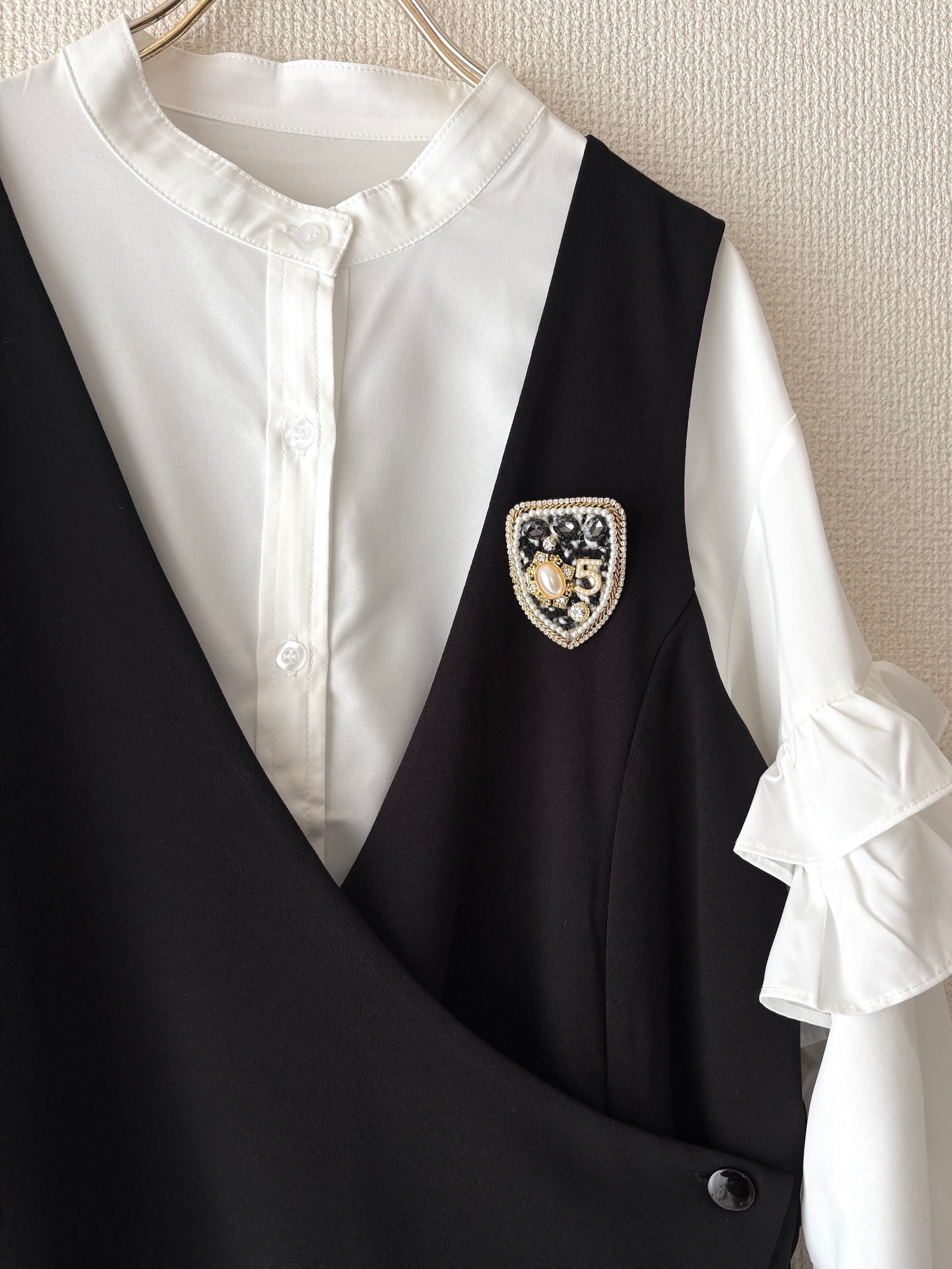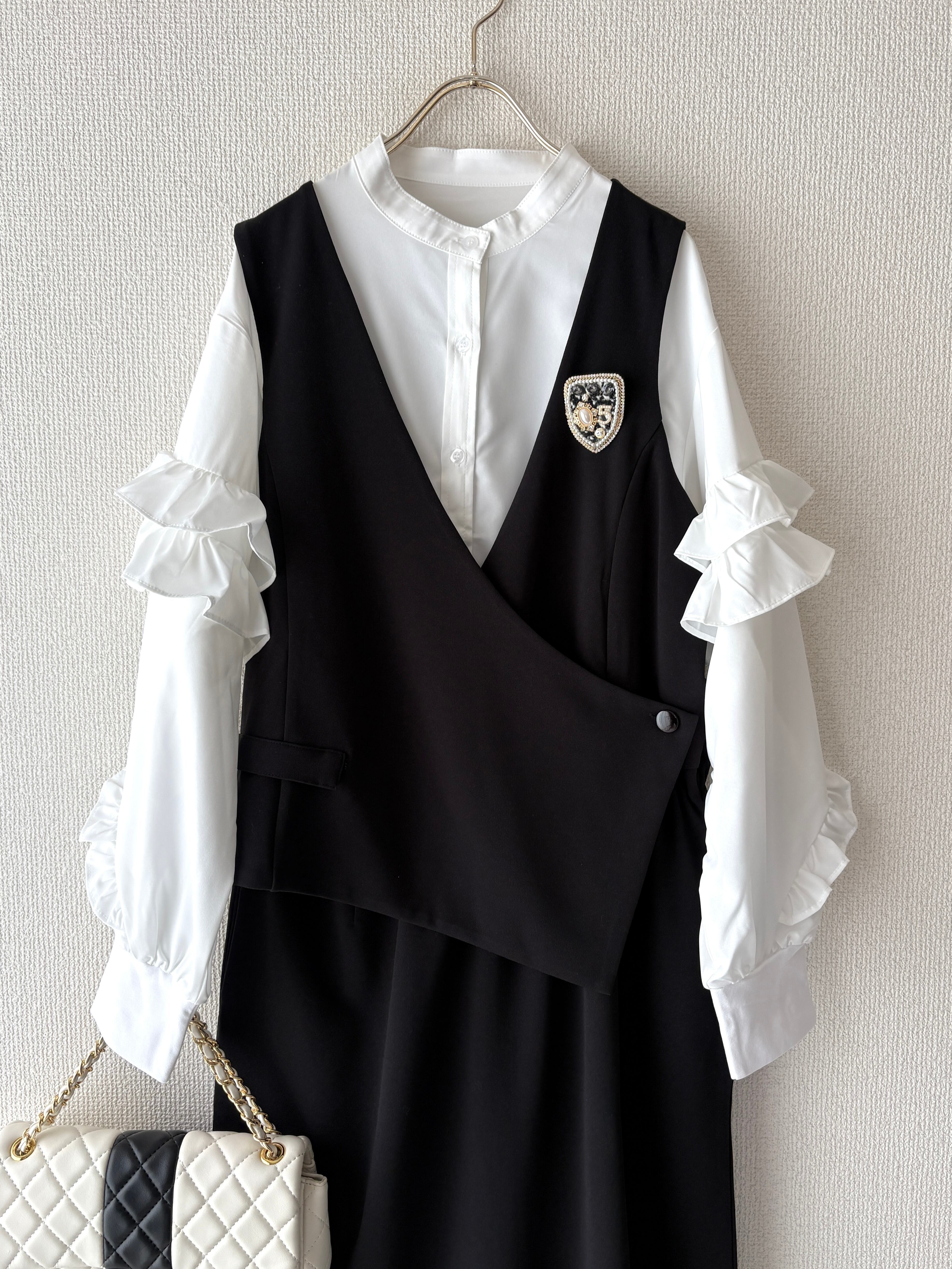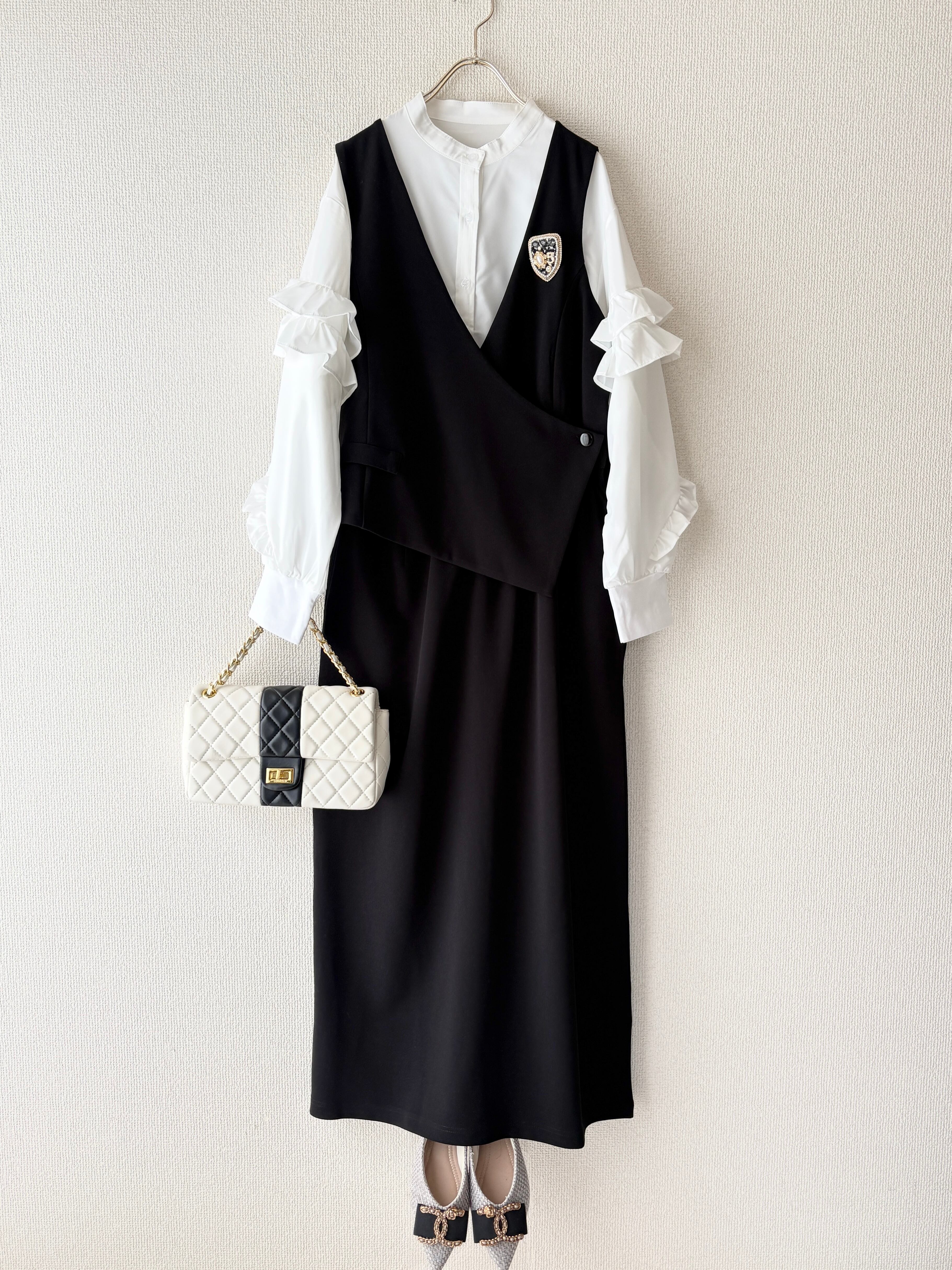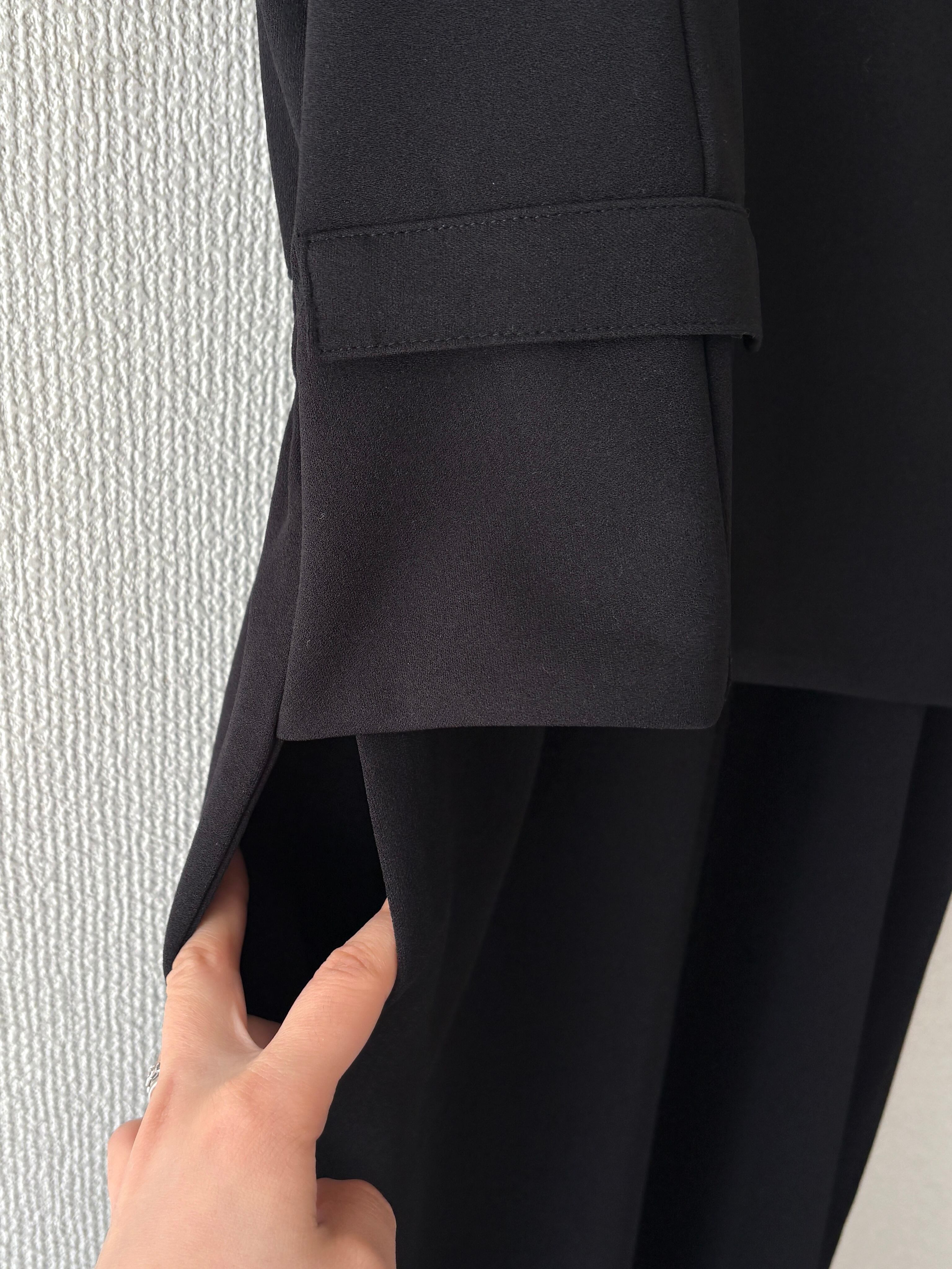 すっきりとした襟なしデザインで甘さを抑えつつ、
