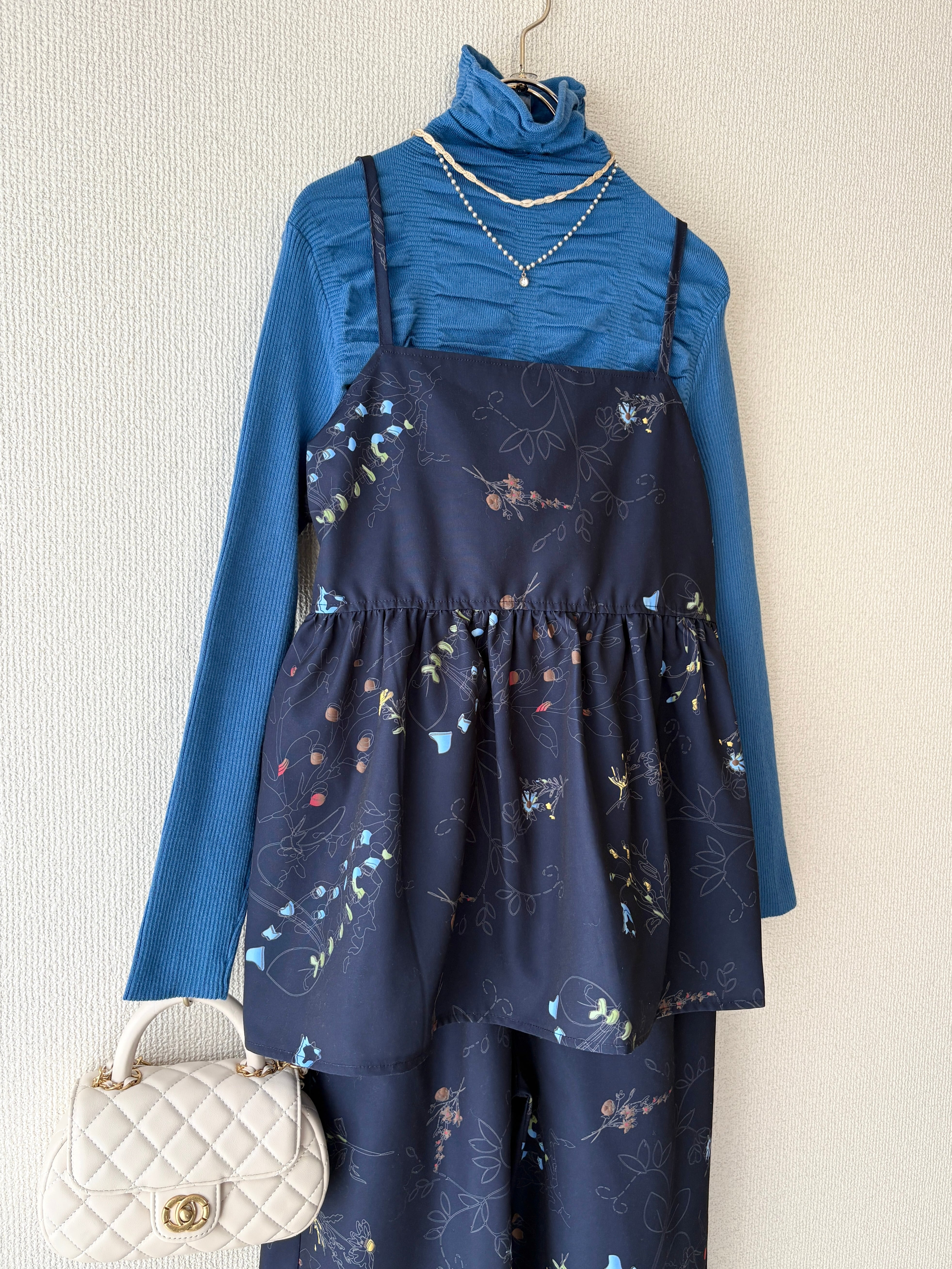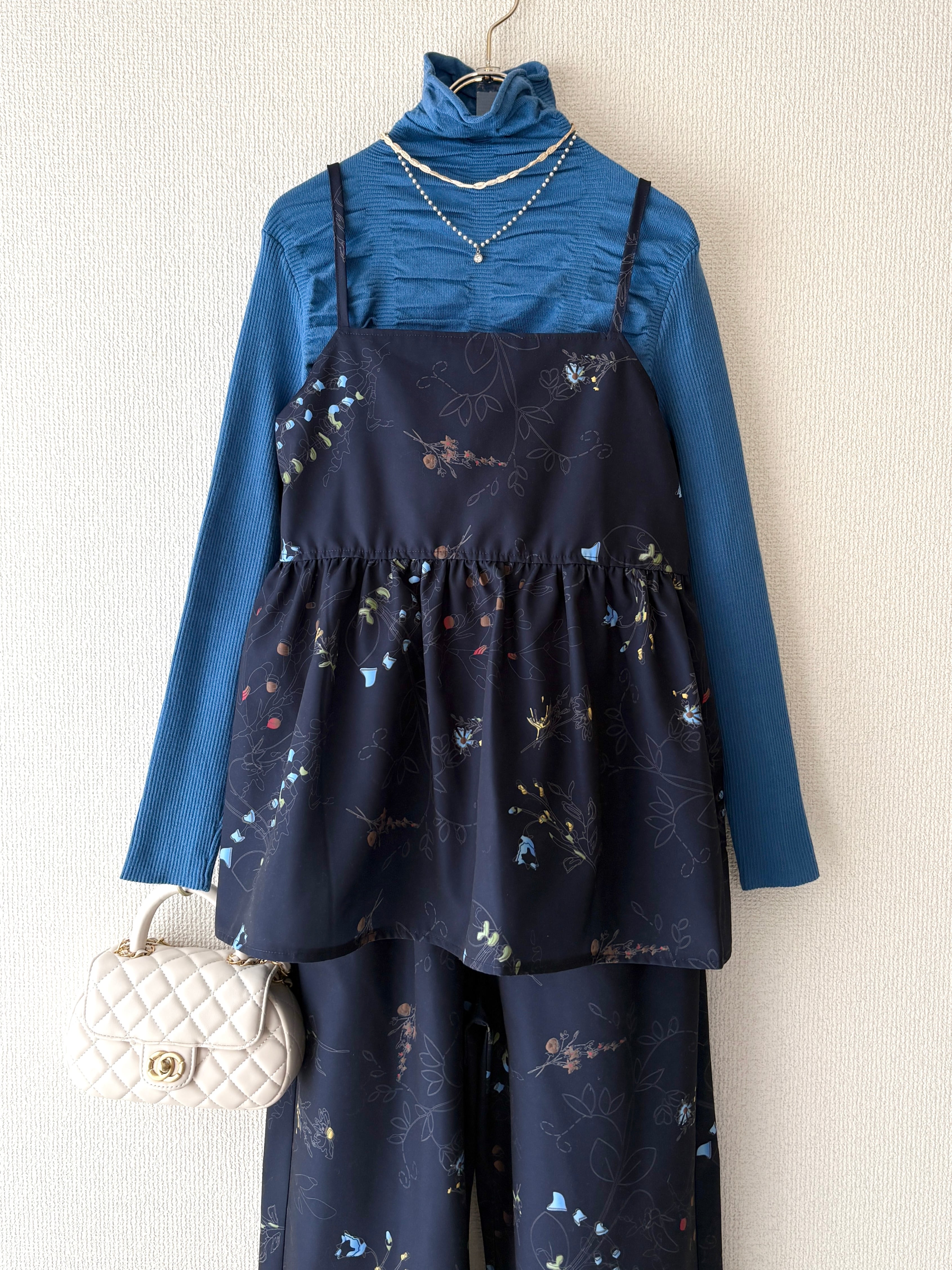 落ち着いたネイビーカラーをベースにしているので、甘くなりすぎず大人っぽく着こなせます。