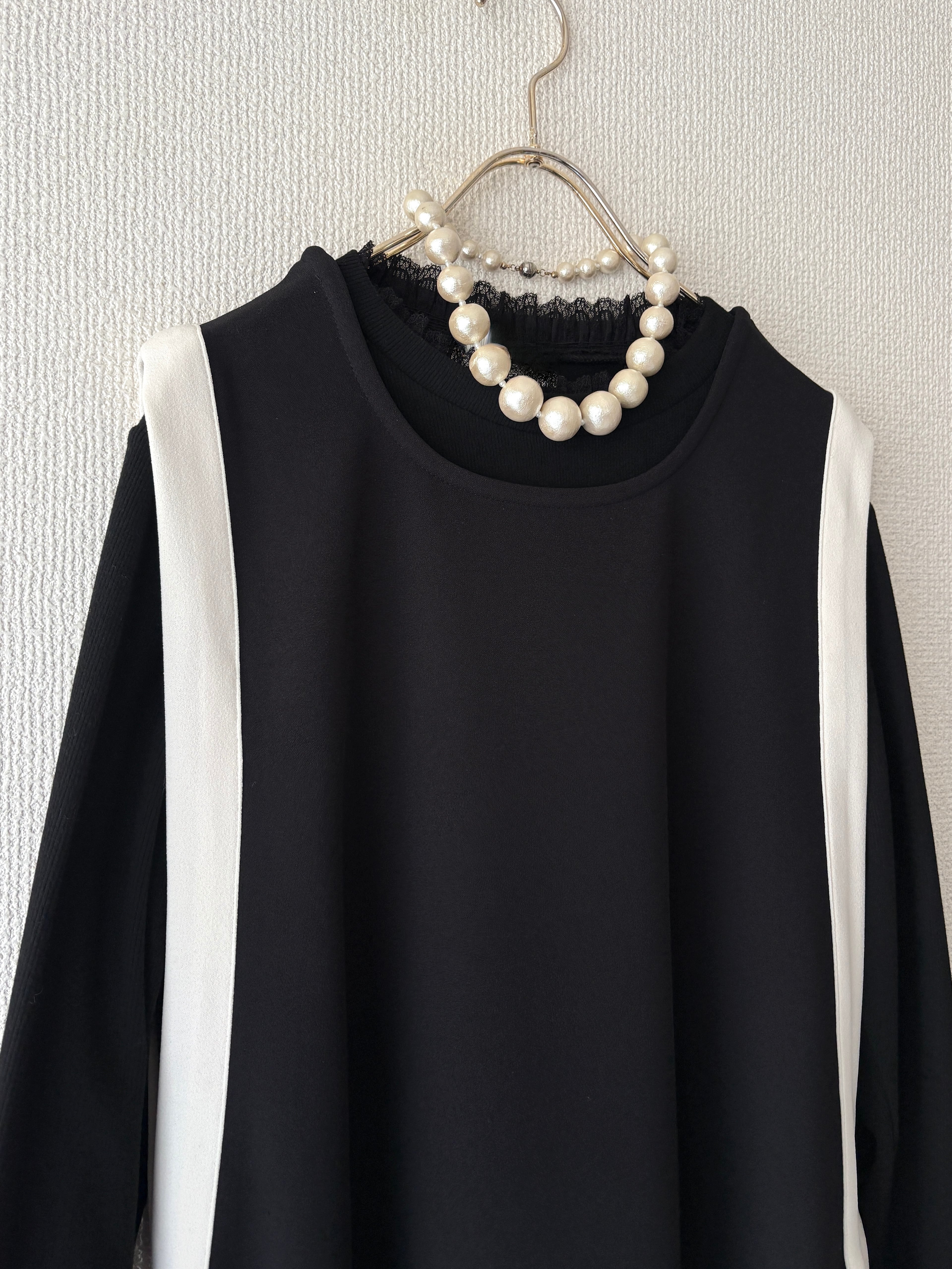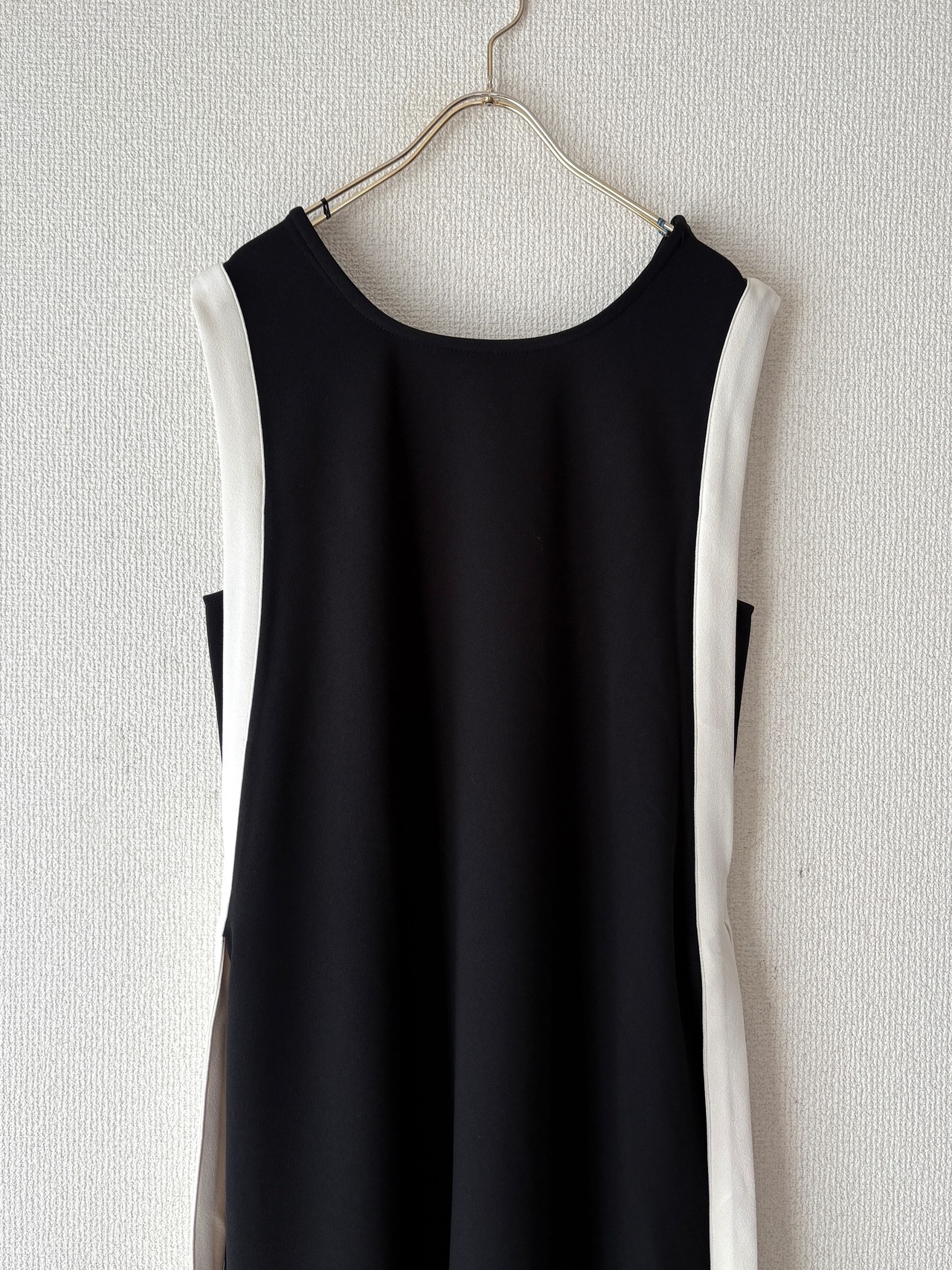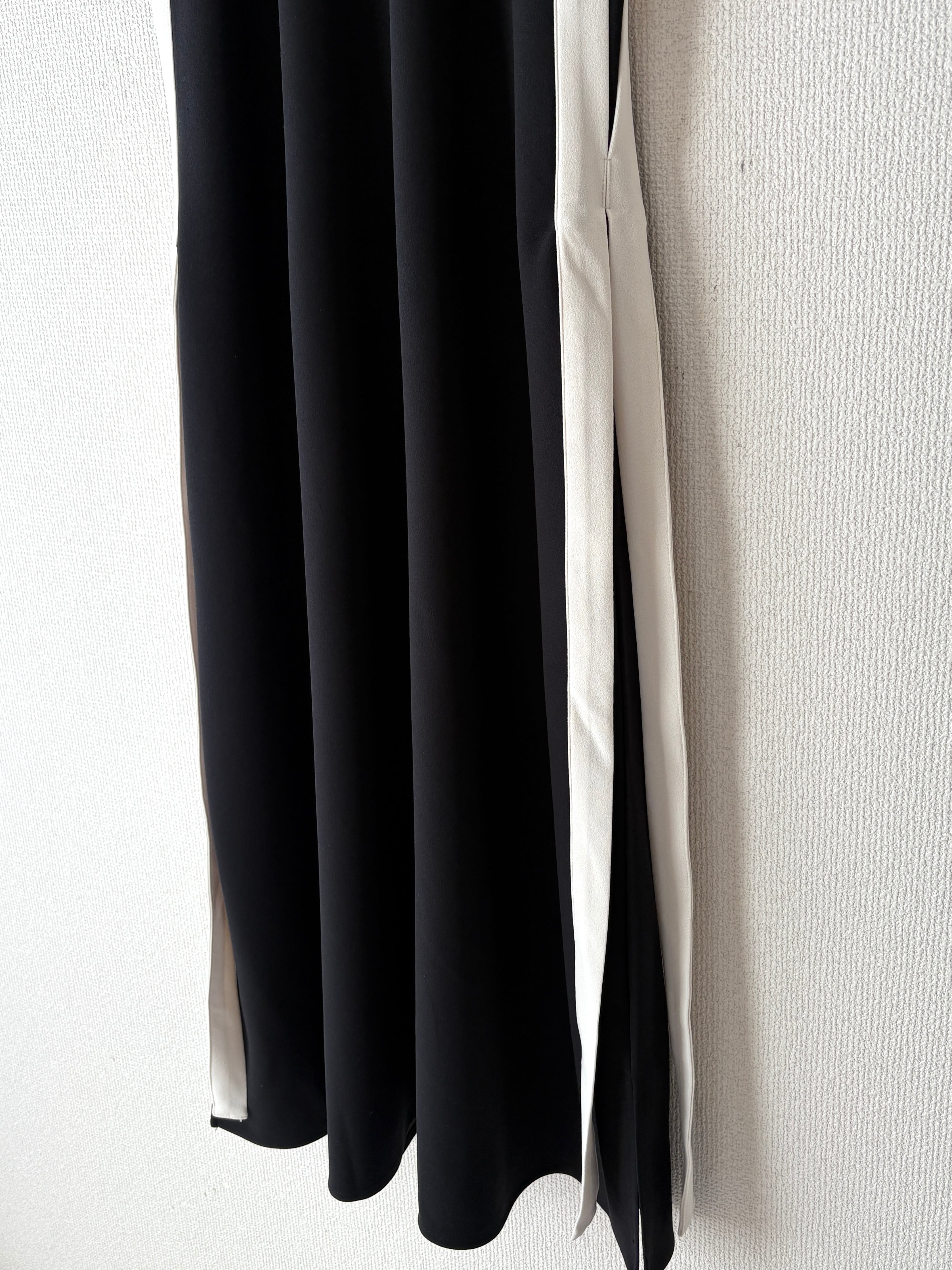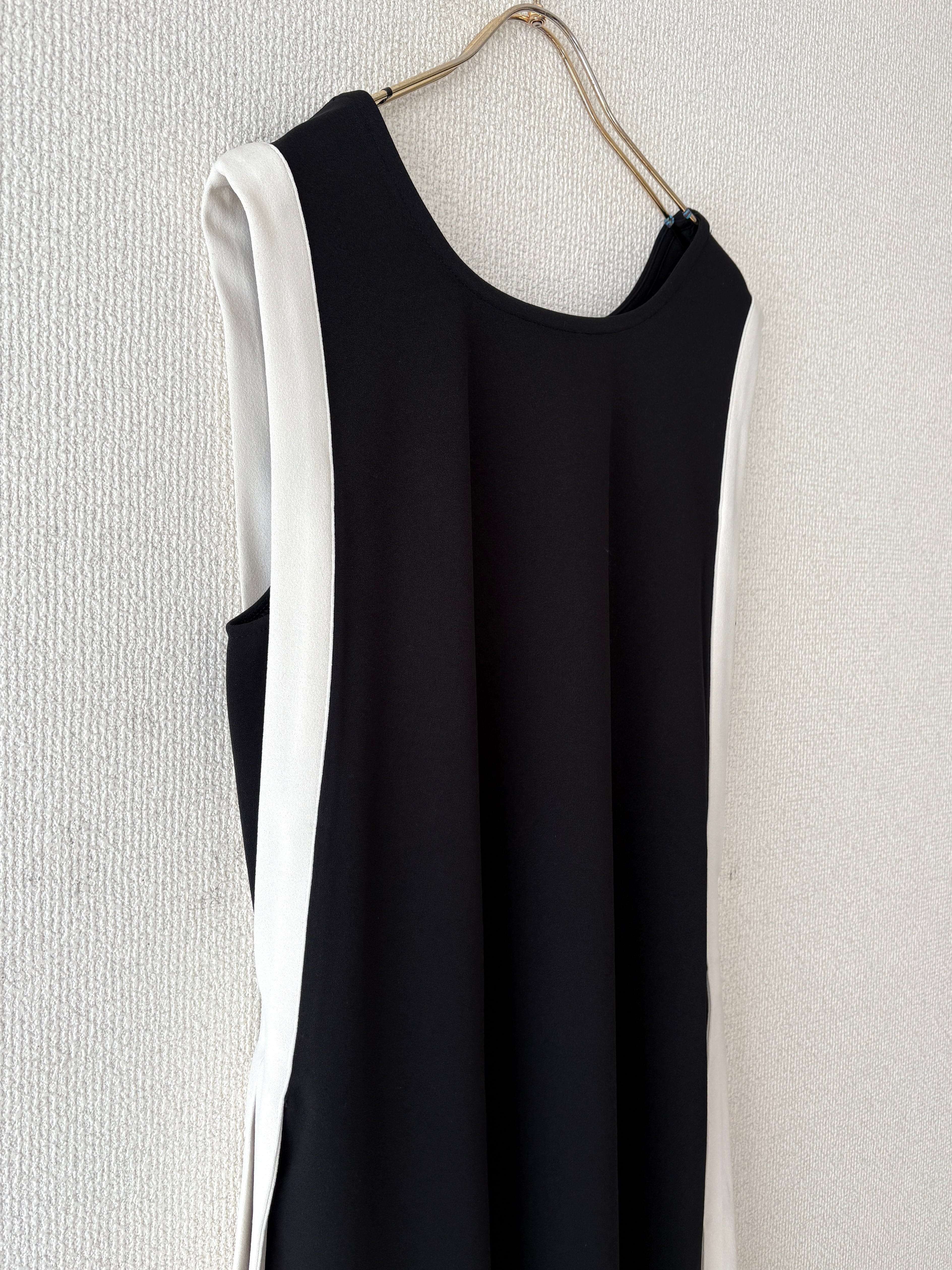 バイカラーラインの縦長効果でスタイルアップが叶うノースリーブワンピースです。