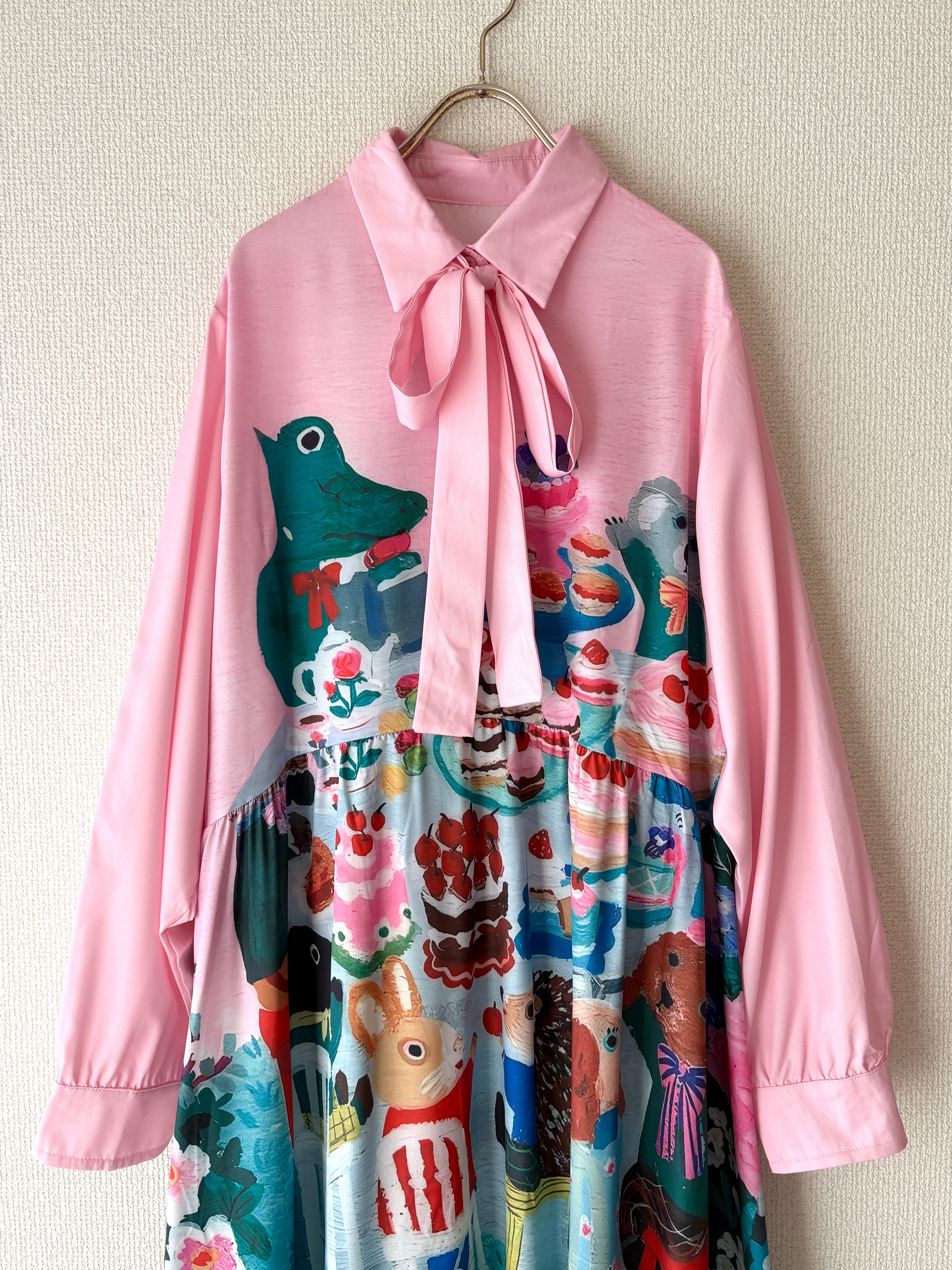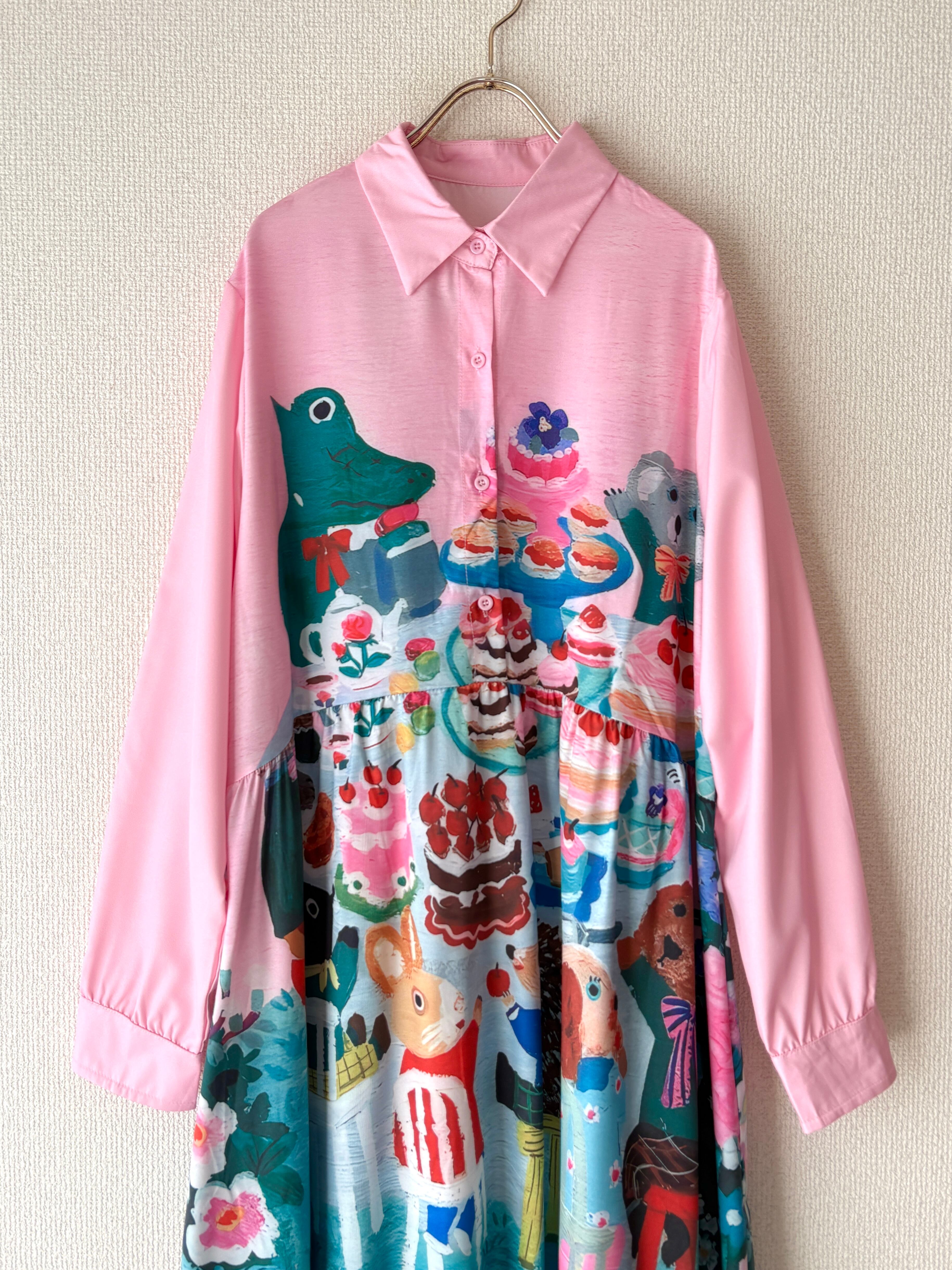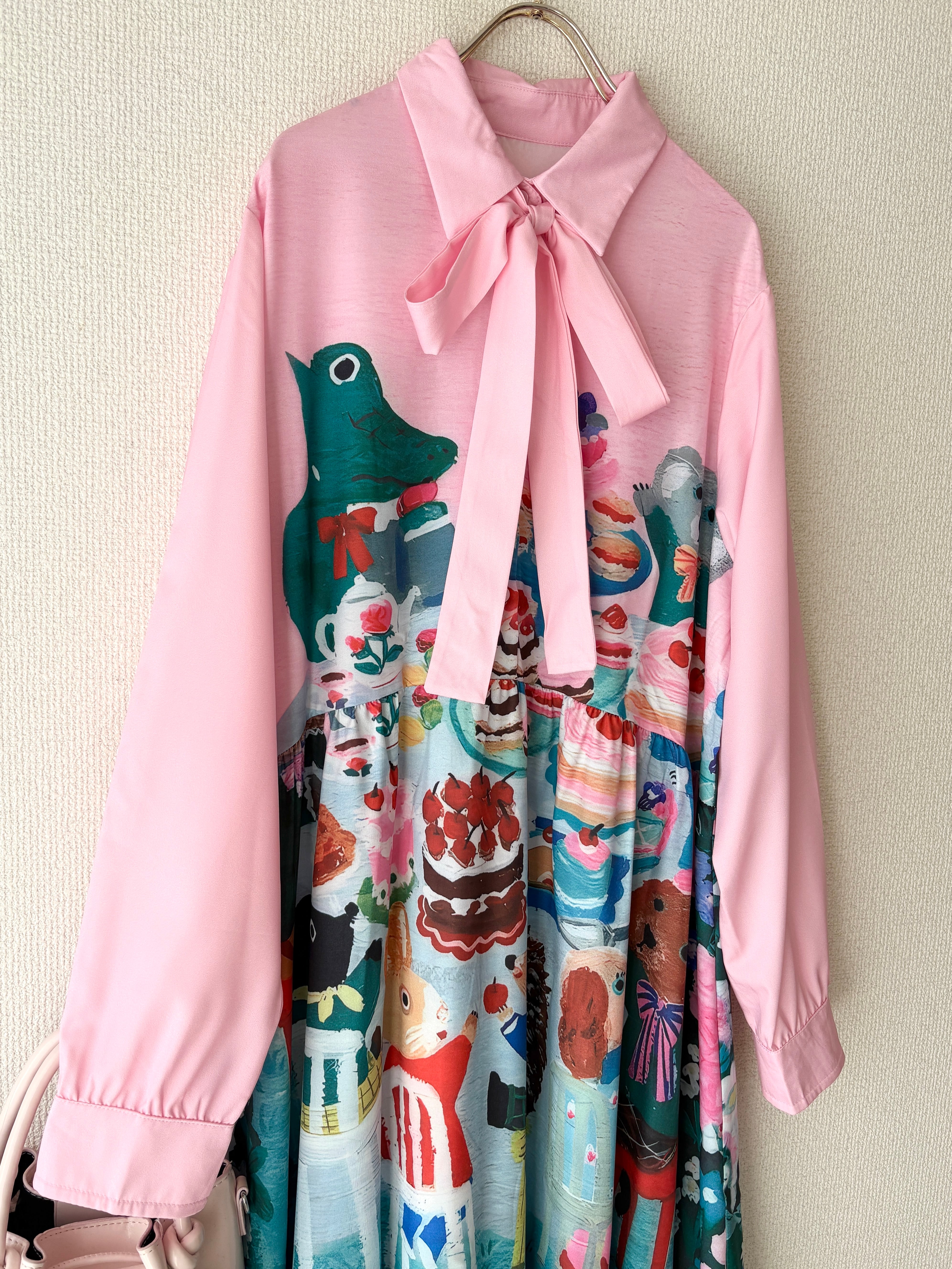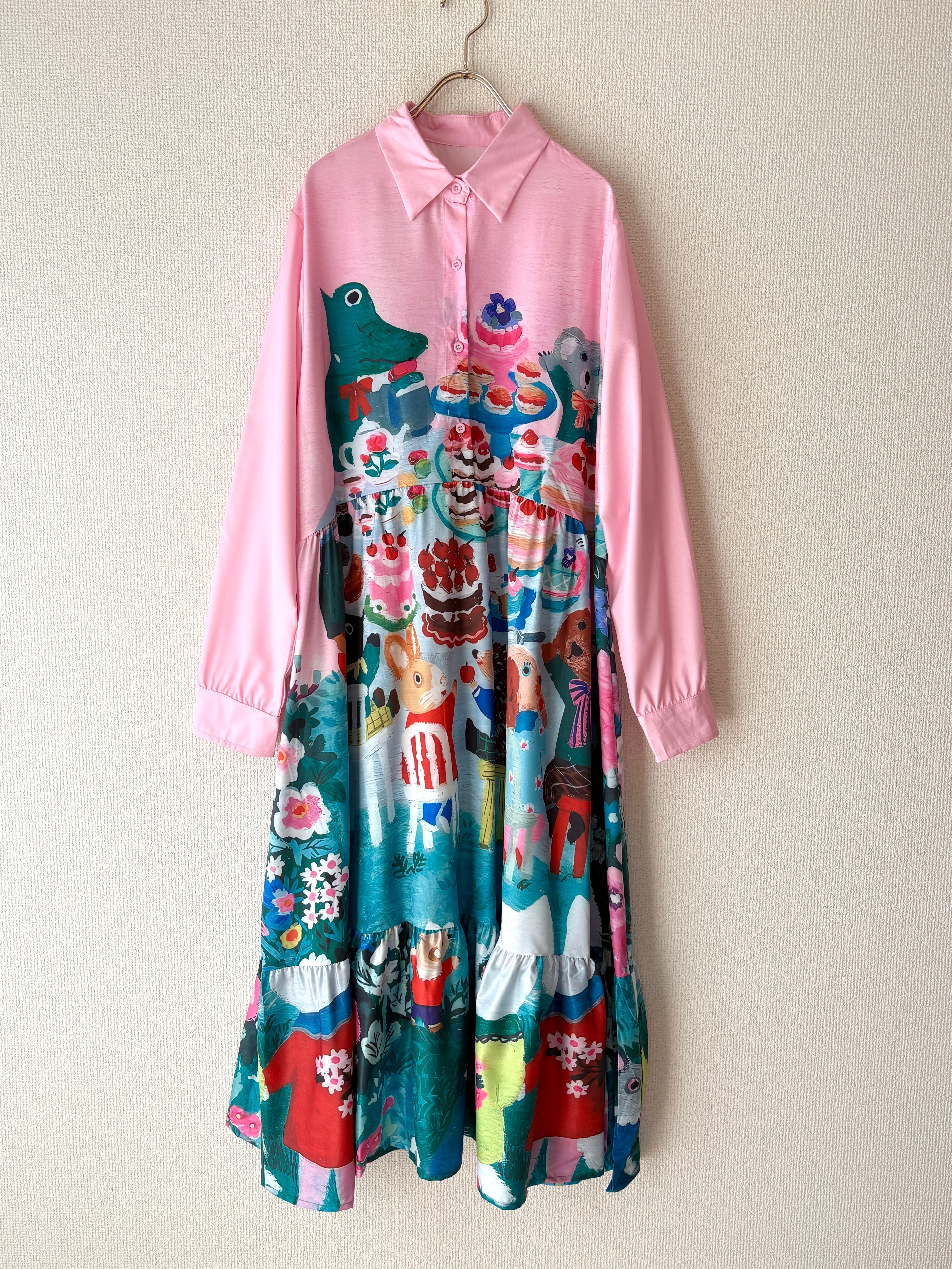 動物たちとスイーツが仲良く並ぶ、遊び心いっぱいの総柄ワンピースです。