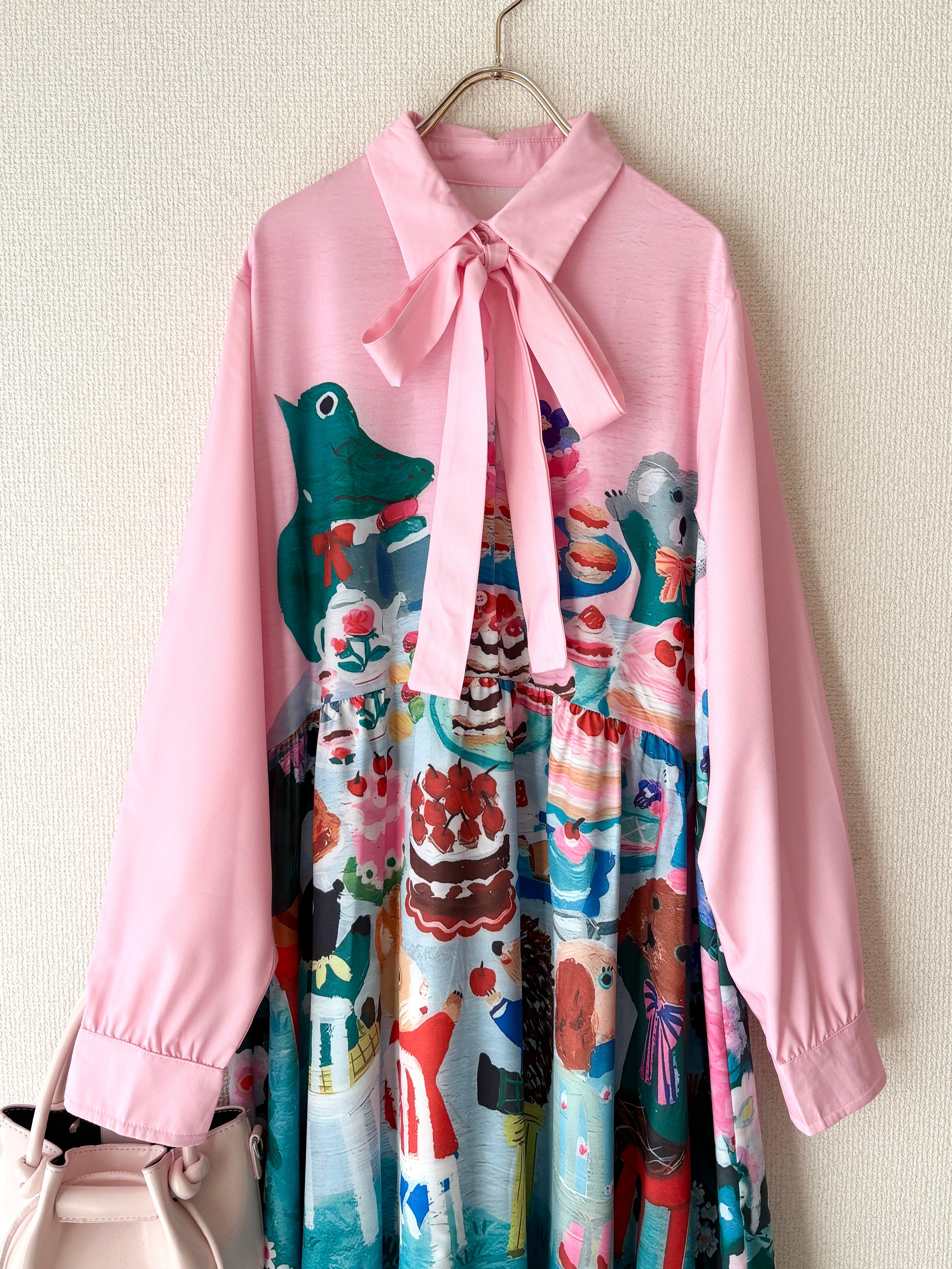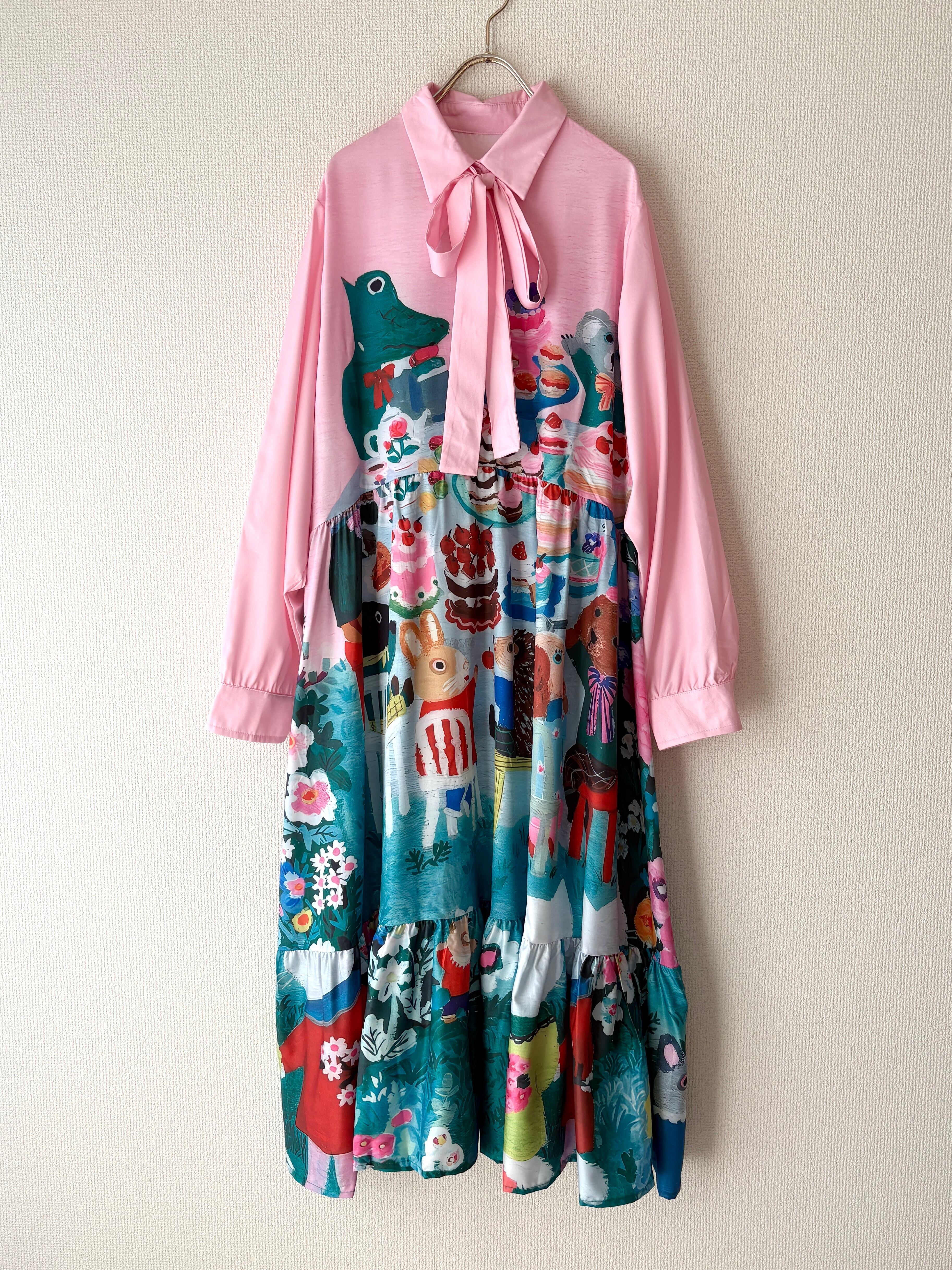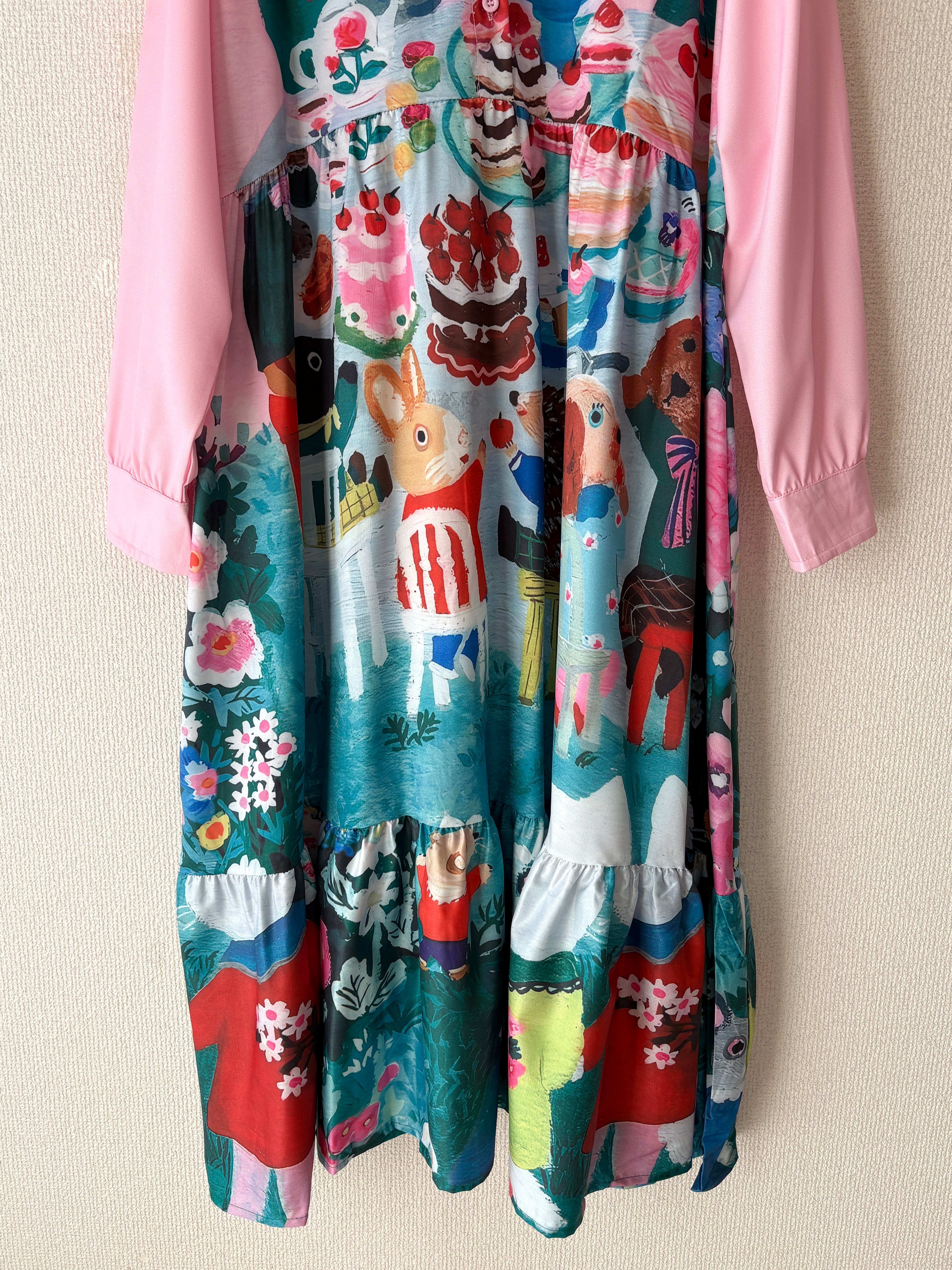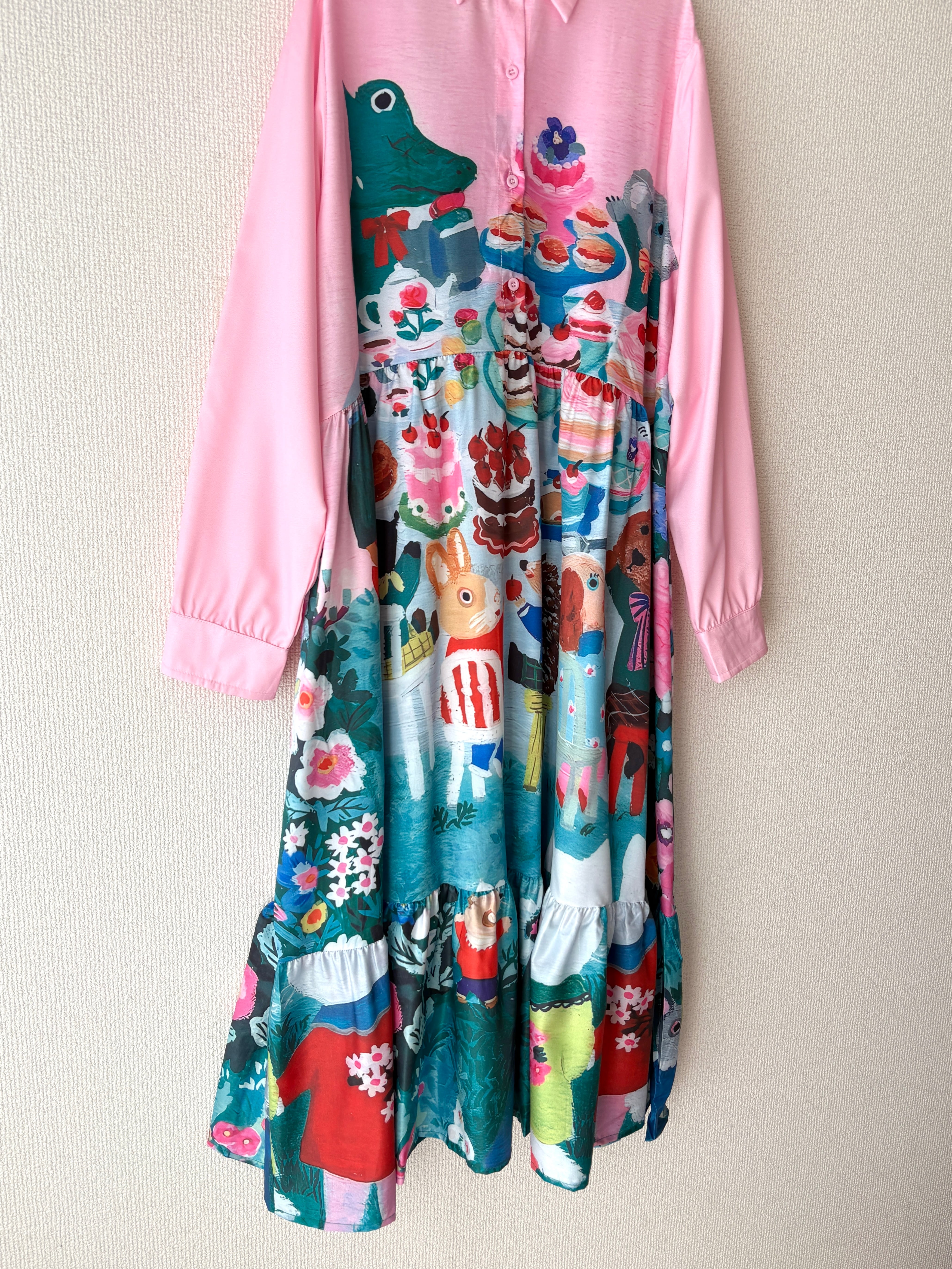 動物たちとスイーツが仲良く並ぶ、遊び心いっぱいの総柄ワンピースです。