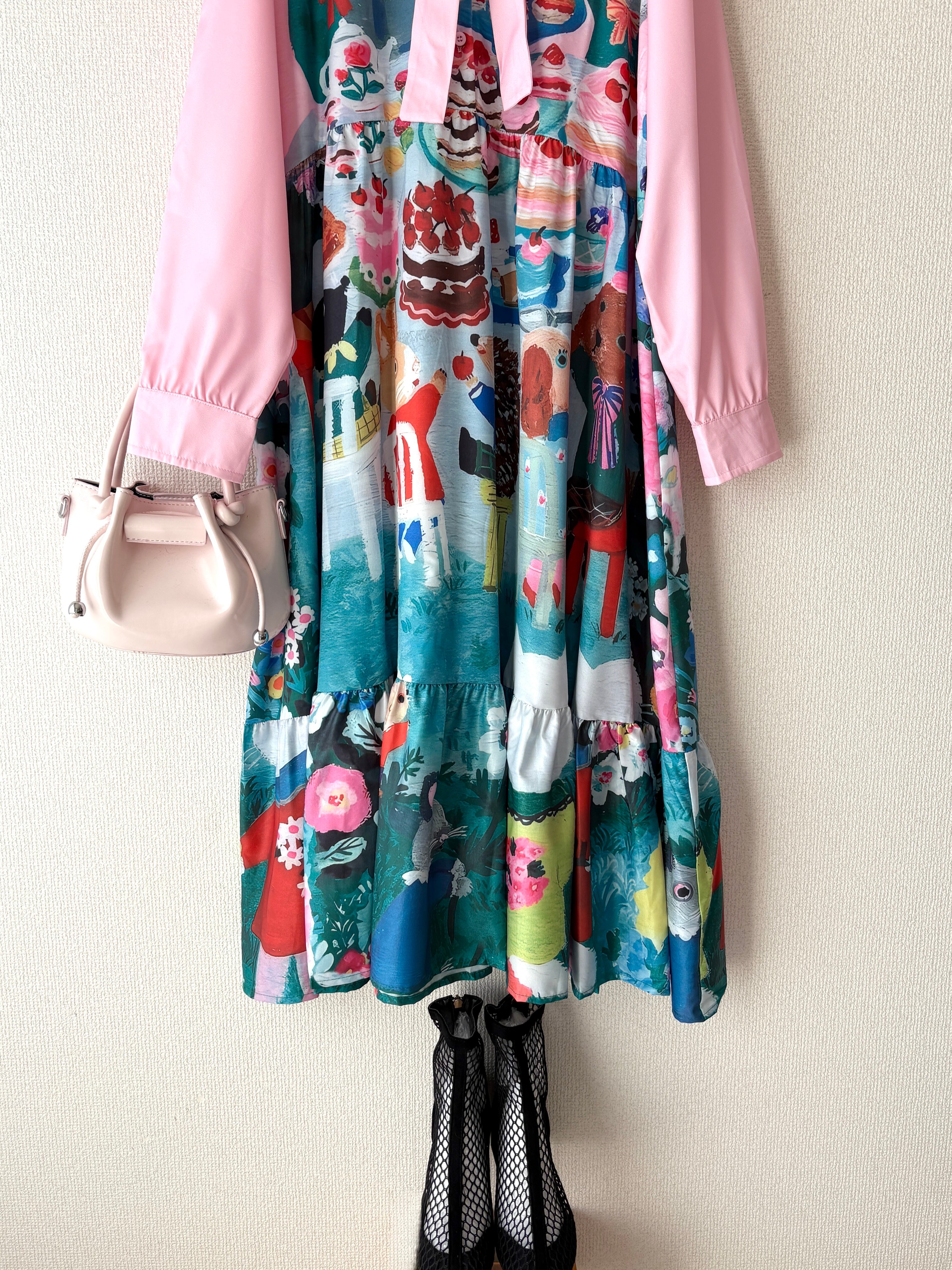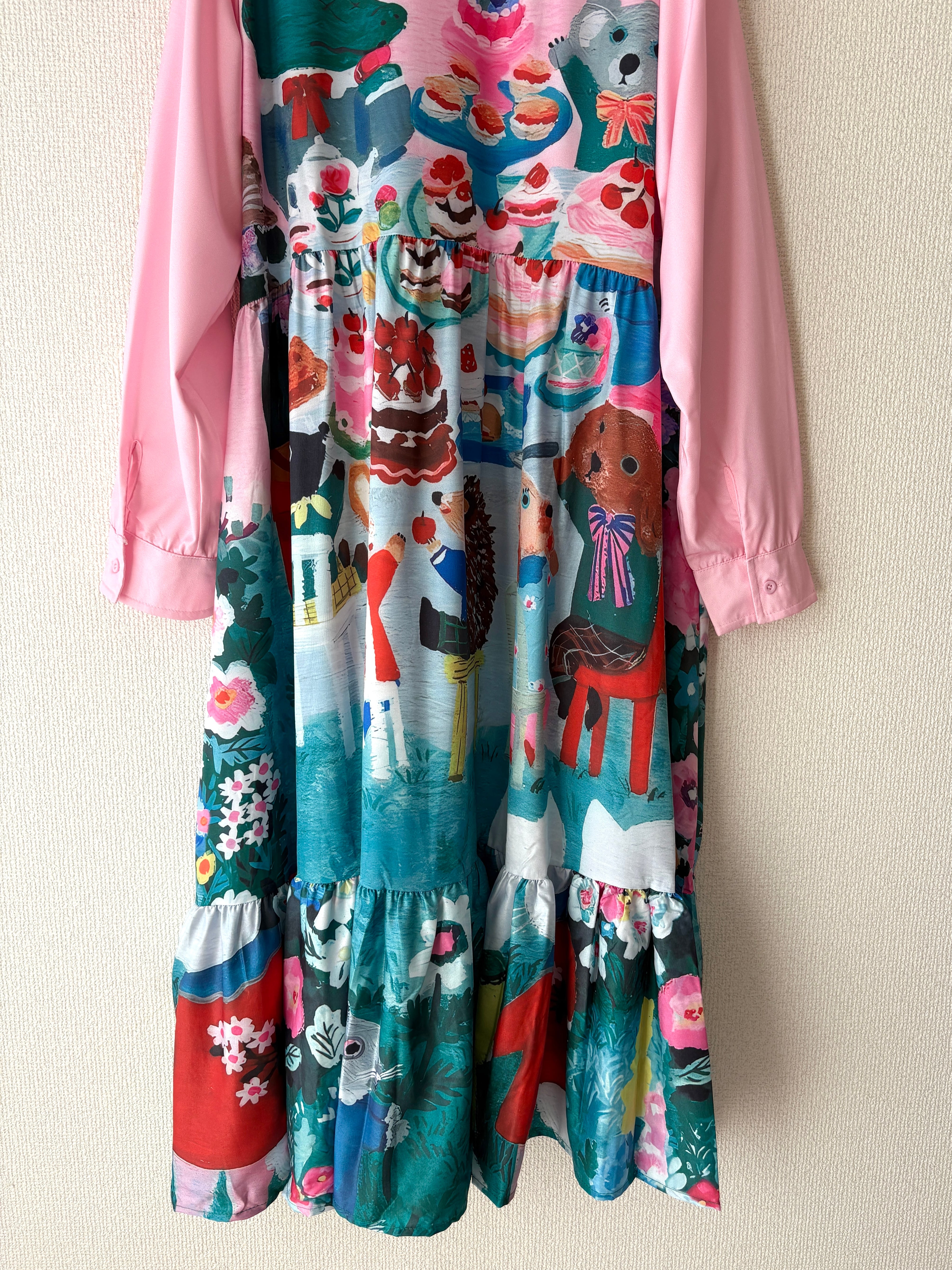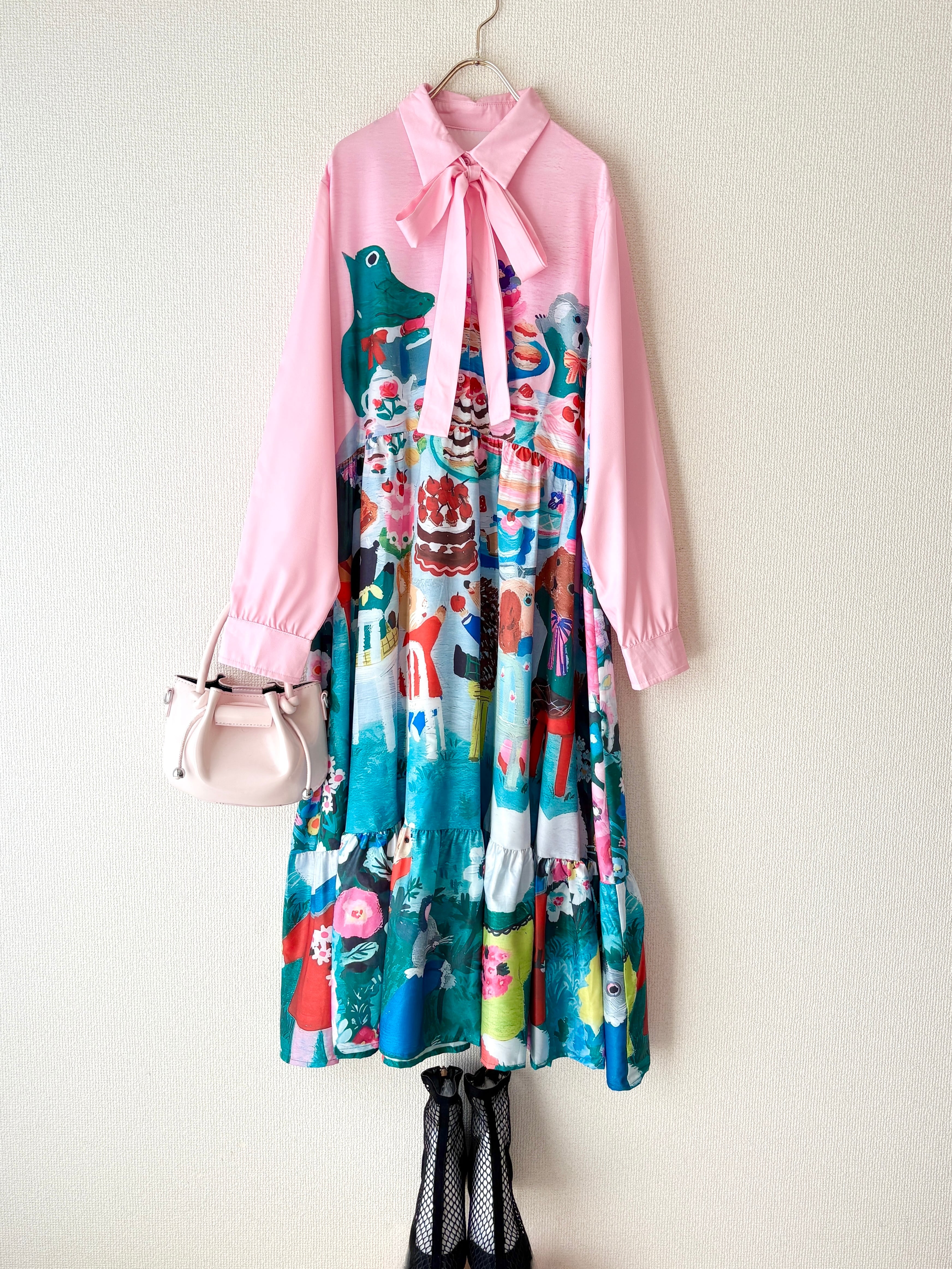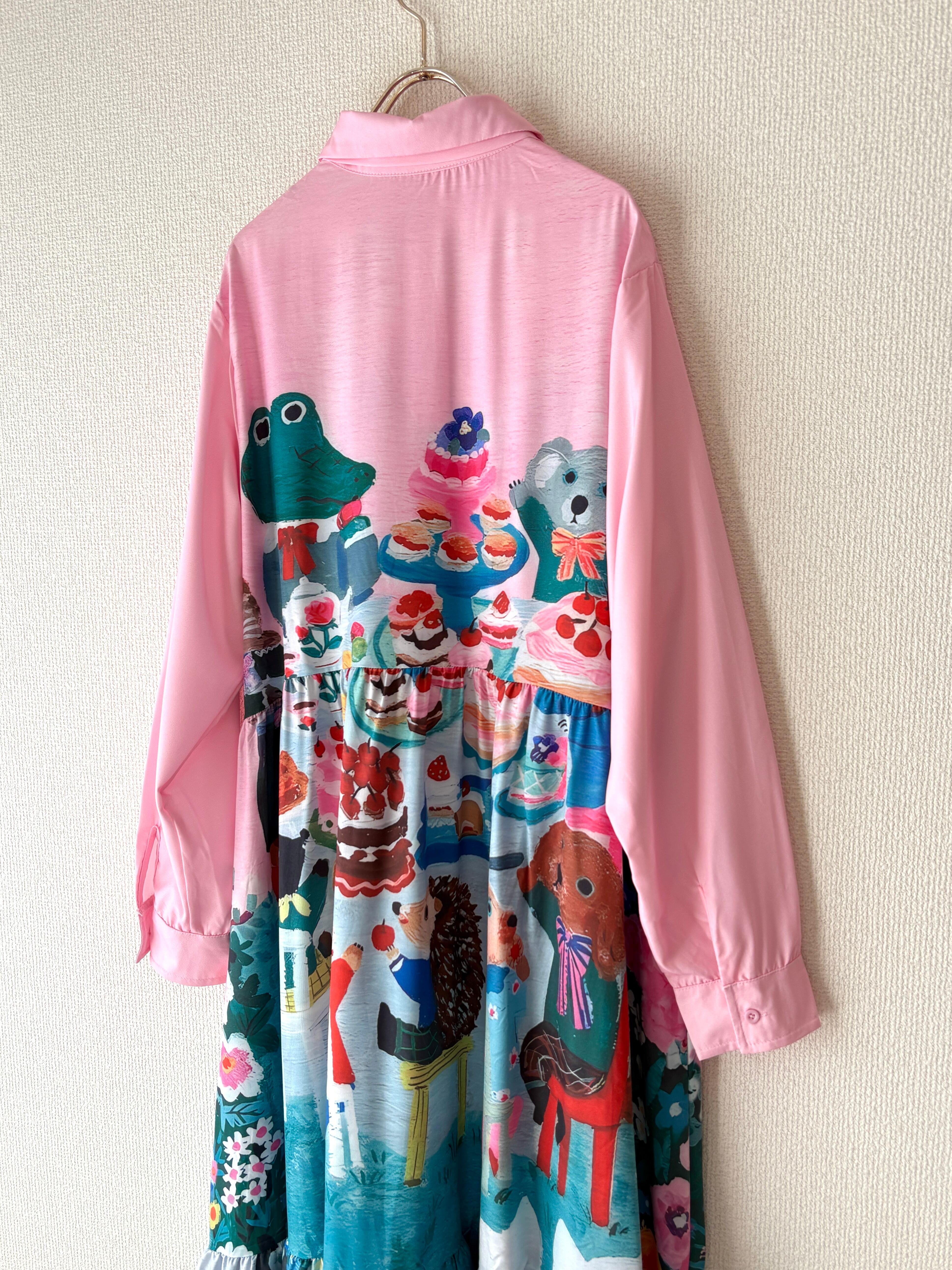 動物たちとスイーツが仲良く並ぶ、遊び心いっぱいの総柄ワンピースです。