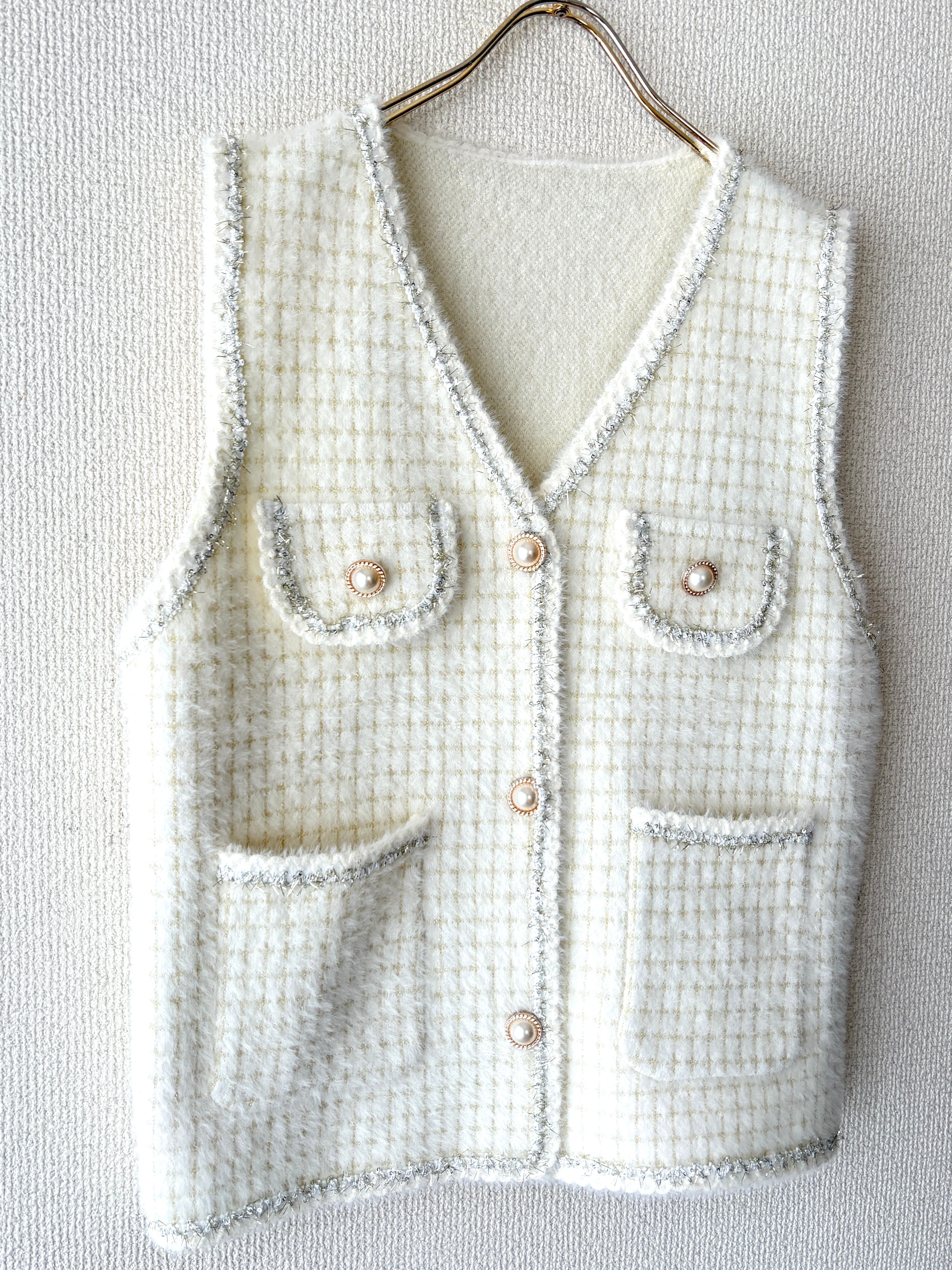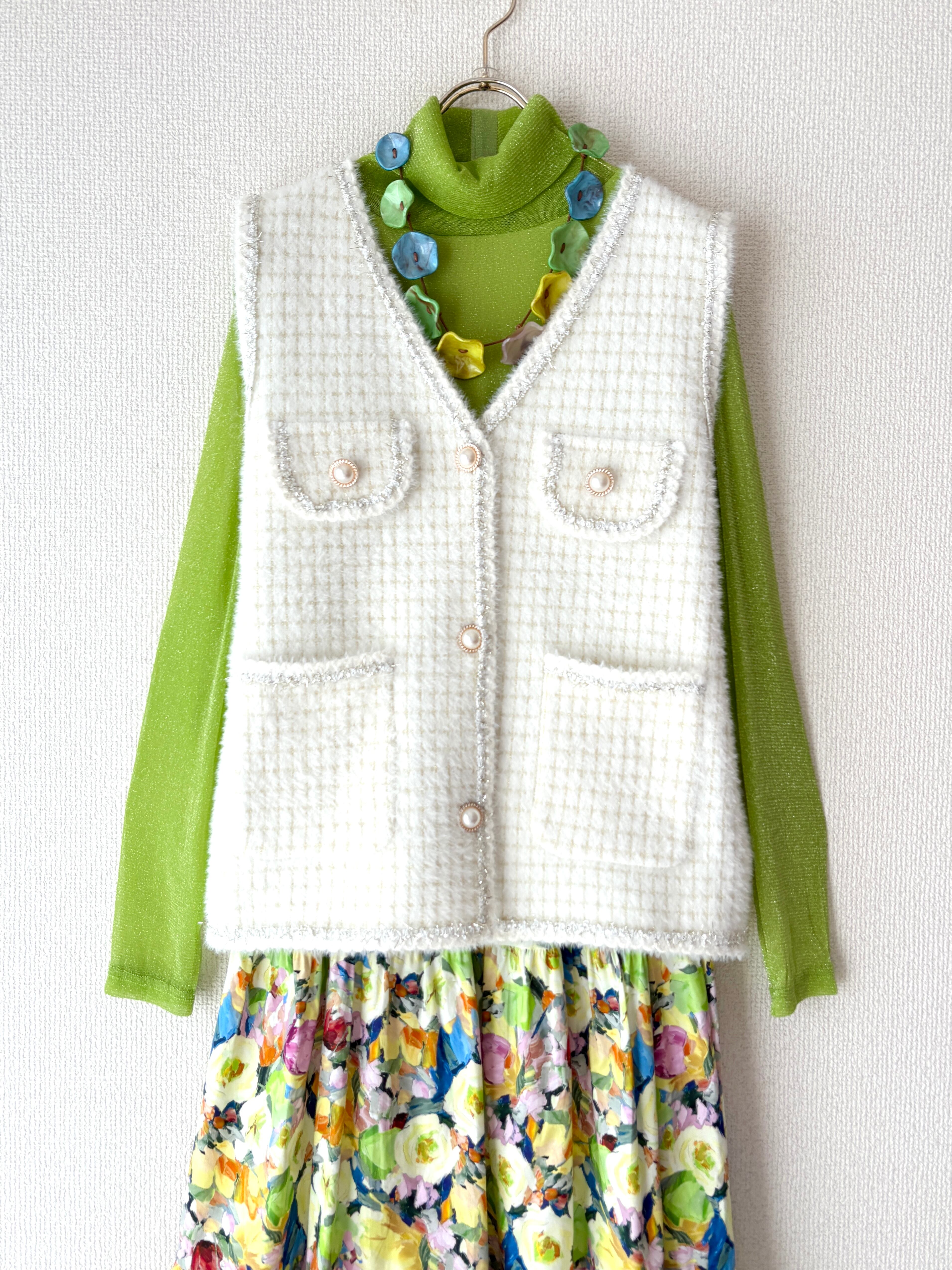上品に演出してくれるデザインで重ね着にも使いやすく、洗練された印象に。