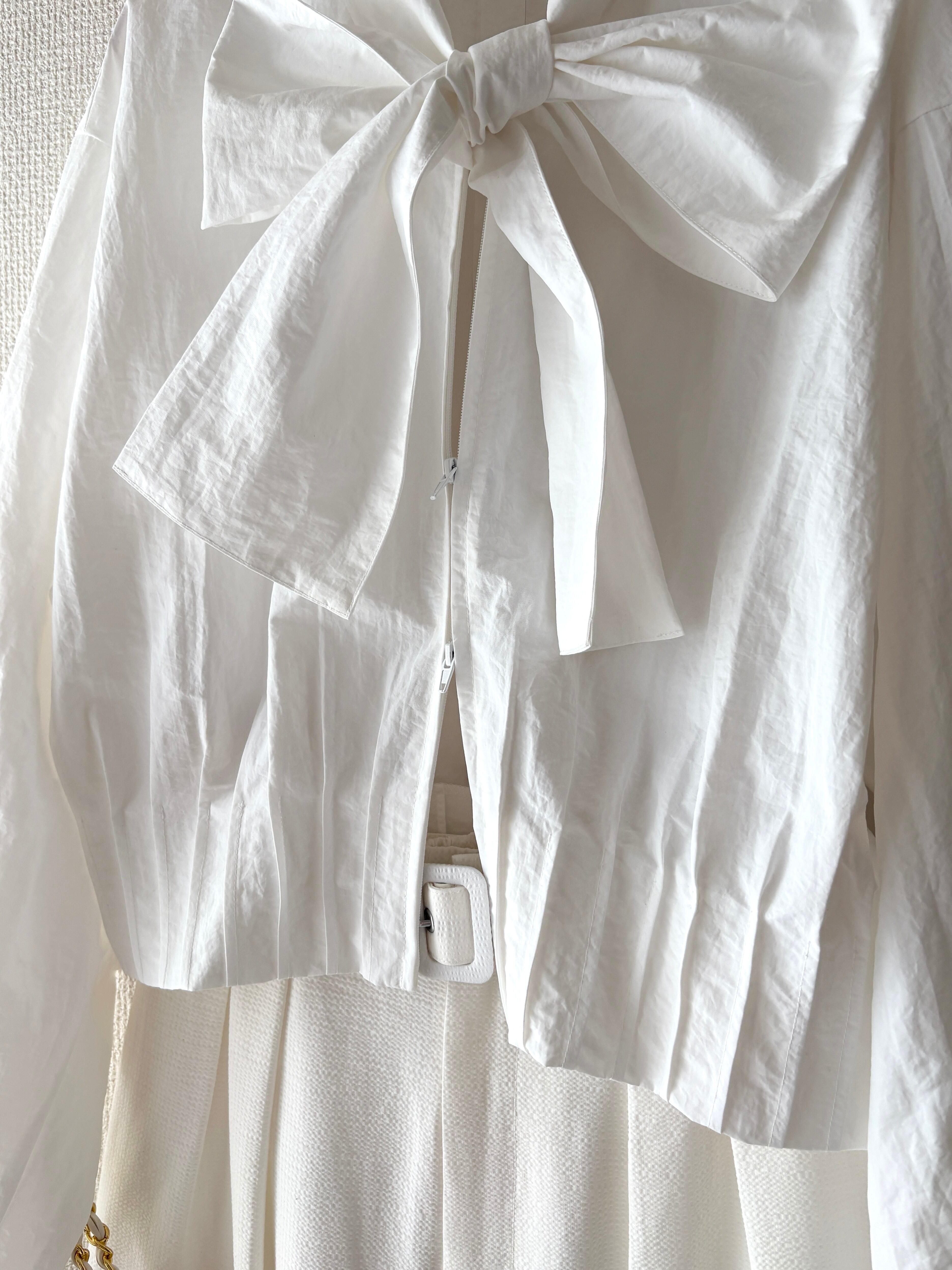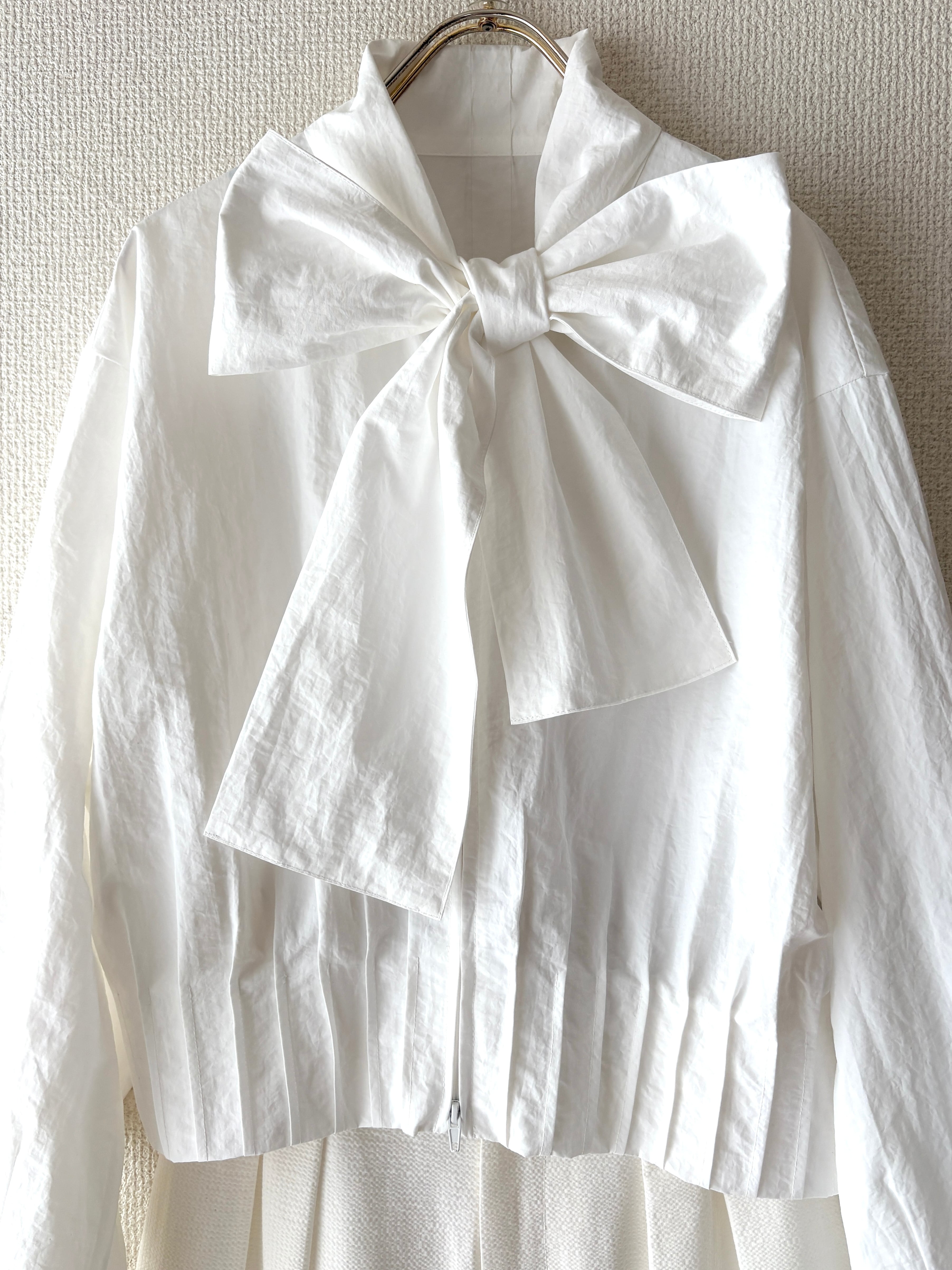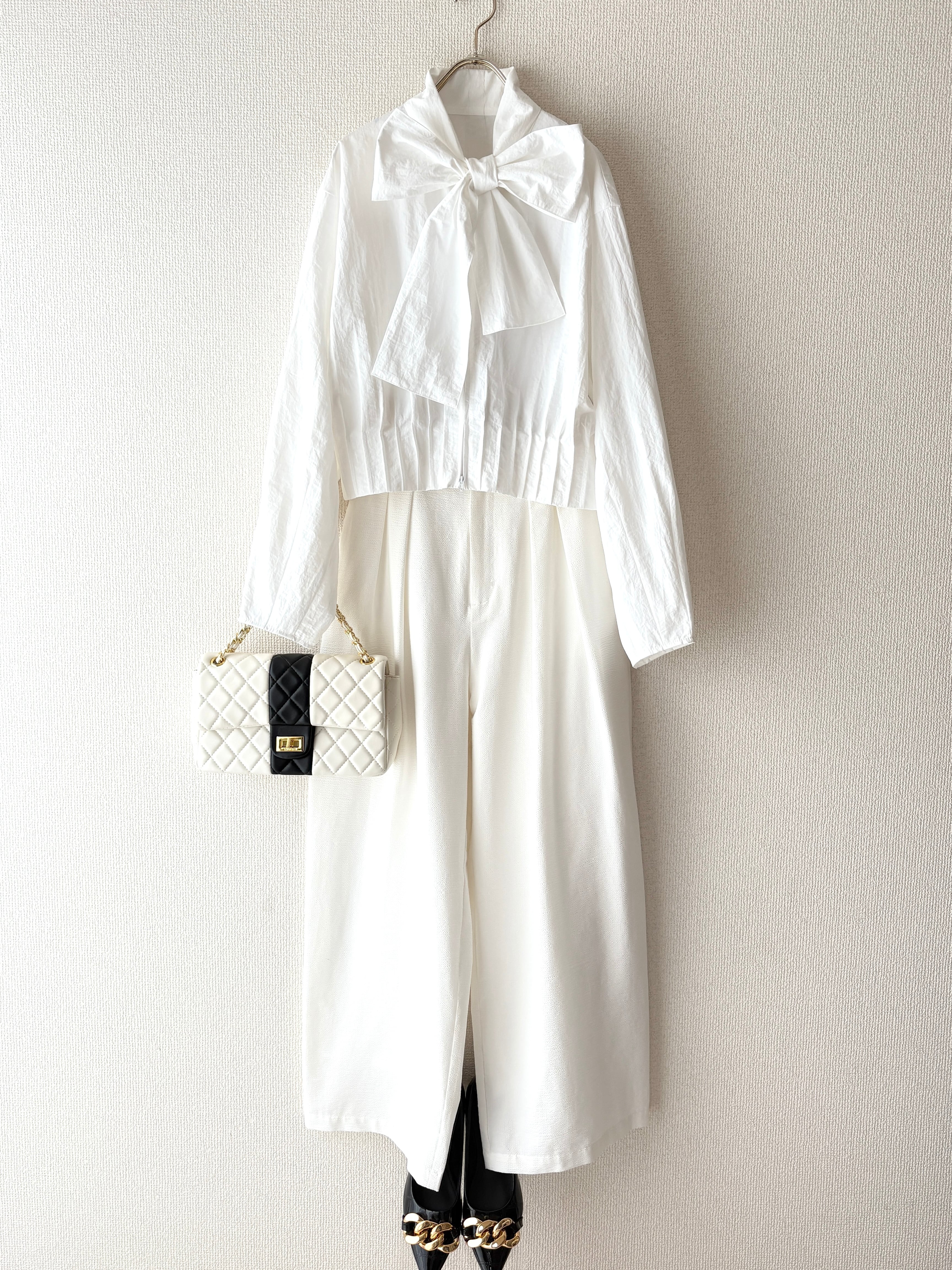 立体感のあるタックデザインとボウタイが目を惹くブラウス。すっきりとしたショート丈シルエットに、フロントのボウタイが上品なアクセントをプラスします。