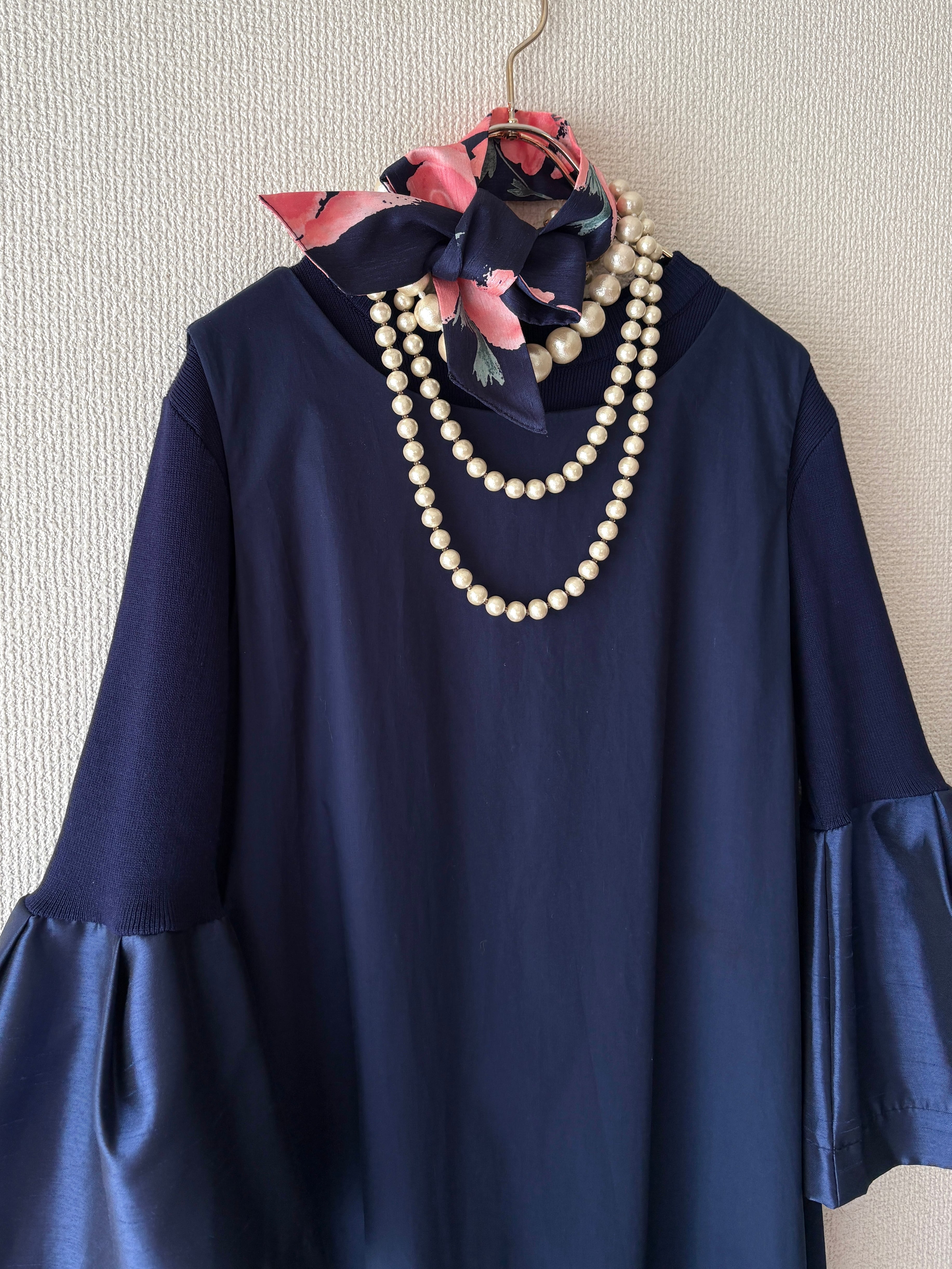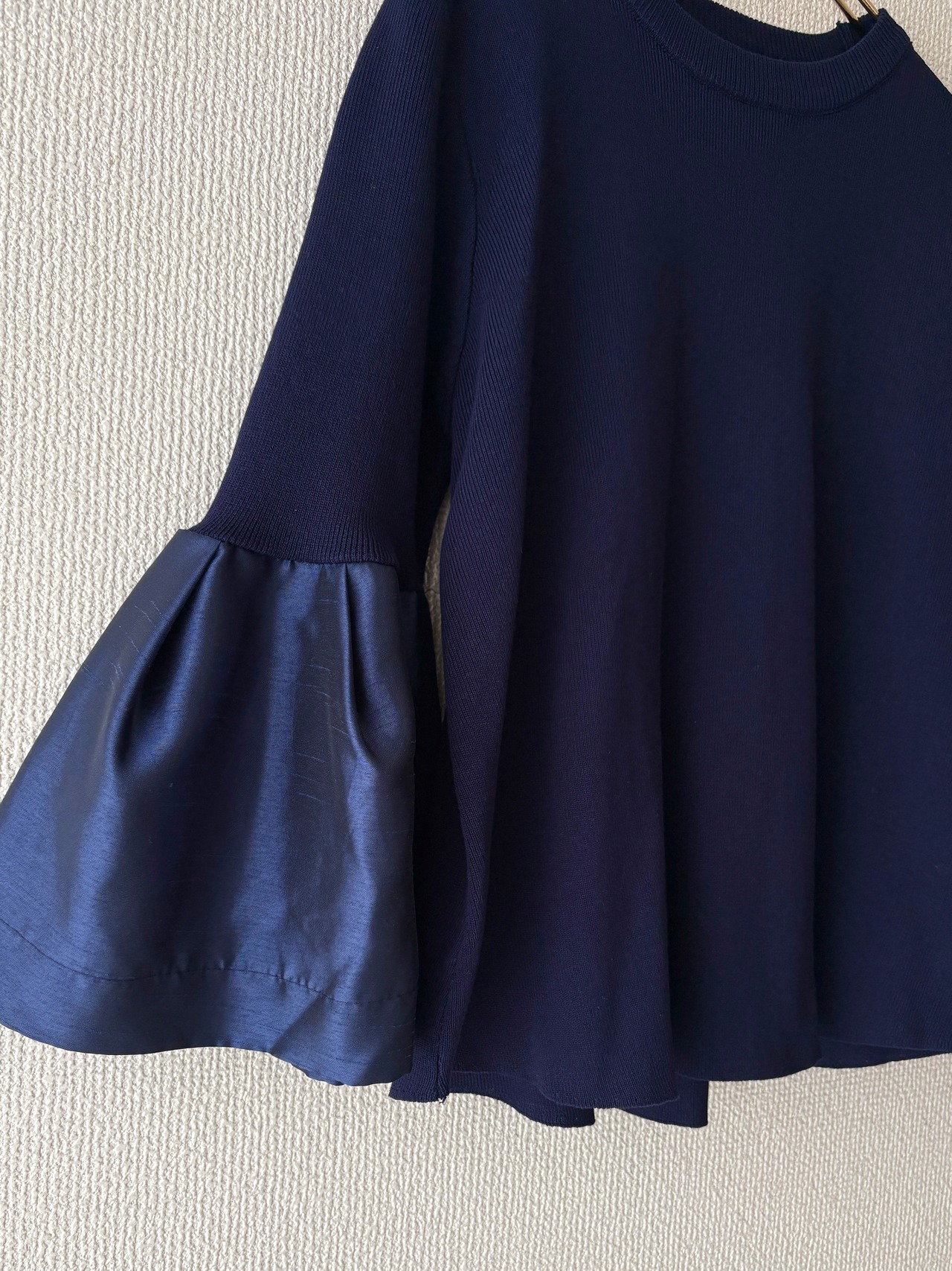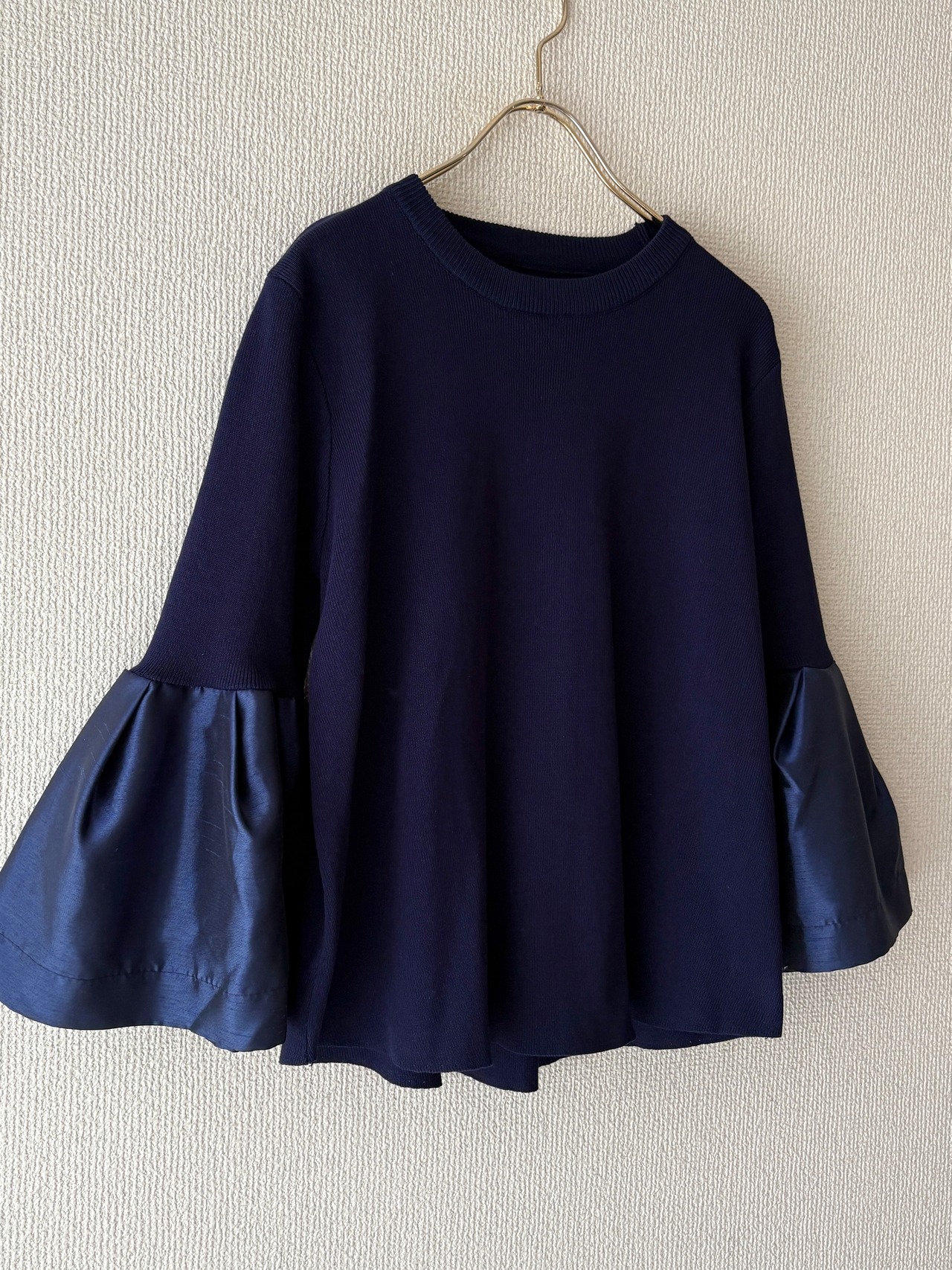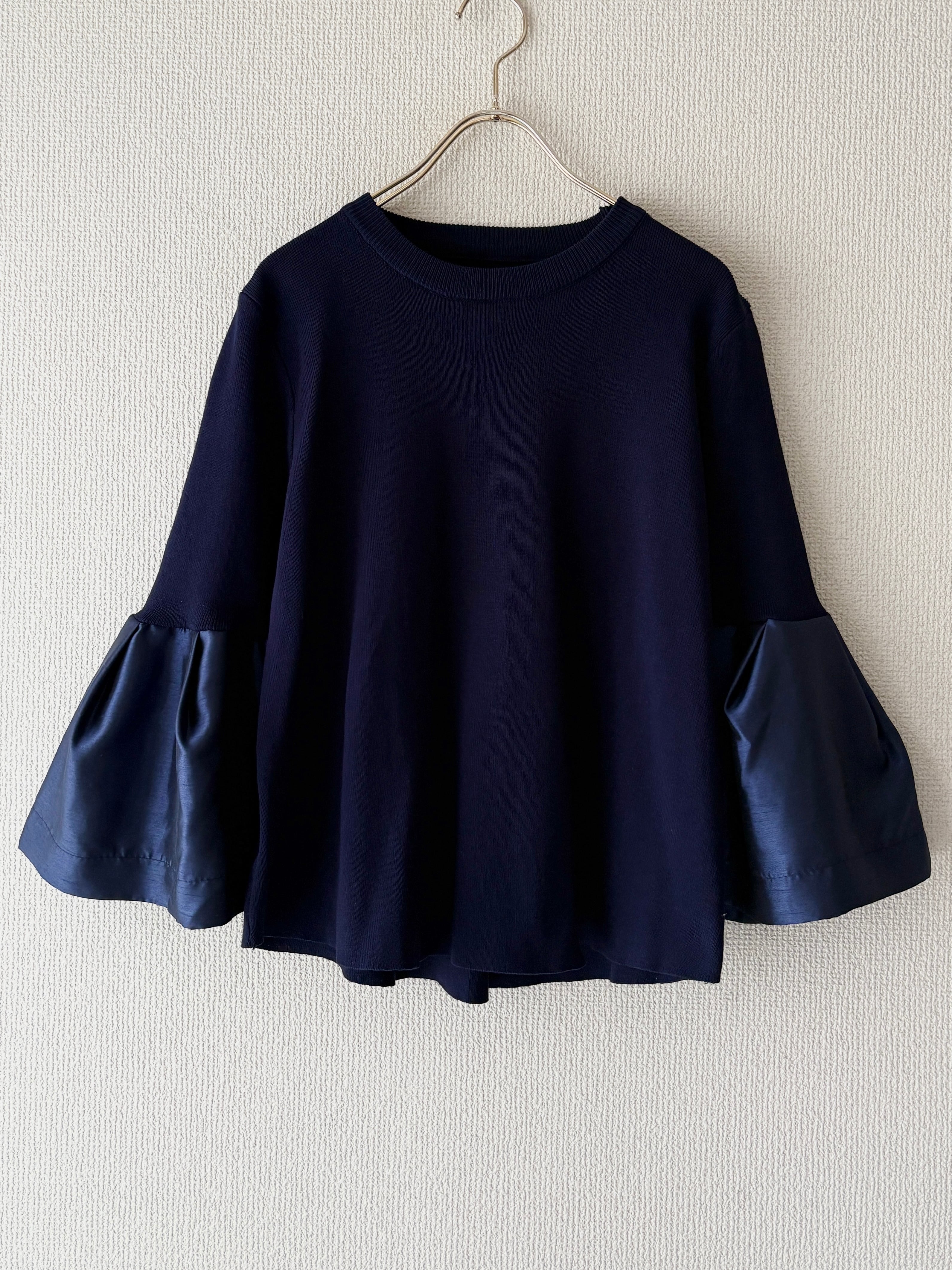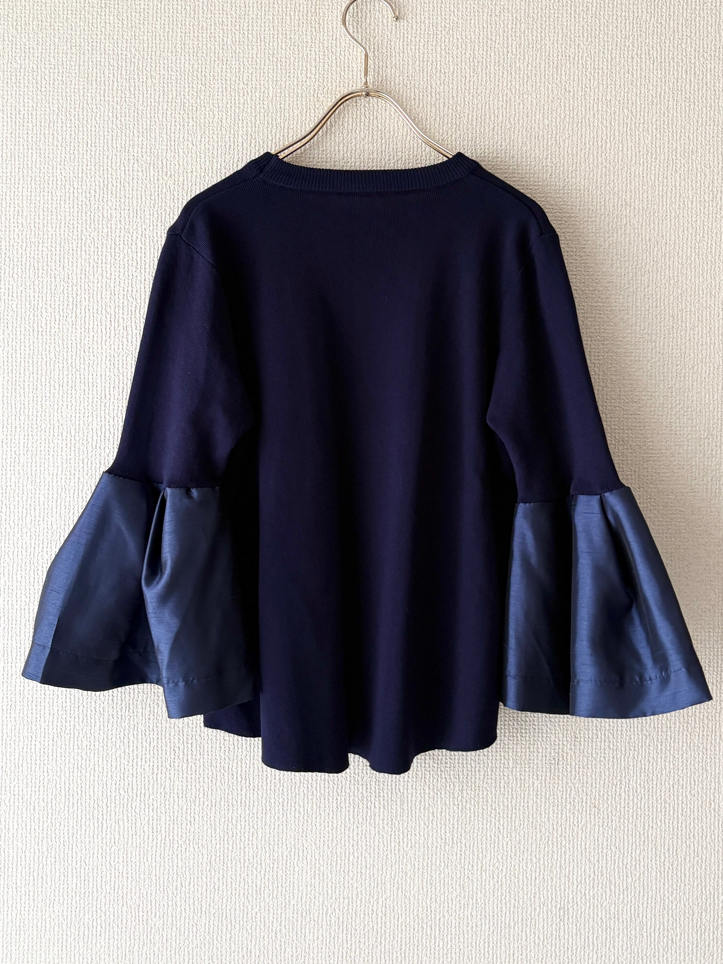 光沢感とシルエットで魅せる、異素材スリーブのブラウス。艶やかな素材で切り替えたフレアスリーブが上品な華やぎを演出します。