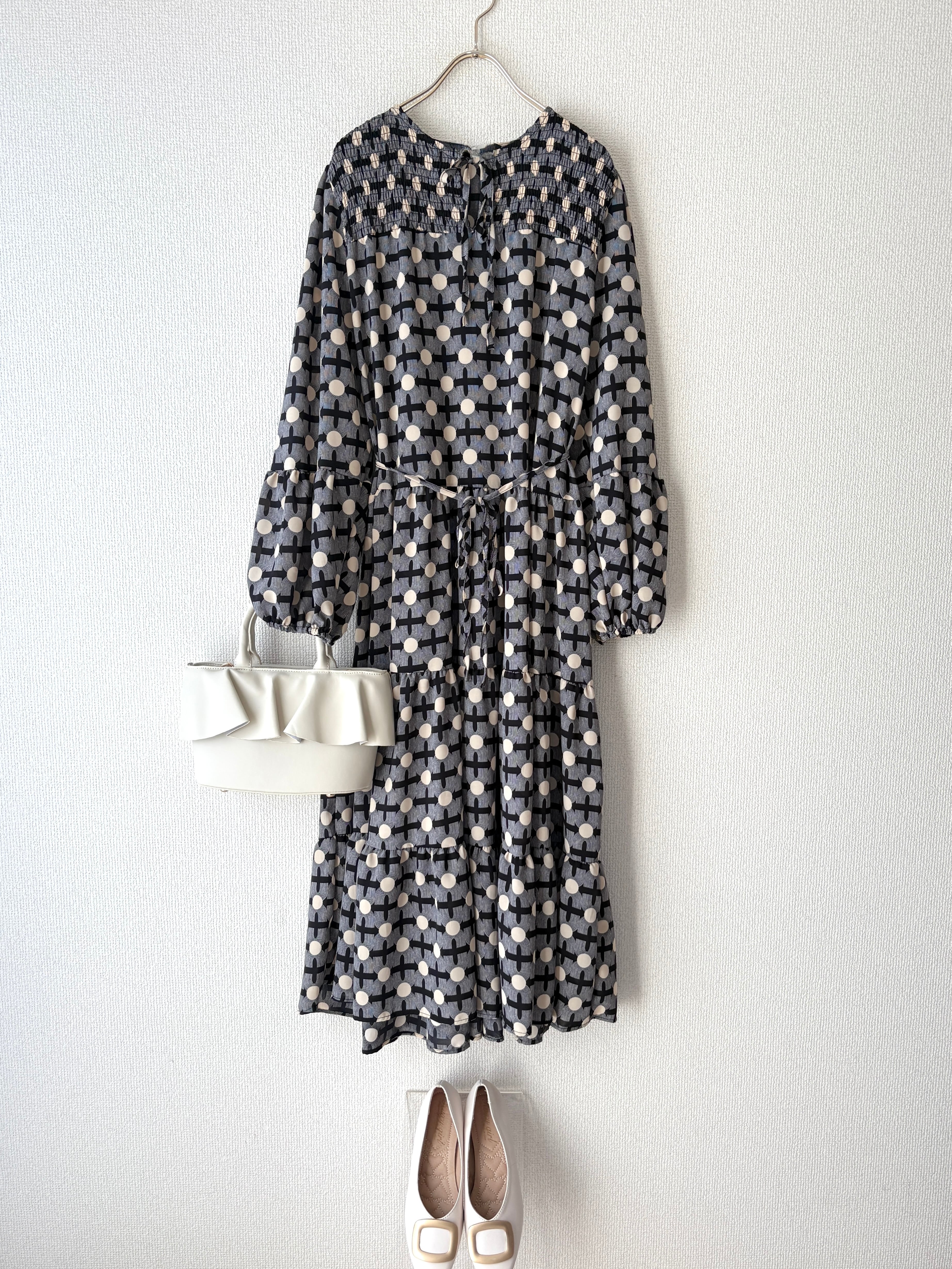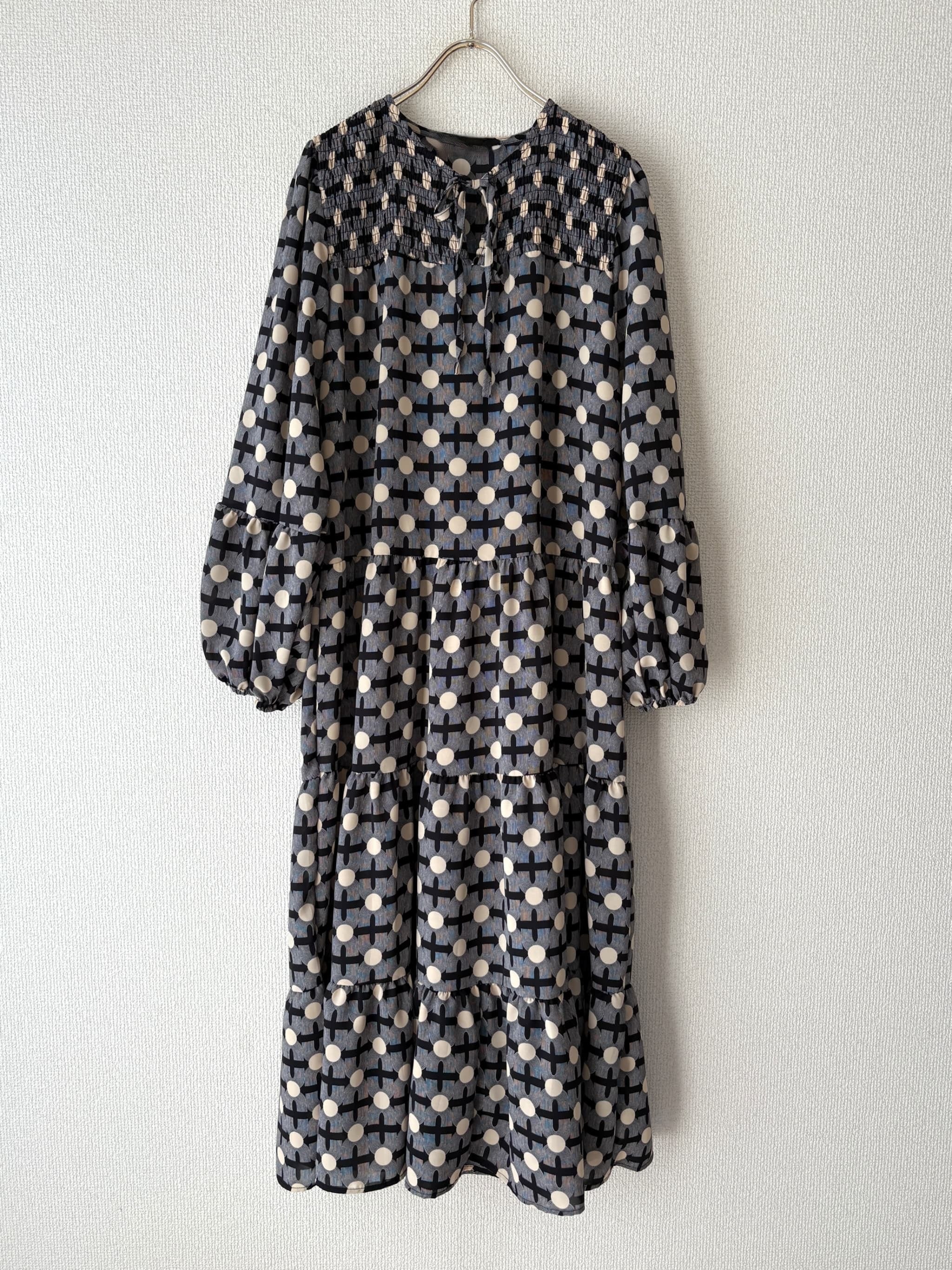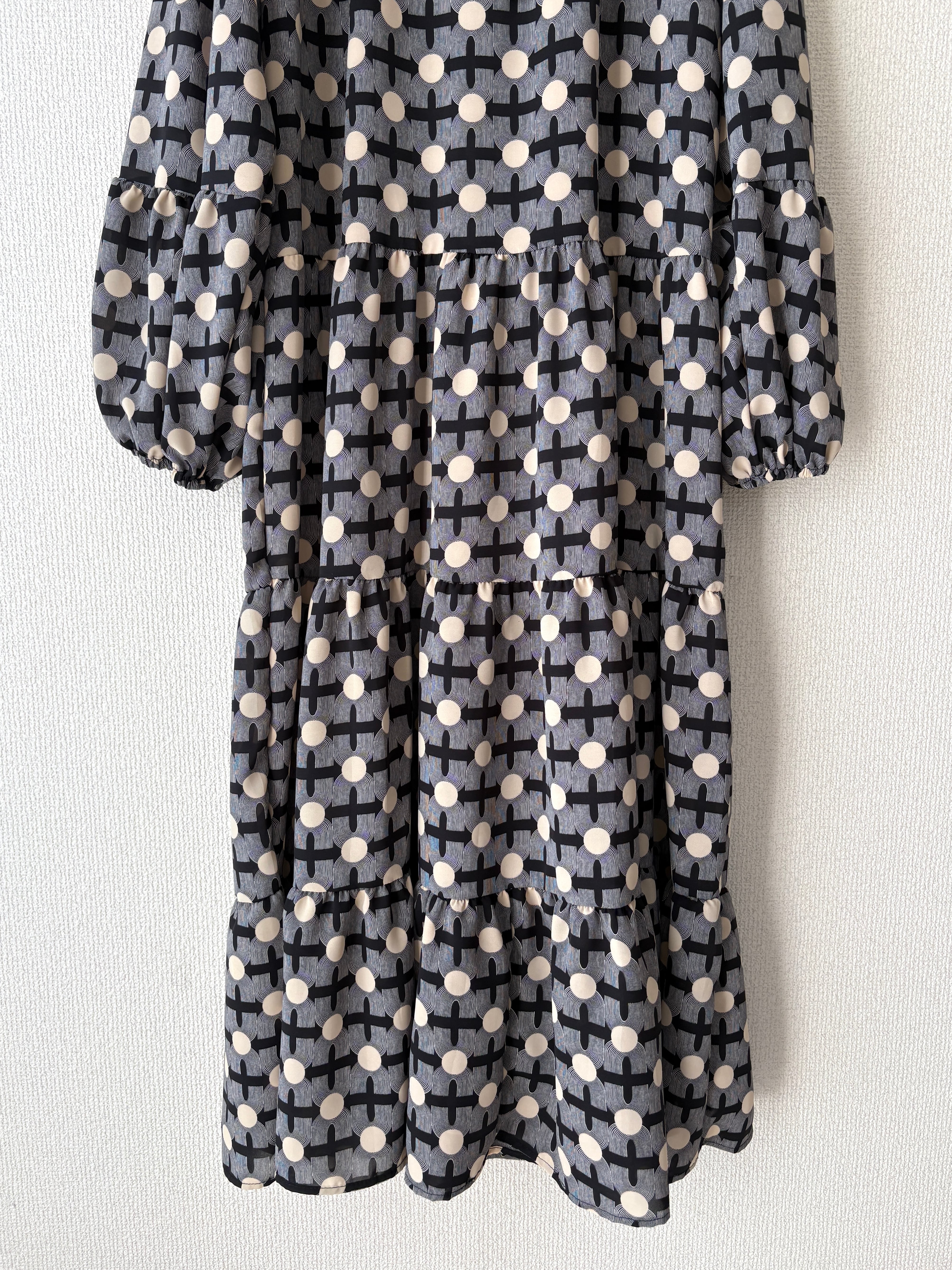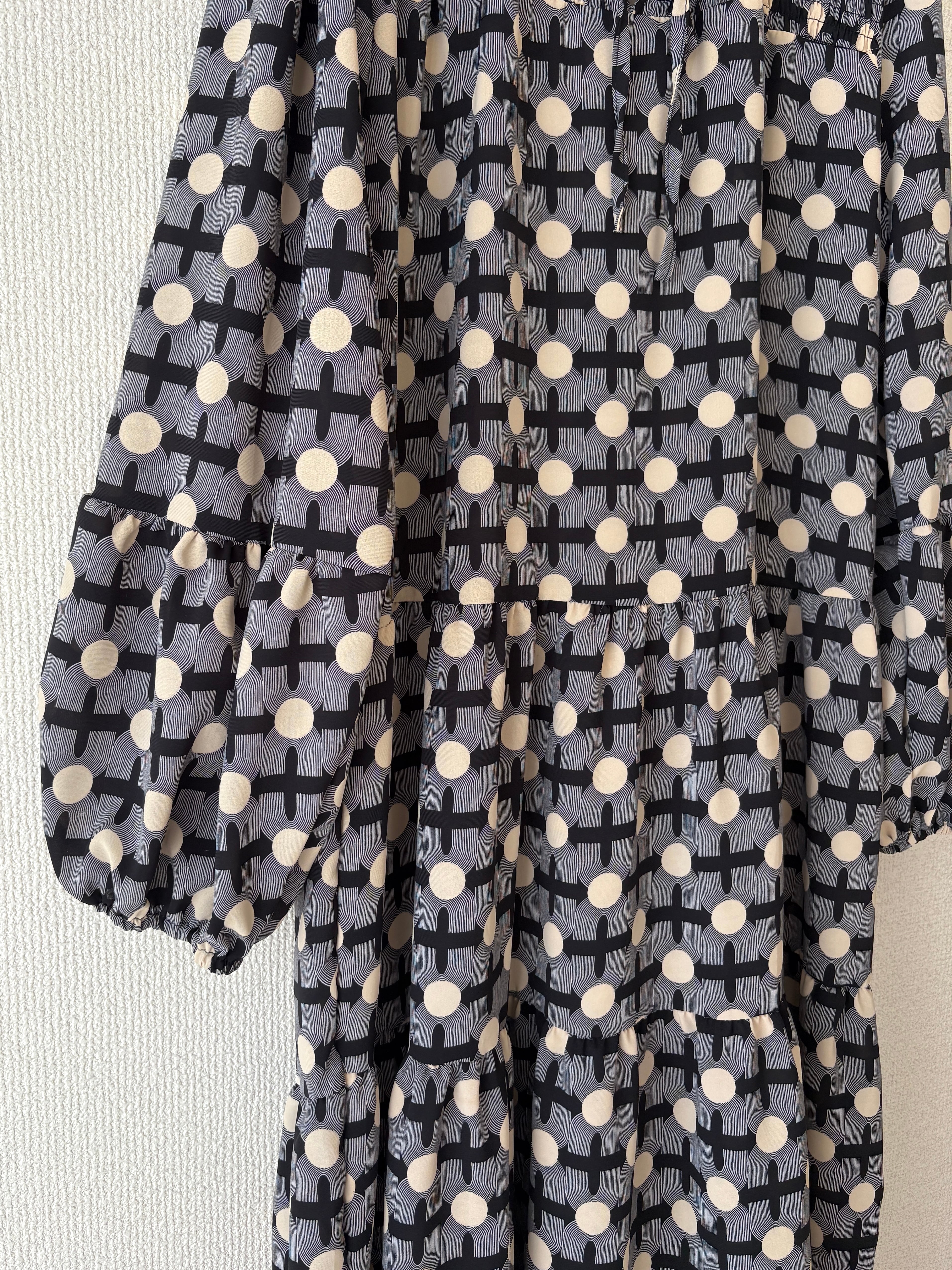 幾何学柄とティアードシルエットが目を惹く、華やかでクラシカルなプリントワンピース。