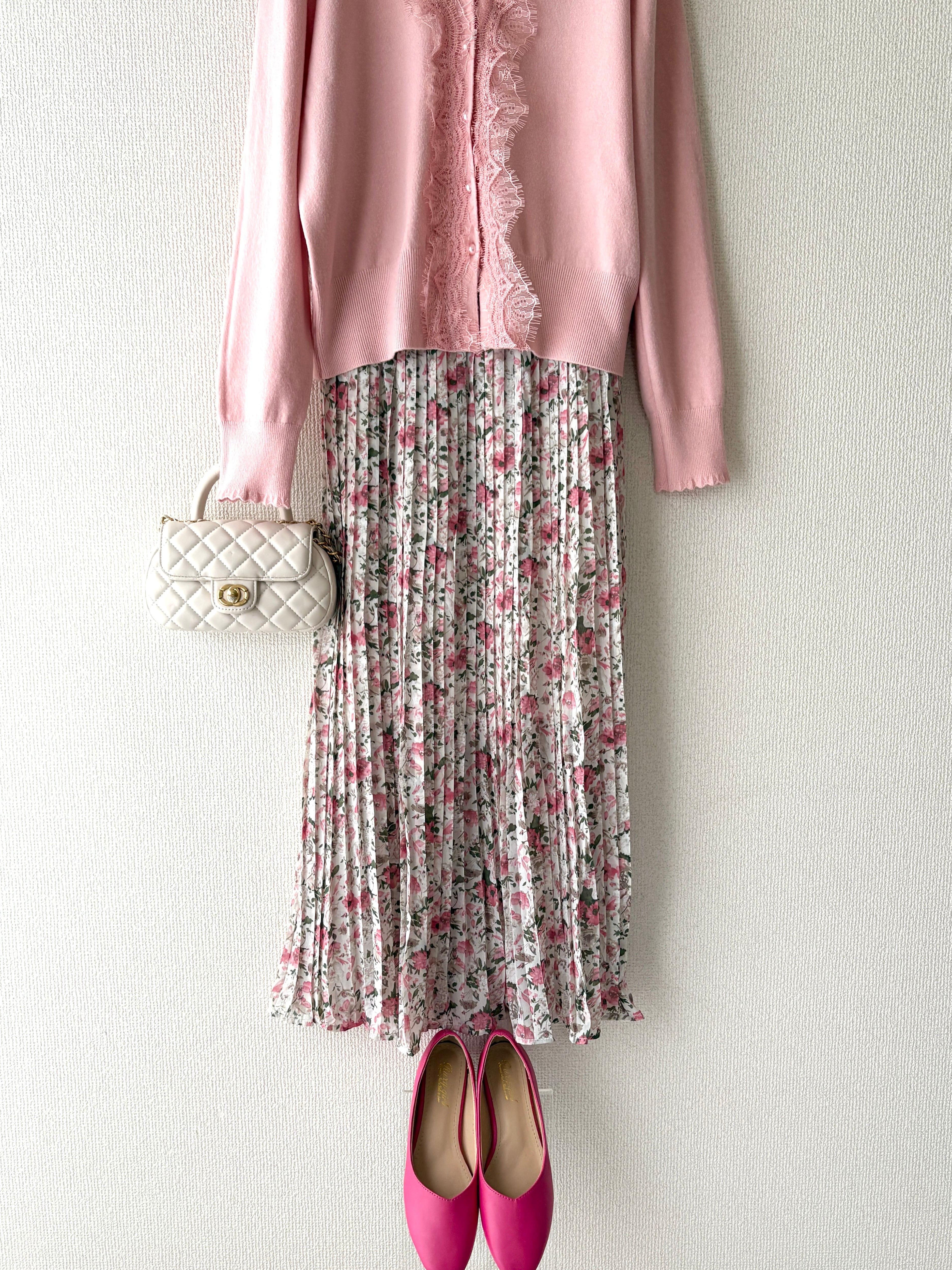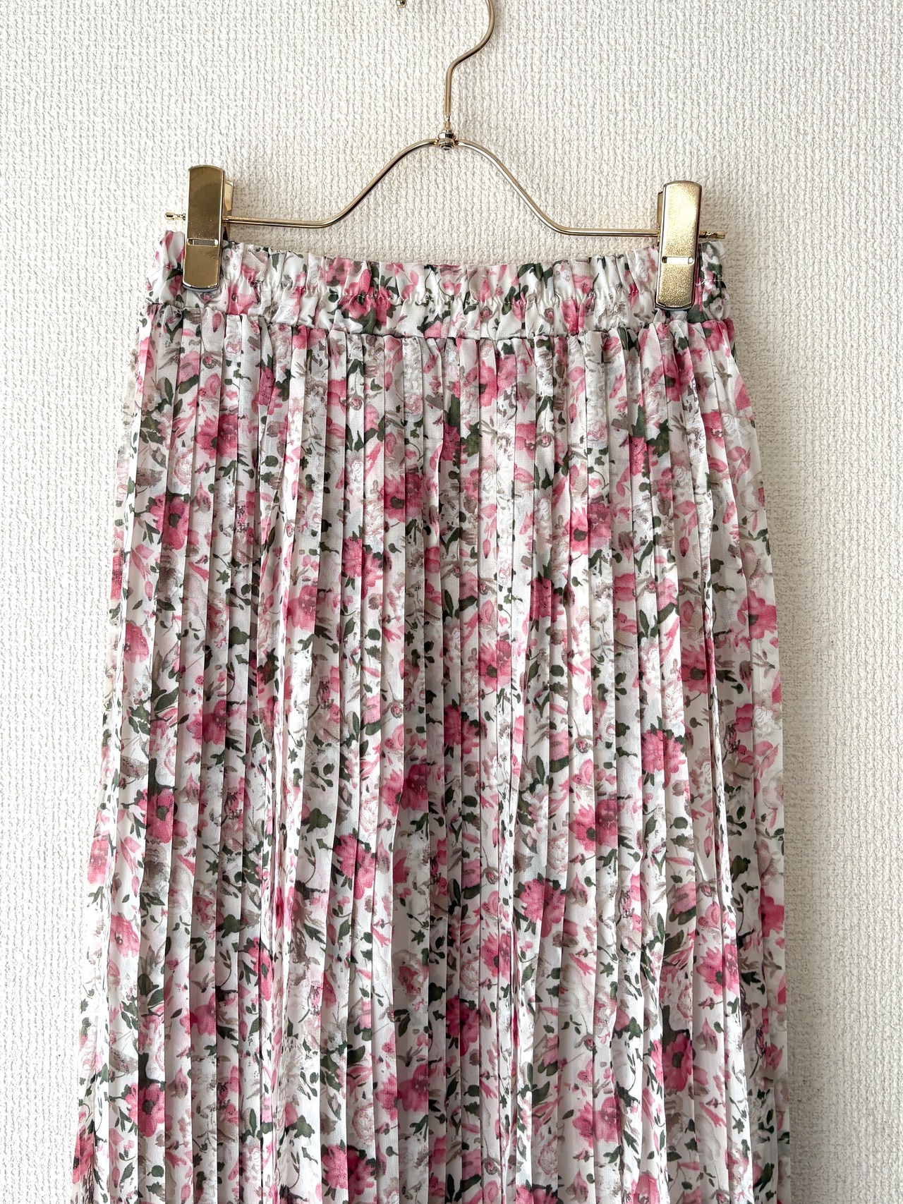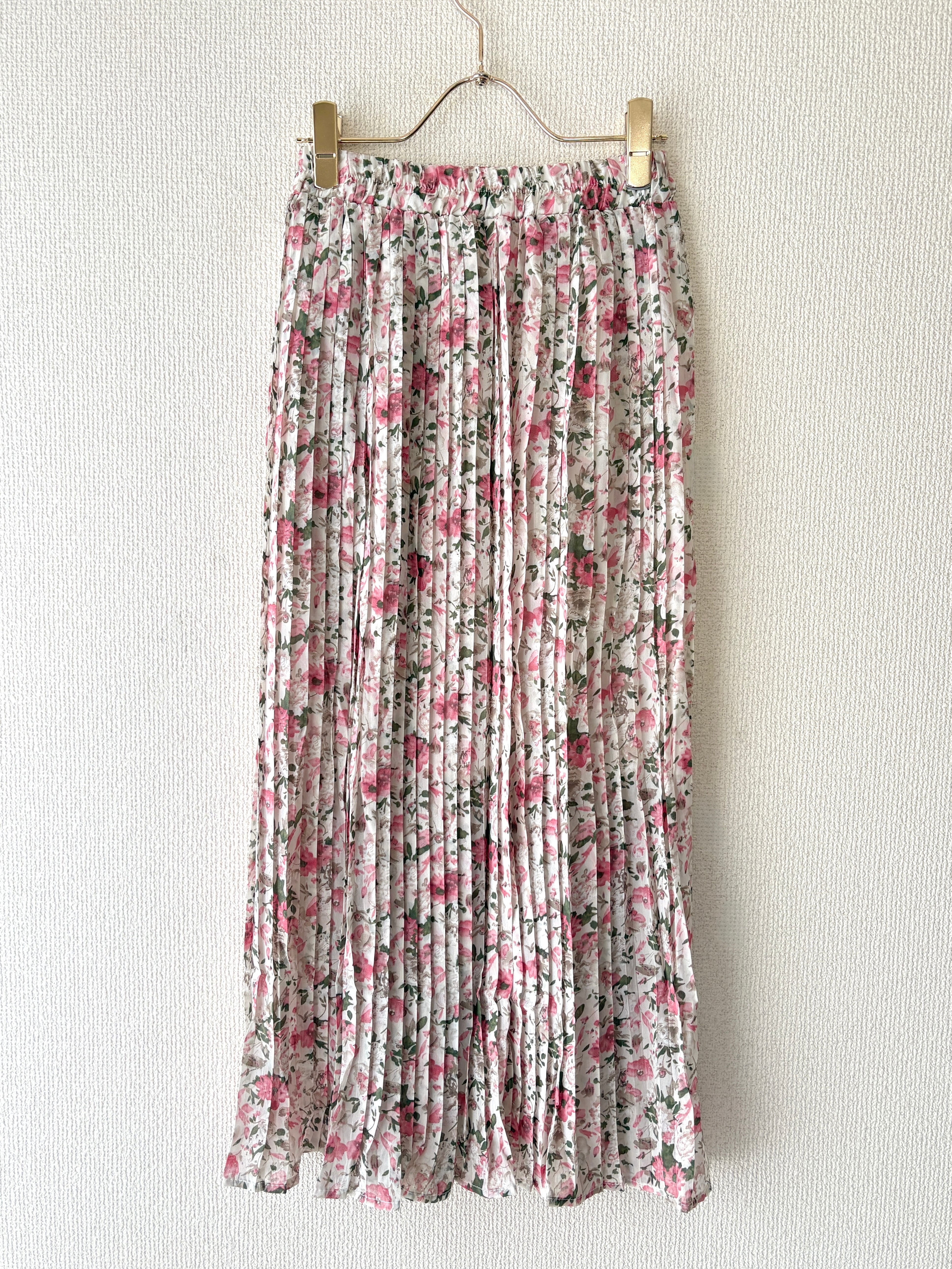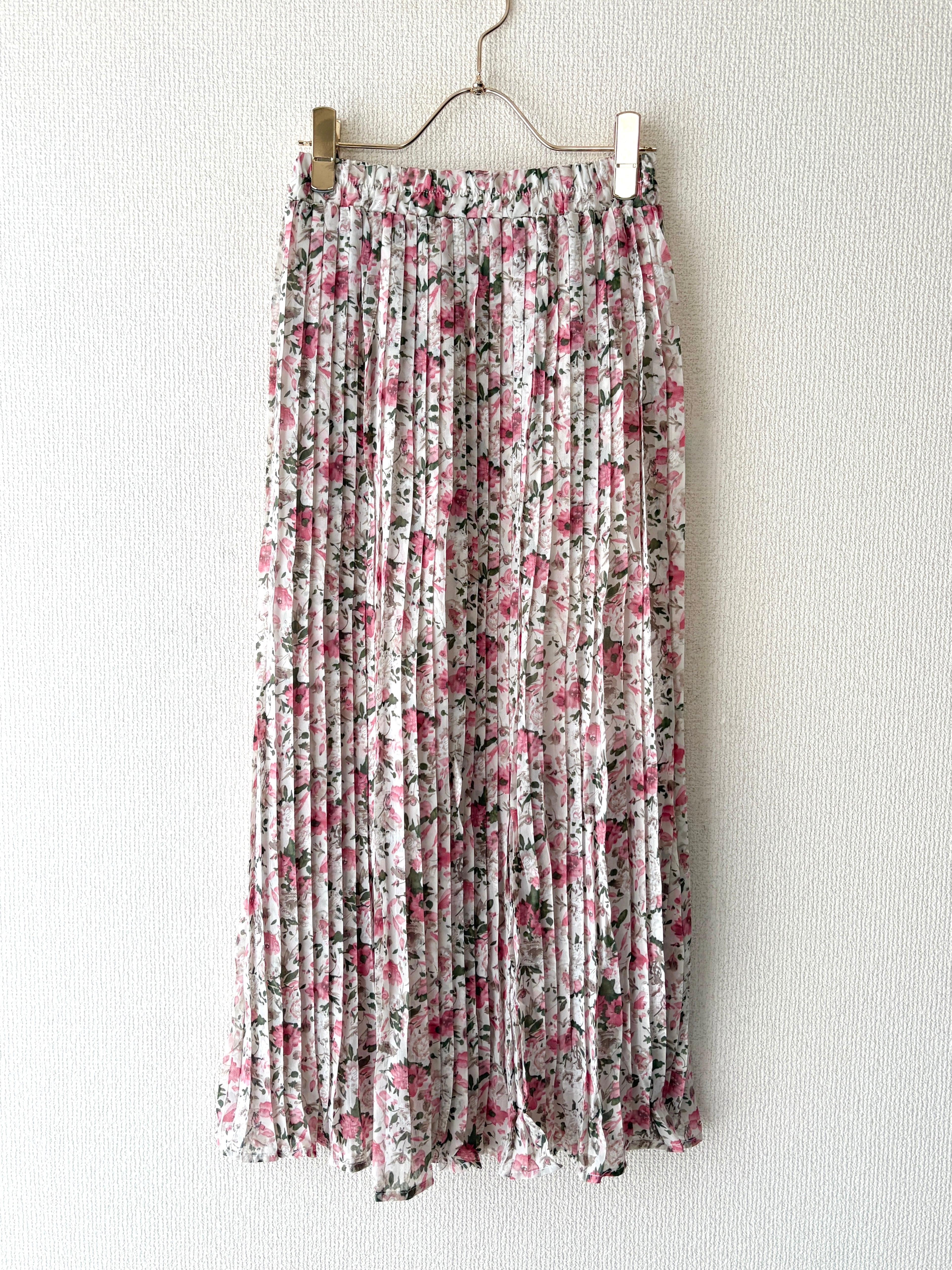 上品な小花柄が目を惹くフェミニンなプリーツスカートはゴム仕様で着心地も楽々◎