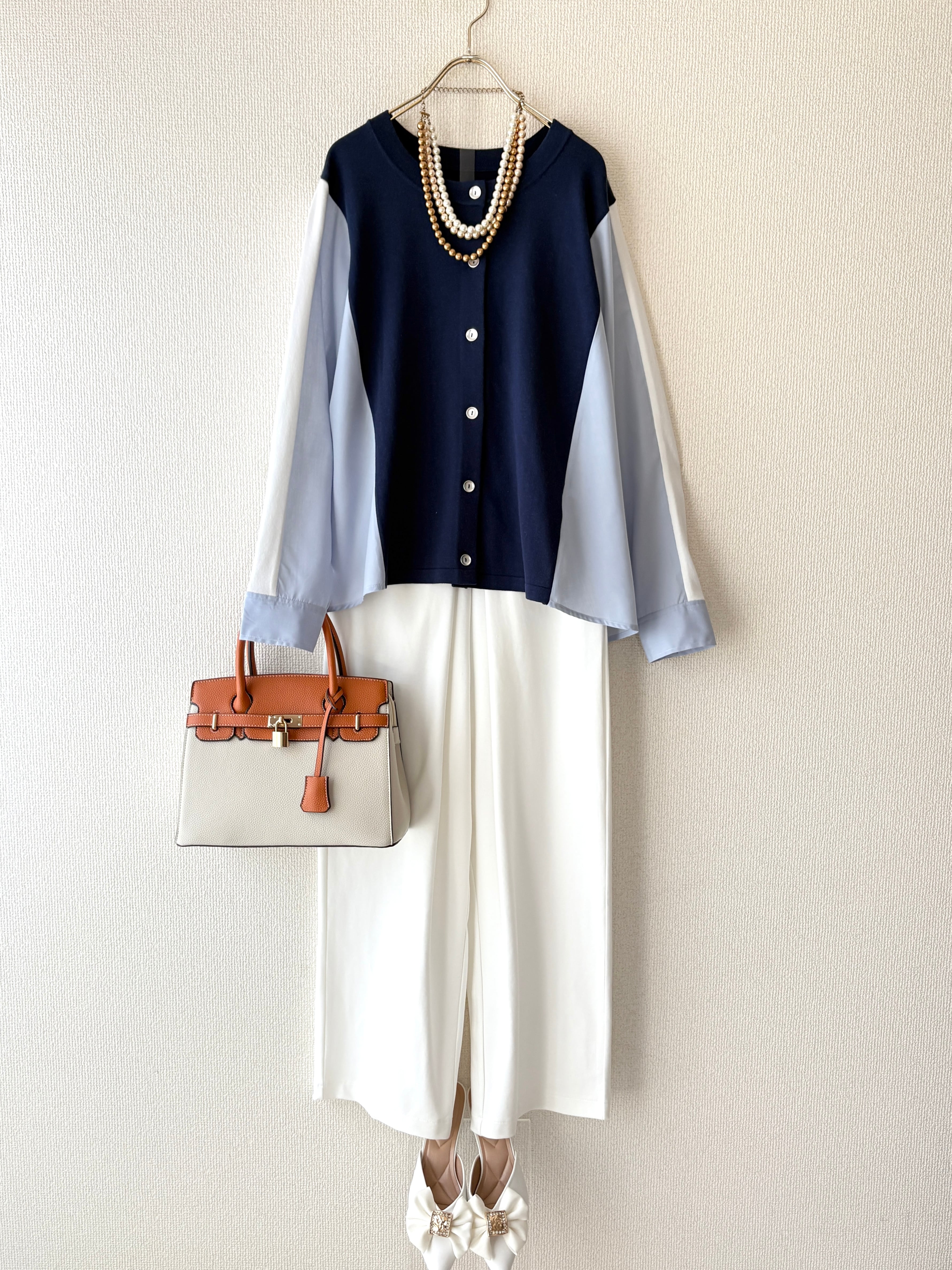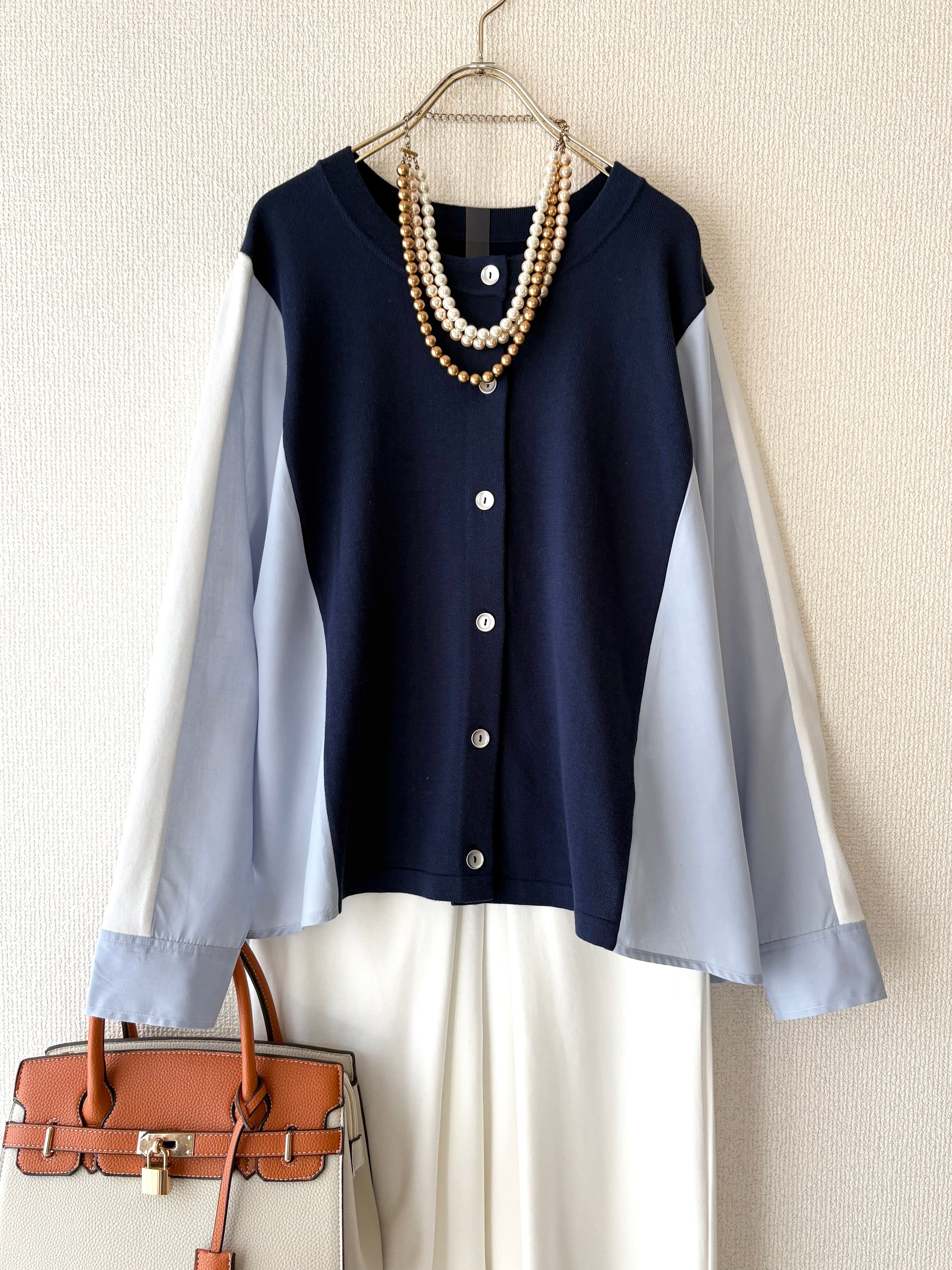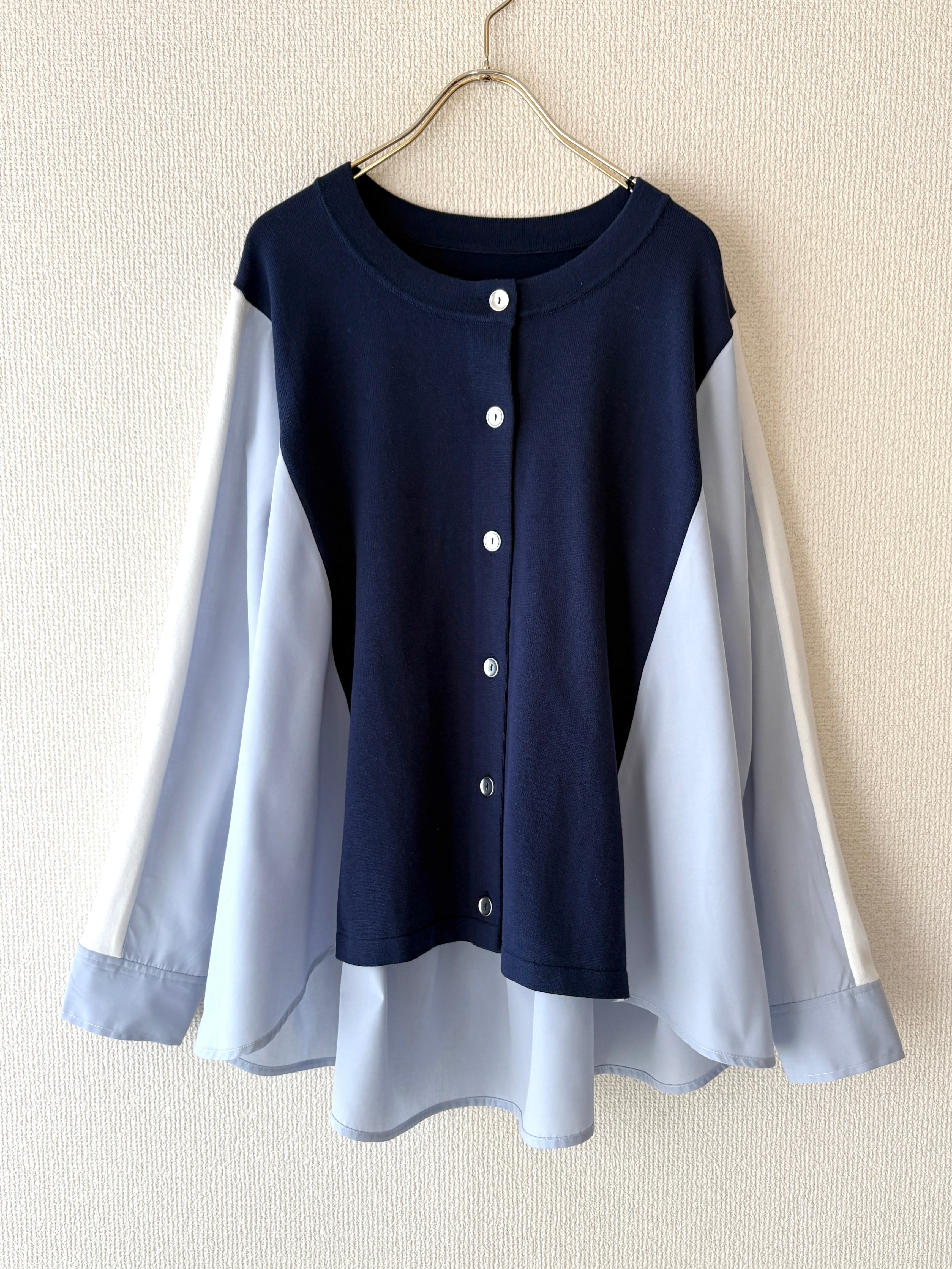 ニットカーディガンとブラウスをドッキングさせたデザインのトップスです。
