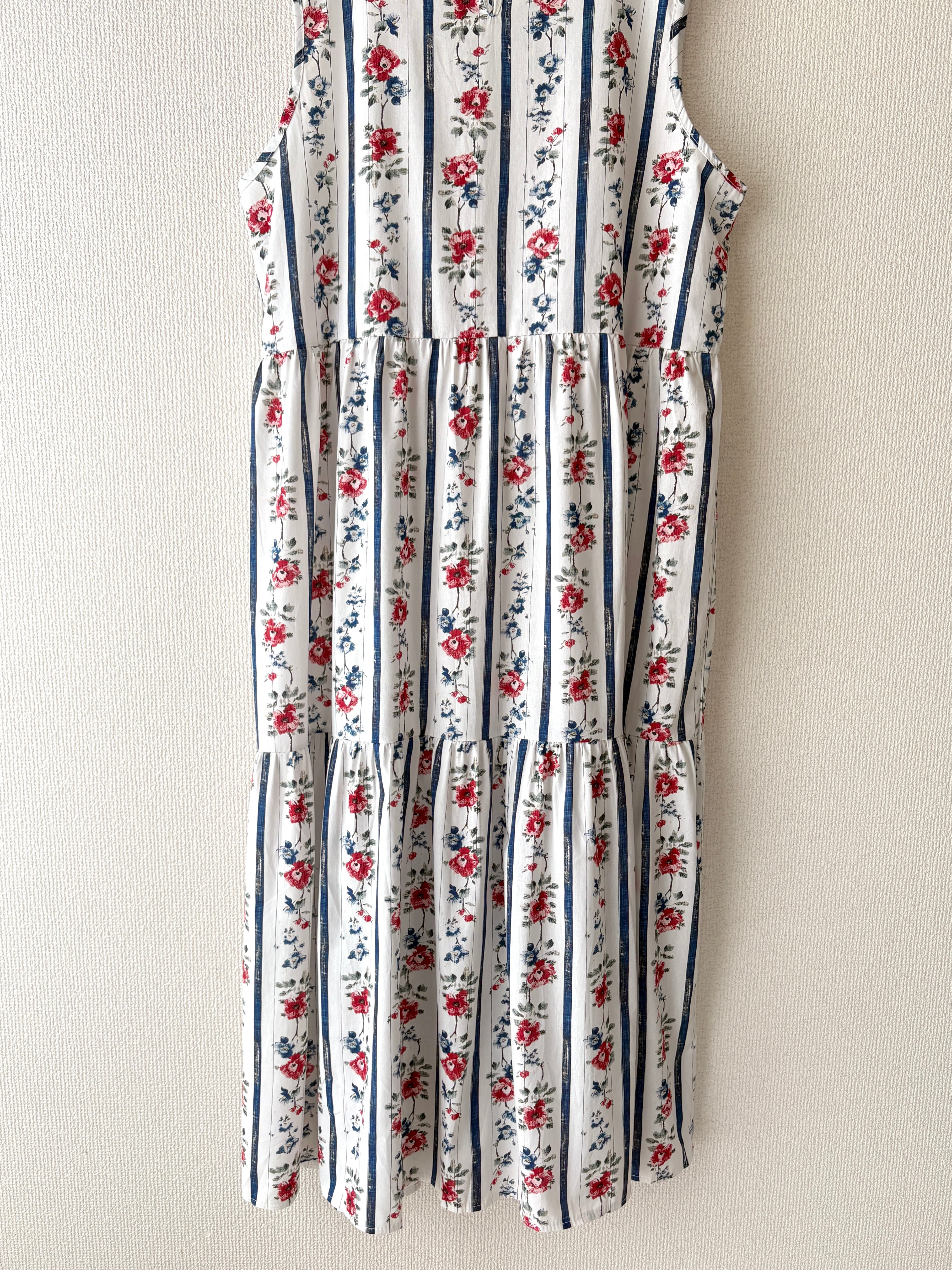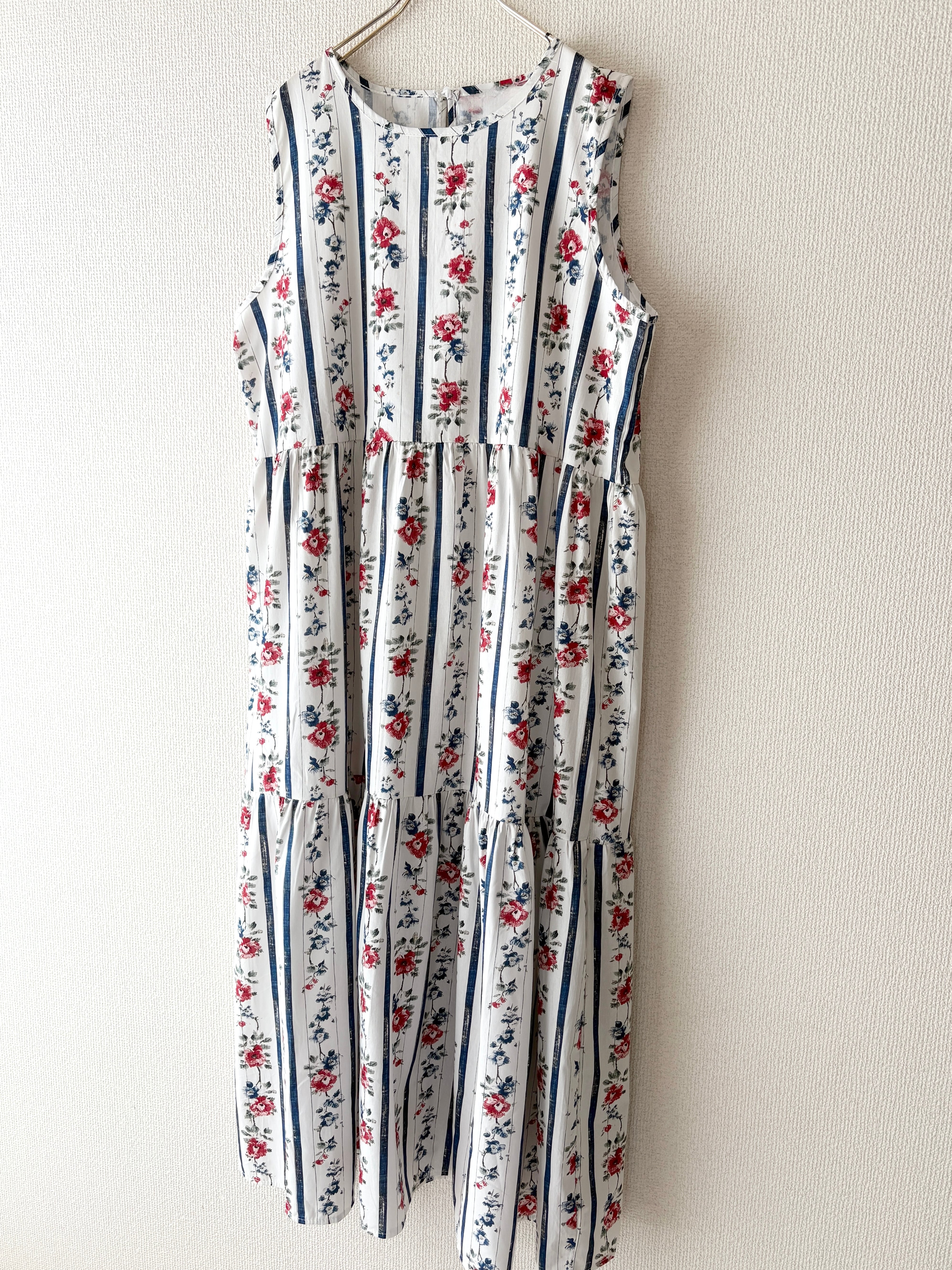 アンティークな花柄が印象的なノースリーブワンピースです。