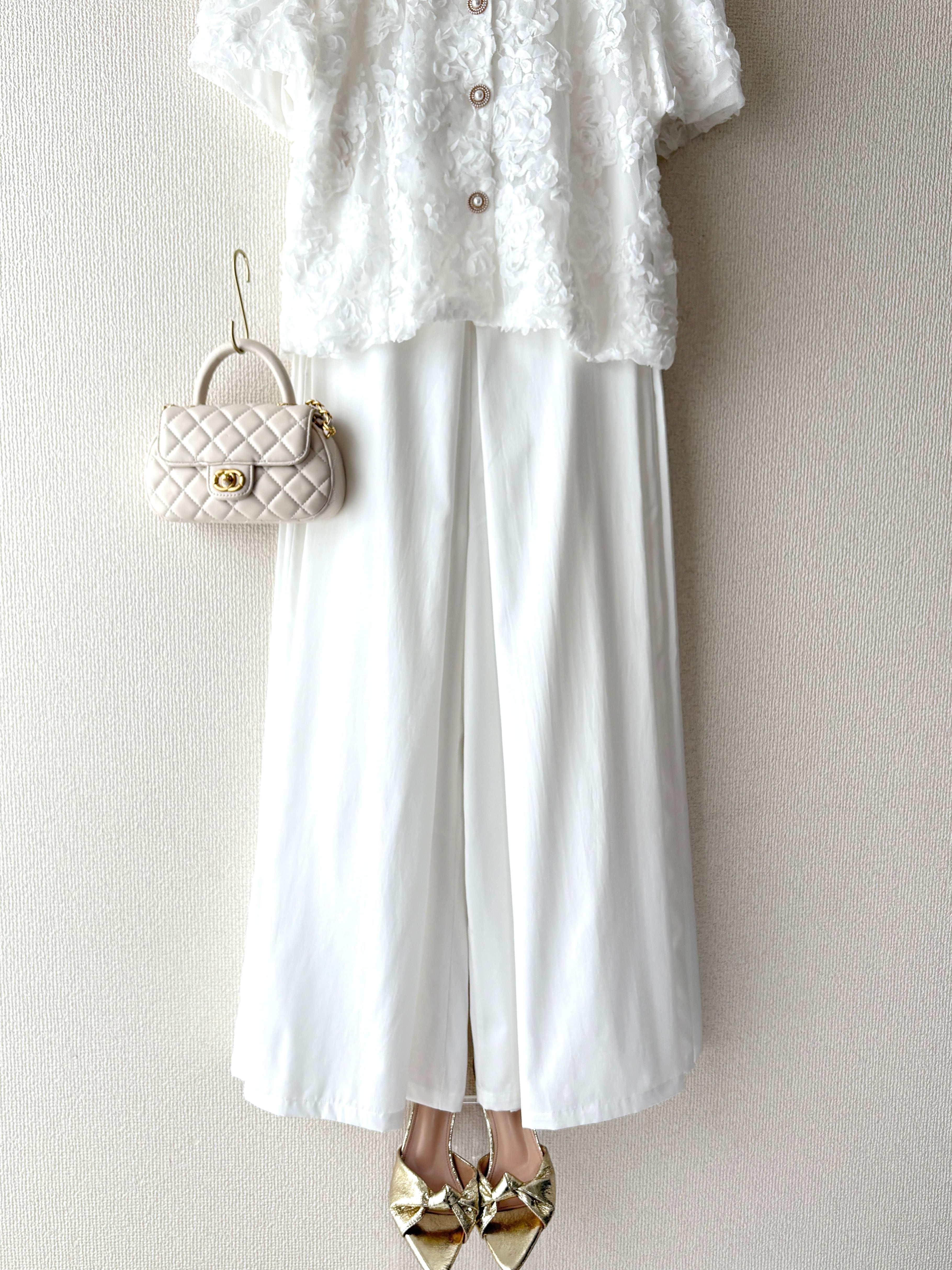 歩くたびに揺れるワイドシルエットで、女性らしく上品な印象に。