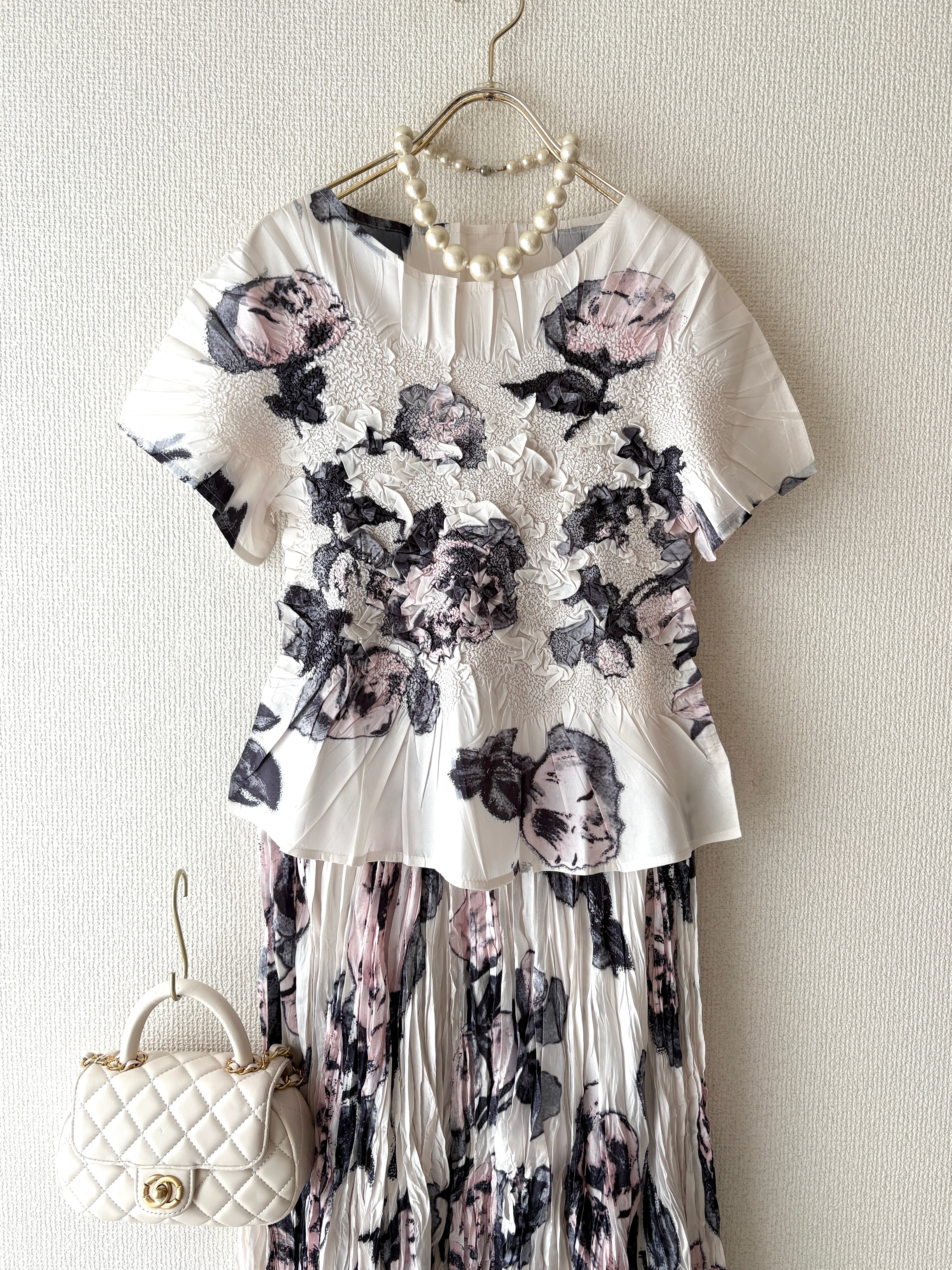 ふんわり裾に向かって広がるプリーツスカートと、立体感のあるトップスで自然にスタイルアップします。