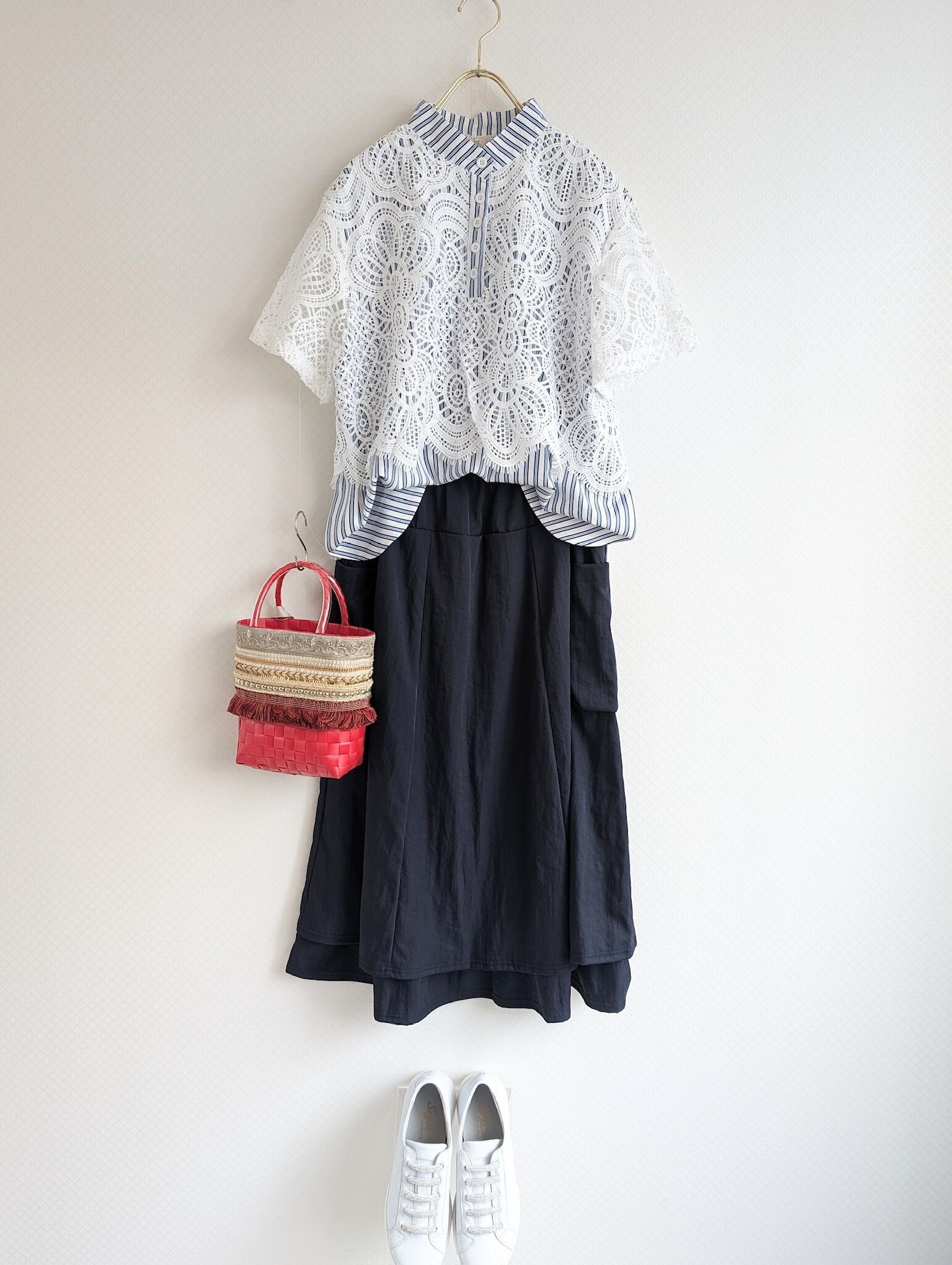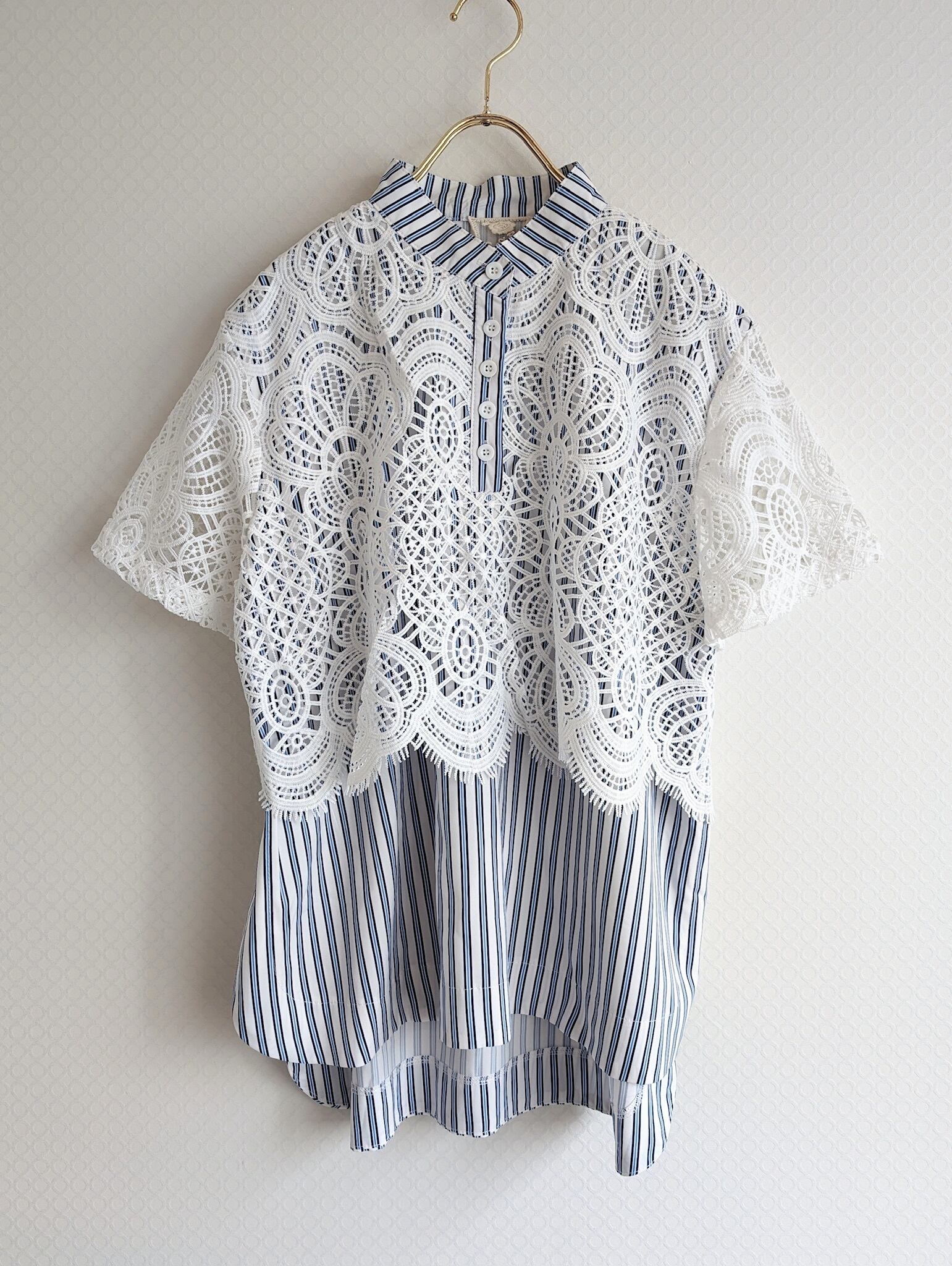 ストライプのシャツにレースが混合して高級感があるシャツです。ワキの下からスリットが入っているので風が入りやすく、涼しく楽しめます。