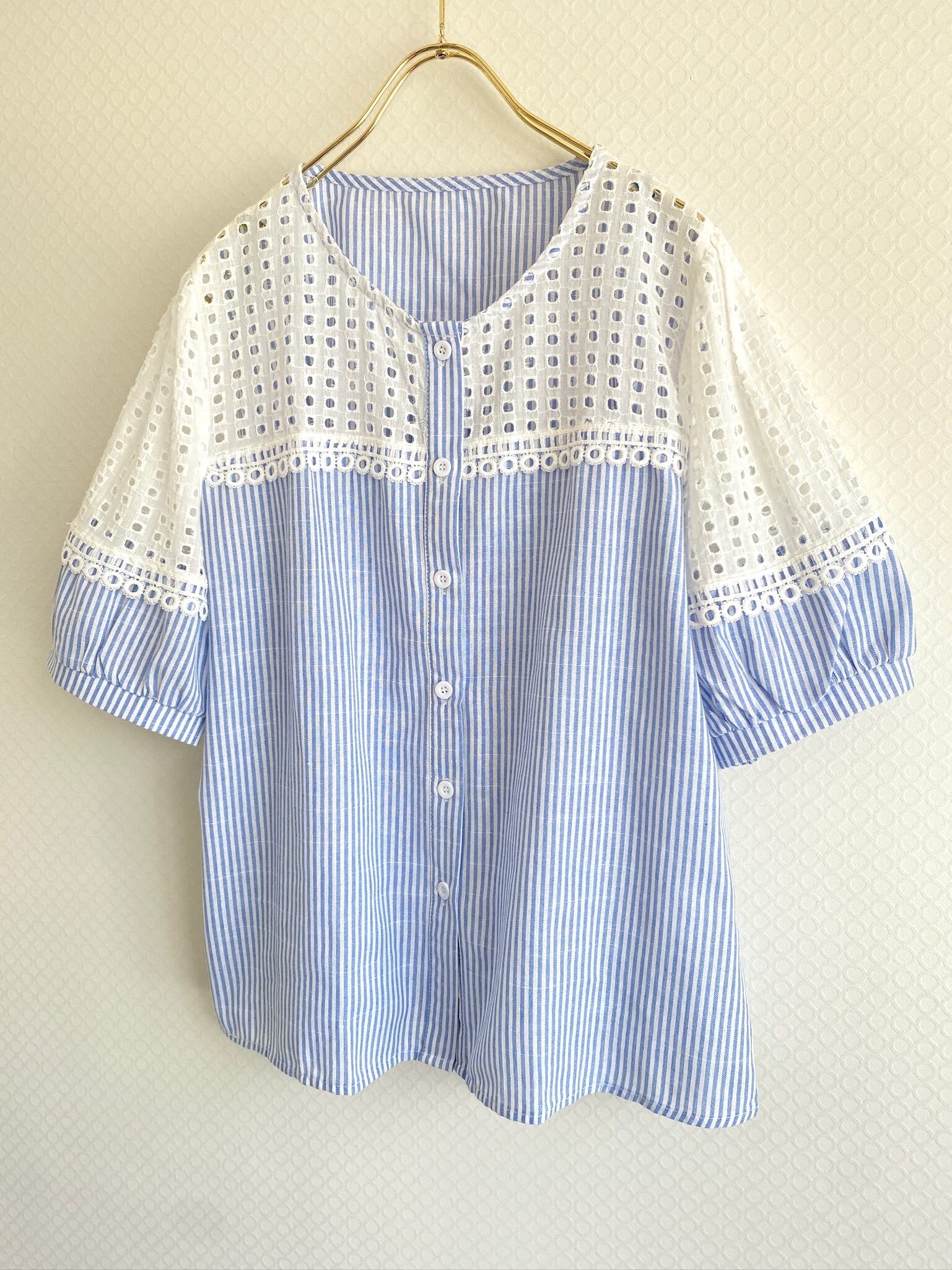 レースとブルーカラーのデザインが夏らしく爽やかです。ゆったり着れるので体型をカバーしてくれます。