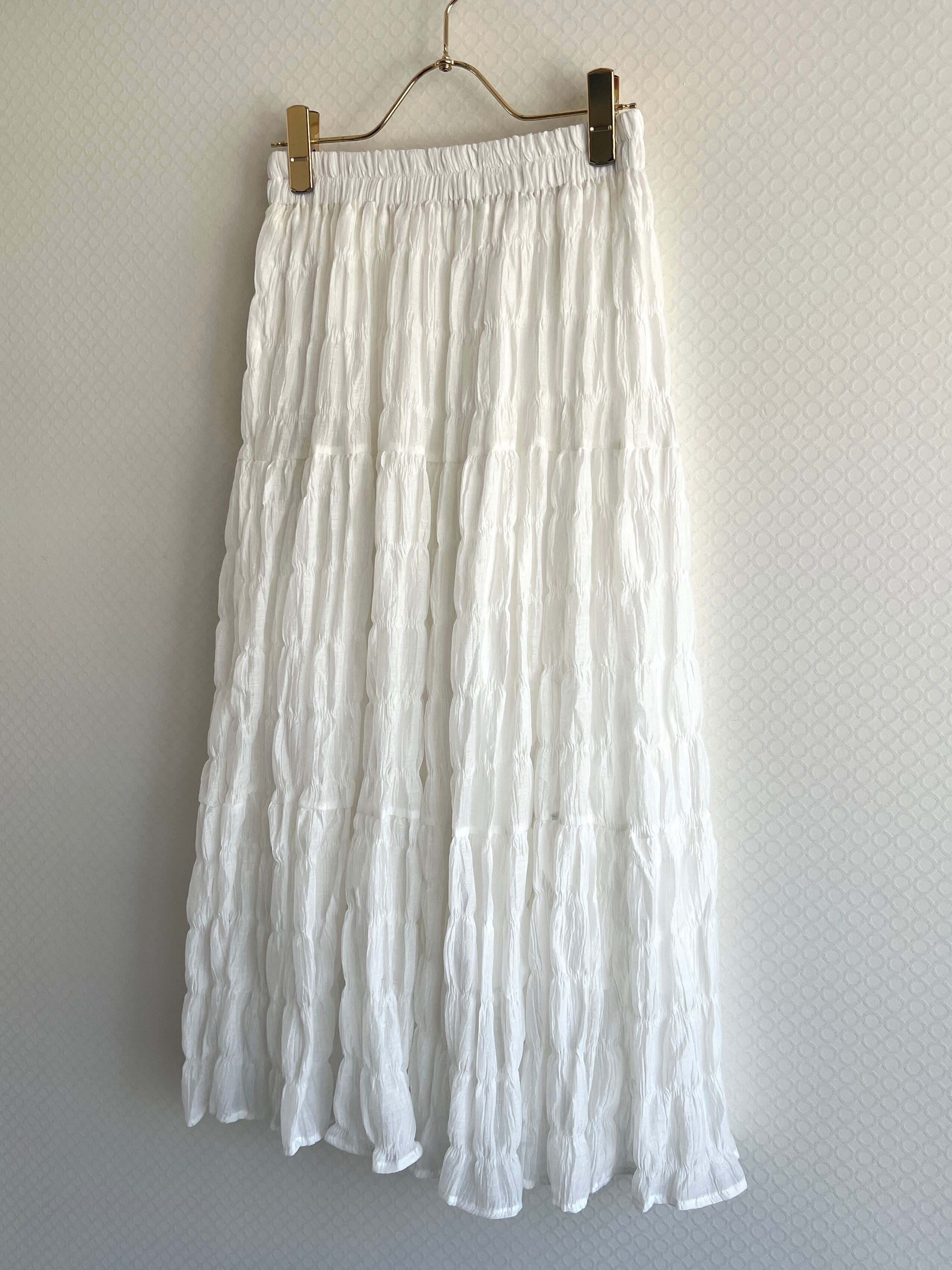 白のプリーツスカートなので様々なコーディネートにも合わせやすいです。
