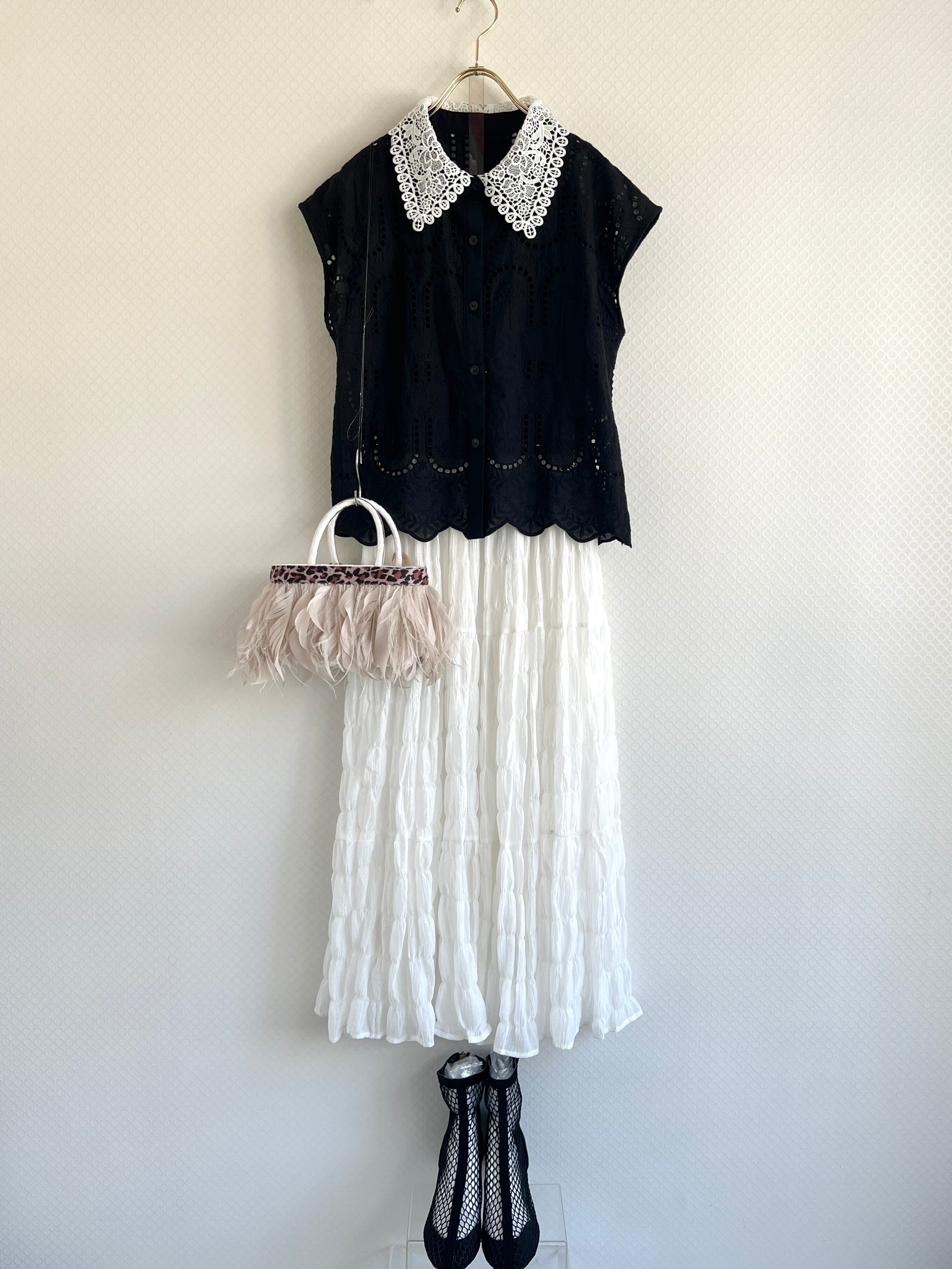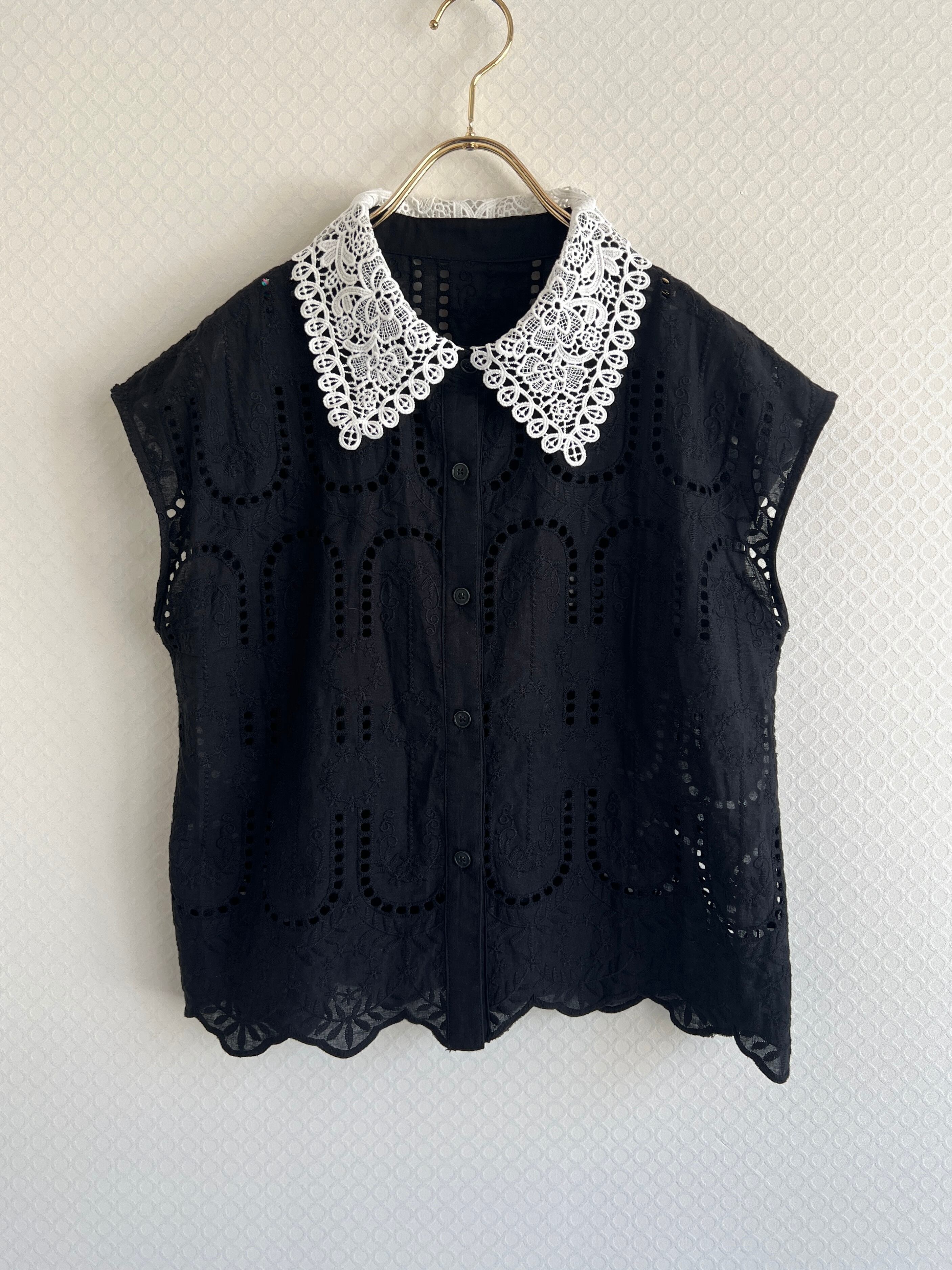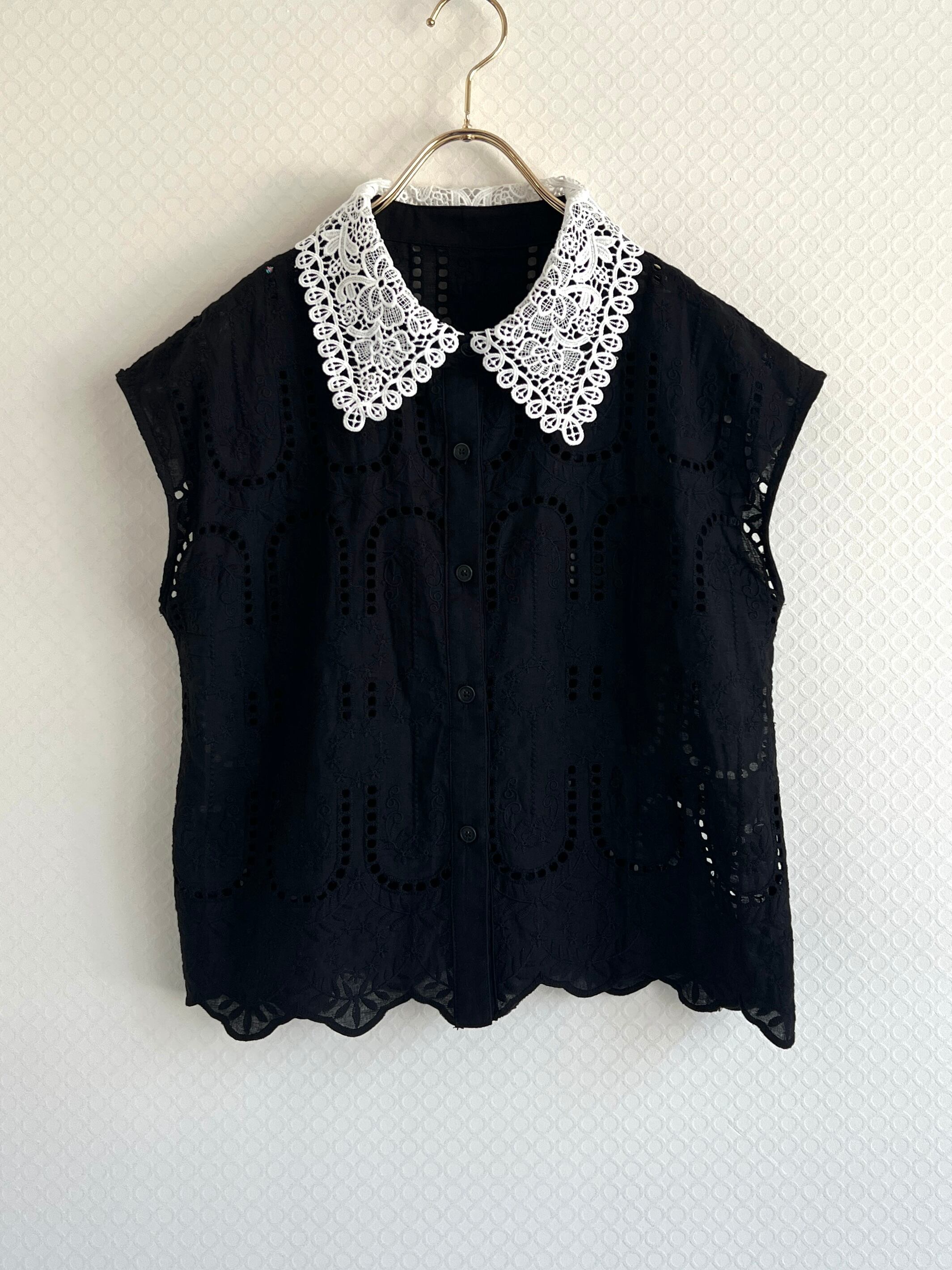 ショート丈なのでスカートやパンツ、着回しやすいアイテムです。レースブラウスなので女性らしくてかっこいい雰囲気になります。