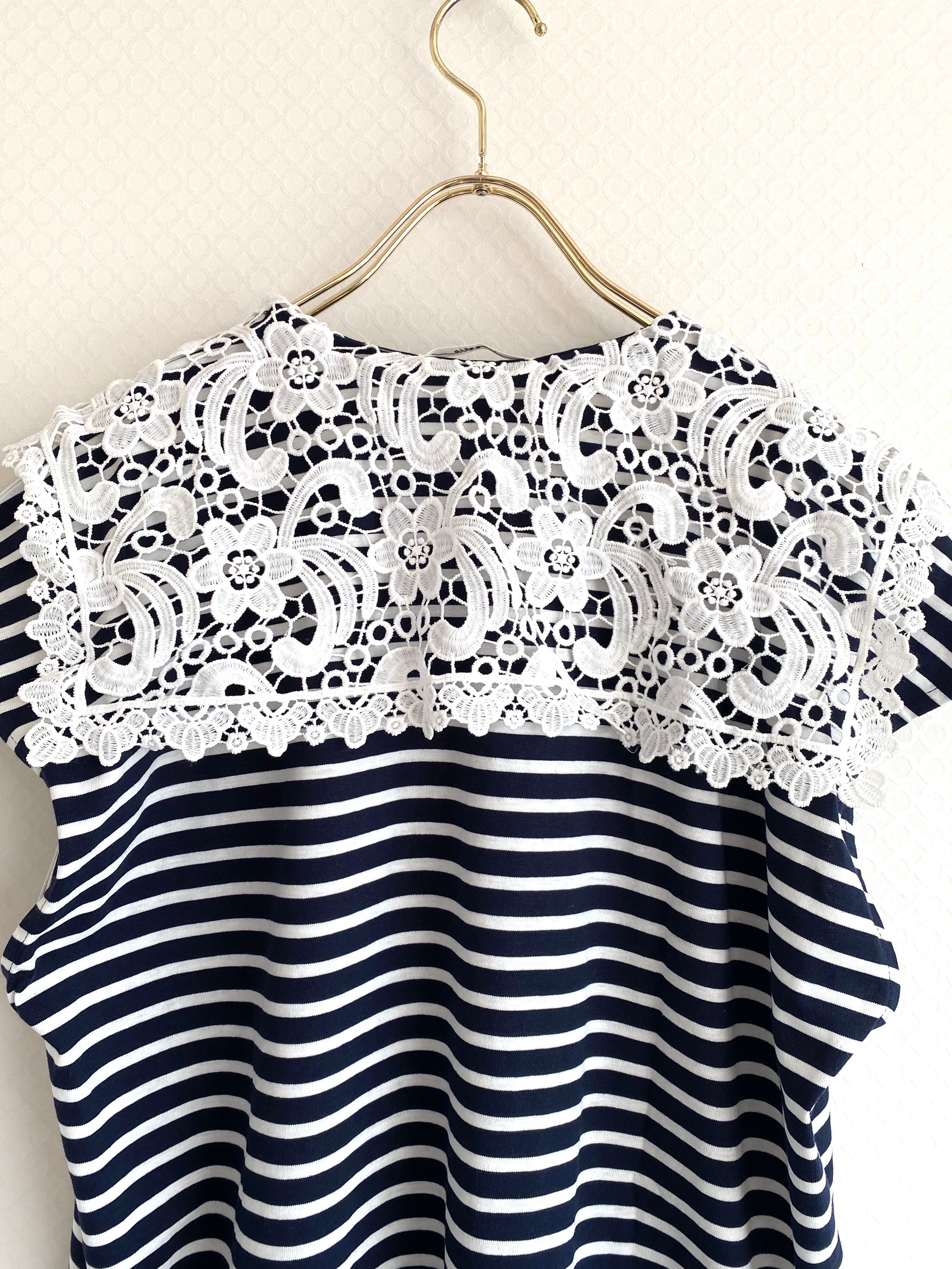 レースの襟がオシャレでボーダーとの相性が良いです。スカートはもちろん、パンツにも合わせやすいので着回しがたくさん出来るトップスです。