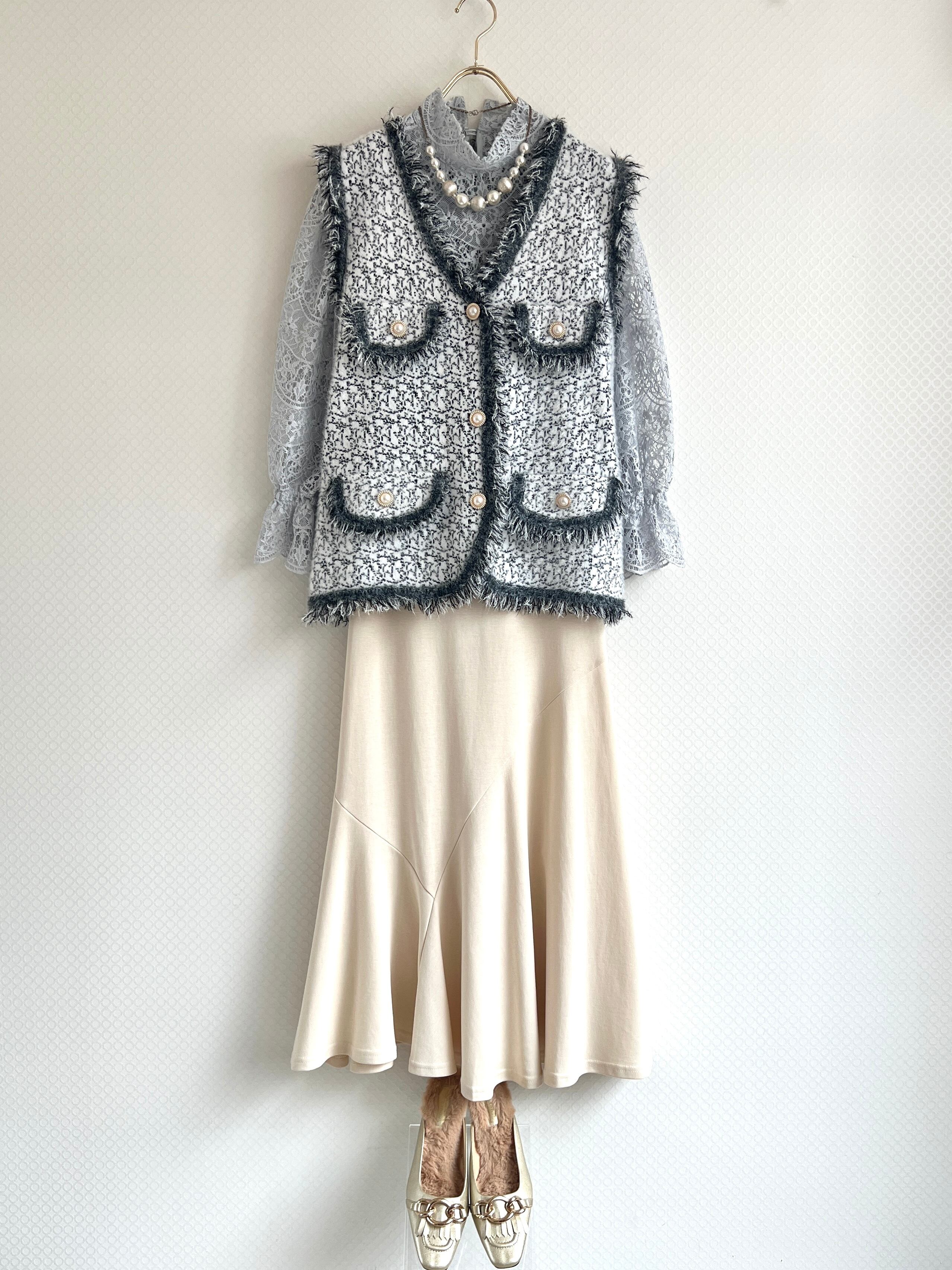 シンプルなトップスに羽織るだけで華やかなコーディネートになります。