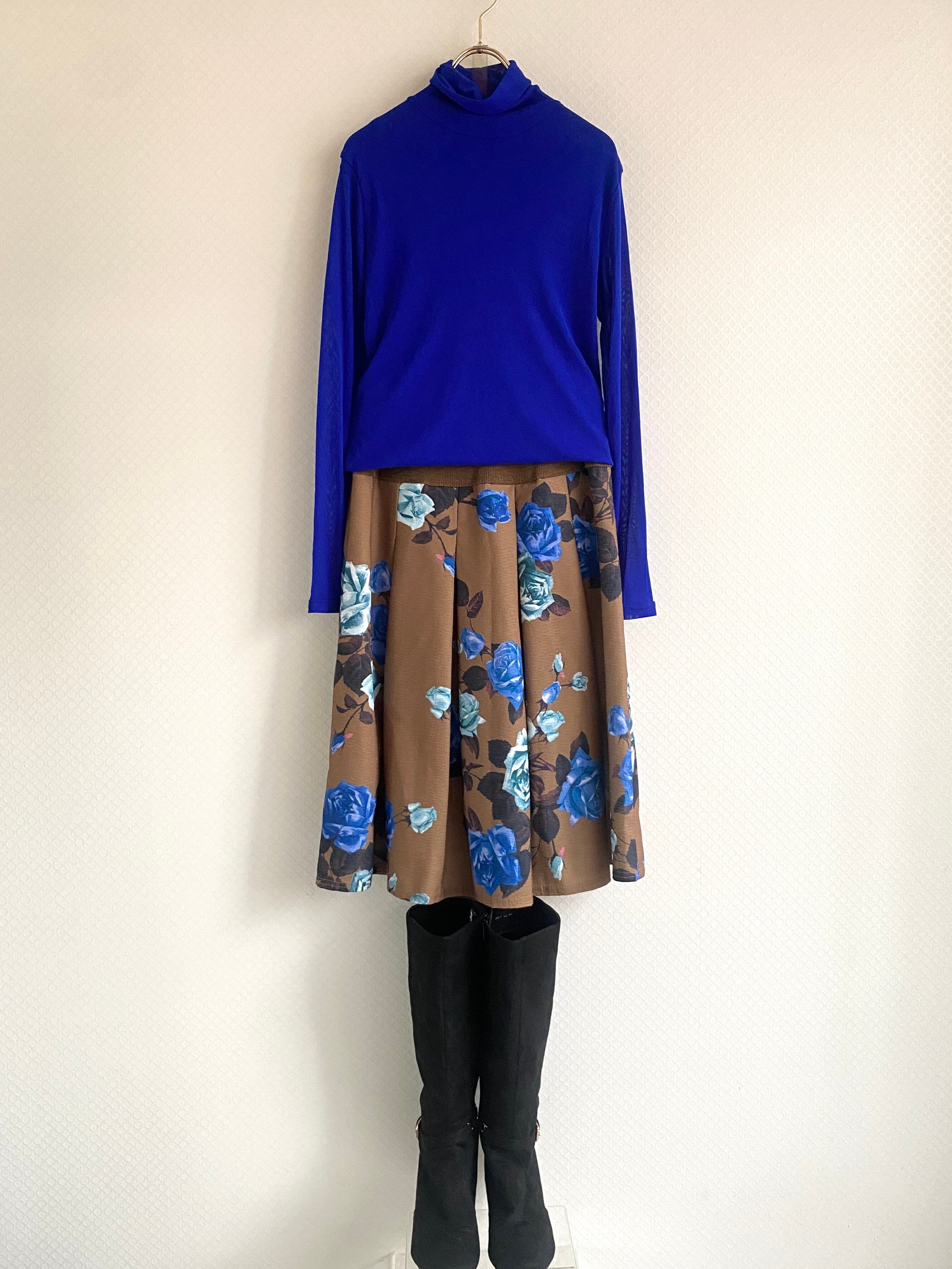 ブルーとブラウンの相性が珍しくオシャレなデザイン。スカート丈もあまり長くないので低身長の方でも、履きやすいです。